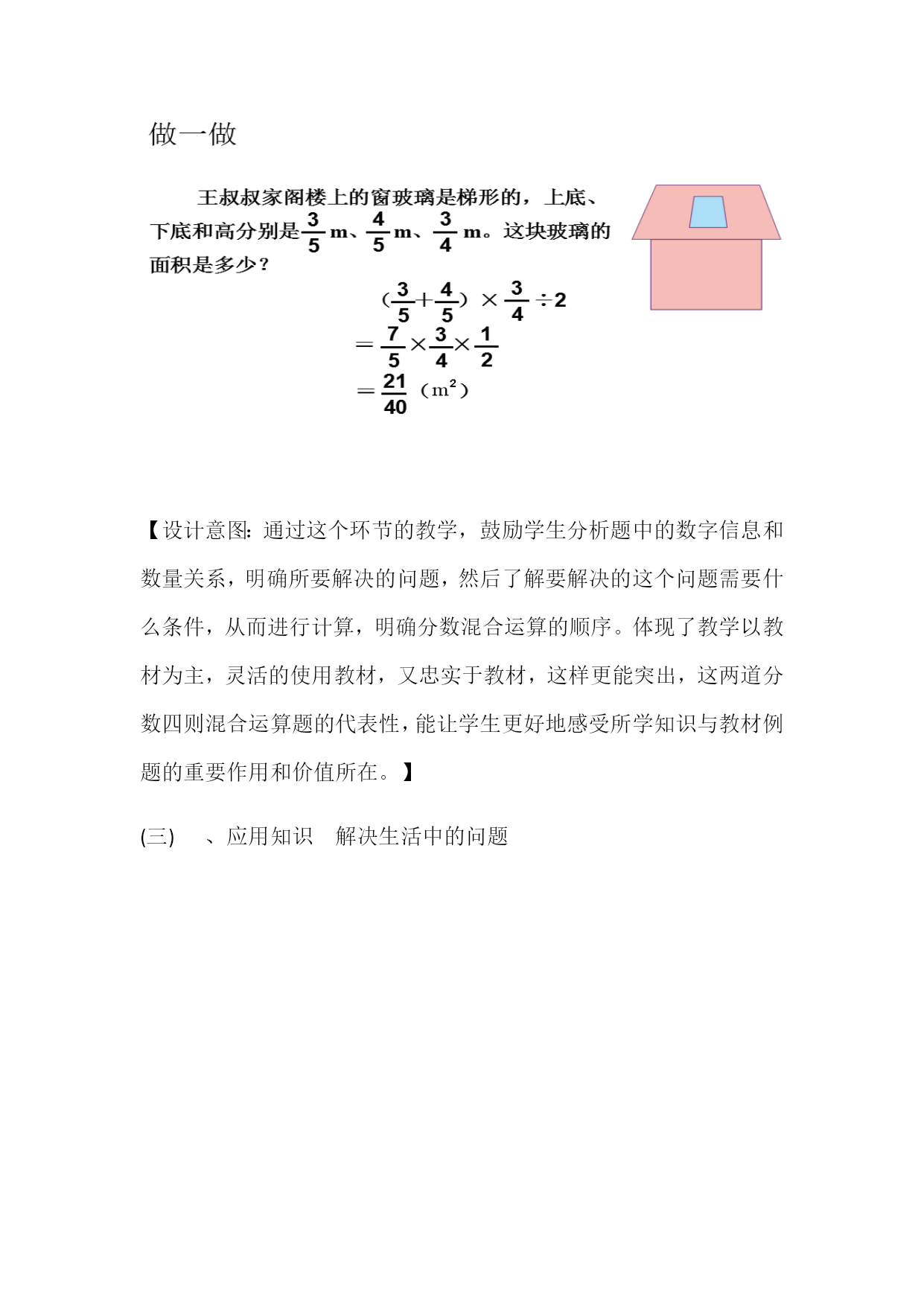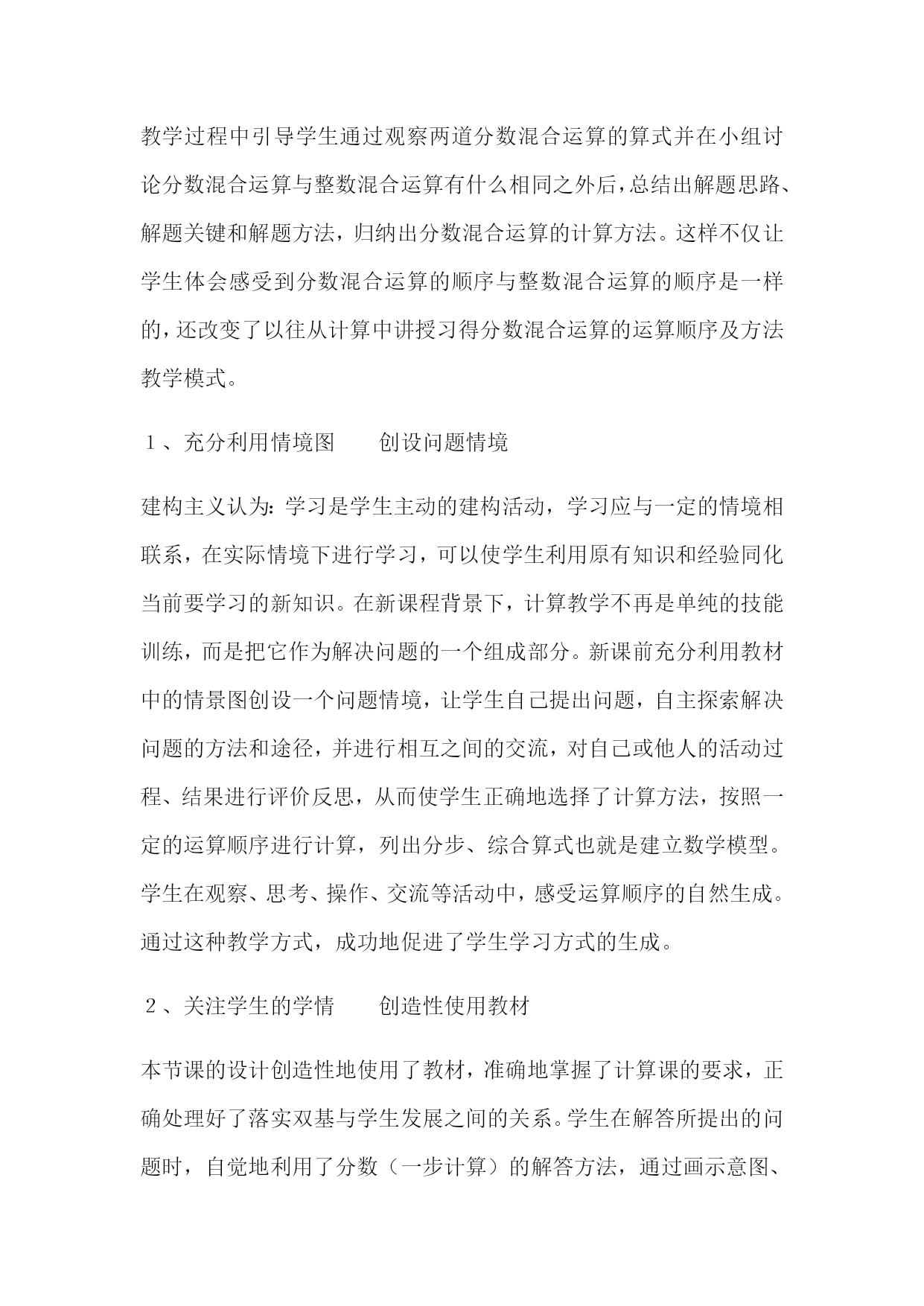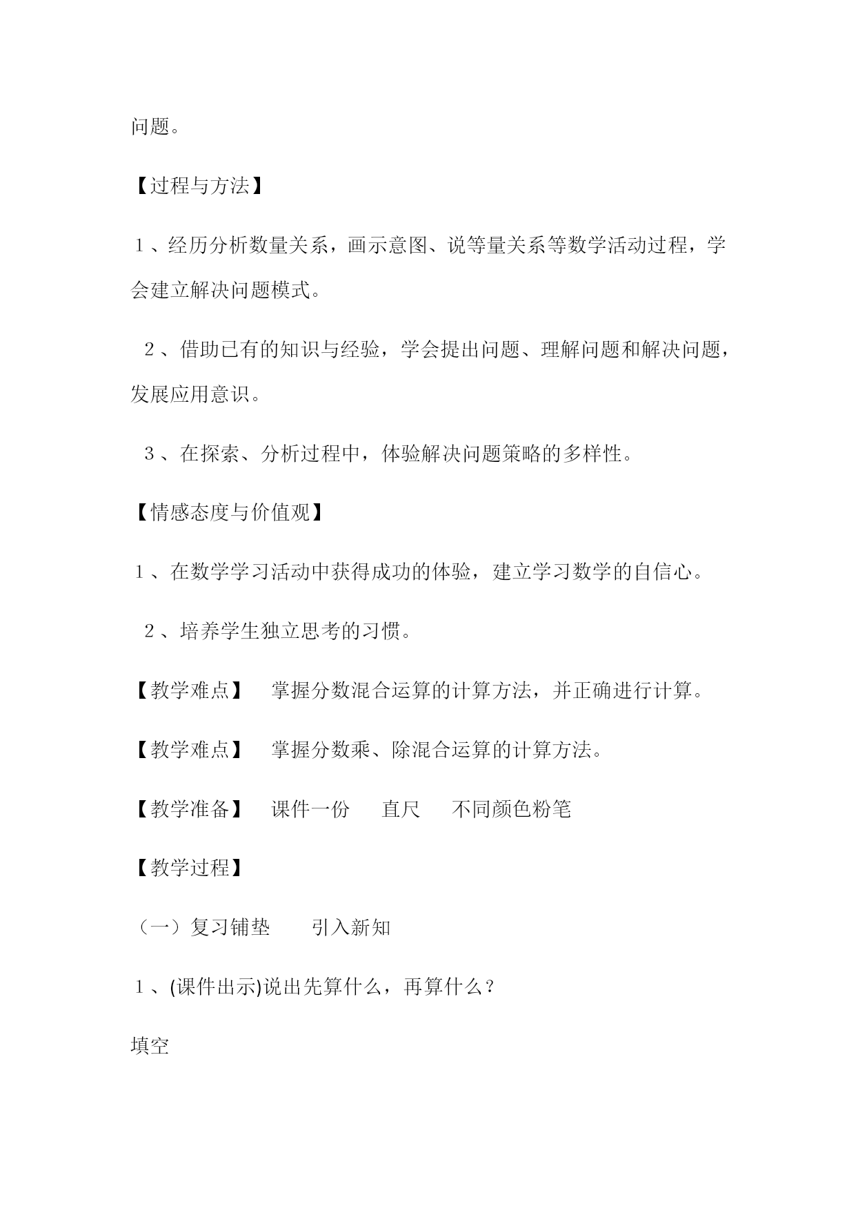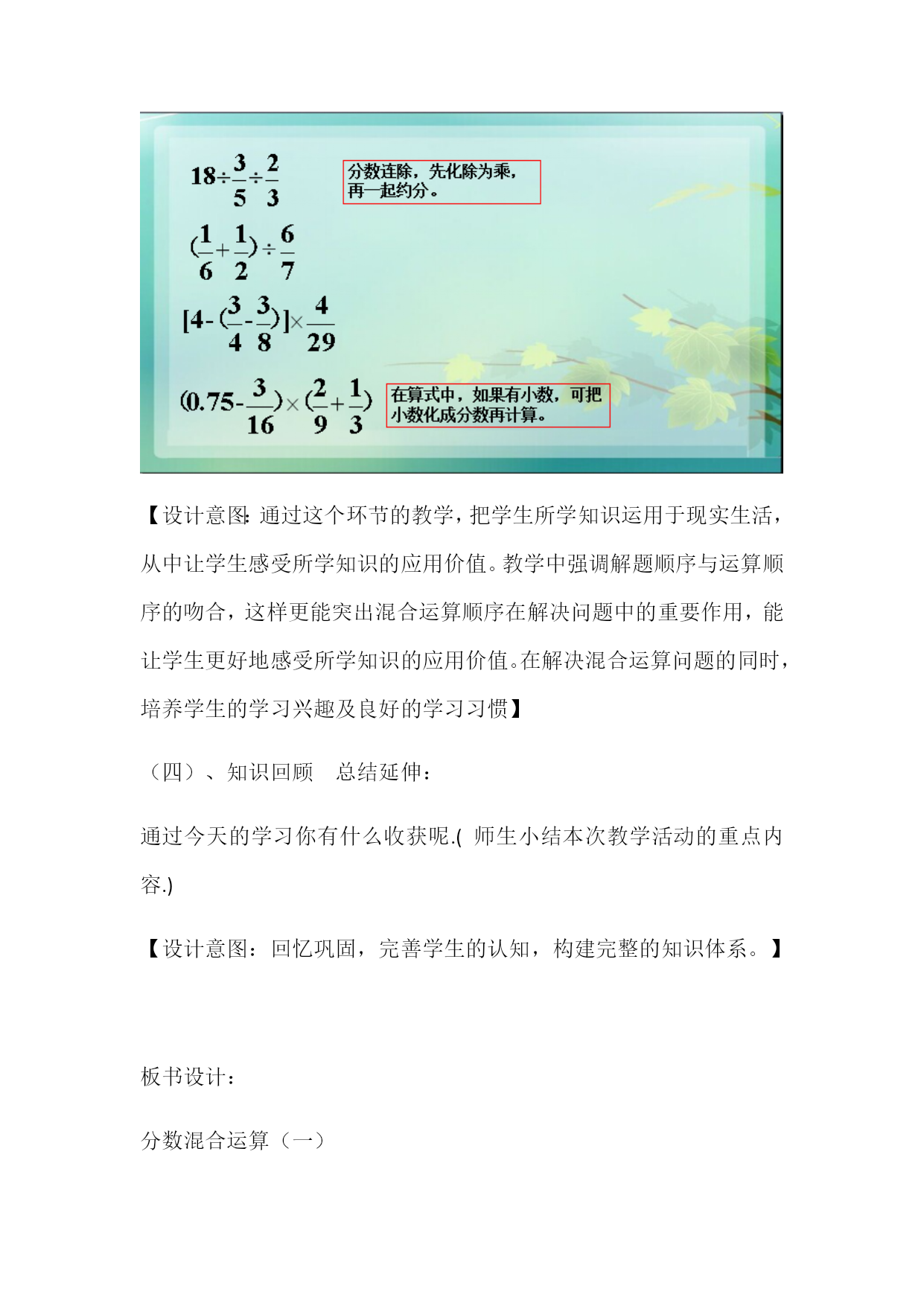 分数混合运算(一)教学设计【设计理念】数学学习的本质是思维。数学思维过程是人脑对外部的数学信息的接受、分析、选择、加工和整合的过程,是一个外部感知到内化的交点作用的过程。这一过程反映两个方面的问题:一方面,数学思维是主体将外部材料转化为内部材料的过程,另一方面,内部材料在经常得到恰当的使用过程中,逐渐使主体的认识结构得到完善和发展。教学活动即引导学生积极地、有效地提取可利用知识、经验,主动建构知识,促使思维优化的过程。《新课标》在第二学段对“数的运算”提出了:“能结合现实素材理解运算顺序,并进行简单的整数