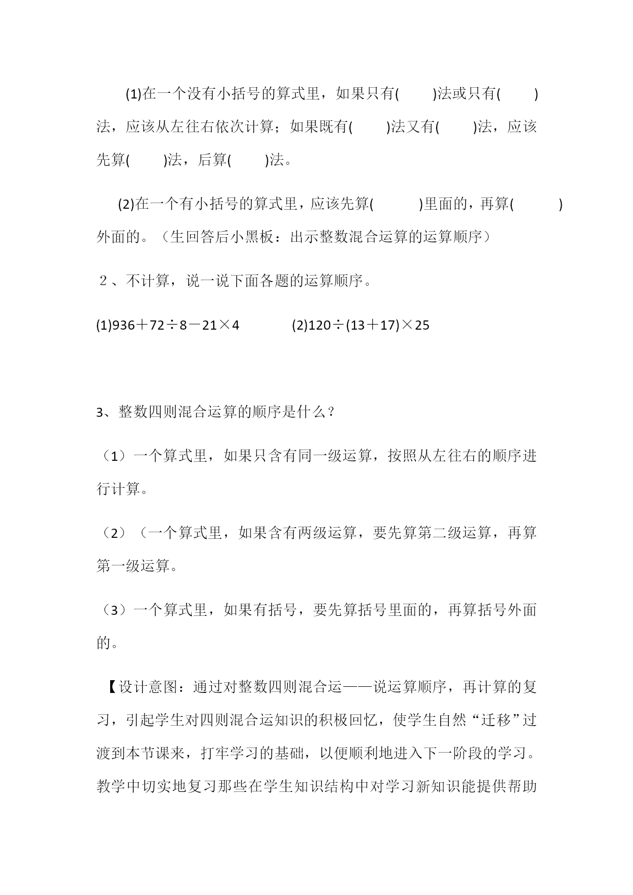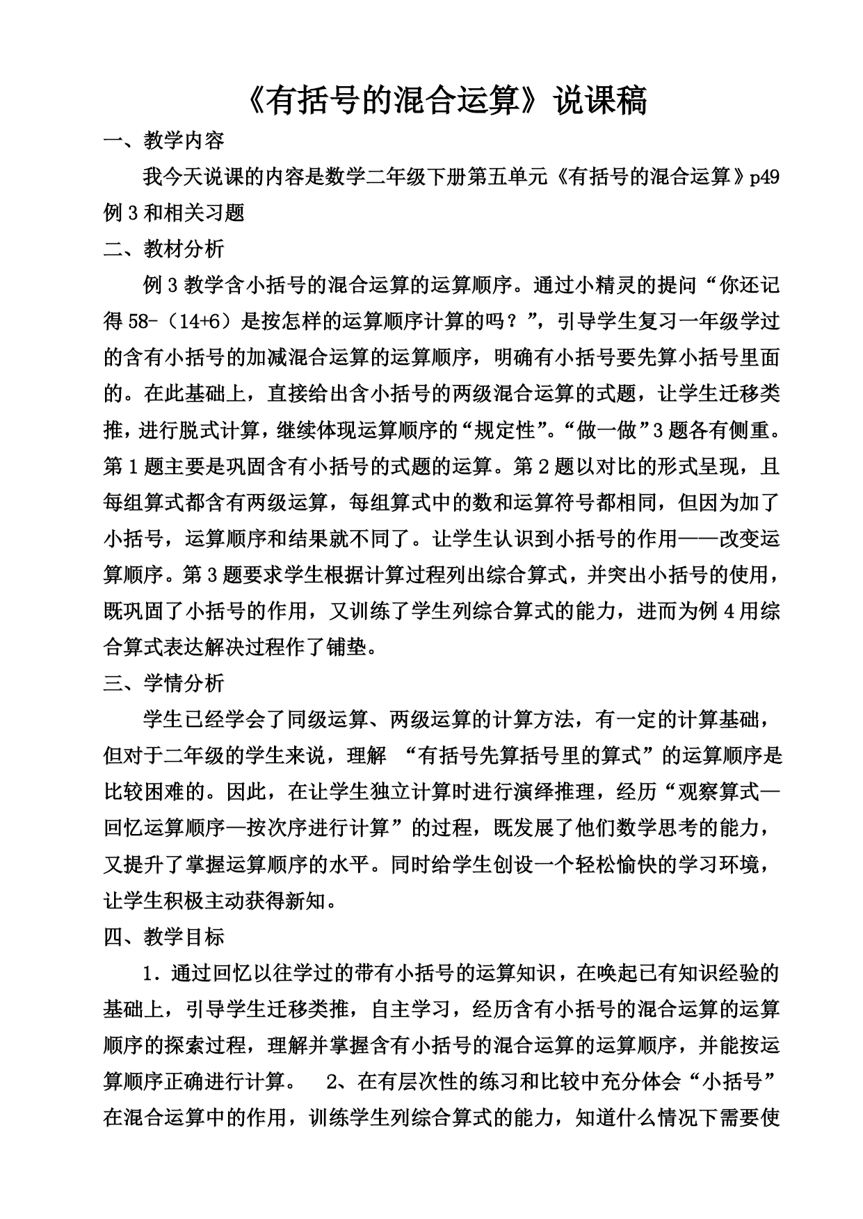 《有括号的混合运算》说课稿一、教学内容我今天说课的内容是数学二年级下册第五单元《有括号的混合运算》p49例3和相关习题二、教材分析例3教学含小括号的混合运算的运算顺序。通过小精灵的提问“你还记得58-(14+6)是按怎样的运算顺序计算的吗?”,引导学生复习一年级学过的含有小括号的加减混合运算的运算顺序,明确有小括号要先算小括号里面的。在此基础上,直接给出含小括号的两级混合运算的式题,让学生迁移类推,进行脱式计算,继续体现运算顺序的“规定性”。“做一做”3题各有侧重。第1题主要是巩固含有小括号的式题的运算。