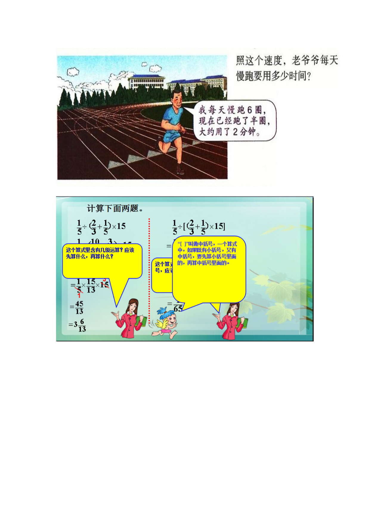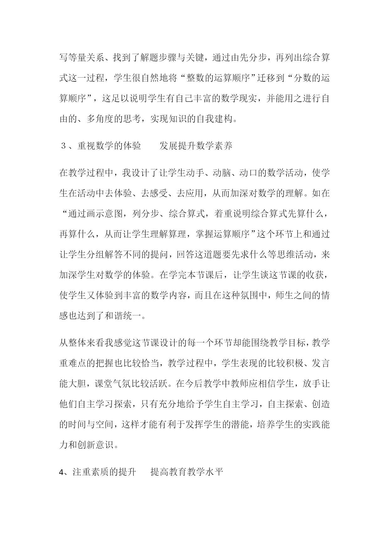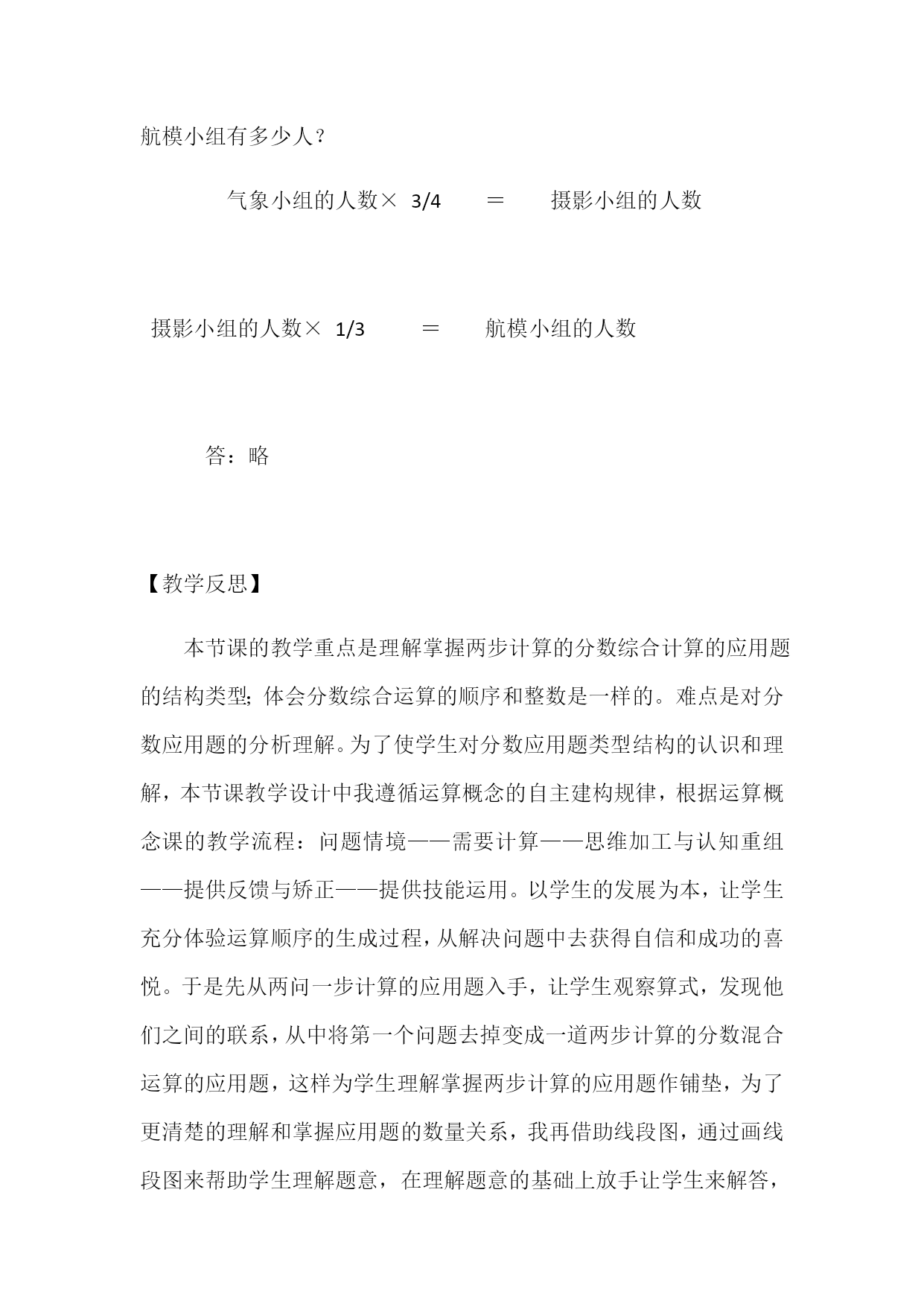 “分数乘除混合运算”教学反思本课的教学内容比较简单,学生又有了预习作业的练习与尝试,因此教学时我放手让学生独立解答,思维快的学生要求用两种方法解答。学生在独立解答时,我巡视到许多学生已经用综合算式在计算,因有了分数乘除法计算方法的基础,分数乘除混合运算的计算正确率较高。在全班交流时,我适时出示学生中的另一种计算方法:逐步计算逐步约分的方法,组织学生进行比较,从而优化方法,理解混合运算转化的算理。学会了分数连除和分数乘除法混合运算的计算方法,但在课上的计算练习中还是发现少数学生计算时错误较多:有些学生没有把