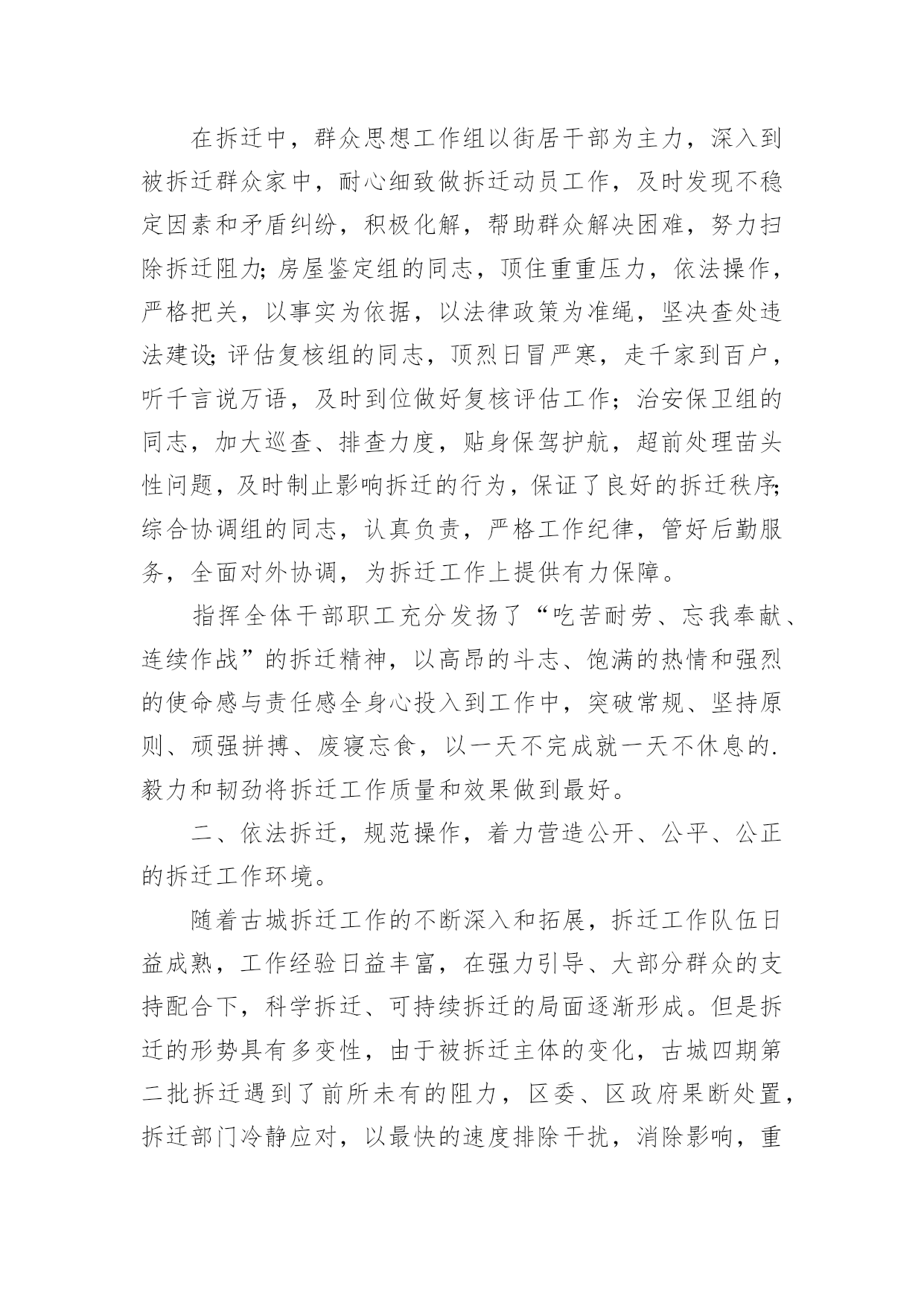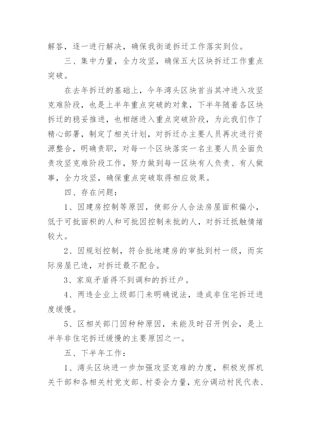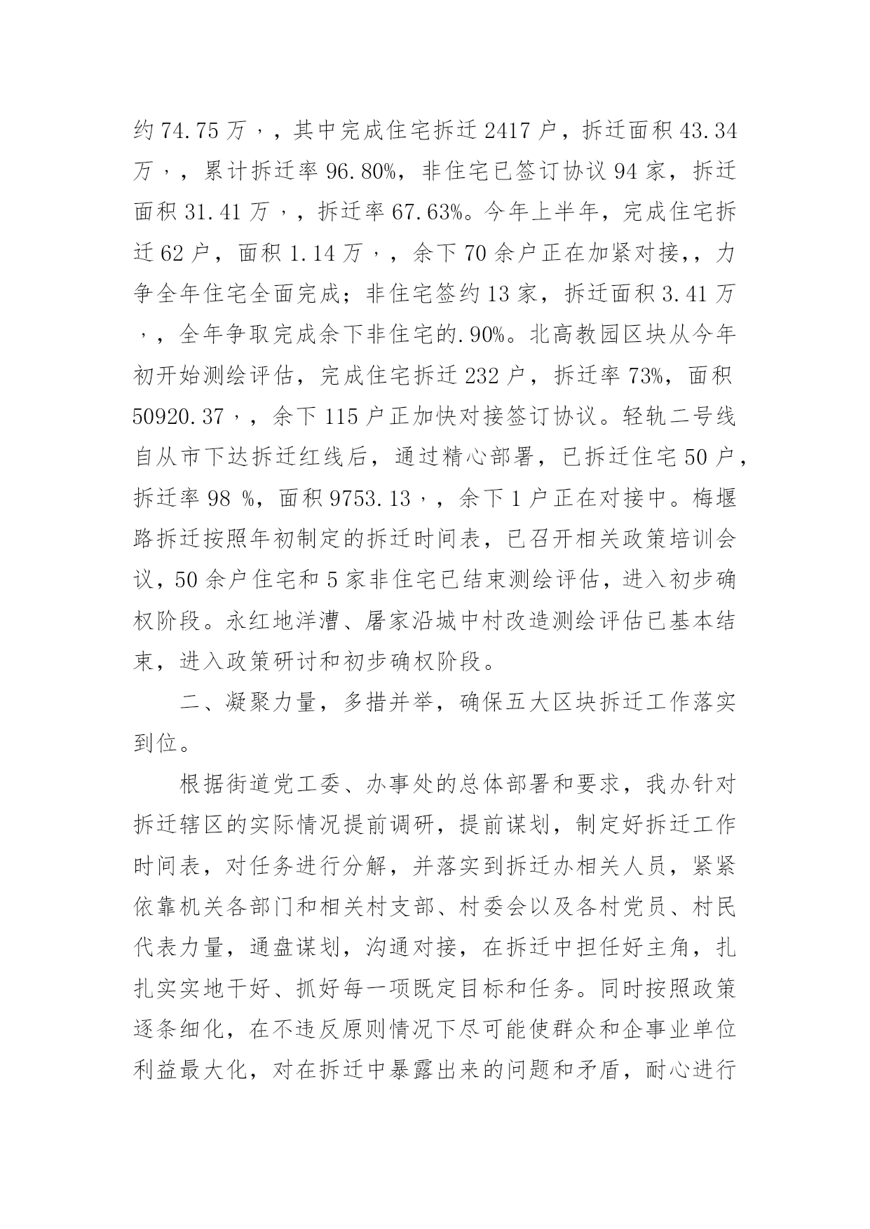 拆迁工作总结总结是对某一阶段的工作、学习或思想中的经验或情况进行分析研究的书面材料,它在我们的学习、工作中起到呈上启下的作用,让我们一起认真地写一份总结吧。那么总结要注意有什么内容呢?下面是小编为大家整理的拆迁工作总结,欢迎阅读与收藏。拆迁工作总结1半年来,在街道党工委、办事处的正确领导下,在上级业务部门的大力帮助、支持下,在拆迁办全体同志和机关各部门及相关行政村的共同努力配合下,我们凝百倍干劲、聚千股力量,奔着改善甬江群众民生、铺就甬江未来成就的决心和信心,充分发挥亮剑精神、长征精神,通过计划安排、精心部署、超行谋划、稳妥推进,征地拆迁工作从一个区域向重点突破口、全面铺开的方向转变,本着拆迁一处,造福一片,稳定一方的原则,积极采取一系列有效措施,使我街道住宅、非住宅拆迁稳步推进。一、精心组织,合理安排,稳妥推进五大区块拆迁工作。上半年,按照上级布置的拆迁进度计划,精心部署好五大区块的拆迁时间表,把拆迁任务分解到相关村和拆迁办全体成员,责任落实到人,并根据拆迁时间节点抓好调研,对接工作,建立抓拆迁、抓推进、抓落实的工作机制,形成全面推进征地拆迁的浓厚氛围。至目前湾头区块已累计拆迁签约74.75万﹐,其中完成住宅拆迁2417户,拆迁面积43.34万﹐,累计拆迁率96.80%,非住宅已签订协议94家,拆迁面积31.41万﹐,拆迁率67.63%。今年上半年,完成住宅拆迁62户,面积1.14万﹐,余下70余户正在加紧对接,,力争全年住宅全面完成;非住宅签约13家,拆迁面积3.41万﹐,全年争取完成余下非住宅的.90%。北高教园区块从今年初开始测绘评估,完成住宅拆迁232户,拆迁率73%,面积50920.37﹐,余下115户正加快对接签订协议。轻轨二号线自从市下达拆迁红线后,通过精心部署,已拆迁住宅50户,拆迁率98%,面积9753.13﹐,余下1户正在对接中。梅堰路拆迁按照年初制定的拆迁时间表,已召开相关政策培训会议,50余户住宅和5家非住宅已结束测绘评估,进入初步确权阶段。永红地洋漕、屠家沿城中村改造测绘评估已基本结束,进入政策研讨和初步确权阶段。二、凝聚力量,多措并举,确保五大区块拆迁工作落实到位。根据街道党工委、办事处的总体部署和要求,我办针对拆迁辖区的实际情况提前调研,提前谋划,制定好拆迁工作时间表,对任务进行分解,并落实到拆迁办相关人员,紧紧依靠机关各部门和相关村支部、村委会以及各村党员、村民代表力量,通盘谋划,沟通对接,在拆迁中担任好主角,扎扎实实地干好、抓好每一项既定目标和任务。同时按照政策逐条细化,在不违反原则情况下尽可能使群众和企事业单位利益最大化,对在拆迁中暴露出来的问题和矛盾,耐心进行解答,逐一进行解决,确保我街道拆迁工作落实到位。三、集中力量,全力攻坚,确保五大区块拆迁工作重点突破。在去年拆迁的基础上,今年湾头区块首当其冲进入攻坚克难阶段,也是上半年重点突破的对象,下半年随着各区块拆迁的稳妥推进,也相继进入重点突破阶段,为此我们作了精心部署,制定了相关计划,对拆迁办主要人员再次进行资源整合,明确责职,对每一个区块落实一名主要人员全面负责攻坚克难阶段工作,努力做到每一区块有人负责、有人做事,全力攻坚,确保重点突破取得相应效果。四、存在问题:1、因建房控制等原因,使部分人合法房屋面积偏小,低于可批面积的人和可批因控制未批的人,对拆迁抵触情绪较大。2、因规划控制,符合批地建房的审批到村一级,而实际房屋已造,对拆迁最不配合。3、家庭矛盾得不到调和的拆迁户。4、两违企业上级部门未明确说法,造成非住宅拆迁进度缓慢。5、区相关部门因种种原因,未能及时召开例会,是上半年非住宅拆迁缓慢的主要原因之一。五、下半年工作:1、湾头区块进一步加强攻坚克难的力度,积极发挥机关干部和各相关村党支部、村委会力量,充分调动村民代表、党员的积极性,努力做到与钉子户面对面对接,对每一户钉子户和非住宅会同相关村进行排摸分析,找准突破口,力争在年底前区域内不留一户拆迁户。2、其他4个区块按照年初制定的拆迁时间表,落实好人员,制定好计划逐步稳妥推进,及时做好攻坚克难准备工作,圆满完成上级部署的目标和任务。拆迁工作总结2去年年底以来,区拆迁办在区委、区政府的坚强领导下,以当好开路先锋、全力服务古城建设为己任,团结带领全区广大涉拆部门,扎实苦干、攻坚克难,相继完成了古城三期南区、古城四期第一批及配套工程拆迁任务,开展了新农村建设拆迁指导工作,正在集中力量处理古城四期第二批剩余任务,共动迁居民1413户,拆除房屋面积25.4平方米,在拆迁数量和质量上实现了新突破,拆迁效果为历史最好,保障了古城及其它重点项目顺利开工建设。一、合力拆迁,精兵战略,倾力打造务实高效的拆迁工作机制。拆迁项目开工前,拆迁指挥部经过严格考察、精挑细选,从全区抽调110余名素质高、业务