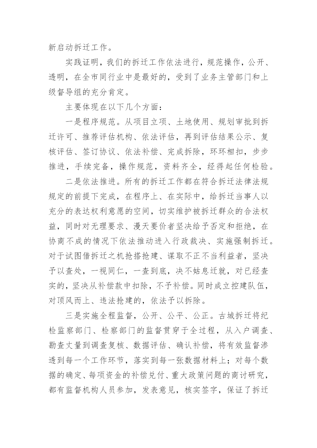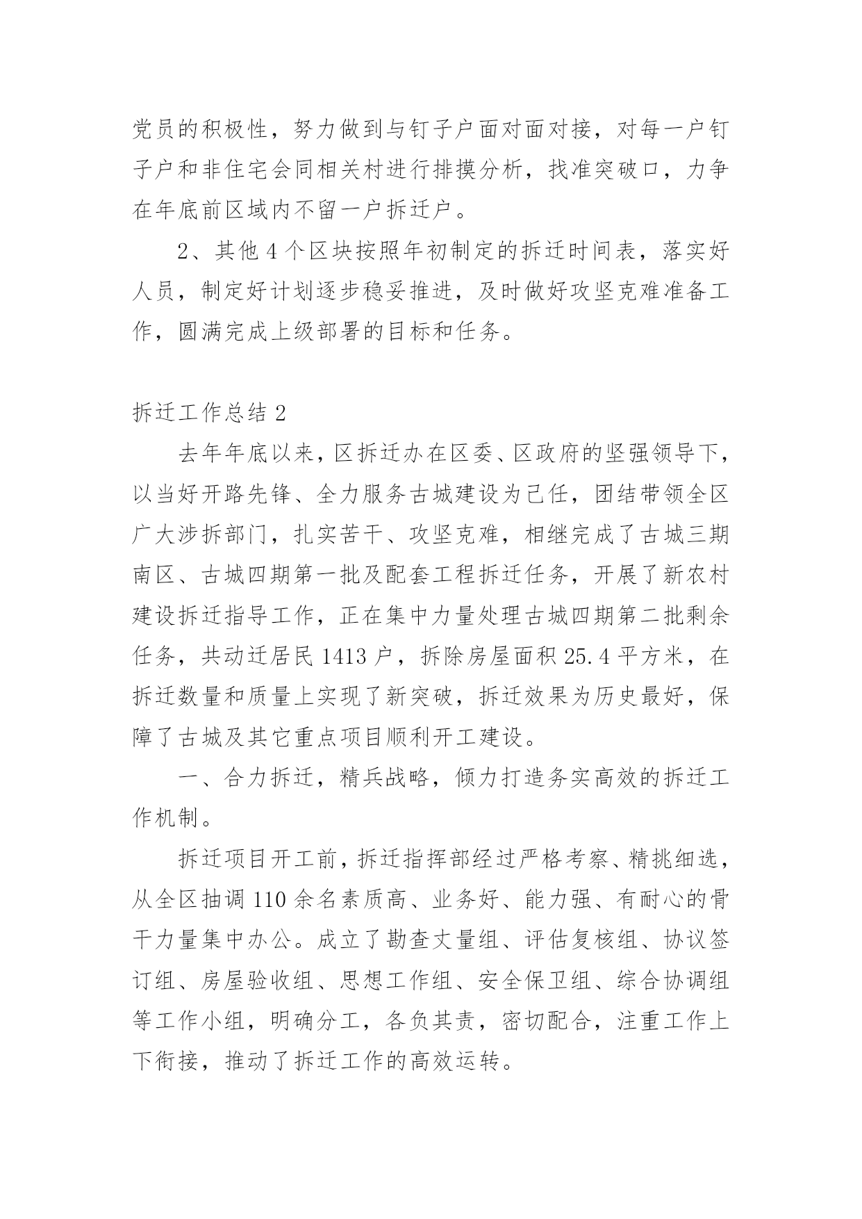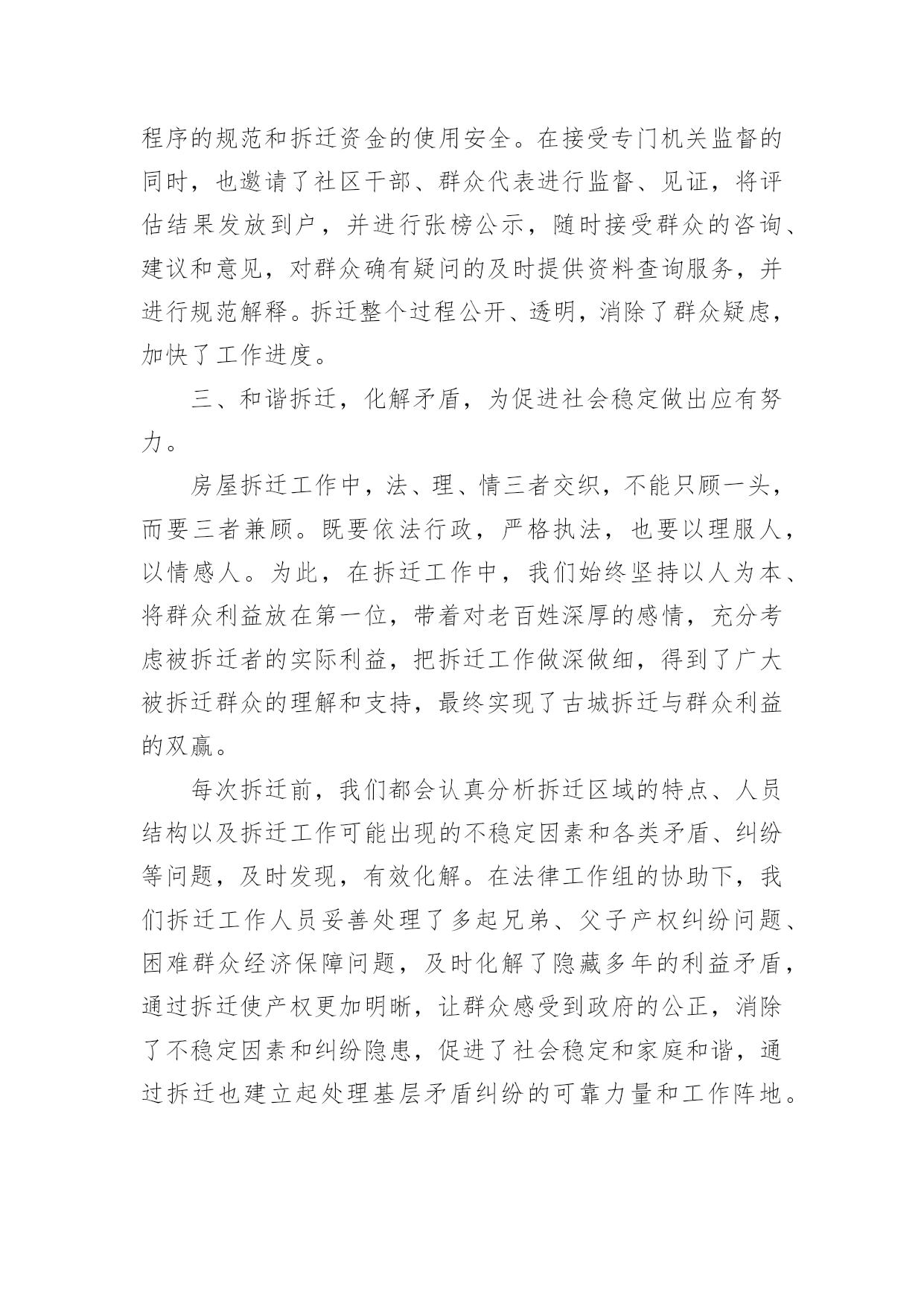 拆迁工作总结总结是对某一阶段的工作、学习或思想中的经验或情况进行分析研究的书面材料,它在我们的学习、工作中起到呈上启下的作用,让我们一起认真地写一份总结吧。那么总结要注意有什么内容呢?下面是小编为大家整理的拆迁工作总结,欢迎阅读与收藏。拆迁工作总结1半年来,在街道党工委、办事处的正确领导下,在上级业务部门的大力帮助、支持下,在拆迁办全体同志和机关各部门及相关行政村的共同努力配合下,我们凝百倍干劲、聚千股力量,奔着改善甬江群众民生、铺就甬江未来成就的决心和信心,充分发挥亮剑精神、长征精神,通过计划安排、精心部署、超行谋划、稳妥推进,征地拆迁工作从一个区域向重点突破口、全面铺开的方向转变,本着拆迁一处,造福一片,稳定一方的原则,积极采取一系列有效措施,使我街道住宅、非住宅拆迁稳步推进。一、精心组织,合理安排,稳妥推进五大区块拆迁工作。上半年,按照上级布置的拆迁进度计划,精心部署好五大区块的拆迁时间表,把拆迁任务分解到相关村和拆迁办全体成员,责任落实到人,并根据拆迁时间节点抓好调研,对接工作,建立抓拆迁、抓推进、抓落实的工作机制,形成全面推进征地拆迁的浓厚氛围。至目前湾头区块已累计拆迁签约74.75万﹐,其中完成住宅拆迁2417户,拆迁面积43.34万﹐,累计拆迁率96.80%,非住宅已签订协议94家,拆迁面积31.41万﹐,拆迁率67.63%。今年上半年,完成住宅拆迁62户,面积1.14万﹐,余下70余户正在加紧对接,,力争全年住宅全面完成;非住宅签约13家,拆迁面积3.41万﹐,全年争取完成余下非住宅的.90%。北高教园区块从今年初开始测绘评估,完成住宅拆迁232户,拆迁率73%,面积50920.37﹐,余下115户正加快对接签订协议。轻轨二号线自从市下达拆迁红线后,通过精心部署,已拆迁住宅50户,拆迁率98%,面积9753.13﹐,余下1户正在对接中。梅堰路拆迁按照年初制定的拆迁时间表,已召开相关政策培训会议,50余户住宅和5家非住宅已结束测绘评估,进入初步确权阶段。永红地洋漕、屠家沿城中村改造测绘评估已基本结束,进入政策研讨和初步确权阶段。二、凝聚力量,多措并举,确保五大区块拆迁工作落实到位。根据街道党工委、办事处的总体部署和要求,我办针对拆迁辖区的实际情况提前调研,提前谋划,制定好拆迁工作时间表,对任务进行分解,并落实到拆迁办相关人员,紧紧依靠机关各部门和相关村支部、村委会以及各村党员、村民代表力量,通盘谋划,沟通对接,在拆迁中担任好主角,扎扎实实地干好、抓好每一项既定目标和任务。同时按照政策逐条细化,在不违反原则情况下尽可能使群众和企事业单位利益最大化,对在拆迁中暴露出来的问题和矛盾,耐心进行解答,逐一进行解决,确保我街道拆迁工作落实到位。三、集中力量,全力攻坚,确保五大区块拆迁工作重点突破。在去年拆迁的基础上,今年湾头区块首当其冲进入攻坚克难阶段,也是上半年重点突破的对象,下半年随着各区块拆迁的稳妥推进,也相继进入重点突破阶段,为此我们作了精心部署,制定了相关计划,对拆迁办主要人员再次进行资源整合,明确责职,对每一个区块落实一名主要人员全面负责攻坚克难阶段工作,努力做到每一区块有人负责、有人做事,全力攻坚,确保重点突破取得相应效果。四、存在问题:1、因建房控制等原因,使部分人合法房屋面积偏小,低于可批面积的人和可批因控制未批的人,对拆迁抵触情绪较大。2、因规划控制,符合批地建房的审批到村一级,而实际房屋已造,对拆迁最不配合。3、家庭矛盾得不到调和的拆迁户。4、两违企业上级部门未明确说法,造成非住宅拆迁进度缓慢。5、区相关部门因种种原因,未能及时召开例会,是上半年非住宅拆迁缓慢的主要原因之一。五、下半年工作:1、湾头区块进一步加强攻坚克难的力度,积极发挥机关干部和各相关村党支部、村委会力量,充分调动村民代表、党员的积极性,努力做到与钉子户面对面对接,对每一户钉子户和非住宅会同相关村进行排摸分析,找准突破口,力争在年底前区域内不留一户拆迁户。2、其他4个区块按照年初制定的拆迁时间表,落实好人员,制定好计划逐步稳妥推进,及时做好攻坚克难准备工作,圆满完成上级部署的目标和任务。拆迁工作总结2去年年底以来,区拆迁办在区委、区政府的坚强领导下,以当好开路先锋、全力服务古城建设为己任,团结带领全区广大涉拆部门,扎实苦干、攻坚克难,相继完成了古城三期南区、古城四期第一批及配套工程拆迁任务,开展了新农村建设拆迁指导工作,正在集中力量处理古城四期第二批剩余任务,共动迁居民1413户,拆除房屋面积25.4平方米,在拆迁数量和质量上实现了新突破,拆迁效果为历史最好,保障了古城及其它重点项目顺利开工建设。一、合力拆迁,精兵战略,倾力打造务实高效的拆迁工作机制。拆迁项目开工前,拆迁指挥部经过严格考察、精挑细选,从全区抽调110余名素质高、业务