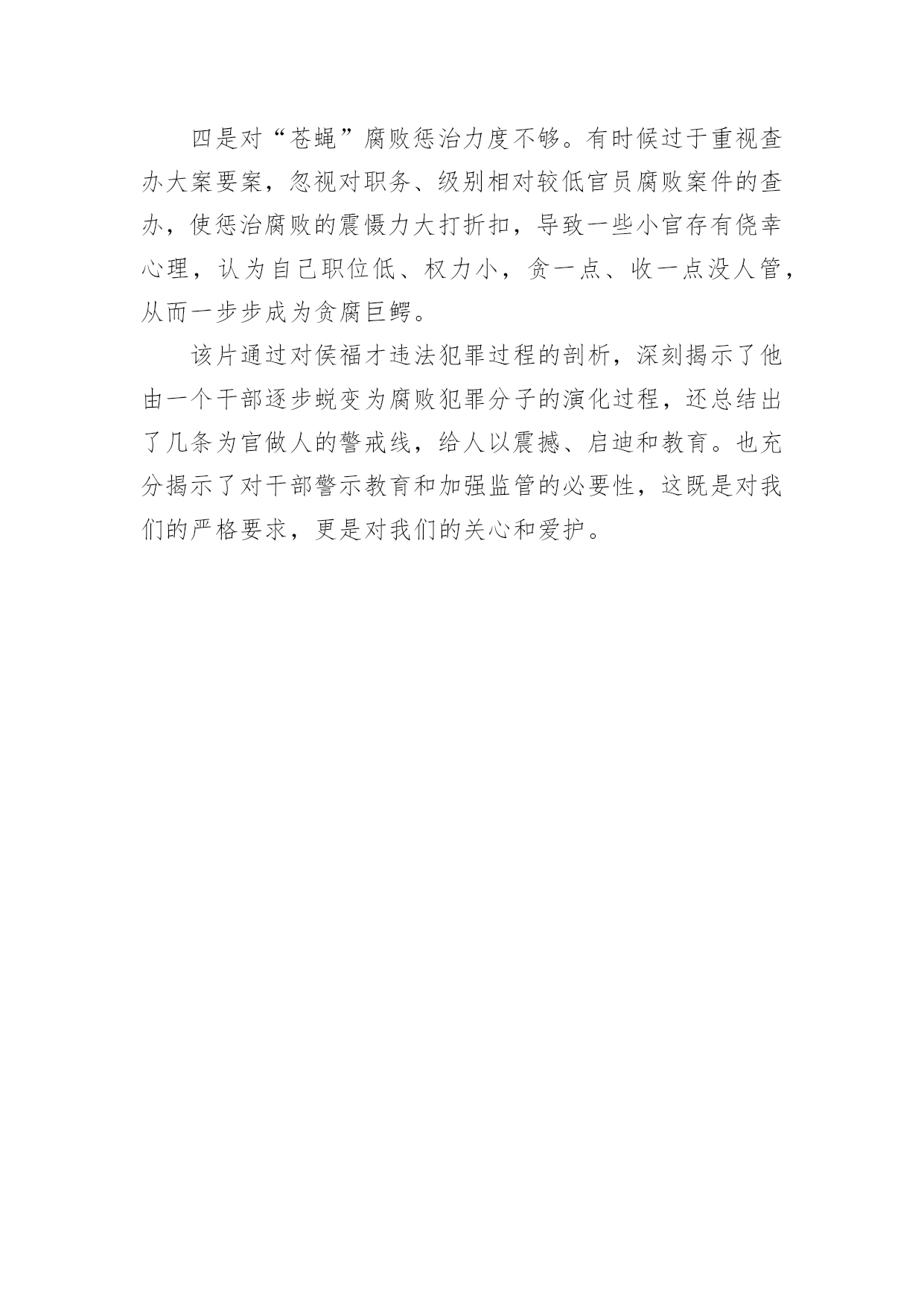 观看廉洁教育片观后感,廉洁教育警示片观后感在观赏了后,心中感慨万千,不禁为作品所深深折服,相信大家一定领会了不少东西,观后感就是自己的一种思想感悟,观后感相当注重“感”,也就是从作品中领悟出的道理与思想。可是观后感怎么写才合适呢?以下是小编为大家收集的观看廉洁教育片观后感,廉洁教育警示片观后感,希望对大家有所帮助。为了使广大党员干部增强廉洁自律意识,树立正确的人生观与价值观,8月26日,省工信厅组织机关全体党员干部分批观看学习了《小官大贪》,渭南市住房和城乡建设局建管科原科长侯福才贪腐警示录》。观看后我感触颇深,这类官员职位不高,胃口却颇大,以“苍蝇”的身份,干出了似乎只有“老虎”才能做成的事情,既让人瞠目,又催人警醒。“小官”何以成“大贪”?是因为这些“小官”实际权力并不小,他们行使的权力更加贴近群众,如若失控更能让群众感受到切肤之痛,动摇党的执政根基。因此,反腐败决不能“抓大放小”,对“苍蝇”腐败,既要穷追猛打,决不姑息养奸,也要刨根问底,寻求根治之策。“小官大贪”现象产生的原因有很多,如道德滑坡、信念垮塌、底线失守,抵挡不住形形色色的诱惑。但是,更深层次的原因在于权力失控、权力之手乱伸。一是权力过于集中。“绝对的权力容易导致腐败的滋生”,而“绝对的权力”主要源于权力过分集中。细数近年来发生的“小官大贪”案件,不难发现,涉案官员虽然职务不高,但大多掌握人事管理权、物资分配权或项目审批权等极具“含金量”的权力,且缺少有效制约。二是权力运行程序不规范。规范的权力运行程序,是防止权力滥用,遏制腐败的必要条件。但是,当前权力运行存在的突出问题之一,权力运行过程不透明、缺少相对方参与、权力行使者有时会无视规范程序,或改变程序,或减免程序,甚至会为了自身利益而自设程序,这些都为暗箱操作、权力寻租打开了方便之门。如警示片中提到的按照国家有关规定在工程项目拿到施工许可证之前必须缴纳“两费”,但因为侯福才是此项程序的最后把关人,所以他敢无视法定手续,使得施工单位只需按照“潜规则”给他的祥和公司缴纳无需退还的项目担保金就可直接发放施工许可证,造成国有资产的大量流失。三是权力监督存在盲点。权力无论大小,都有异化引发腐败的可能。但在监督机制的设置以及监督力量的投入方面,有时候存在认识误区:位高权重的“大人物”是重点监督对象,位卑权轻的“小人物”则可以选择性忽视。而“抓大放小”必然形成监督盲区,激荡起“小人物”滥用权力的涟漪。如警示片中提到的渭南市住建局很多领导和同志在侯福才案发前甚至都不知道他的具体办公地点在哪里,如此失控,何来监督?四是对“苍蝇”腐败惩治力度不够。有时候过于重视查办大案要案,忽视对职务、级别相对较低官员腐败案件的查办,使惩治腐败的震慑力大打折扣,导致一些小官存有侥幸心理,认为自己职位低、权力小,贪一点、收一点没人管,从而一步步成为贪腐巨鳄。该片通过对侯福才违法犯罪过程的剖析,深刻揭示了他由一个干部逐步蜕变为腐败犯罪分子的演化过程,还总结出了几条为官做人的警戒线,给人以震撼、启迪和教育。也充分揭示了对干部警示教育和加强监管的必要性,这既是对我们的严格要求,更是对我们的关心和爱护。