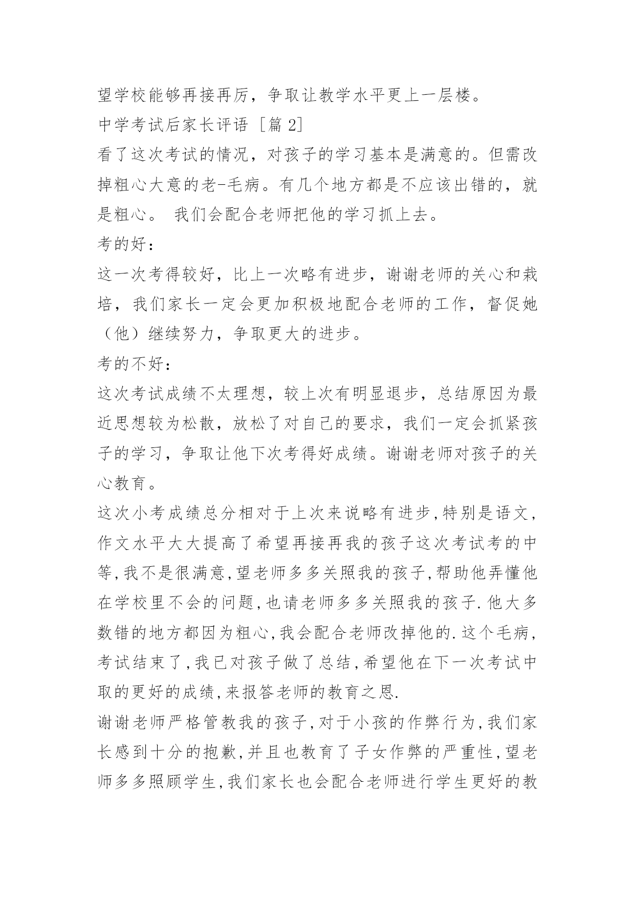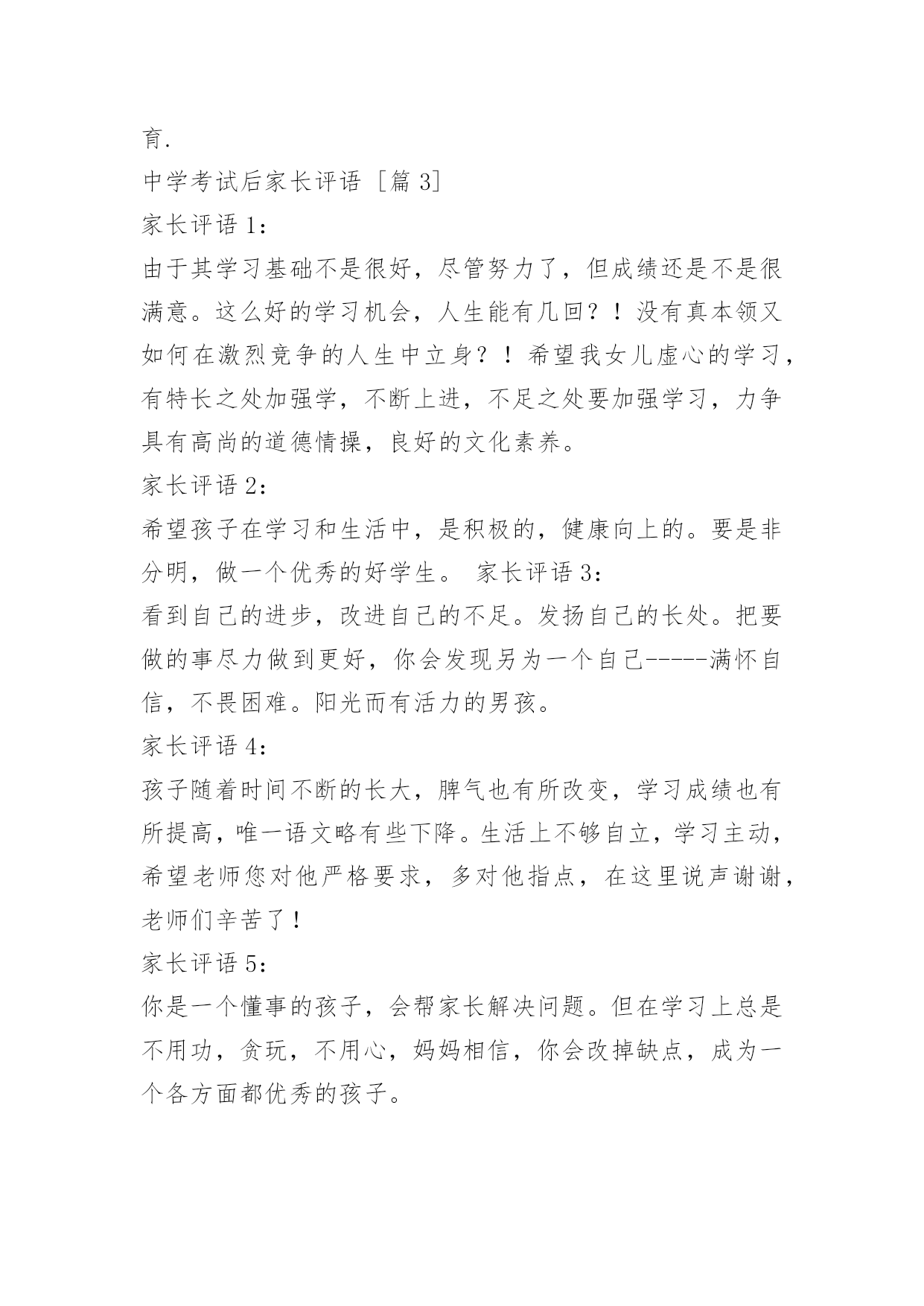 中学考试后家长评语中学考试后家长评语1、从孩子的卷子上来看,专业成绩算得上优秀。和上一次相比较,没有退步也没有进步。希望孩子继续努力,更上一层楼。同时也感谢教师平日对我孩子的培养,但是孩子还是有很多要努力的地方。有劳老师以后继续费心教育孩子。我们家长一定会鼎力支持,配合老师!2、老师,您好,首先,感谢您对孩子的教育,让他变得更加的聪明,懂事,孩子的成长离不开老师的教育,老师在孩子的心里具有神圣的地位。希望老师对孩子严加管教,使之变得更棒。希望孩子在以后更加的优秀,再此感谢老师辛勤的付出,当然我们做家长的也会密切配合老师!3、虽然这次成绩并不是班里名列前茅,但这只是一次测试,一次对自己知识的考验,一次查缺补漏的过程,可以让你看清自己不会的地方,对于马虎,在下次考试中要尽量避免,争取取得更大进步!4、孩子考得不是很好,可能是疏忽了,尤其是某某这几科,有点小退步,让我有点惊讶,以往以后孩子可以认真的对待学习,对待考试,既不要太过于担心成绩也不要轻敌。妈妈(爸爸)相信你,一定可以在下一次给我一张满意的答卷!5、本人以为此次语文考试出题难度适中、题量正好,能够准确考察学生的语文能力。我的孩子在此次考试中已经尽了力,发挥了他的正常水平,这个分数也是在意料之中的。希望学校能够再接再厉,争取让教学水平更上一层楼。中学考试后家长评语[篇2]看了这次考试的情况,对孩子的学习基本是满意的。但需改掉粗心大意的老-毛病。有几个地方都是不应该出错的,就是粗心。我们会配合老师把他的学习抓上去。考的好:这一次考得较好,比上一次略有进步,谢谢老师的关心和栽培,我们家长一定会更加积极地配合老师的工作,督促她(他)继续努力,争取更大的进步。考的不好:这次考试成绩不太理想,较上次有明显退步,总结原因为最近思想较为松散,放松了对自己的要求,我们一定会抓紧孩子的学习,争取让他下次考得好成绩。谢谢老师对孩子的关心教育。这次小考成绩总分相对于上次来说略有进步,特别是语文,作文水平大大提高了希望再接再我的孩子这次考试考的中等,我不是很满意,望老师多多关照我的孩子,帮助他弄懂他在学校里不会的问题,也请老师多多关照我的孩子.他大多数错的地方都因为粗心,我会配合老师改掉他的.这个毛病,考试结束了,我已对孩子做了总结,希望他在下一次考试中取的更好的成绩,来报答老师的教育之恩.谢谢老师严格管教我的孩子,对于小孩的作弊行为,我们家长感到十分的抱歉,并且也教育了子女作弊的严重性,望老师多多照顾学生,我们家长也会配合老师进行学生更好的教育.中学考试后家长评语[篇3]家长评语1:由于其学习基础不是很好,尽管努力了,但成绩还是不是很满意。这么好的学习机会,人生能有几回?!没有真本领又如何在激烈竞争的人生中立身?!希望我女儿虚心的学习,有特长之处加强学,不断上进,不足之处要加强学习,力争具有高尚的道德情操,良好的文化素养。家长评语2:希望孩子在学习和生活中,是积极的,健康向上的。要是非分明,做一个优秀的好学生。家长评语3:看到自己的进步,改进自己的不足。发扬自己的长处。把要做的事尽力做到更好,你会发现另为一个自己-----满怀自信,不畏困难。阳光而有活力的男孩。家长评语4:孩子随着时间不断的长大,脾气也有所改变,学习成绩也有所提高,唯一语文略有些下降。生活上不够自立,学习主动,希望老师您对他严格要求,多对他指点,在这里说声谢谢,老师们辛苦了!家长评语5:你是一个懂事的孩子,会帮家长解决问题。但在学习上总是不用功,贪玩,不用心,妈妈相信,你会改掉缺点,成为一个各方面都优秀的孩子。