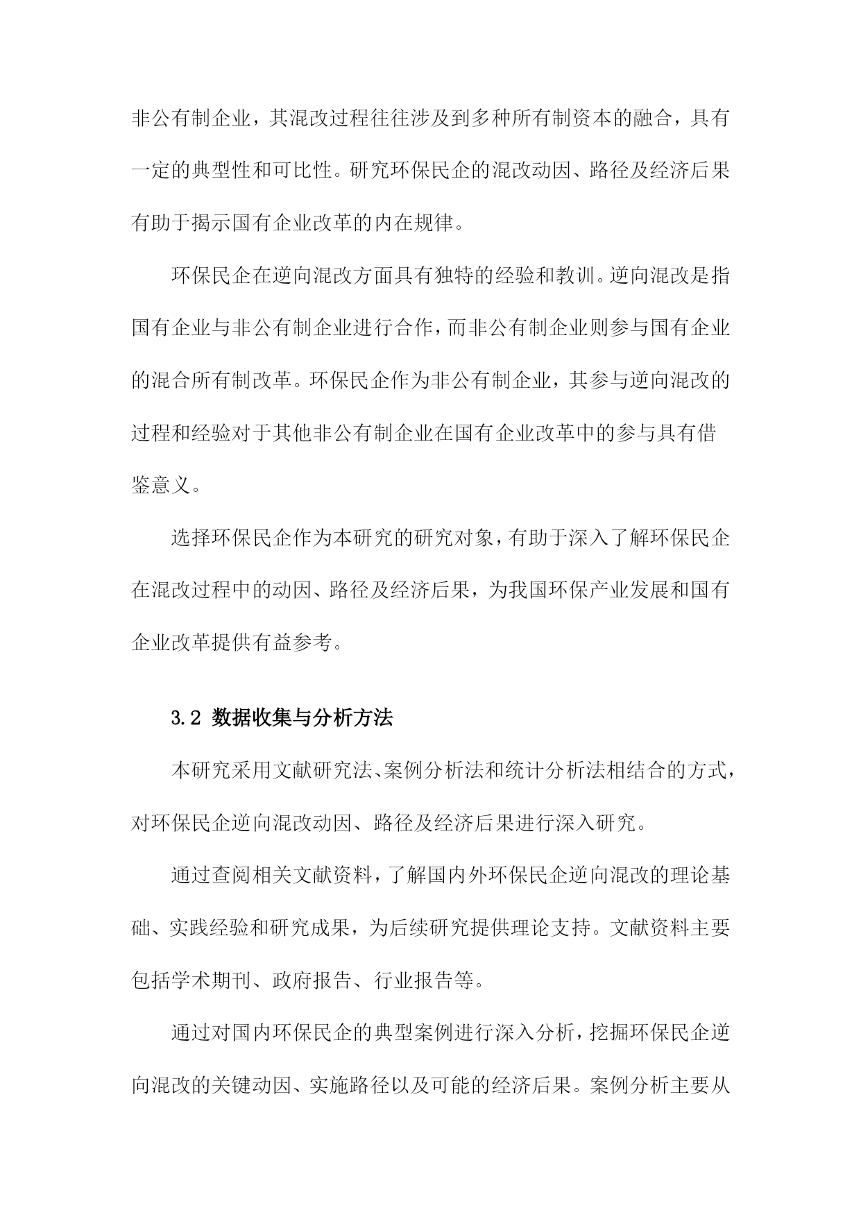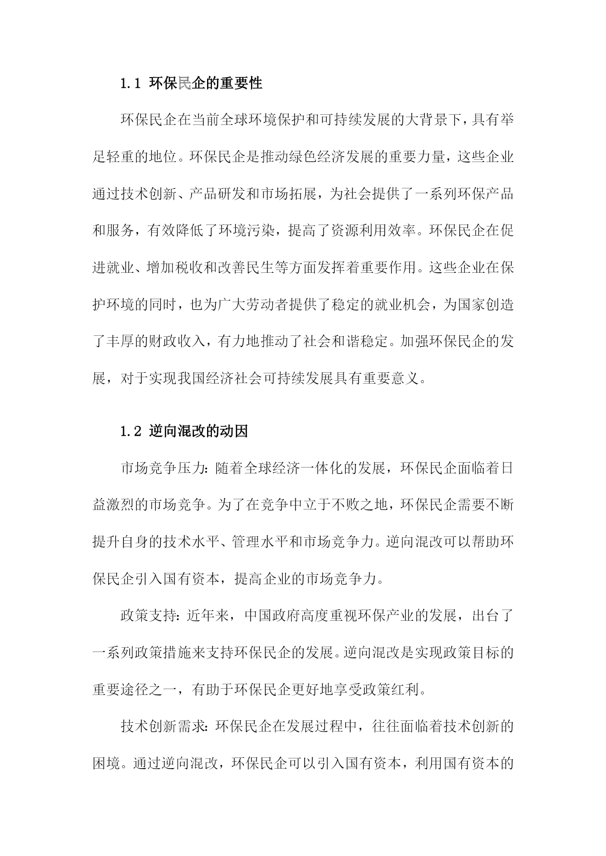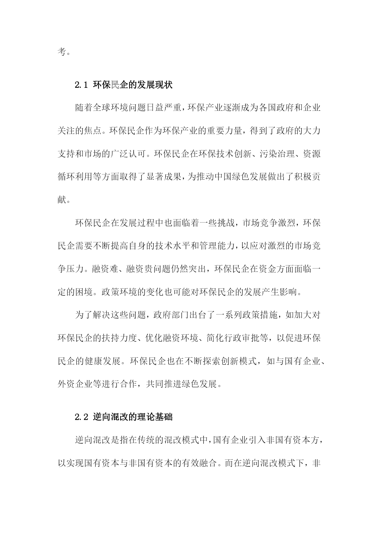 环保民企逆向混改动因、路径及经济后果研究1.研究背景和意义随着中国经济的快速发展,环保产业逐渐成为国家战略性新兴产业的重要组成部分。在环保产业发展的过程中,民营企业在市场竞争中往往面临着诸多困难,如融资难、技术瓶颈、市场准入等。为了解决这些问题,政府部门提出了一系列政策措施,鼓励民间资本参与环保产业的发展。逆向混改作为一种新型的混合所有制改革模式,旨在通过引入民间资本,优化企业治理结构,提高企业的核心竞争力,从而推动环保产业的可持续发展。环保民企逆向混改动因、路径及经济后果研究具有重要的现实意义。通过对环保民企逆向混改的研究,可以为政府部门制定相关政策提供理论依据和实践参考。研究结果有助于揭示环保民企逆向混改的动因机制,为企业管理者提供有效的经营策略。研究还可以为投资者提供有关环保民企逆向混改的投资建议,促进社会资本的有效配置。环保民企逆向混改动因、路径及经济后果研究对于推动环保产业发展、优化企业治理结构、提高企业竞争力具有重要的理论和实践价值。1.1环保民企的重要性环保民企在当前全球环境保护和可持续发展的大背景下,具有举足轻重的地位。环保民企是推动绿色经济发展的重要力量,这些企业通过技术创新、产品研发和市场拓展,为社会提供了一系列环保产品和服务,有效降低了环境污染,提高了资源利用效率。环保民企在促进就业、增加税收和改善民生等方面发挥着重要作用。这些企业在保护环境的同时,也为广大劳动者提供了稳定的就业机会,为国家创造了丰厚的财政收入,有力地推动了社会和谐稳定。加强环保民企的发展,对于实现我国经济社会可持续发展具有重要意义。1.2逆向混改的动因市场竞争压力:随着全球经济一体化的发展,环保民企面临着日益激烈的市场竞争。为了在竞争中立于不败之地,环保民企需要不断提升自身的技术水平、管理水平和市场竞争力。逆向混改可以帮助环保民企引入国有资本,提高企业的市场竞争力。政策支持:近年来,中国政府高度重视环保产业的发展,出台了一系列政策措施来支持环保民企的发展。逆向混改是实现政策目标的重要途径之一,有助于环保民企更好地享受政策红利。技术创新需求:环保民企在发展过程中,往往面临着技术创新的困境。通过逆向混改,环保民企可以引入国有资本,利用国有资本的技术优势,推动企业的技术创新,提高企业的核心竞争力。资源整合需求:环保民企在发展过程中,往往需要整合各类资源,包括人才、技术、资金等。逆向混改可以帮助环保民企实现资源整合,提高资源利用效率,降低企业运营成本。国际化发展需求:随着全球经济一体化的发展,环保民企需要拓展国际市场,提高国际竞争力。逆向混改可以帮助环保民企引入国有资本,提升企业的国际竞争力,实现国际化发展。环保民企逆向混改的动因主要是为了应对市场竞争压力、享受政策支持、满足技术创新需求、实现资源整合和拓展国际市场等方面的需求。2.文献综述环保民企逆向混改是指在环境保护和社会责任的前提下,民营企业通过与国有企业进行混合所有制改革,实现企业转型升级和可持续发展。随着国家对环境保护的重视和对企业社会责任的要求不断提高,环保民企逆向混改成为了一个研究热点。本文将对环保民企逆向混改动因、路径及经济后果进行研究。从动因方面来看,环保民企逆向混改的原因主要有两个方面:一是政策导向。国家对环境保护和企业社会责任的要求不断提高,出台了一系列政策措施鼓励和支持环保民企逆向混改。二是企业自身需求,环保民企在面临市场竞争压力和环境监管风险的同时,也需要寻求转型升级和可持续发展的途径。环保民企逆向混改既是政策导向的结果,也是企业自身发展的需要。从路径方面来看,环保民企逆向混改主要包括以下几种方式:一是与国有企业进行战略合作。环保民企可以与国有企业共同开展技术研发、市场拓展等方面的合作,实现资源共享和优势互补。二是参与国有企业的股权投资和并购,环保民企可以通过股权投资或并购的方式,加入国有企业的产业链或价值链,提高自身的市场地位和竞争力。三是设立合资公司,环保民企可以与国有企业共同设立合资公司,实现双方在技术、管理、市场等方面的优势互补。从经济后果方面来看,环保民企逆向混改具有一定的经济效益。环保民企可以通过与国有企业的合作,获得更多的政策支持和资源投入,降低企业的经营成本和风险。环保民企逆向混改有助于提高企业的技术水平和管理水平,提升企业的核心竞争力,实现可持续发展。环保民企逆向混改也存在一定的问题和挑战,如如何平衡国有资本和民营资本的利益分配、如何确保环保民企在混改过程中的自主权等。环保民企逆向混改是一个复杂的过程,涉及到政策、市场、管理和经济等多个方面。本文通过对相关文献的综述,梳理了环保民企逆向混改的动因、路径及经济后果,为后续的研究提供了理论依据和参考。2.1环保民企的发展现状随着全球环境问题日益严重,环保产业逐渐成为