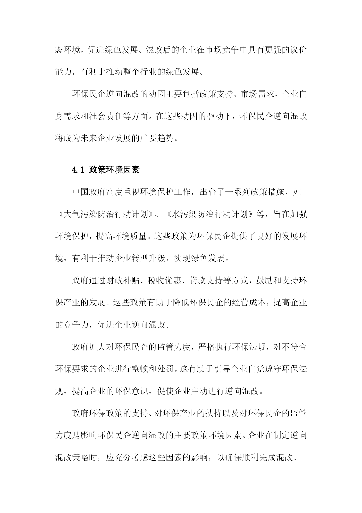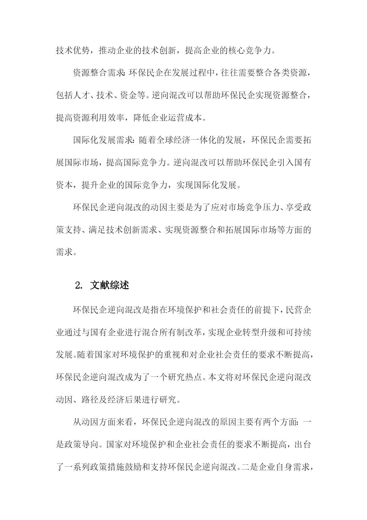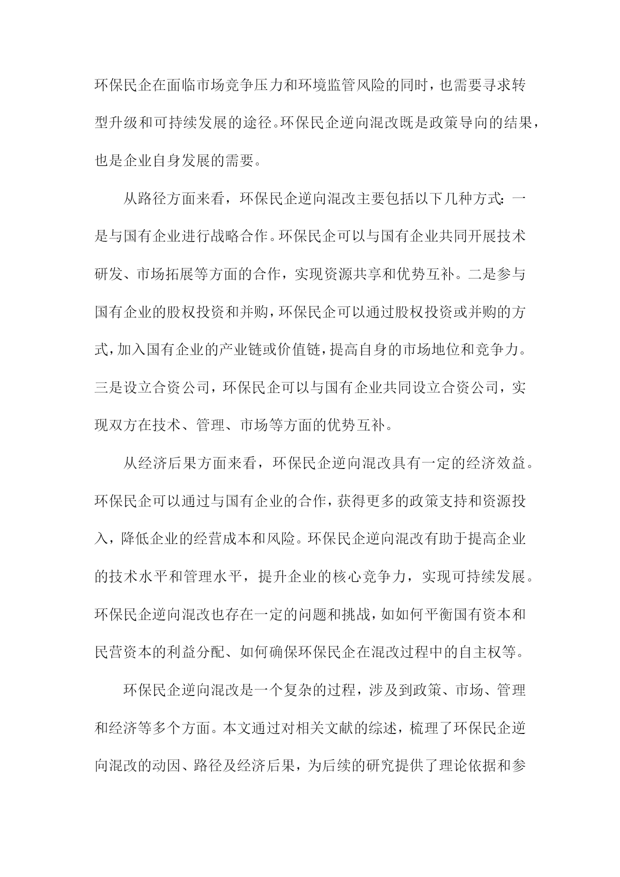 环保民企逆向混改动因、路径及经济后果研究1.研究背景和意义随着中国经济的快速发展,环保产业逐渐成为国家战略性新兴产业的重要组成部分。在环保产业发展的过程中,民营企业在市场竞争中往往面临着诸多困难,如融资难、技术瓶颈、市场准入等。为了解决这些问题,政府部门提出了一系列政策措施,鼓励民间资本参与环保产业的发展。逆向混改作为一种新型的混合所有制改革模式,旨在通过引入民间资本,优化企业治理结构,提高企业的核心竞争力,从而推动环保产业的可持续发展。环保民企逆向混改动因、路径及经济后果研究具有重要的现实意义。通过对环保民企逆向混改的研究,可以为政府部门制定相关政策提供理论依据和实践参考。研究结果有助于揭示环保民企逆向混改的动因机制,为企业管理者提供有效的经营策略。研究还可以为投资者提供有关环保民企逆向混改的投资建议,促进社会资本的有效配置。环保民企逆向混改动因、路径及经济后果研究对于推动环保产业发展、优化企业治理结构、提高企业竞争力具有重要的理论和实践价值。1.1环保民企的重要性环保民企在当前全球环境保护和可持续发展的大背景下,具有举足轻重的地位。环保民企是推动绿色经济发展的重要力量,这些企业通过技术创新、产品研发和市场拓展,为社会提供了一系列环保产品和服务,有效降低了环境污染,提高了资源利用效率。环保民企在促进就业、增加税收和改善民生等方面发挥着重要作用。这些企业在保护环境的同时,也为广大劳动者提供了稳定的就业机会,为国家创造了丰厚的财政收入,有力地推动了社会和谐稳定。加强环保民企的发展,对于实现我国经济社会可持续发展具有重要意义。1.2逆向混改的动因市场竞争压力:随着全球经济一体化的发展,环保民企面临着日益激烈的市场竞争。为了在竞争中立于不败之地,环保民企需要不断提升自身的技术水平、管理水平和市场竞争力。逆向混改可以帮助环保民企引入国有资本,提高企业的市场竞争力。政策支持:近年来,中国政府高度重视环保产业的发展,出台了一系列政策措施来支持环保民企的发展。逆向混改是实现政策目标的重要途径之一,有助于环保民企更好地享受政策红利。技术创新需求:环保民企在发展过程中,往往面临着技术创新的困境。通过逆向混改,环保民企可以引入国有资本,利用国有资本的技术优势,推动企业的技术创新,提高企业的核心竞争力。资源整合需求:环保民企在发展过程中,往往需要整合各类资源,包括人才、技术、资金等。逆向混改可以帮助环保民企实现资源整合,提高资源利用效率,降低企业运营成本。国际化发展需求:随着全球经济一体化的发展,环保民企需要拓展国际市场,提高国际竞争力。逆向混改可以帮助环保民企引入国有资本,提升企业的国际竞争力,实现国际化发展。环保民企逆向混改的动因主要是为了应对市场竞争压力、享受政策支持、满足技术创新需求、实现资源整合和拓展国际市场等方面的需求。2.文献综述环保民企逆向混改是指在环境保护和社会责任的前提下,民营企业通过与国有企业进行混合所有制改革,实现企业转型升级和可持续发展。随着国家对环境保护的重视和对企业社会责任的要求不断提高,环保民企逆向混改成为了一个研究热点。本文将对环保民企逆向混改动因、路径及经济后果进行研究。从动因方面来看,环保民企逆向混改的原因主要有两个方面:一是政策导向。国家对环境保护和企业社会责任的要求不断提高,出台了一系列政策措施鼓励和支持环保民企逆向混改。二是企业自身需求,环保民企在面临市场竞争压力和环境监管风险的同时,也需要寻求转型升级和可持续发展的途径。环保民企逆向混改既是政策导向的结果,也是企业自身发展的需要。从路径方面来看,环保民企逆向混改主要包括以下几种方式:一是与国有企业进行战略合作。环保民企可以与国有企业共同开展技术研发、市场拓展等方面的合作,实现资源共享和优势互补。二是参与国有企业的股权投资和并购,环保民企可以通过股权投资或并购的方式,加入国有企业的产业链或价值链,提高自身的市场地位和竞争力。三是设立合资公司,环保民企可以与国有企业共同设立合资公司,实现双方在技术、管理、市场等方面的优势互补。从经济后果方面来看,环保民企逆向混改具有一定的经济效益。环保民企可以通过与国有企业的合作,获得更多的政策支持和资源投入,降低企业的经营成本和风险。环保民企逆向混改有助于提高企业的技术水平和管理水平,提升企业的核心竞争力,实现可持续发展。环保民企逆向混改也存在一定的问题和挑战,如如何平衡国有资本和民营资本的利益分配、如何确保环保民企在混改过程中的自主权等。环保民企逆向混改是一个复杂的过程,涉及到政策、市场、管理和经济等多个方面。本文通过对相关文献的综述,梳理了环保民企逆向混改的动因、路径及经济后果,为后续的研究提供了理论依据和参考。2.1环保民企的发展现状随着全球环境问题日益严重,环保产业逐渐成为