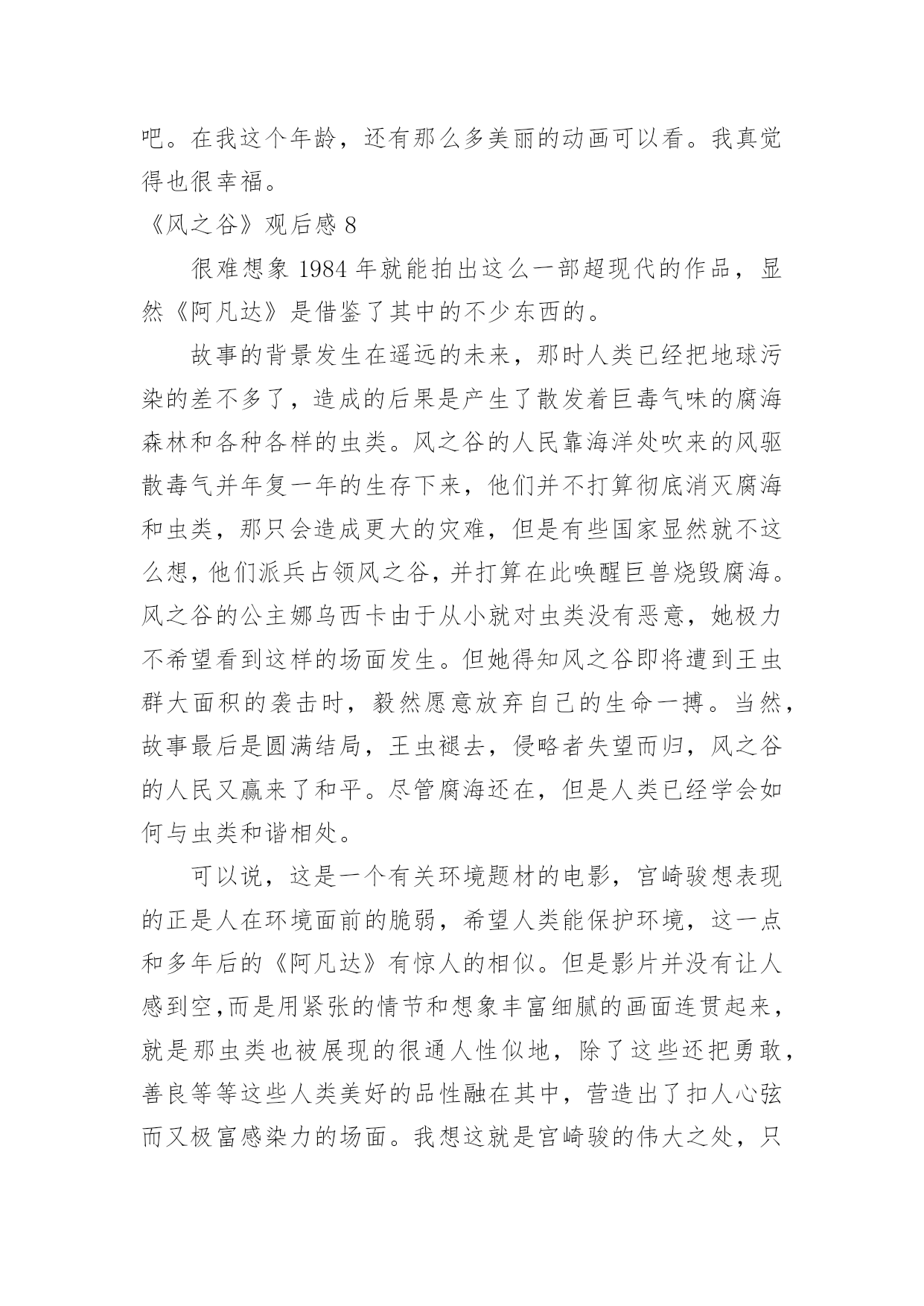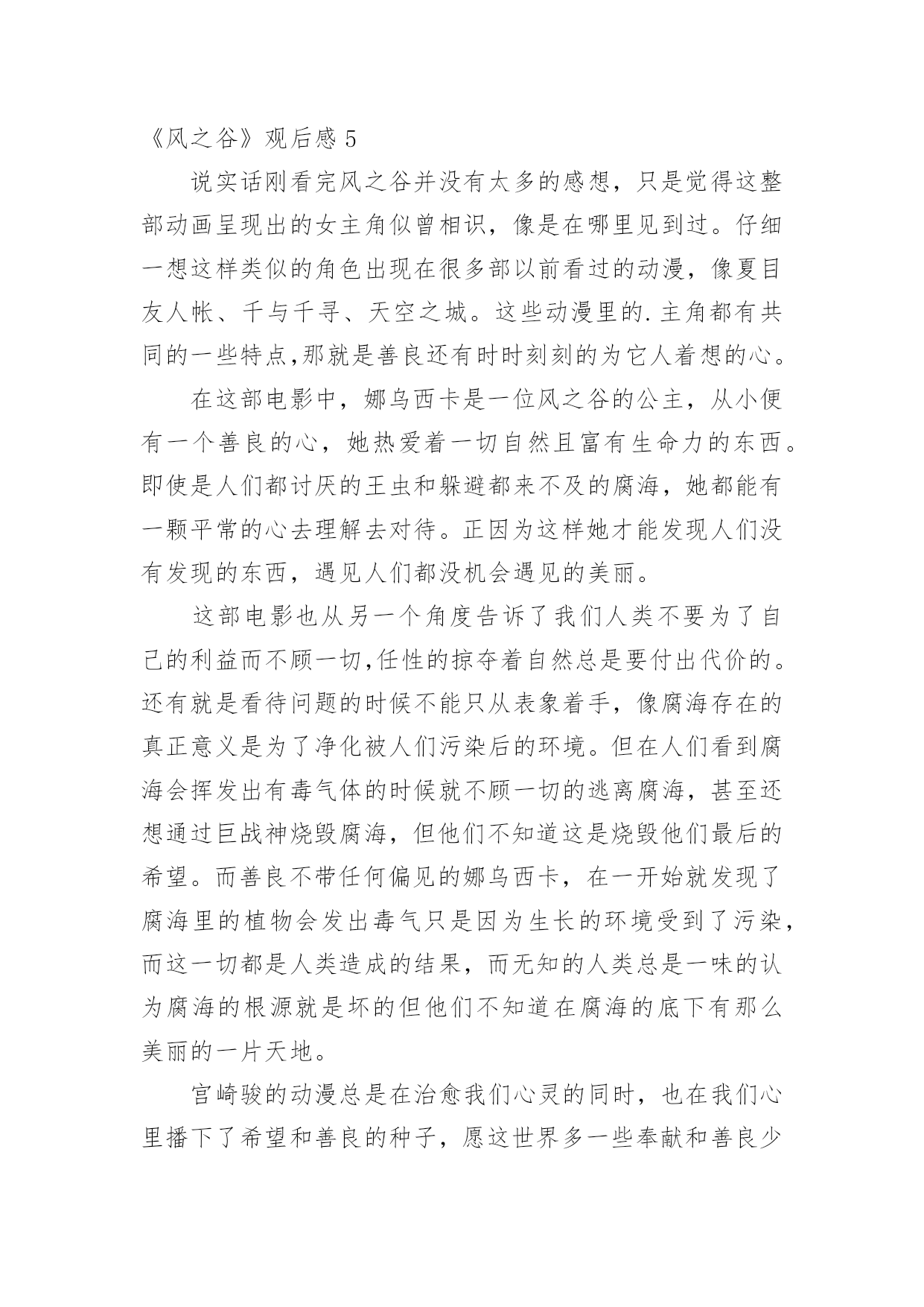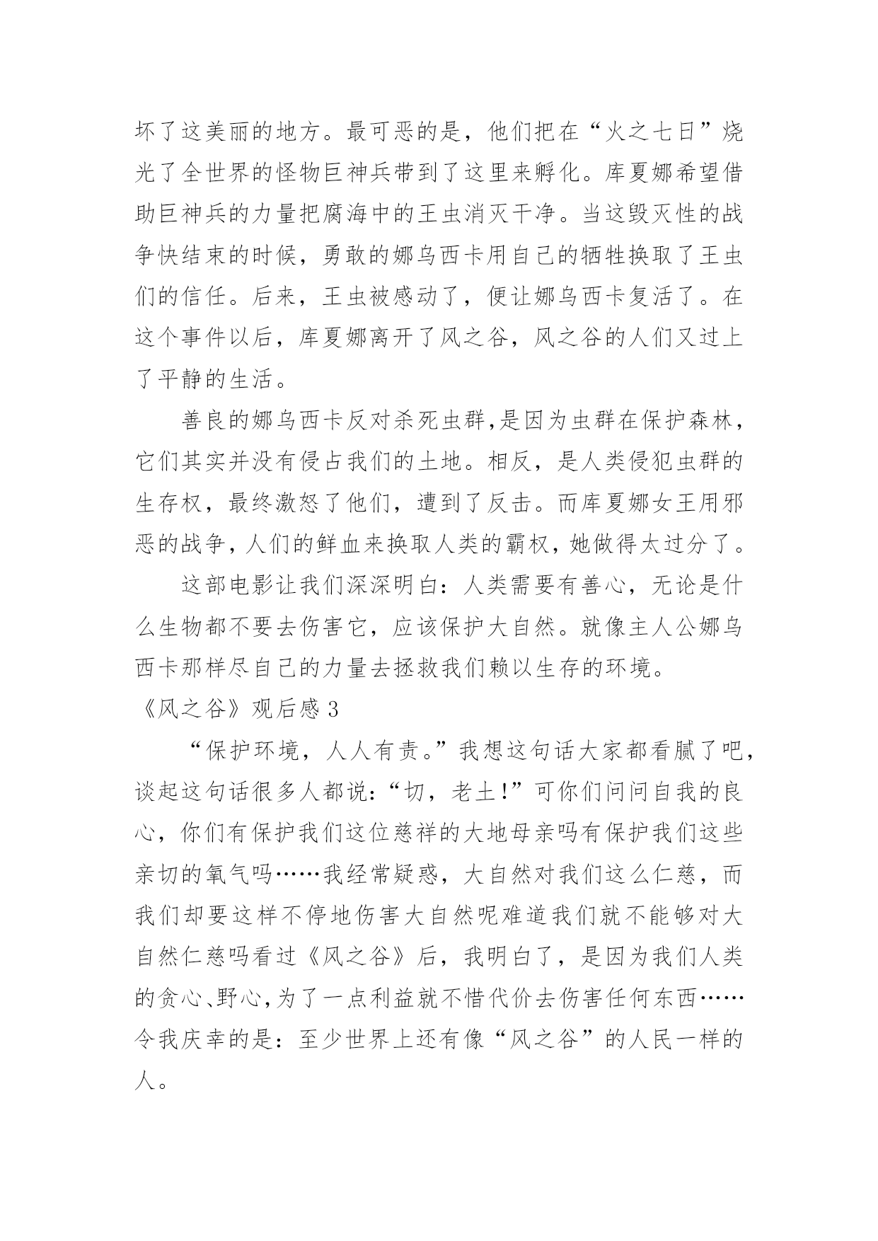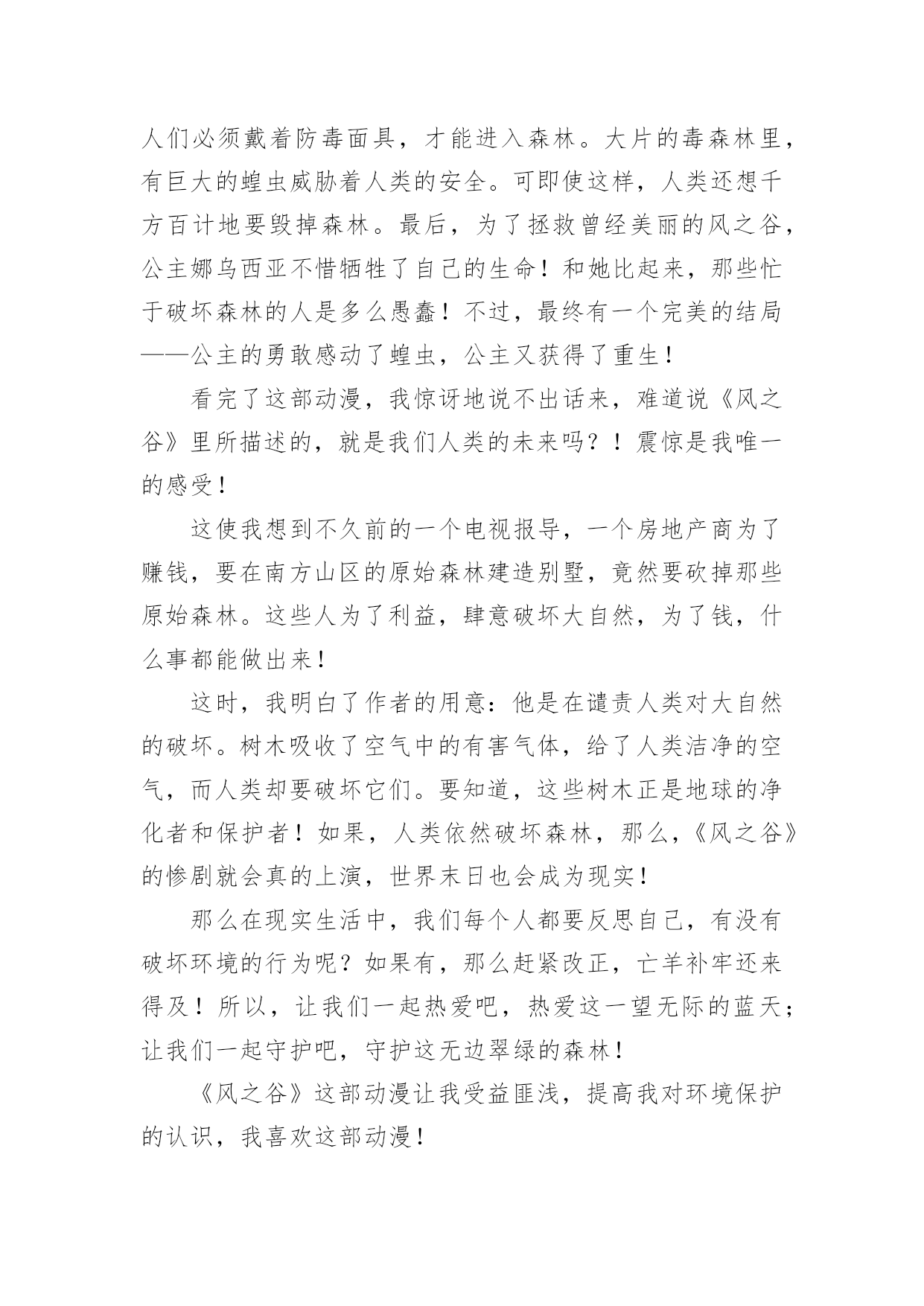 《风之谷》观后感《风之谷》观后感当认真看完一部影视作品后,相信你会有不少感想吧,这时候最关键的观后感不能忘了。那么你真的会写观后感吗?以下是小编精心整理的《风之谷》观后感,欢迎阅读与收藏。《风之谷》观后感1这一阵子我一直处在零敲碎打地去武昌校区做实验的生活节奏中。回到流芳后,我有了不少可以用来消遣的闲散时间。这种状态让我萌生了找一种事情做的冲动。至于做什么,我希望是那种能够塞满空闲时光但又会让我可以欺骗自己,不产生浪费时间的负罪感的事。思前想后,我决定找一类之前一直想看,但又因为“没时间”、“没心情”等虚伪的理由而没能看成的电影来作为生活空白的填充物。经过一番磨叽,看准了吉卜力工作室的作品。这么选的原因有而,一是我不想被一些重口味的情节坏了心情,二是好奇宫崎骏老爷子这么些年到底是靠什么让各位看官主动将“大师”之名献给他的。既然定了大类,那么我就打算从头开始看起(反正之前我都没完整地看过~~~)。于是乎,我就搜来了吉卜力1984年出的首部作品——《风之谷》来开这个头。由于这部电影推出时间较早(我不知道现在有没有“重制版”之类的作品推出),画质自然与现今的动漫作品有不小差别,有一些细节只能用“模糊”来形容。但是,整片流畅的情节安排让我可以完全忽视这种由年代带来的缺憾。就我个人感觉来说,这部作品应该没有什么地方是可以快进略过的。从主题上来看,这部反应环保的电影似乎有些走偏。这部电影对于人的生存发展与自然原始秩序的维持这一对矛盾并没有做重点渲染,反而更多地表现了人对于未知和自身命运的不确定的恐惧。也许创作人员正是想要在这样的安排中表达出一丝对于自私与狭隘的批判吧。《风之谷》观后感2假期的一天,我又重温了一遍日本动漫大师宫崎骏的电影《风之谷》。这部影片讲的是虫群和人类的战争。在人类文明崩溃一千年之后,腐烂的海洋被称之为“腐海”,有着很大的毒性,连里面的植物也是有毒的。腐海迅速吞噬了周边的几个国家,这里面还居住着很多巨大的虫子。有王虫、牛角虫,人们对这些巨大的虫子望而生畏。不过,在腐海的旁边,有一个和谐的“绿色王国”,那就是“风之谷”。风之谷的主人娜乌西卡和村民们借风、水的力量来抵抗腐海的进攻,所以这里的人们过着快乐舒心的生活。但是,美好的日子不是长久的,终于有一天,西方强国多鲁美奇亚的女王库夏娜带着强大的队伍来到了风之谷,破坏了这美丽的地方。最可恶的是,他们把在“火之七日”烧光了全世界的怪物巨神兵带到了这里来孵化。库夏娜希望借助巨神兵的力量把腐海中的王虫消灭干净。当这毁灭性的战争快结束的时候,勇敢的娜乌西卡用自己的牺牲换取了王虫们的信任。后来,王虫被感动了,便让娜乌西卡复活了。在这个事件以后,库夏娜离开了风之谷,风之谷的人们又过上了平静的生活。善良的娜乌西卡反对杀死虫群,是因为虫群在保护森林,它们其实并没有侵占我们的土地。相反,是人类侵犯虫群的生存权,最终激怒了他们,遭到了反击。而库夏娜女王用邪恶的战争,人们的鲜血来换取人类的霸权,她做得太过分了。这部电影让我们深深明白:人类需要有善心,无论是什么生物都不要去伤害它,应该保护大自然。就像主人公娜乌西卡那样尽自己的力量去拯救我们赖以生存的环境。《风之谷》观后感3“保护环境,人人有责。”我想这句话大家都看腻了吧,谈起这句话很多人都说:“切,老土!”可你们问问自我的良心,你们有保护我们这位慈祥的大地母亲吗有保护我们这些亲切的氧气吗……我经常疑惑,大自然对我们这么仁慈,而我们却要这样不停地伤害大自然呢难道我们就不能够对大自然仁慈吗看过《风之谷》后,我明白了,是因为我们人类的贪心、野心,为了一点利益就不惜代价去伤害任何东西……令我庆幸的是:至少世界上还有像“风之谷”的人民一样的人。《风之谷》讲述的是一个凄美的故事,亦是一个让我们人类自悟的故事:生长于风之谷的纯真少女娜乌茜卡从一开始就背负着拯救世界的命运,为了能为人民找到一片适于生活的净土,勇敢的与野心勃勃的特洛海军对战,并图与虫王沟通,最终她真诚的心还是感动了一只虫王,尽管其他虫王无视她的阻拦将她挤出地面好高好高,特洛海军消灭了,然而娜乌西卡也壮烈牺牲了,应对这一幕,战胜特洛海军的虫王群最终纷纷伸出了金黄的触角,将勇敢的娜乌西卡高高举起,触角金光闪闪,如新出的期望之阳,光彩夺目,就在这时,奇迹出现了,我们大家勇敢的娜乌西卡睁开了她的双眼,并站了起来,看到了虫王群美丽的触角就在她的脚下,看到特洛海军被消灭,看到人民安好,她笑了,她奔跑了起来,奔向可爱的人民,奔向充满期望的未来……我们感动,我们亦要反思:我们要如何保护地球,难道我们要等到地球变成《风之谷》中的情景再凭借“娜乌西卡”的微弱之力去拯救我们赖以生存的地球吗不!我们要行动起来,为完美的明天,为纯洁的那一片天空,贡献出我们的一切,一切为了我们的地球,一切为了我们的自我,一切为了我们的子孙后