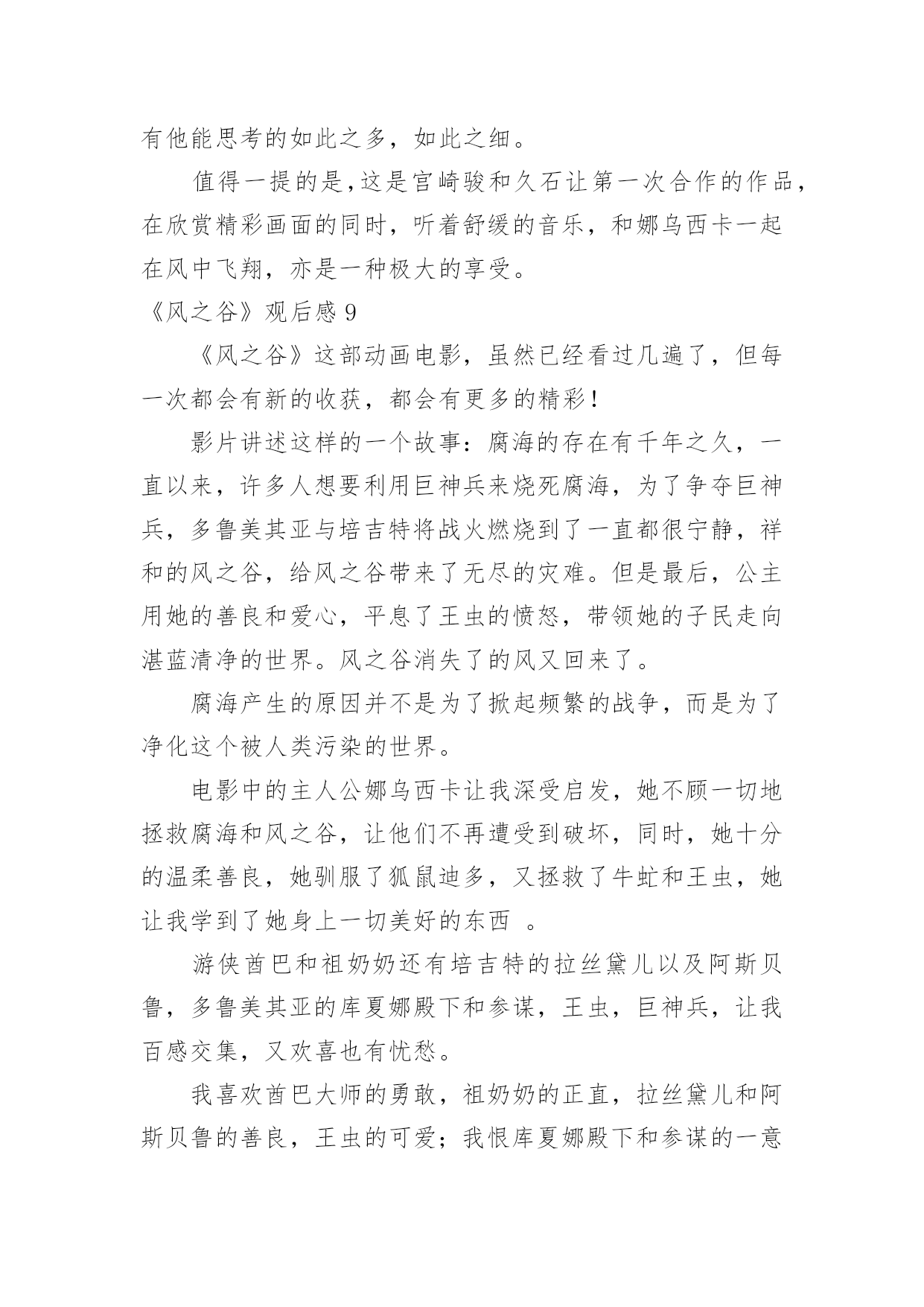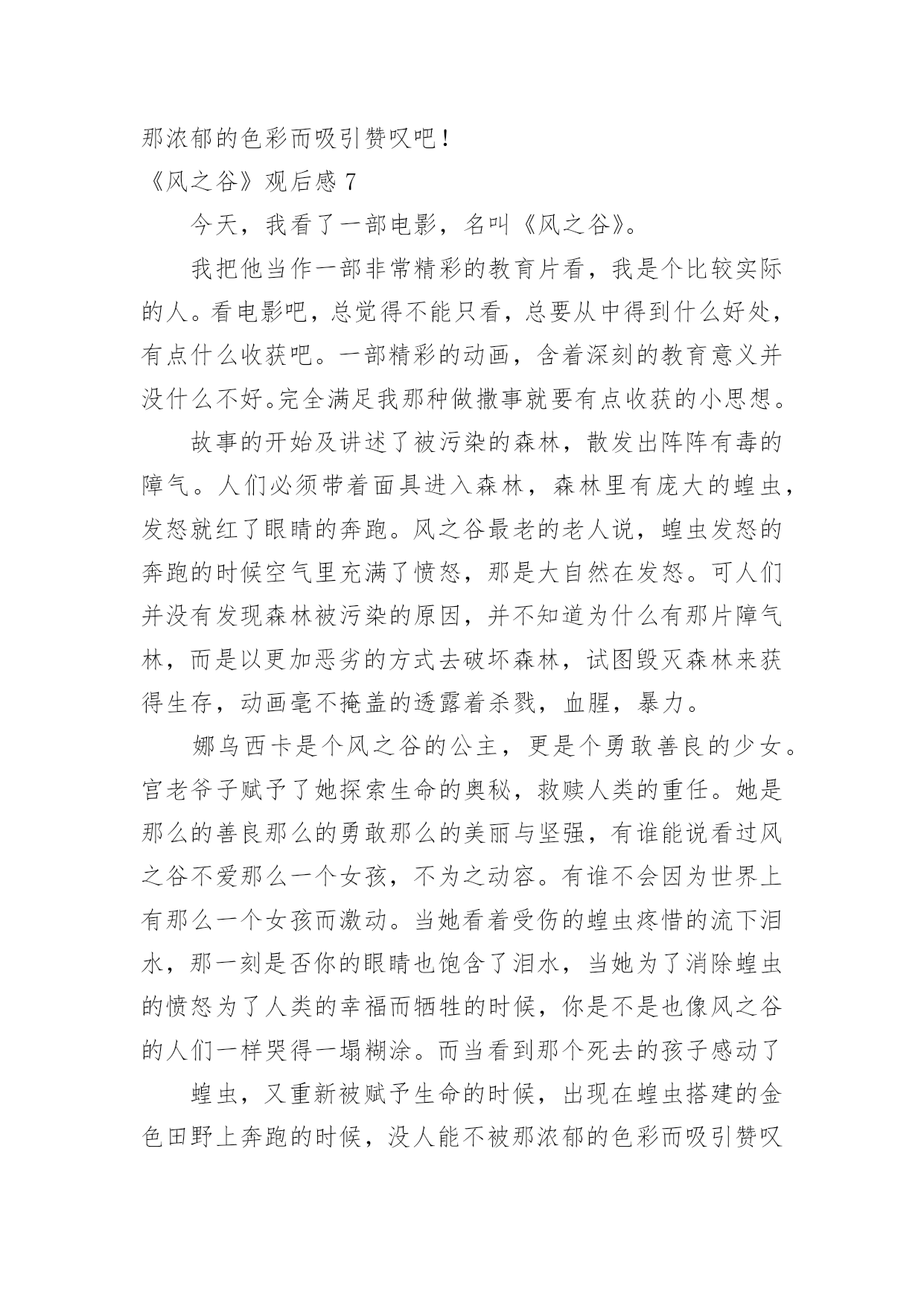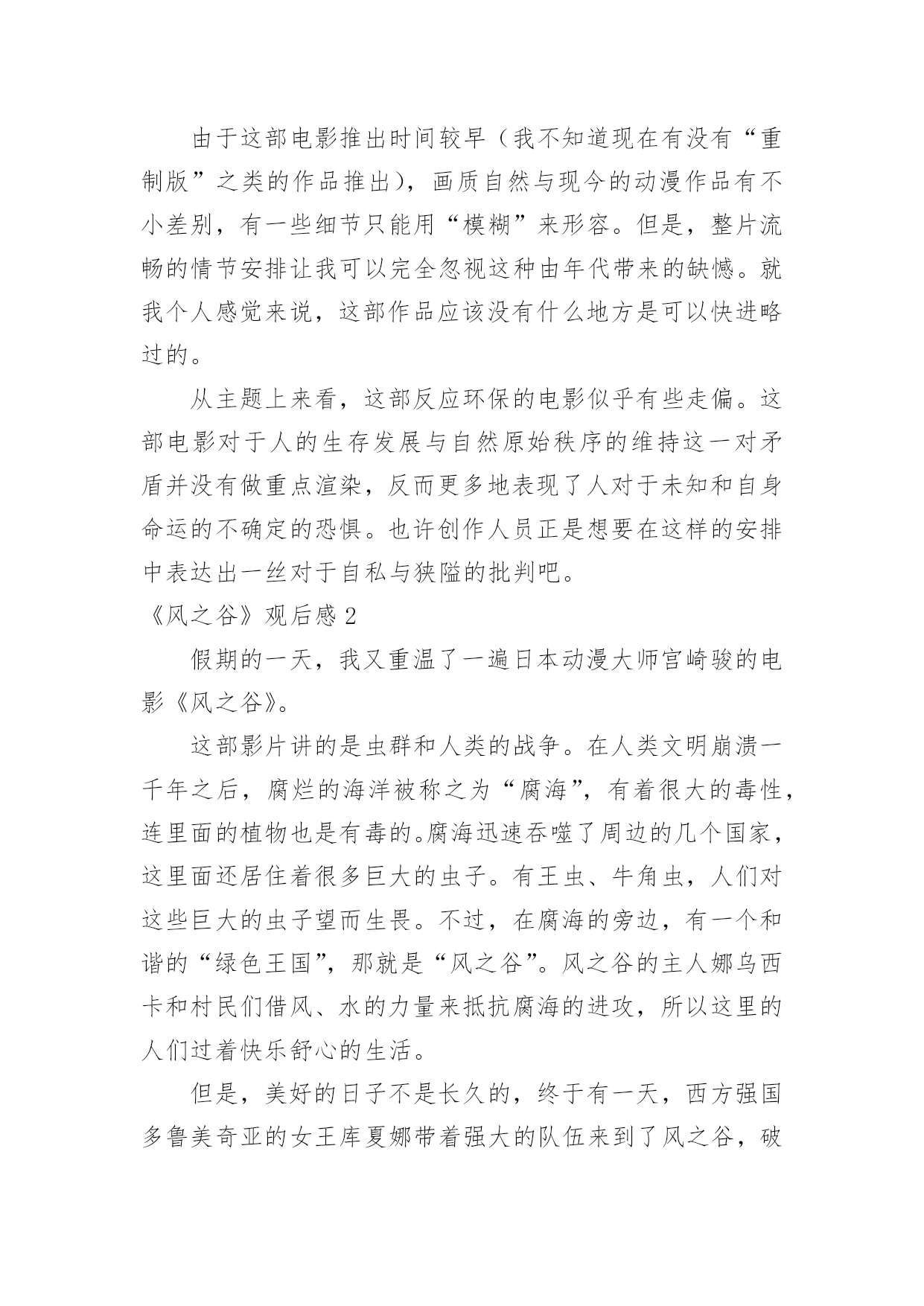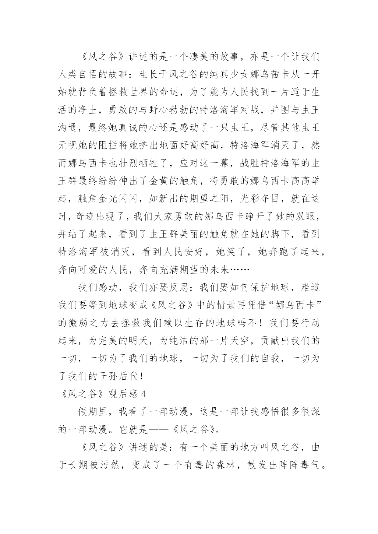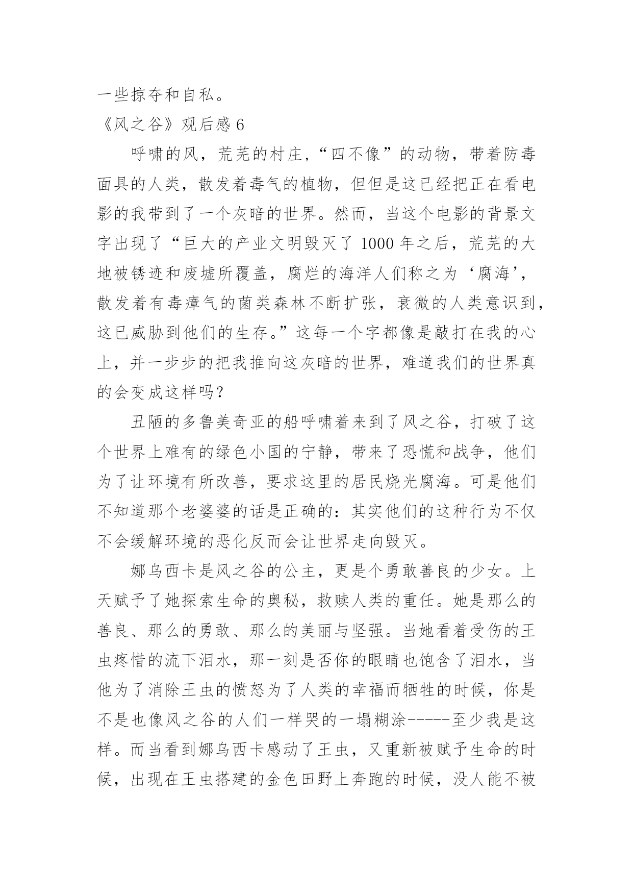 《风之谷》观后感《风之谷》观后感当认真看完一部影视作品后,相信你会有不少感想吧,这时候最关键的观后感不能忘了。那么你真的会写观后感吗?以下是小编精心整理的《风之谷》观后感,欢迎阅读与收藏。《风之谷》观后感1这一阵子我一直处在零敲碎打地去武昌校区做实验的生活节奏中。回到流芳后,我有了不少可以用来消遣的闲散时间。这种状态让我萌生了找一种事情做的冲动。至于做什么,我希望是那种能够塞满空闲时光但又会让我可以欺骗自己,不产生浪费时间的负罪感的事。思前想后,我决定找一类之前一直想看,但又因为“没时间”、“没心情”等虚伪的理由而没能看成的电影来作为生活空白的填充物。经过一番磨叽,看准了吉卜力工作室的作品。这么选的原因有而,一是我不想被一些重口味的情节坏了心情,二是好奇宫崎骏老爷子这么些年到底是靠什么让各位看官主动将“大师”之名献给他的。既然定了大类,那么我就打算从头开始看起(反正之前我都没完整地看过~~~)。于是乎,我就搜来了吉卜力1984年出的首部作品——《风之谷》来开这个头。由于这部电影推出时间较早(我不知道现在有没有“重制版”之类的作品推出),画质自然与现今的动漫作品有不小差别,有一些细节只能用“模糊”来形容。但是,整片流畅的情节安排让我可以完全忽视这种由年代带来的缺憾。就我个人感觉来说,这部作品应该没有什么地方是可以快进略过的。从主题上来看,这部反应环保的电影似乎有些走偏。这部电影对于人的生存发展与自然原始秩序的维持这一对矛盾并没有做重点渲染,反而更多地表现了人对于未知和自身命运的不确定的恐惧。也许创作人员正是想要在这样的安排中表达出一丝对于自私与狭隘的批判吧。《风之谷》观后感2假期的一天,我又重温了一遍日本动漫大师宫崎骏的电影《风之谷》。这部影片讲的是虫群和人类的战争。在人类文明崩溃一千年之后,腐烂的海洋被称之为“腐海”,有着很大的毒性,连里面的植物也是有毒的。腐海迅速吞噬了周边的几个国家,这里面还居住着很多巨大的虫子。有王虫、牛角虫,人们对这些巨大的虫子望而生畏。不过,在腐海的旁边,有一个和谐的“绿色王国”,那就是“风之谷”。风之谷的主人娜乌西卡和村民们借风、水的力量来抵抗腐海的进攻,所以这里的人们过着快乐舒心的生活。但是,美好的日子不是长久的,终于有一天,西方强国多鲁美奇亚的女王库夏娜带着强大的队伍来到了风之谷,破坏了这美丽的地方。最可恶的是,他们把在“火之七日”烧光了全世界的怪物巨神兵带到了这里来孵化。库夏娜希望借助巨神兵的力量把腐海中的王虫消灭干净。当这毁灭性的战争快结束的时候,勇敢的娜乌西卡用自己的牺牲换取了王虫们的信任。后来,王虫被感动了,便让娜乌西卡复活了。在这个事件以后,库夏娜离开了风之谷,风之谷的人们又过上了平静的生活。善良的娜乌西卡反对杀死虫群,是因为虫群在保护森林,它们其实并没有侵占我们的土地。相反,是人类侵犯虫群的生存权,最终激怒了他们,遭到了反击。而库夏娜女王用邪恶的战争,人们的鲜血来换取人类的霸权,她做得太过分了。这部电影让我们深深明白:人类需要有善心,无论是什么生物都不要去伤害它,应该保护大自然。就像主人公娜乌西卡那样尽自己的力量去拯救我们赖以生存的环境。《风之谷》观后感3“保护环境,人人有责。”我想这句话大家都看腻了吧,谈起这句话很多人都说:“切,老土!”可你们问问自我的良心,你们有保护我们这位慈祥的大地母亲吗有保护我们这些亲切的氧气吗……我经常疑惑,大自然对我们这么仁慈,而我们却要这样不停地伤害大自然呢难道我们就不能够对大自然仁慈吗看过《风之谷》后,我明白了,是因为我们人类的贪心、野心,为了一点利益就不惜代价去伤害任何东西……令我庆幸的是:至少世界上还有像“风之谷”的人民一样的人。《风之谷》讲述的是一个凄美的故事,亦是一个让我们人类自悟的故事:生长于风之谷的纯真少女娜乌茜卡从一开始就背负着拯救世界的命运,为了能为人民找到一片适于生活的净土,勇敢的与野心勃勃的特洛海军对战,并图与虫王沟通,最终她真诚的心还是感动了一只虫王,尽管其他虫王无视她的阻拦将她挤出地面好高好高,特洛海军消灭了,然而娜乌西卡也壮烈牺牲了,应对这一幕,战胜特洛海军的虫王群最终纷纷伸出了金黄的触角,将勇敢的娜乌西卡高高举起,触角金光闪闪,如新出的期望之阳,光彩夺目,就在这时,奇迹出现了,我们大家勇敢的娜乌西卡睁开了她的双眼,并站了起来,看到了虫王群美丽的触角就在她的脚下,看到特洛海军被消灭,看到人民安好,她笑了,她奔跑了起来,奔向可爱的人民,奔向充满期望的未来……我们感动,我们亦要反思:我们要如何保护地球,难道我们要等到地球变成《风之谷》中的情景再凭借“娜乌西卡”的微弱之力去拯救我们赖以生存的地球吗不!我们要行动起来,为完美的明天,为纯洁的那一片天空,贡献出我们的一切,一切为了我们的地球,一切为了我们的自我,一切为了我们的子孙后