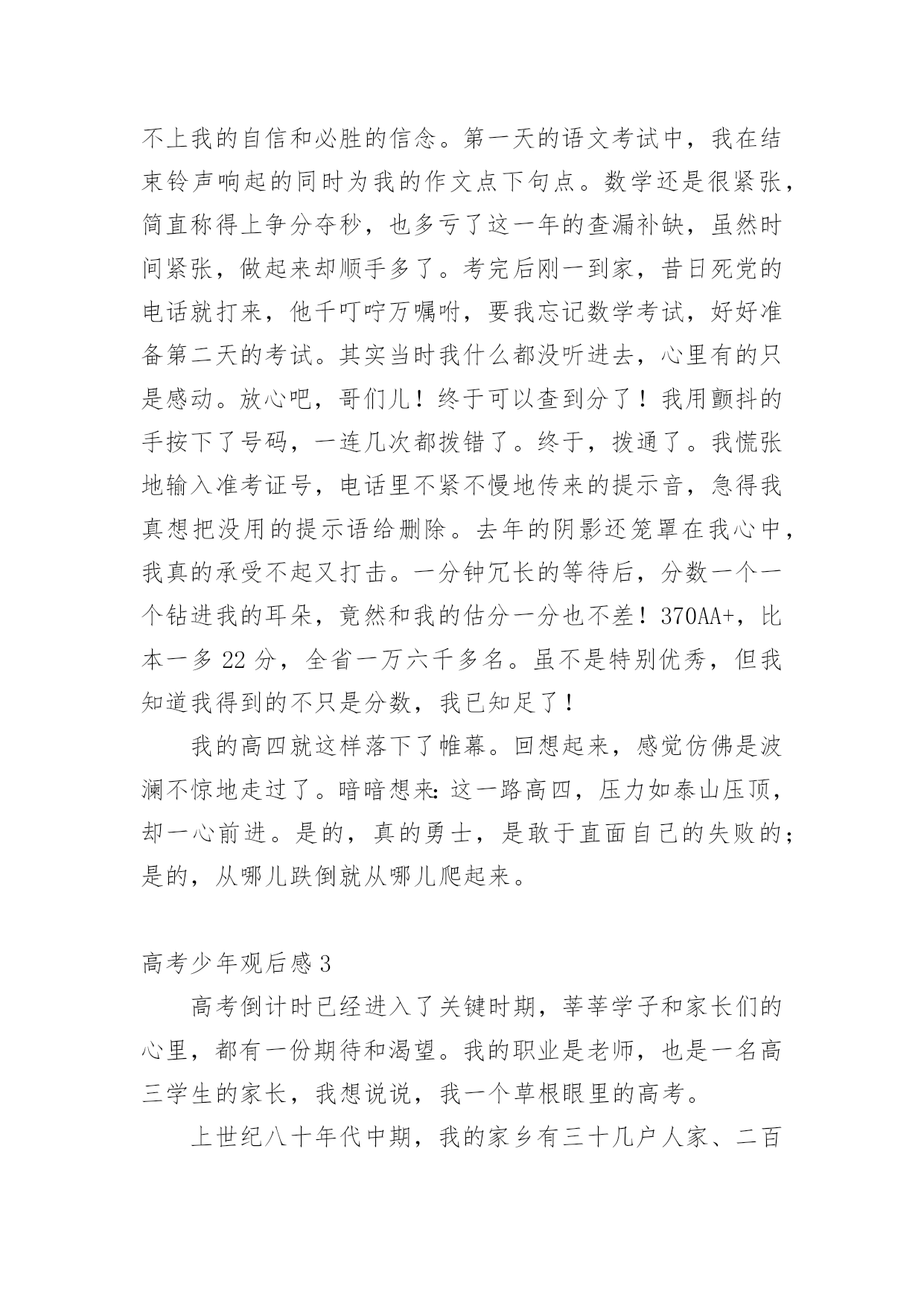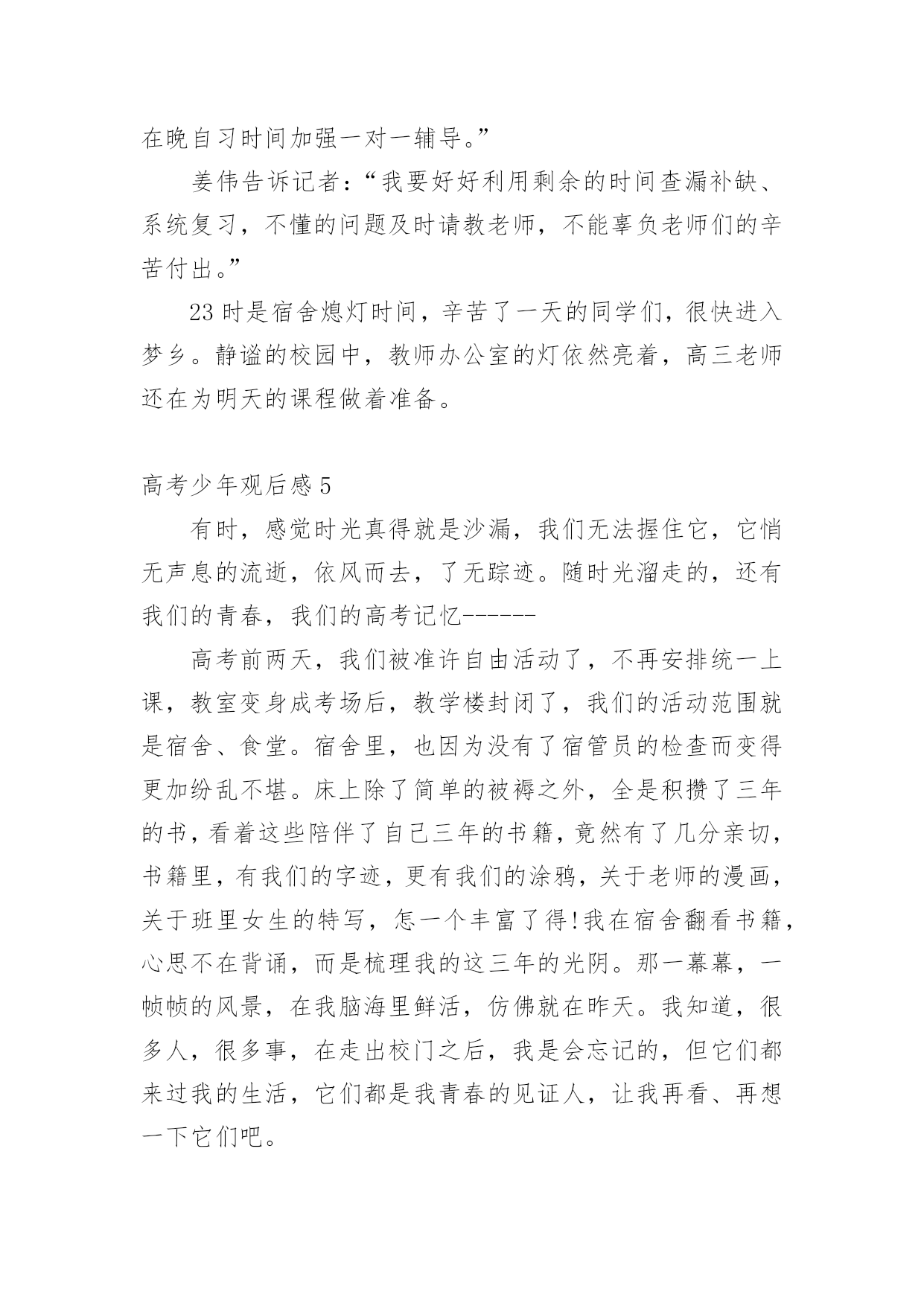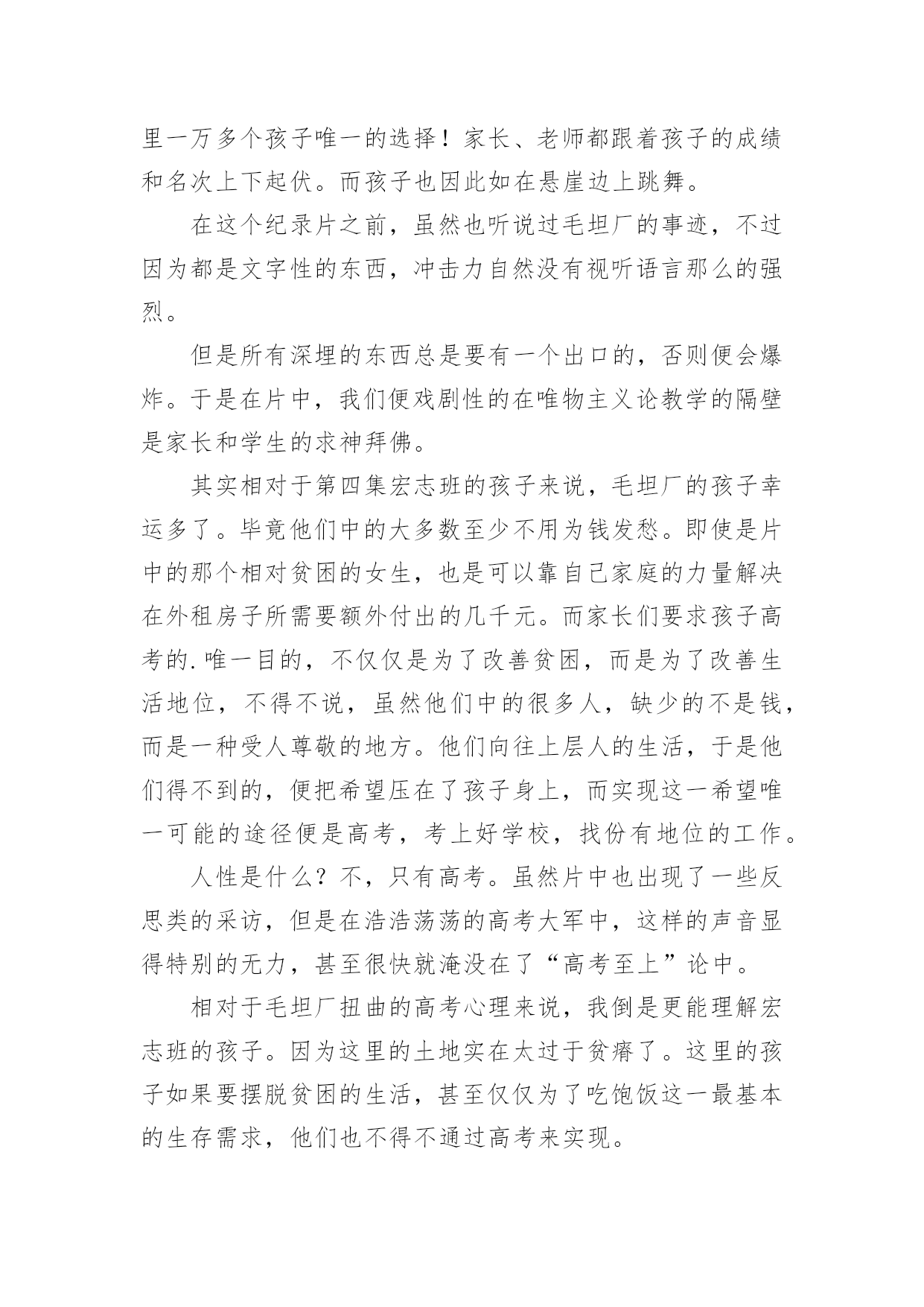 高考少年观后感观看一部优秀作品之后,我们会受益匪浅,相信大家的视野一定开拓了不少吧,是时候静下心来好好写写观后感了。千万不能认为观后感随便应付就可以,以下是小编精心整理的高考少年观后感,欢迎阅读,希望大家能够喜欢。高考少年观后感1《高考》是央视热播纪录片。一共6集,讲述的是高考的一些人和事情。看完我还是非常震撼!片子开头就以中国高考最大的“工厂”,毛坦厂中学作为主角,无论是故事本身还是画面冲击力,都非常的强悍。而且这种强悍一直持续了两集!看完,我的心脏都有了承受不住的感觉了。相比而言,第四集关于宏志班的就多了些柔情,虽然其所呈现的现实也同样残酷。毛坦厂的高考工厂。在这里,一切以高考为中心,甚至这个镇的经济发展都是以高考引发的。高考,就如撒旦一般,把一个中学,一个镇,变成了活生生的集中营和地狱。在这里,学生就是流水线上的产品。这里,体会不到一点人味儿。无论是老师还是学生或者家长,或者周围的其他人。每个人的头上顶着“高考”二字麻木的行走,犹如真正的行尸走肉。虽然片中的学生也会有些许的叛逆,但是在老师和家长不停的耳提面命下,也都为了高考二字而屈服了。在毛坦厂,在片子中,所呈现出来的,高考,依旧是这里一万多个孩子唯一的选择!家长、老师都跟着孩子的成绩和名次上下起伏。而孩子也因此如在悬崖边上跳舞。在这个纪录片之前,虽然也听说过毛坦厂的事迹,不过因为都是文字性的东西,冲击力自然没有视听语言那么的强烈。但是所有深埋的东西总是要有一个出口的,否则便会爆炸。于是在片中,我们便戏剧性的在唯物主义论教学的隔壁是家长和学生的求神拜佛。其实相对于第四集宏志班的孩子来说,毛坦厂的孩子幸运多了。毕竟他们中的大多数至少不用为钱发愁。即使是片中的那个相对贫困的女生,也是可以靠自己家庭的力量解决在外租房子所需要额外付出的几千元。而家长们要求孩子高考的.唯一目的,不仅仅是为了改善贫困,而是为了改善生活地位,不得不说,虽然他们中的很多人,缺少的不是钱,而是一种受人尊敬的地方。他们向往上层人的生活,于是他们得不到的,便把希望压在了孩子身上,而实现这一希望唯一可能的途径便是高考,考上好学校,找份有地位的工作。人性是什么?不,只有高考。虽然片中也出现了一些反思类的采访,但是在浩浩荡荡的高考大军中,这样的声音显得特别的无力,甚至很快就淹没在了“高考至上”论中。相对于毛坦厂扭曲的高考心理来说,我倒是更能理解宏志班的孩子。因为这里的土地实在太过于贫瘠了。这里的孩子如果要摆脱贫困的生活,甚至仅仅为了吃饱饭这一最基本的生存需求,他们也不得不通过高考来实现。但是高考也只是第一步。这里的孩子和家长甚至在高考前就要去面临考上后的经济压力。“因教而贫”一方面读书是唯一改变贫困面貌的途径,另一方面读书却让一个家庭雪上加霜,穷上加穷。但即使如此,这里的人们还是愿意让孩子们放手一搏,这是几乎带有赌博性质的一搏,形式便是高考!虽然高考对于宏志班的孩子来说是关乎生存和毁灭,但这里的备考氛围却还是充满着温情和人性。我突然想起一句话高考,不仅仅是孩子一个人的战斗。我庆幸,我已经过了高考的年龄,我也庆幸,我的高考过得非常的平坦甚至安逸。高考少年观后感2高考对我们来说,无疑是人生的转折点,它决定了我们接下来的人生轨迹。可是一个该死的C无情地否决了我曾经无数次的憧憬,否决了我十二年的努力。显然,我成为不适应08江苏高考改革的一员。然而我知道,不能把原因归结为多变的制度、临场的发挥、心理的调节,亦或是考场的意外。总之,技不如人!当高考落幕后的三个月,当别人享受着拿到录取通知书的喜悦时,我在日夜的焦灼中不得不做出选择——复读!做如此决定前,是一段长长的犹豫。尤其当我面对别人异样的目光,想象着自己又将开始一轮每天5:30起床、11:00睡觉,从早到晚面对那总也做不完的堆得像小山似的.试卷。知道我要为每大型小型考试担惊受怕,知道我根本无法预料第二年的最终成绩时,我犹豫着是否选择一所三流院校杜绝这一切可能。我想起了妈妈期待的目光,想起了刚进高中时的梦想,想起了三年来写在课桌上的誓言。不!我不甘心!我不会就这样认输的,不就是再读一年吗?为了曾经的誓言,拼了!不甘心!我不会就这样认输的,不就是再读一年吗?为了曾经的誓言,拼了!高四开始显得风平浪静。第阶段考试开始了,当我踏进那熟悉得不能再熟悉的考场时,广播里正放着那首《年轻的战场》。去年的画面不停地闪现在我脑海:这张课桌去年我也坐过,那次我破天荒地考进班级前十名;前面一张桌子我死党曾经用过,而他现在正在一所重点大学深造……一种想哭的冲动突然袭来。当开考的铃声响起,我却只有咽下泪水,用微颤的手开始书写……数学的劣势让我在高考栽了一个大跟头,曾经的打击让我几乎丧失了对数学的信心,但我亦明白复读最重要的就是——补短!复读的日子是宝贵的,我几乎将50%的时间和精力都放在数学上。