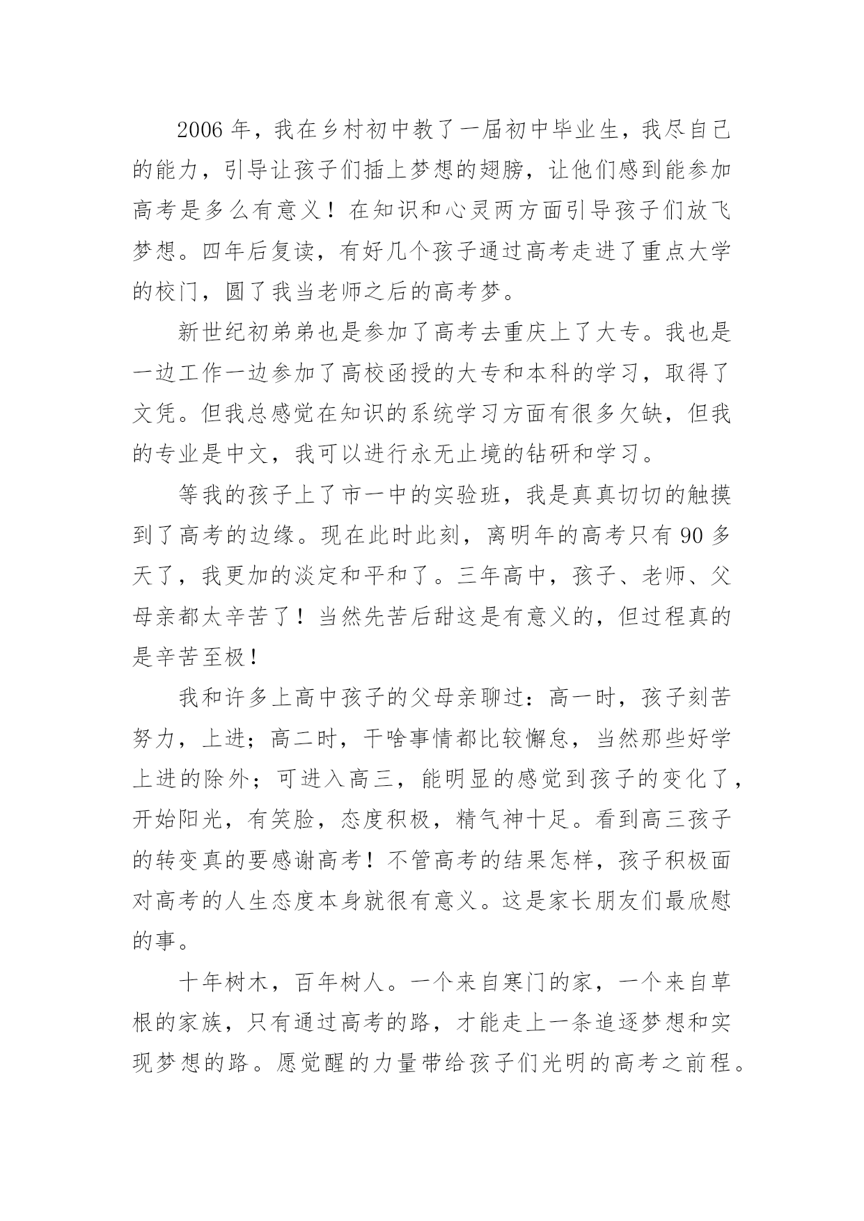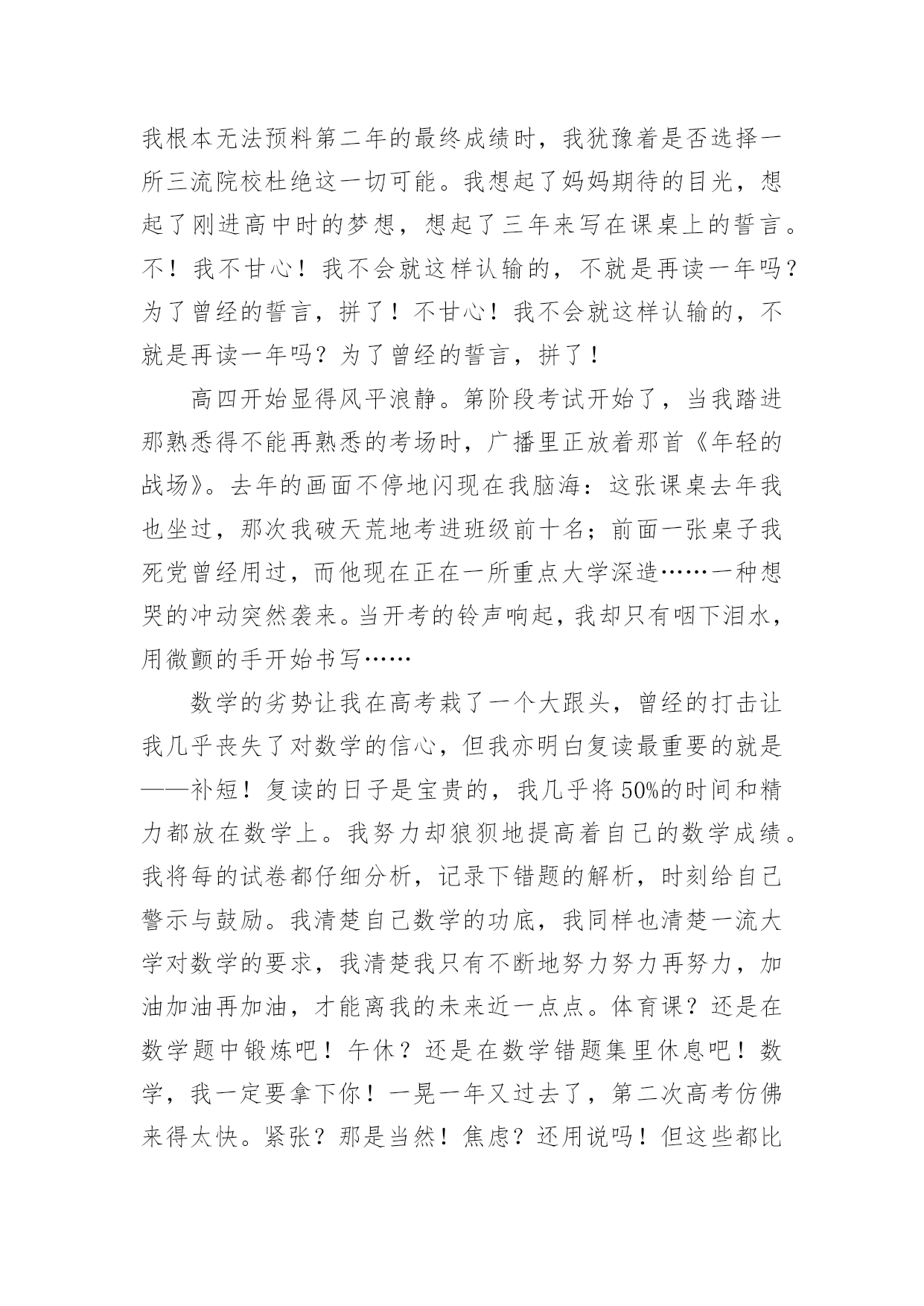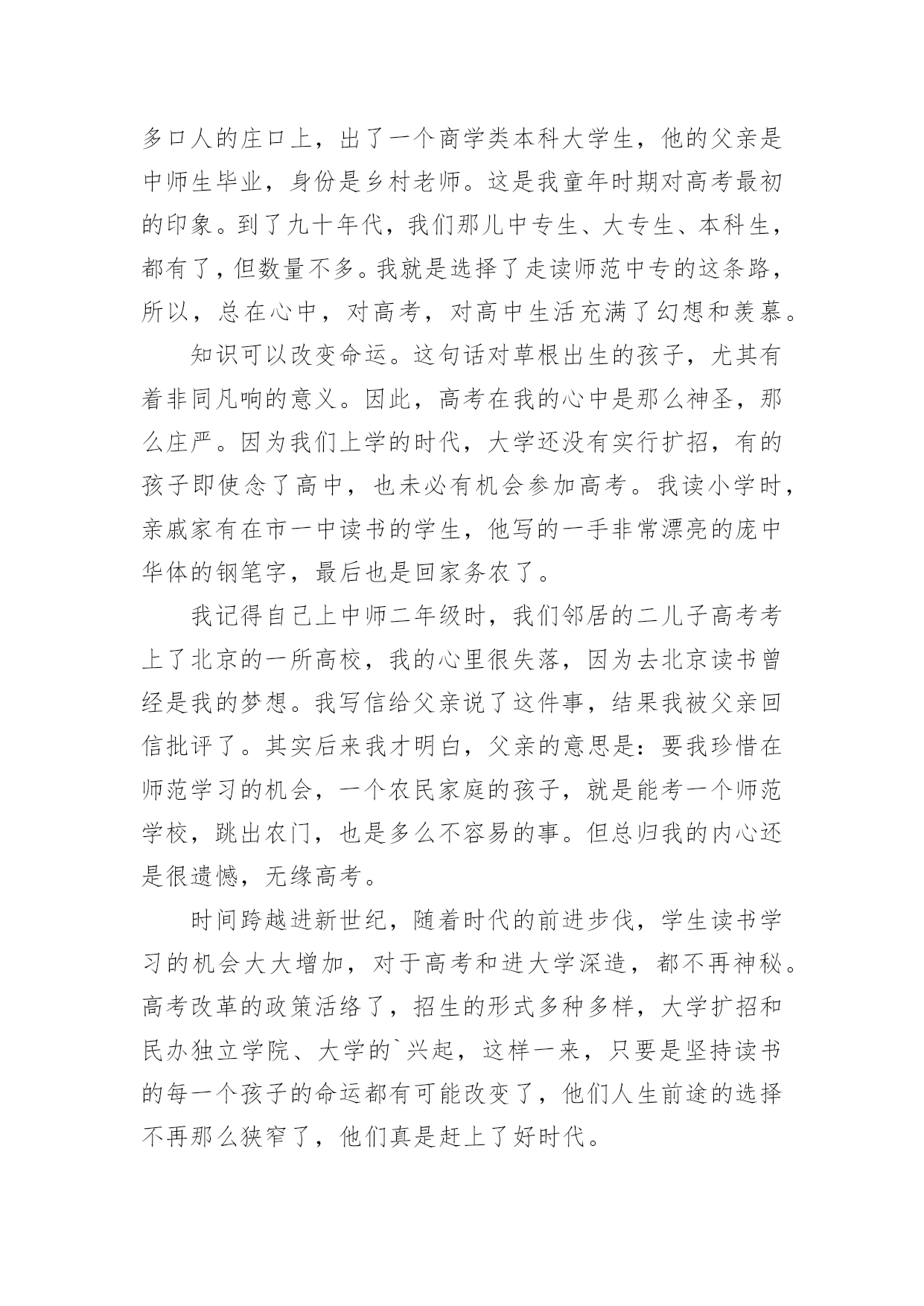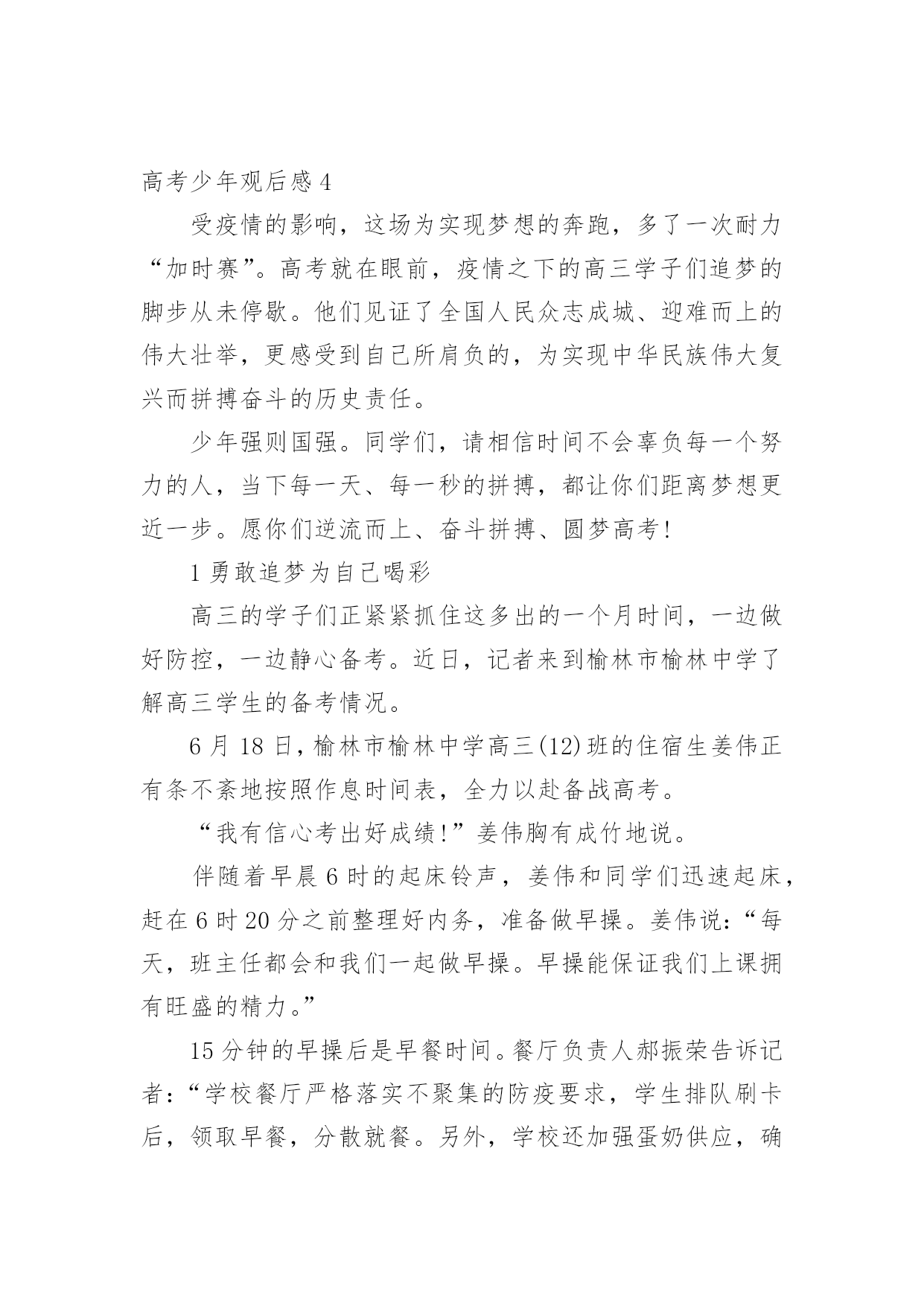 高考少年观后感观看一部优秀作品之后,我们会受益匪浅,相信大家的视野一定开拓了不少吧,是时候静下心来好好写写观后感了。千万不能认为观后感随便应付就可以,以下是小编精心整理的高考少年观后感,欢迎阅读,希望大家能够喜欢。高考少年观后感1《高考》是央视热播纪录片。一共6集,讲述的是高考的一些人和事情。看完我还是非常震撼!片子开头就以中国高考最大的“工厂”,毛坦厂中学作为主角,无论是故事本身还是画面冲击力,都非常的强悍。而且这种强悍一直持续了两集!看完,我的心脏都有了承受不住的感觉了。相比而言,第四集关于宏志班的就多了些柔情,虽然其所呈现的现实也同样残酷。毛坦厂的高考工厂。在这里,一切以高考为中心,甚至这个镇的经济发展都是以高考引发的。高考,就如撒旦一般,把一个中学,一个镇,变成了活生生的集中营和地狱。在这里,学生就是流水线上的产品。这里,体会不到一点人味儿。无论是老师还是学生或者家长,或者周围的其他人。每个人的头上顶着“高考”二字麻木的行走,犹如真正的行尸走肉。虽然片中的学生也会有些许的叛逆,但是在老师和家长不停的耳提面命下,也都为了高考二字而屈服了。在毛坦厂,在片子中,所呈现出来的,高考,依旧是这里一万多个孩子唯一的选择!家长、老师都跟着孩子的成绩和名次上下起伏。而孩子也因此如在悬崖边上跳舞。在这个纪录片之前,虽然也听说过毛坦厂的事迹,不过因为都是文字性的东西,冲击力自然没有视听语言那么的强烈。但是所有深埋的东西总是要有一个出口的,否则便会爆炸。于是在片中,我们便戏剧性的在唯物主义论教学的隔壁是家长和学生的求神拜佛。其实相对于第四集宏志班的孩子来说,毛坦厂的孩子幸运多了。毕竟他们中的大多数至少不用为钱发愁。即使是片中的那个相对贫困的女生,也是可以靠自己家庭的力量解决在外租房子所需要额外付出的几千元。而家长们要求孩子高考的.唯一目的,不仅仅是为了改善贫困,而是为了改善生活地位,不得不说,虽然他们中的很多人,缺少的不是钱,而是一种受人尊敬的地方。他们向往上层人的生活,于是他们得不到的,便把希望压在了孩子身上,而实现这一希望唯一可能的途径便是高考,考上好学校,找份有地位的工作。人性是什么?不,只有高考。虽然片中也出现了一些反思类的采访,但是在浩浩荡荡的高考大军中,这样的声音显得特别的无力,甚至很快就淹没在了“高考至上”论中。相对于毛坦厂扭曲的高考心理来说,我倒是更能理解宏志班的孩子。因为这里的土地实在太过于贫瘠了。这里的孩子如果要摆脱贫困的生活,甚至仅仅为了吃饱饭这一最基本的生存需求,他们也不得不通过高考来实现。但是高考也只是第一步。这里的孩子和家长甚至在高考前就要去面临考上后的经济压力。“因教而贫”一方面读书是唯一改变贫困面貌的途径,另一方面读书却让一个家庭雪上加霜,穷上加穷。但即使如此,这里的人们还是愿意让孩子们放手一搏,这是几乎带有赌博性质的一搏,形式便是高考!虽然高考对于宏志班的孩子来说是关乎生存和毁灭,但这里的备考氛围却还是充满着温情和人性。我突然想起一句话高考,不仅仅是孩子一个人的战斗。我庆幸,我已经过了高考的年龄,我也庆幸,我的高考过得非常的平坦甚至安逸。高考少年观后感2高考对我们来说,无疑是人生的转折点,它决定了我们接下来的人生轨迹。可是一个该死的C无情地否决了我曾经无数次的憧憬,否决了我十二年的努力。显然,我成为不适应08江苏高考改革的一员。然而我知道,不能把原因归结为多变的制度、临场的发挥、心理的调节,亦或是考场的意外。总之,技不如人!当高考落幕后的三个月,当别人享受着拿到录取通知书的喜悦时,我在日夜的焦灼中不得不做出选择——复读!做如此决定前,是一段长长的犹豫。尤其当我面对别人异样的目光,想象着自己又将开始一轮每天5:30起床、11:00睡觉,从早到晚面对那总也做不完的堆得像小山似的.试卷。知道我要为每大型小型考试担惊受怕,知道我根本无法预料第二年的最终成绩时,我犹豫着是否选择一所三流院校杜绝这一切可能。我想起了妈妈期待的目光,想起了刚进高中时的梦想,想起了三年来写在课桌上的誓言。不!我不甘心!我不会就这样认输的,不就是再读一年吗?为了曾经的誓言,拼了!不甘心!我不会就这样认输的,不就是再读一年吗?为了曾经的誓言,拼了!高四开始显得风平浪静。第阶段考试开始了,当我踏进那熟悉得不能再熟悉的考场时,广播里正放着那首《年轻的战场》。去年的画面不停地闪现在我脑海:这张课桌去年我也坐过,那次我破天荒地考进班级前十名;前面一张桌子我死党曾经用过,而他现在正在一所重点大学深造……一种想哭的冲动突然袭来。当开考的铃声响起,我却只有咽下泪水,用微颤的手开始书写……数学的劣势让我在高考栽了一个大跟头,曾经的打击让我几乎丧失了对数学的信心,但我亦明白复读最重要的就是——补短!复读的日子是宝贵的,我几乎将50%的时间和精力都放在数学上。