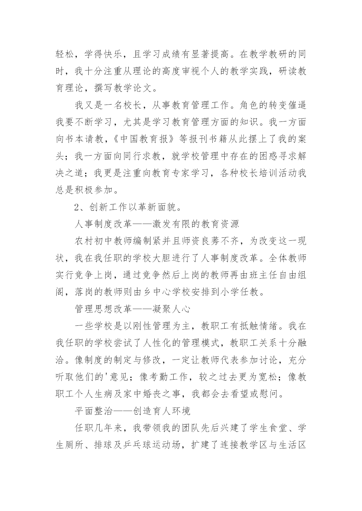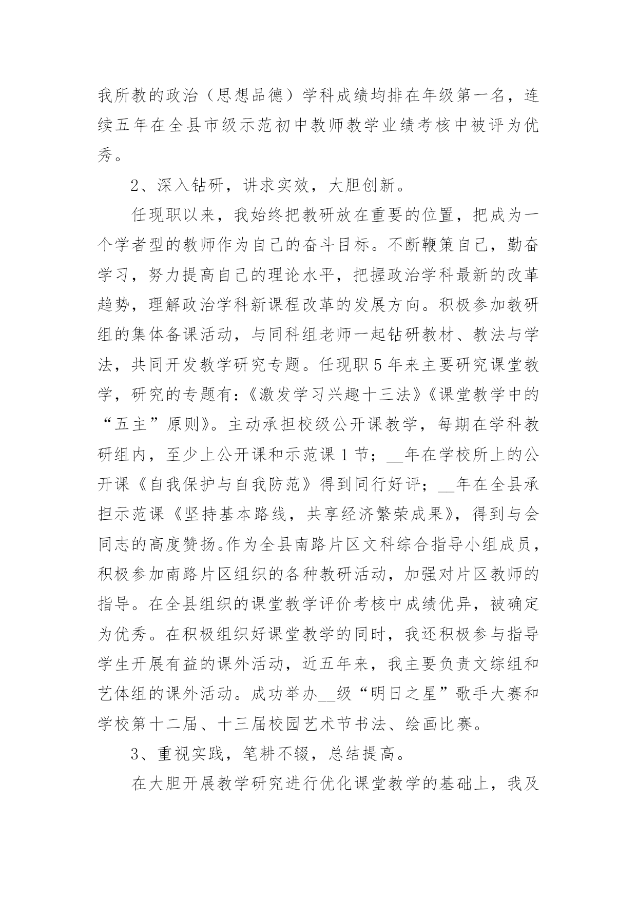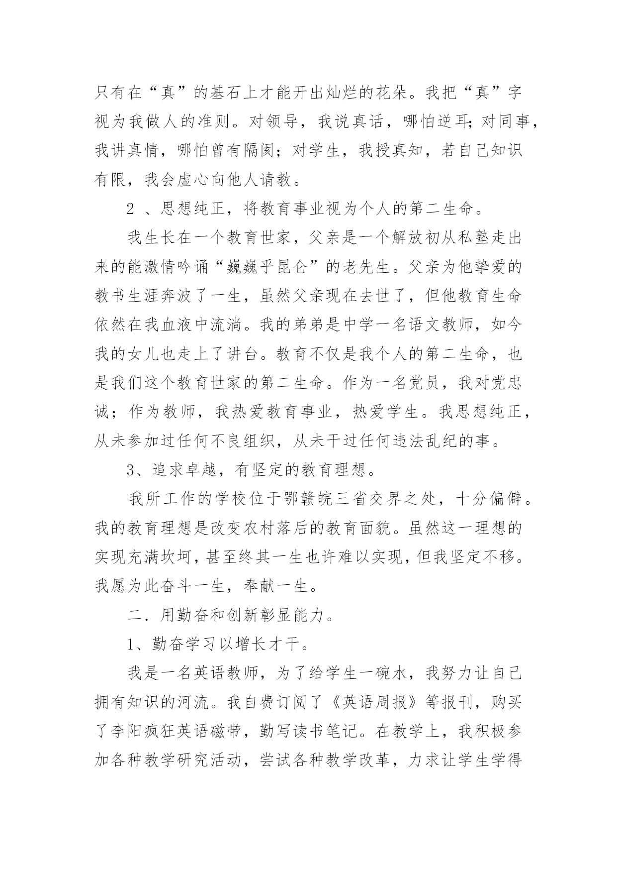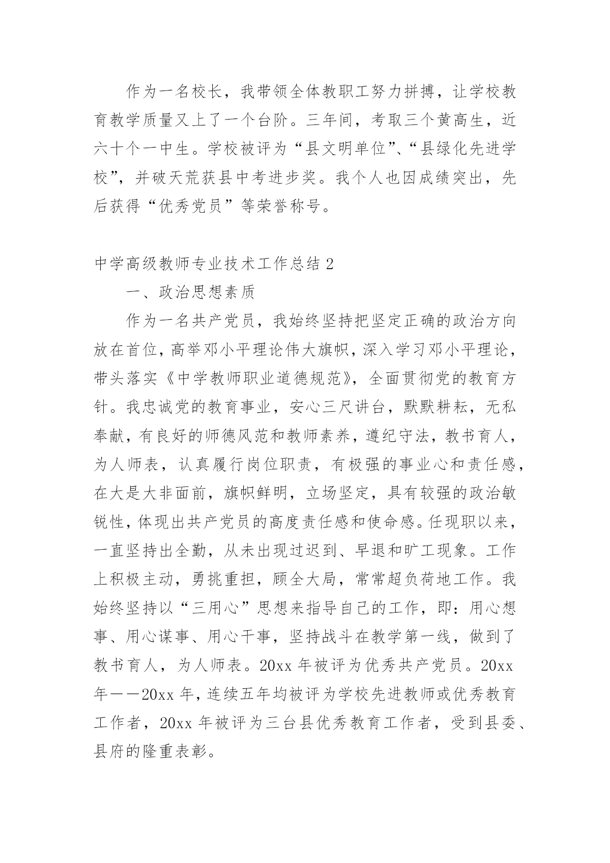 中学高级教师专业技术工作总结总结是对某一特定时间段内的学习和工作生活等表现情况加以回顾和分析的一种书面材料,它能帮我们理顺知识结构,突出重点,突破难点,为此要我们写一份总结。你想知道总结怎么写吗?以下是小编收集整理的中学高级教师专业技术工作总结,希望对大家有所帮助。中学高级教师专业技术工作总结1我从事教育工作至今已有二十八年了,我品尝过不同学段不同岗位的教学工作的酸甜苦辣。从最初的高中教育到后来的中职教育,再到现在的初中教育;从一名普通的英语教师到协管教学工作的教导主任,从教导主任再到中心学校主管面上工作的副校长,如今则是__最偏远乡村中学的校长。随着教龄的增长,个人业务素质的提高以及显著的教育成绩,本人也从多年前的一名中学二级教师成长为中学一级教师,如今则即将成为中学高级教师。回首近三十年来的教育生涯,我真正是百感交集。我能成长为一名中学高级教师,离不开领导、同事及家人的帮助和支持。我怀着感恩的心作如下专业技术工作总结:一.用赤诚和奉献铸造师魂1、做人真诚,有良好的人格修养。教师是人类灵魂的工程师,良好的人格修养应是师魂的核心,而“真”字则是人格修养的基石。因为“善、美”也只有在“真”的基石上才能开出灿烂的花朵。我把“真”字视为我做人的准则。对领导,我说真话,哪怕逆耳;对同事,我讲真情,哪怕曾有隔阂;对学生,我授真知,若自己知识有限,我会虚心向他人请教。2、思想纯正,将教育事业视为个人的第二生命。我生长在一个教育世家,父亲是一个解放初从私塾走出来的能激情吟诵“巍巍乎昆仑”的老先生。父亲为他挚爱的教书生涯奔波了一生,虽然父亲现在去世了,但他教育生命依然在我血液中流淌。我的弟弟是中学一名语文教师,如今我的女儿也走上了讲台。教育不仅是我个人的第二生命,也是我们这个教育世家的第二生命。作为一名党员,我对党忠诚;作为教师,我热爱教育事业,热爱学生。我思想纯正,从未参加过任何不良组织,从未干过任何违法乱纪的事。3、追求卓越,有坚定的教育理想。我所工作的学校位于鄂赣皖三省交界之处,十分偏僻。我的教育理想是改变农村落后的教育面貌。虽然这一理想的实现充满坎坷,甚至终其一生也许难以实现,但我坚定不移。我愿为此奋斗一生,奉献一生。二.用勤奋和创新彰显能力。1、勤奋学习以增长才干。我是一名英语教师,为了给学生一碗水,我努力让自己拥有知识的河流。我自费订阅了《英语周报》等报刊,购买了李阳疯狂英语磁带,勤写读书笔记。在教学上,我积极参加各种教学研究活动,尝试各种教学改革,力求让学生学得轻松,学得快乐,且学习成绩有显著提高。在教学教研的同时,我十分注重从理论的高度审视个人的教学实践,研读教育理论,撰写教学论文。我又是一名校长,从事教育管理工作。角色的转变催逼我要不断学习,尤其是学习教育管理方面的知识。我一方面向书本请教,《中国教育报》等报刊书籍从此摆上了我的案头;我一方面向同行求教,就学校管理中存在的困惑寻求解决之道;我更是注重向教育专家学习,各种校长培训活动我总是积极参加。2、创新工作以革新面貌。人事制度改革——激发有限的教育资源农村初中教师编制紧并且师资良莠不齐,为改变这一现状,我在我任职的学校大胆进行了人事制度改革。全体教师实行竞争上岗,通过竞争然后上岗的教师再由班主任自由组阁,落岗的教师则由乡中心学校安排到小学任教。管理思想改革——凝聚人心一些学校是以刚性管理为主,教职工有抵触情绪。我在我任职的学校尝试了人性化的管理模式,教职工关系十分融洽。像制度的制定与修改,一定让教师代表参加讨论,充分听取他们的'意见;像考勤工作,较之过去更为宽松;像教职工个人生病及家中婚丧之事,我都会去看望或慰问。平面整治——创造育人环境任职几年来,我带领我的团队先后兴建了学生食堂、学生厕所、排球及乒乓球运动场,扩建了连接教学区与生活区的石桥,水塘边栽种了垂柳。为彻底解决垃圾存放问题,我们购买了几十只垃圾桶,并与校外村民协议了垃圾运放一事,垃圾历史难题终于解决,学校面貌焕然一新。教育教学——凸显特色德育工作突出以活动育人,改变过去以堵为主的管理模式;教学工作我强调要走一条属于自己的路。近年,我正在教师中推行“教学练”这一教学模式。三.用执着和坚守感受辛勤距离没有让懒惰成为理由。我现在所工作的学校距离我镇上的家有三十里地,我从未因这三十里地而迟过一次到,也从未缺勤过。我在中心学校工作期间,每天早晨七点半一定准时到岗,风雨无阻。担任中学校长之后,我把家搬到了学校,妻子也只得跟我一起从镇上迁下来过清苦的日子。在老人生病及去世的日子里,我让妻子去照料,为不耽误工作我只请假三天。贫瘠没有让坚守成为虚言。我所工作的学校在物质条件方面不是很好,但我从未有过放弃与逃避的念头,虽然我有过多次能离开的选择,但我没有,因为让这片贫瘠的土地开出灿烂的教育之花是我的执着追求。四.用心血和汗水书写