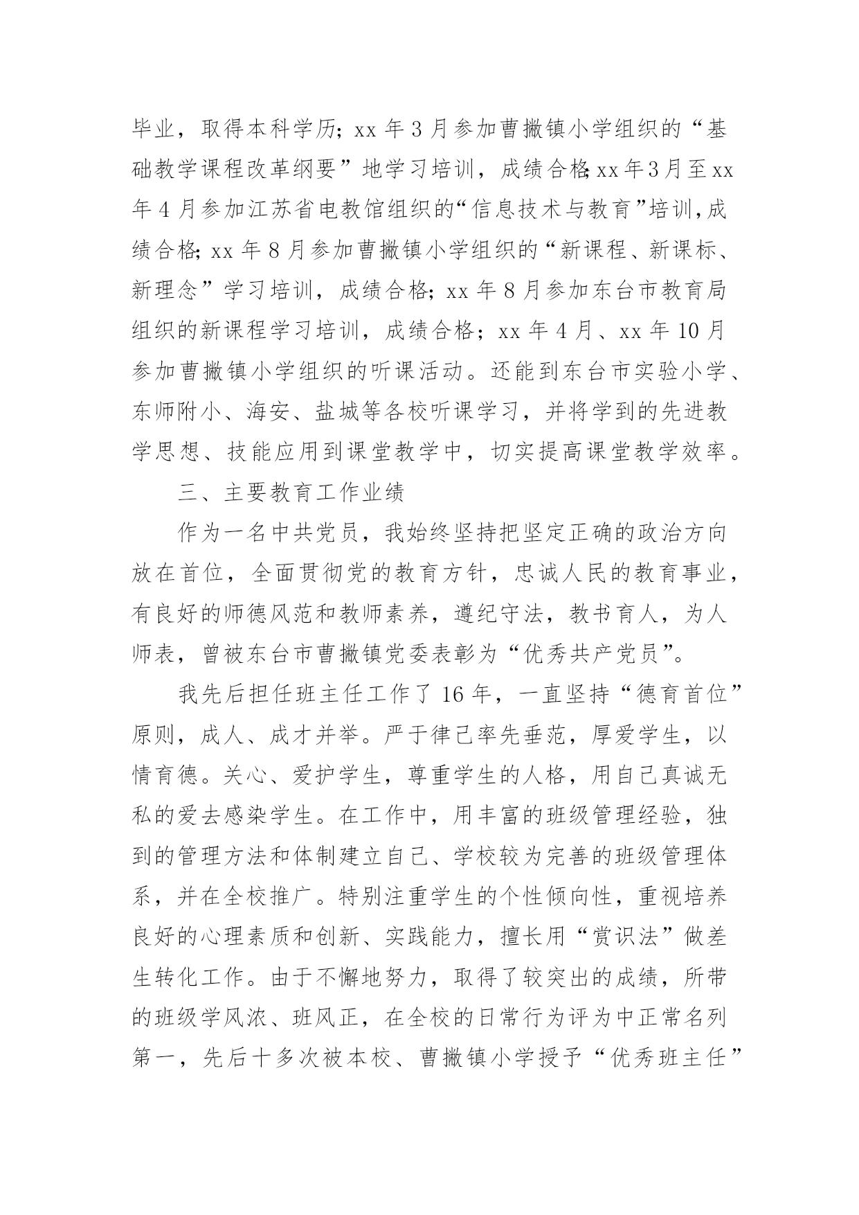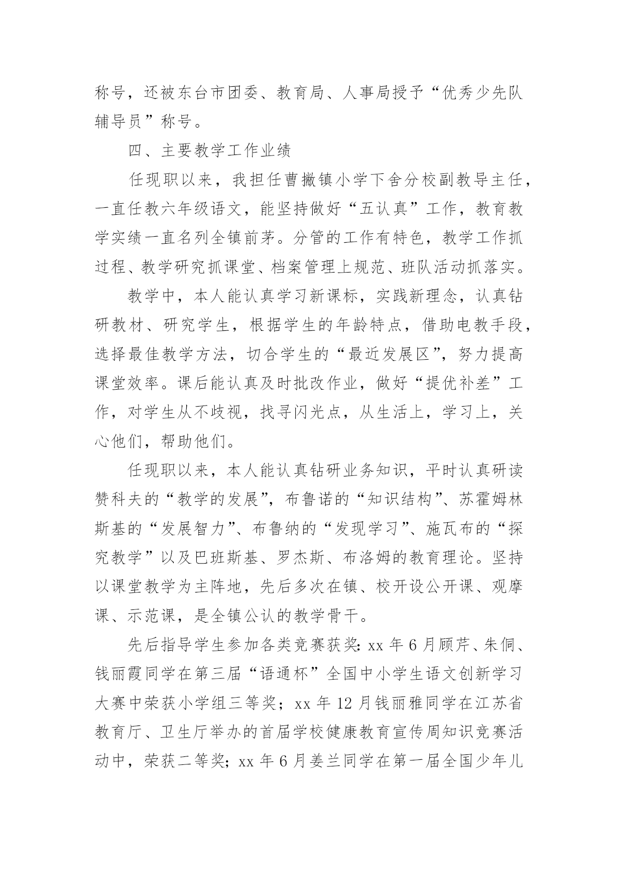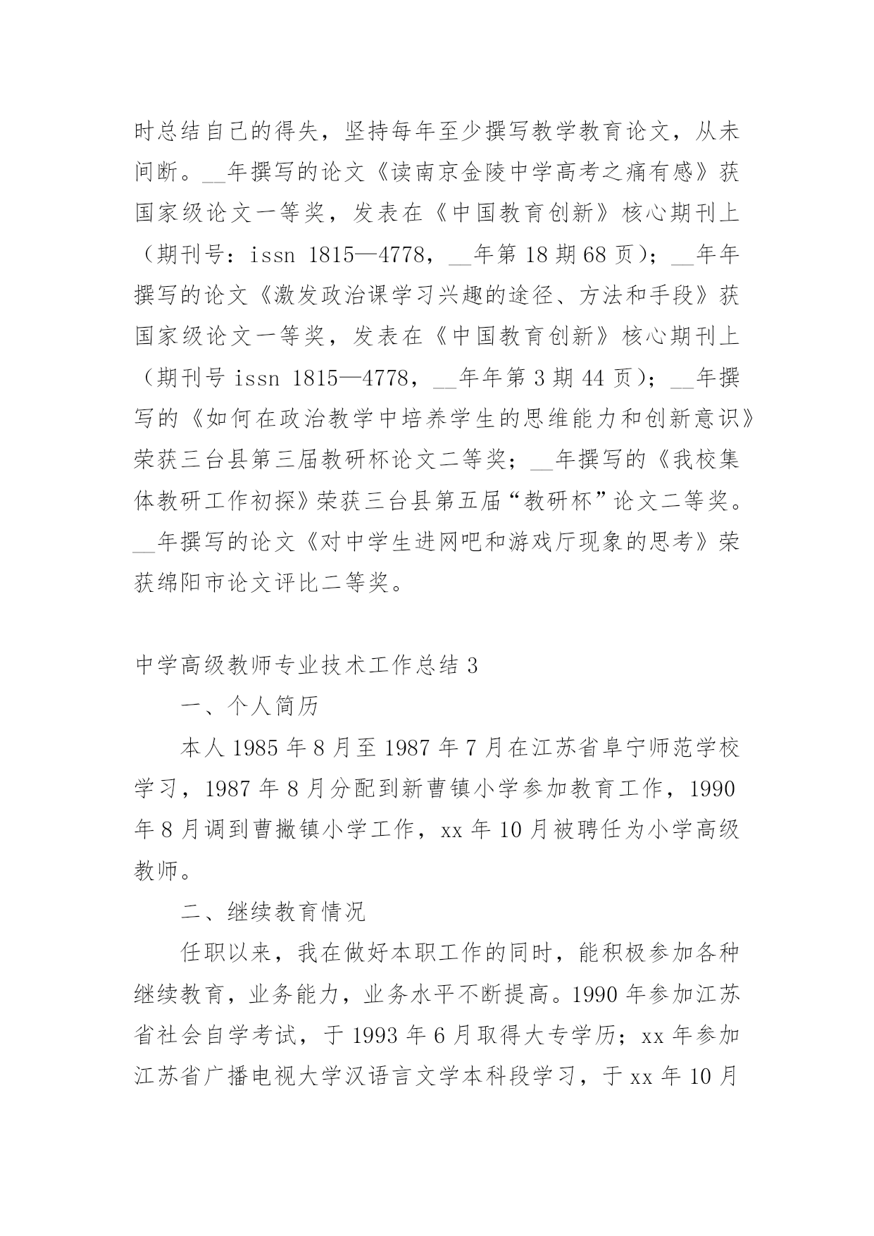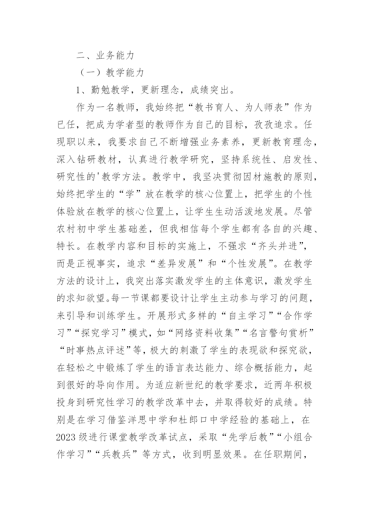 中学高级教师专业技术工作总结总结是对某一特定时间段内的学习和工作生活等表现情况加以回顾和分析的一种书面材料,它能帮我们理顺知识结构,突出重点,突破难点,为此要我们写一份总结。你想知道总结怎么写吗?以下是小编收集整理的中学高级教师专业技术工作总结,希望对大家有所帮助。中学高级教师专业技术工作总结1我从事教育工作至今已有二十八年了,我品尝过不同学段不同岗位的教学工作的酸甜苦辣。从最初的高中教育到后来的中职教育,再到现在的初中教育;从一名普通的英语教师到协管教学工作的教导主任,从教导主任再到中心学校主管面上工作的副校长,如今则是__最偏远乡村中学的校长。随着教龄的增长,个人业务素质的提高以及显著的教育成绩,本人也从多年前的一名中学二级教师成长为中学一级教师,如今则即将成为中学高级教师。回首近三十年来的教育生涯,我真正是百感交集。我能成长为一名中学高级教师,离不开领导、同事及家人的帮助和支持。我怀着感恩的心作如下专业技术工作总结:一.用赤诚和奉献铸造师魂1、做人真诚,有良好的人格修养。教师是人类灵魂的工程师,良好的人格修养应是师魂的核心,而“真”字则是人格修养的基石。因为“善、美”也只有在“真”的基石上才能开出灿烂的花朵。我把“真”字视为我做人的准则。对领导,我说真话,哪怕逆耳;对同事,我讲真情,哪怕曾有隔阂;对学生,我授真知,若自己知识有限,我会虚心向他人请教。2、思想纯正,将教育事业视为个人的第二生命。我生长在一个教育世家,父亲是一个解放初从私塾走出来的能激情吟诵“巍巍乎昆仑”的老先生。父亲为他挚爱的教书生涯奔波了一生,虽然父亲现在去世了,但他教育生命依然在我血液中流淌。我的弟弟是中学一名语文教师,如今我的女儿也走上了讲台。教育不仅是我个人的第二生命,也是我们这个教育世家的第二生命。作为一名党员,我对党忠诚;作为教师,我热爱教育事业,热爱学生。我思想纯正,从未参加过任何不良组织,从未干过任何违法乱纪的事。3、追求卓越,有坚定的教育理想。我所工作的学校位于鄂赣皖三省交界之处,十分偏僻。我的教育理想是改变农村落后的教育面貌。虽然这一理想的实现充满坎坷,甚至终其一生也许难以实现,但我坚定不移。我愿为此奋斗一生,奉献一生。二.用勤奋和创新彰显能力。1、勤奋学习以增长才干。我是一名英语教师,为了给学生一碗水,我努力让自己拥有知识的河流。我自费订阅了《英语周报》等报刊,购买了李阳疯狂英语磁带,勤写读书笔记。在教学上,我积极参加各种教学研究活动,尝试各种教学改革,力求让学生学得轻松,学得快乐,且学习成绩有显著提高。在教学教研的同时,我十分注重从理论的高度审视个人的教学实践,研读教育理论,撰写教学论文。我又是一名校长,从事教育管理工作。角色的转变催逼我要不断学习,尤其是学习教育管理方面的知识。我一方面向书本请教,《中国教育报》等报刊书籍从此摆上了我的案头;我一方面向同行求教,就学校管理中存在的困惑寻求解决之道;我更是注重向教育专家学习,各种校长培训活动我总是积极参加。2、创新工作以革新面貌。人事制度改革——激发有限的教育资源农村初中教师编制紧并且师资良莠不齐,为改变这一现状,我在我任职的学校大胆进行了人事制度改革。全体教师实行竞争上岗,通过竞争然后上岗的教师再由班主任自由组阁,落岗的教师则由乡中心学校安排到小学任教。管理思想改革——凝聚人心一些学校是以刚性管理为主,教职工有抵触情绪。我在我任职的学校尝试了人性化的管理模式,教职工关系十分融洽。像制度的制定与修改,一定让教师代表参加讨论,充分听取他们的'意见;像考勤工作,较之过去更为宽松;像教职工个人生病及家中婚丧之事,我都会去看望或慰问。平面整治——创造育人环境任职几年来,我带领我的团队先后兴建了学生食堂、学生厕所、排球及乒乓球运动场,扩建了连接教学区与生活区的石桥,水塘边栽种了垂柳。为彻底解决垃圾存放问题,我们购买了几十只垃圾桶,并与校外村民协议了垃圾运放一事,垃圾历史难题终于解决,学校面貌焕然一新。教育教学——凸显特色德育工作突出以活动育人,改变过去以堵为主的管理模式;教学工作我强调要走一条属于自己的路。近年,我正在教师中推行“教学练”这一教学模式。三.用执着和坚守感受辛勤距离没有让懒惰成为理由。我现在所工作的学校距离我镇上的家有三十里地,我从未因这三十里地而迟过一次到,也从未缺勤过。我在中心学校工作期间,每天早晨七点半一定准时到岗,风雨无阻。担任中学校长之后,我把家搬到了学校,妻子也只得跟我一起从镇上迁下来过清苦的日子。在老人生病及去世的日子里,我让妻子去照料,为不耽误工作我只请假三天。贫瘠没有让坚守成为虚言。我所工作的学校在物质条件方面不是很好,但我从未有过放弃与逃避的念头,虽然我有过多次能离开的选择,但我没有,因为让这片贫瘠的土地开出灿烂的教育之花是我的执着追求。四.用心血和汗水书写