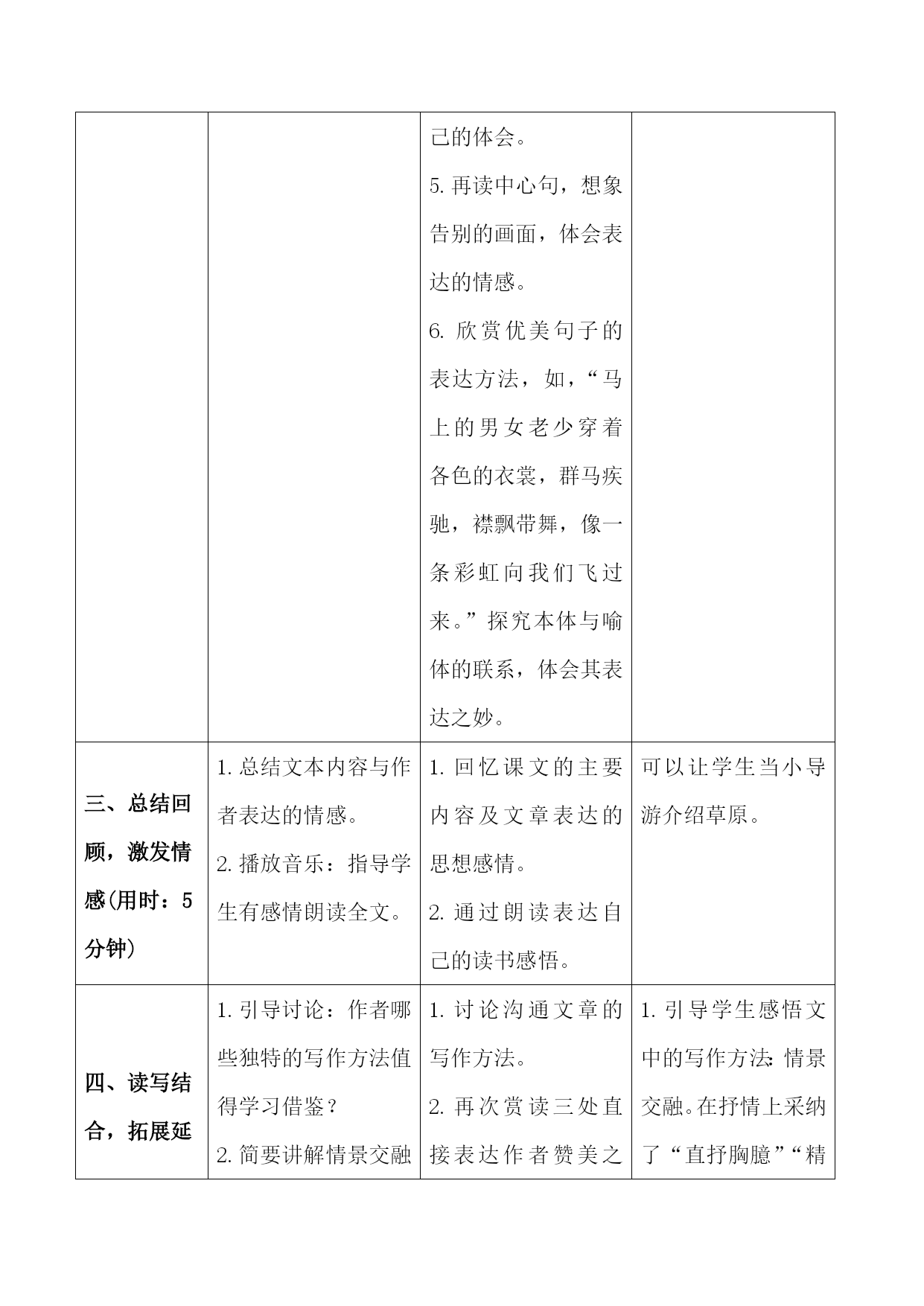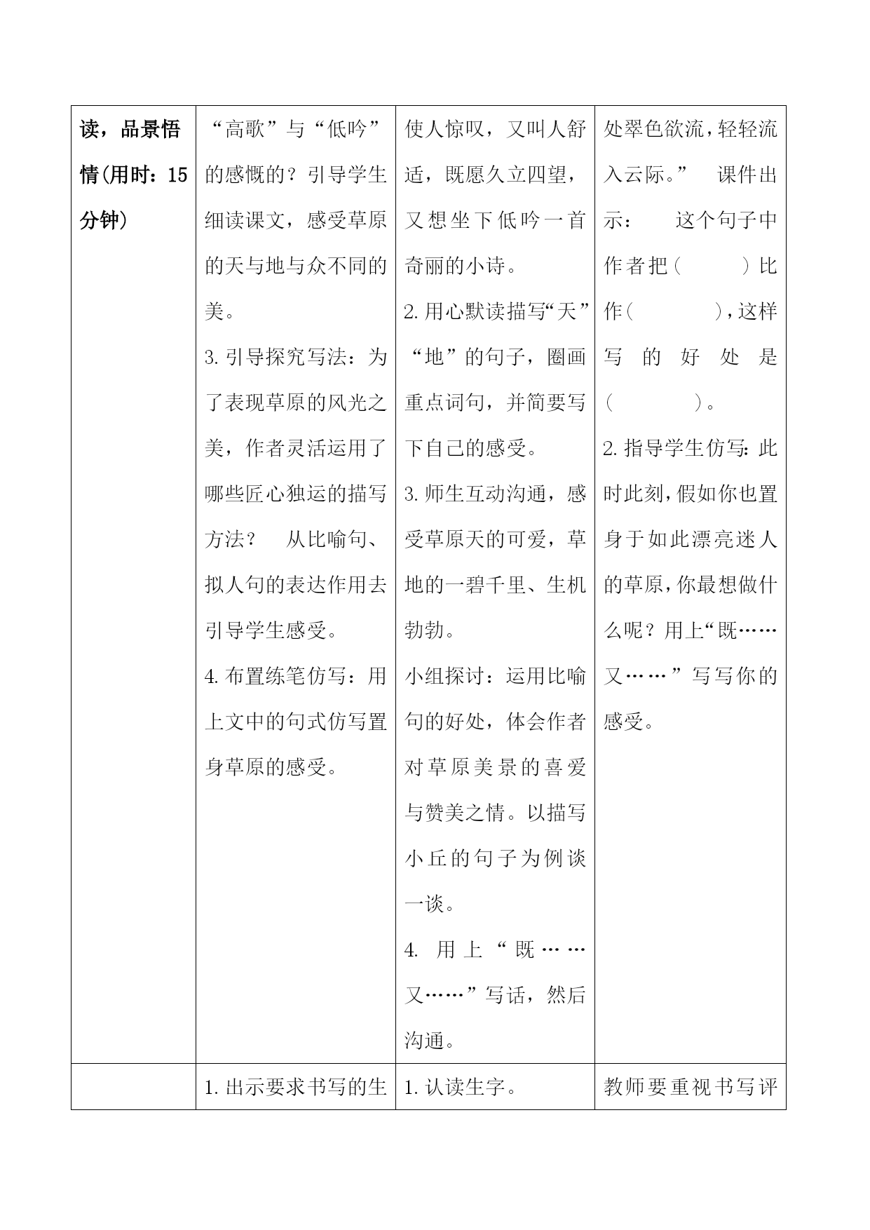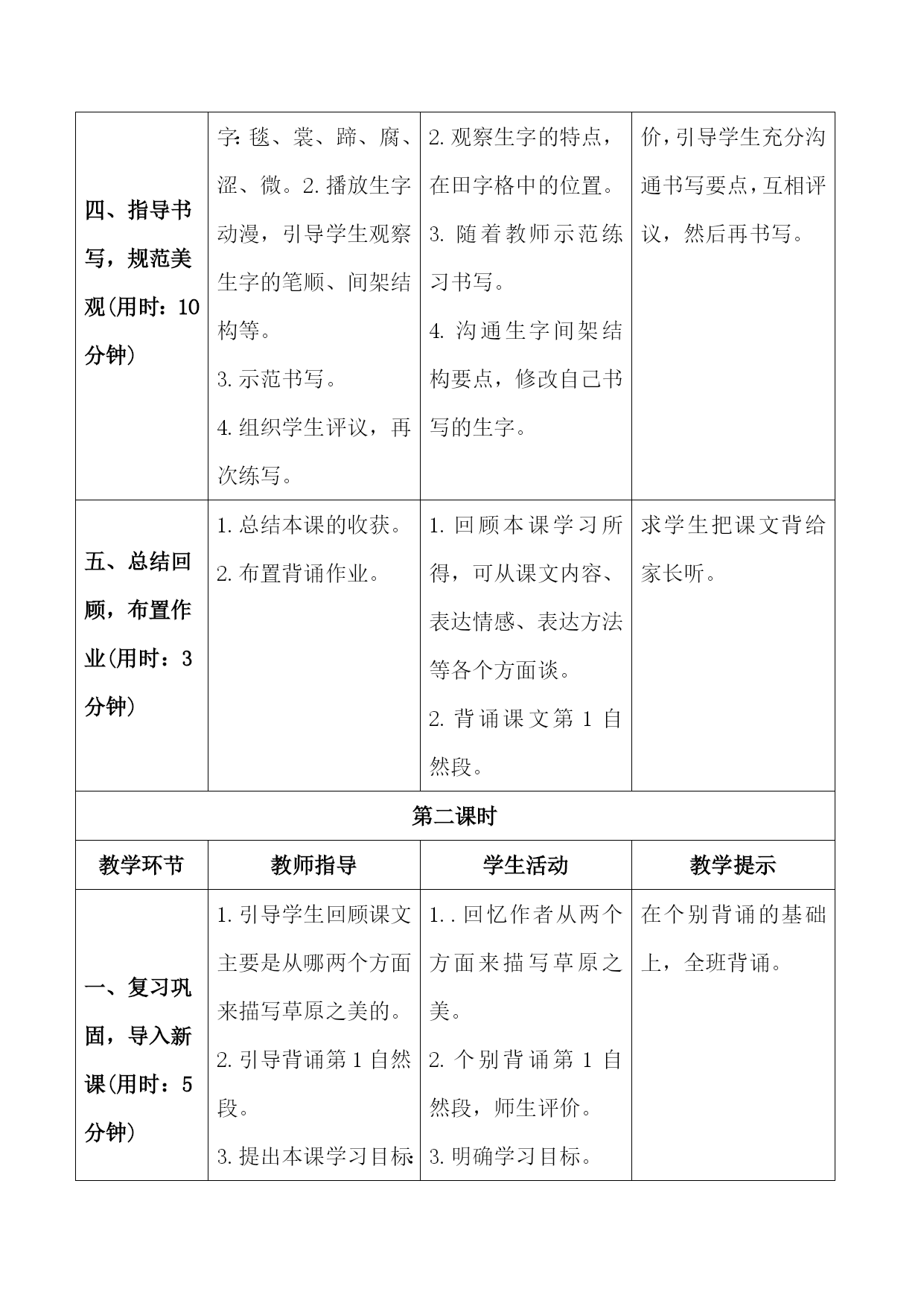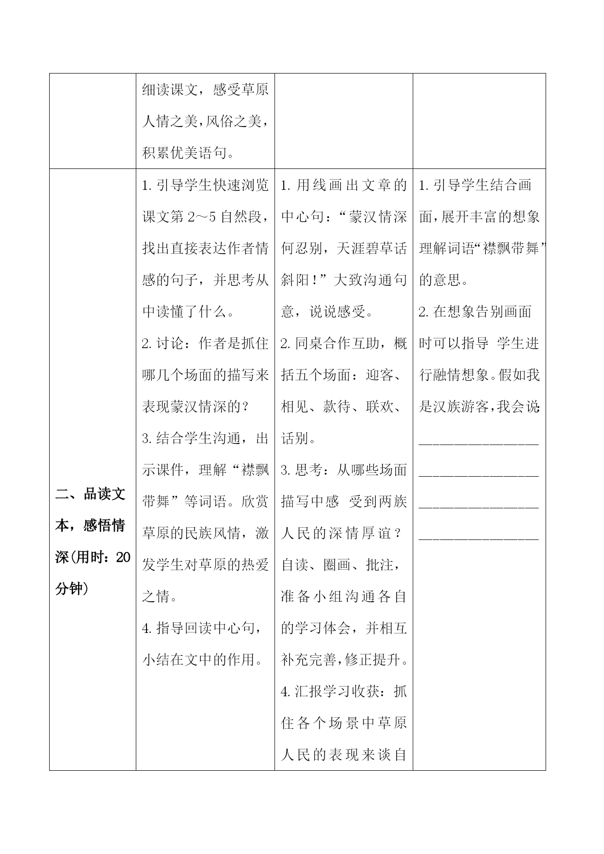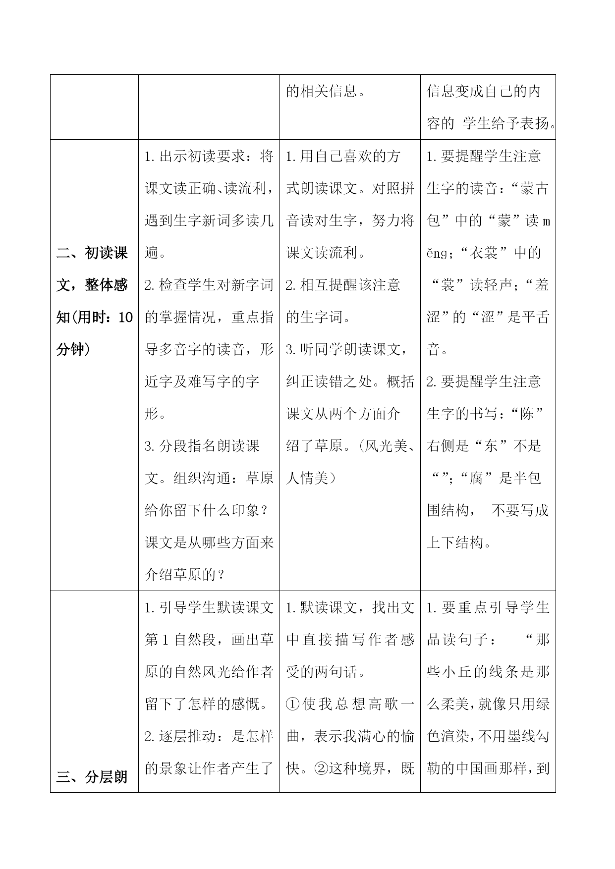 1《草原》导学案 课题草原课型新授课教学目标1.正确读写“毯、玻”等9个字,会写“草原、线条”等19个词语。 2.有感情地朗读课文,抓住重点词句,体会如诗如画的草原风光,感受草原人民的热情好客。 3.读懂课文,在草原自然美与人情美的熏陶感染下,受到热爱祖国和民族团结的教育,培养学生爱美的情趣。 4.品味、积累课文中优美的语言,背诵第1自然段。教学重难点抓住重点词句,体会如诗如画的草原风光,感受草原人民的热情好客。课前准备1.搜集有关草原的文字资料与图片,制作课件。(教师) 2.自学生字词,熟读课文,能说出