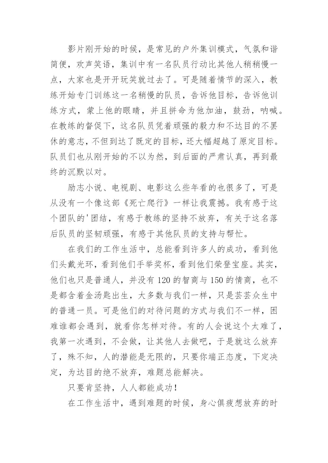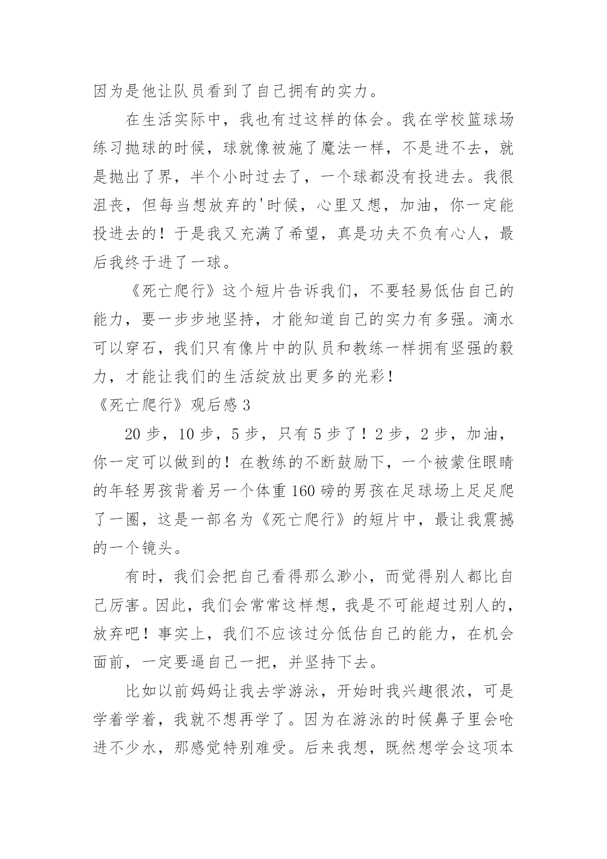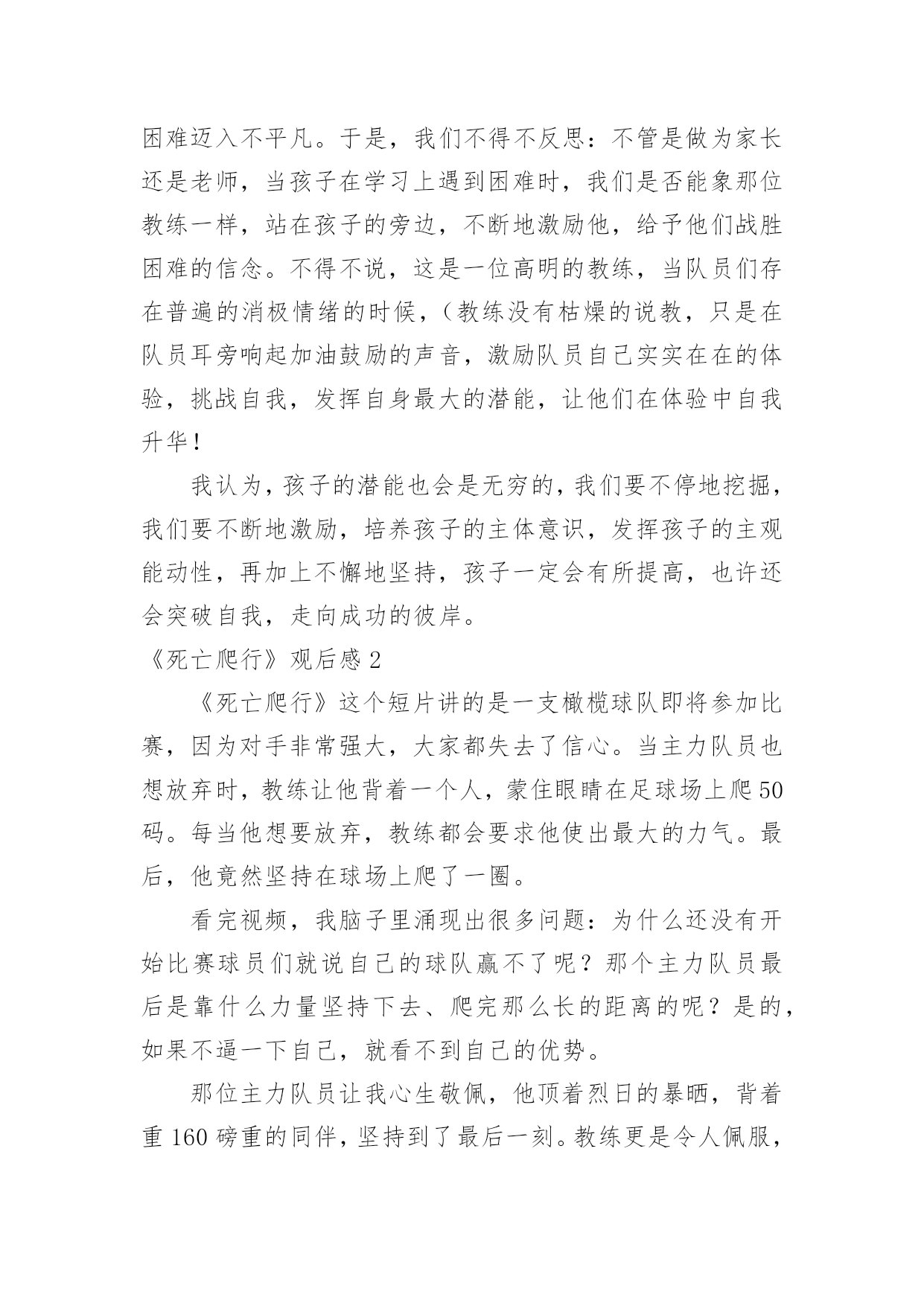 《死亡爬行》观后感《死亡爬行》观后感看完一部作品后,你有什么总结呢?不能光会看哦,写一篇观后感吧。那么你会写观后感吗?下面是小编帮大家整理的《死亡爬行》观后感,欢迎阅读,希望大家能够喜欢。《死亡爬行》观后感1在市教育中心培训期间,培训的老师放了一段视频《死亡爬行》,让我深受触动。视频讲的是一支球队在教练的指挥下做一项“死亡爬行”的体能训练,要求一个人半卧双手着地,膝盖不能着地,背上再压另一个人,沿着球场爬行。所有的队员都认为这是不可能完成的任务,在途中不到30米就全军覆没。这时候,教练叫出了球队中较优秀的队员叫布洛克,让他再做一次“死亡爬行”。这一次教练用一块布把布洛克的眼睛蒙上,希望他能走得更远不要放弃。喊了13次“对了”、15次“加油”、23次“别放弃”、33次“不要停”、48次“继续”,教练告诉布洛克,上帝赐予我们的`智慧和能力,不要浪费!在教练的激励下,布洛克释放出了自己最大的能量,爬行了很远很远,坚持到底不愿放弃的过程真是振奋人心。相信吗?因为激励,因为不放弃,看似不可能完成的事会变成奇迹;因为激励,因为不放弃,平凡人超越自己战胜困难迈入不平凡。于是,我们不得不反思:不管是做为家长还是老师,当孩子在学习上遇到困难时,我们是否能象那位教练一样,站在孩子的旁边,不断地激励他,给予他们战胜困难的信念。不得不说,这是一位高明的教练,当队员们存在普遍的消极情绪的时候,(教练没有枯燥的说教,只是在队员耳旁响起加油鼓励的声音,激励队员自己实实在在的体验,挑战自我,发挥自身最大的潜能,让他们在体验中自我升华!我认为,孩子的潜能也会是无穷的,我们要不停地挖掘,我们要不断地激励,培养孩子的主体意识,发挥孩子的主观能动性,再加上不懈地坚持,孩子一定会有所提高,也许还会突破自我,走向成功的彼岸。《死亡爬行》观后感2《死亡爬行》这个短片讲的是一支橄榄球队即将参加比赛,因为对手非常强大,大家都失去了信心。当主力队员也想放弃时,教练让他背着一个人,蒙住眼睛在足球场上爬50码。每当他想要放弃,教练都会要求他使出最大的力气。最后,他竟然坚持在球场上爬了一圈。看完视频,我脑子里涌现出很多问题:为什么还没有开始比赛球员们就说自己的球队赢不了呢?那个主力队员最后是靠什么力量坚持下去、爬完那么长的距离的呢?是的,如果不逼一下自己,就看不到自己的优势。那位主力队员让我心生敬佩,他顶着烈日的暴晒,背着重160磅重的同伴,坚持到了最后一刻。教练更是令人佩服,因为是他让队员看到了自己拥有的实力。在生活实际中,我也有过这样的体会。我在学校篮球场练习抛球的时候,球就像被施了魔法一样,不是进不去,就是抛出了界,半个小时过去了,一个球都没有投进去。我很沮丧,但每当想放弃的'时候,心里又想,加油,你一定能投进去的!于是我又充满了希望,真是功夫不负有心人,最后我终于进了一球。《死亡爬行》这个短片告诉我们,不要轻易低估自己的能力,要一步步地坚持,才能知道自己的实力有多强。滴水可以穿石,我们只有像片中的队员和教练一样拥有坚强的毅力,才能让我们的生活绽放出更多的光彩!《死亡爬行》观后感320步,10步,5步,只有5步了!2步,2步,加油,你一定可以做到的!在教练的不断鼓励下,一个被蒙住眼睛的年轻男孩背着另一个体重160磅的男孩在足球场上足足爬了一圈,这是一部名为《死亡爬行》的短片中,最让我震撼的一个镜头。有时,我们会把自己看得那么渺小,而觉得别人都比自己厉害。因此,我们会常常这样想,我是不可能超过别人的,放弃吧!事实上,我们不应该过分低估自己的能力,在机会面前,一定要逼自己一把,并坚持下去。比如以前妈妈让我去学游泳,开始时我兴趣很浓,可是学着学着,我就不想再学了。因为在游泳的时候鼻子里会呛进不少水,那感觉特别难受。后来我想,既然想学会这项本领,为什么不努力坚持学下去呢?如果这时候随便放弃,不光浪费了妈妈交的.学费,以前呛水受的苦也是白受的了。就这样,我坚持了下来,学会了游泳。我也看到身边有的朋友在学画画,后来感觉画画很难,就慢慢中断了,真的很可惜。报纸和电视的新闻都有过这样的报导:有的人天生没有双手,可他们学会了用双脚照顾自己。这些都说明,一个人的潜能是超乎自己想象的。我们每个人都不应该忽视自己的能力,我们每个人的身体里都蕴藏着巨大的力量,只要我们能坚持,就有战胜自己和超越别人的希望。《死亡爬行》观后感4这是一个励志故事,过程振奋人心。我理解是:目标、梦想、坚持、信念、成功我们所要面对的事情,就和视频里蒙眼睛爬行一样。有人不相信,有人观望,有人或许在说笑。当你实现的时候,有许多赞许。当你发现完成超出你所想象的时候,有许多“异样”的声音,这种异样就不是简单地赞许!在生活工作当中,我们会遇到各种无法回避的困难,要用心灵去坚持,它只是一时的,克服了,远超于成功,失败了,也是一种成绩。在