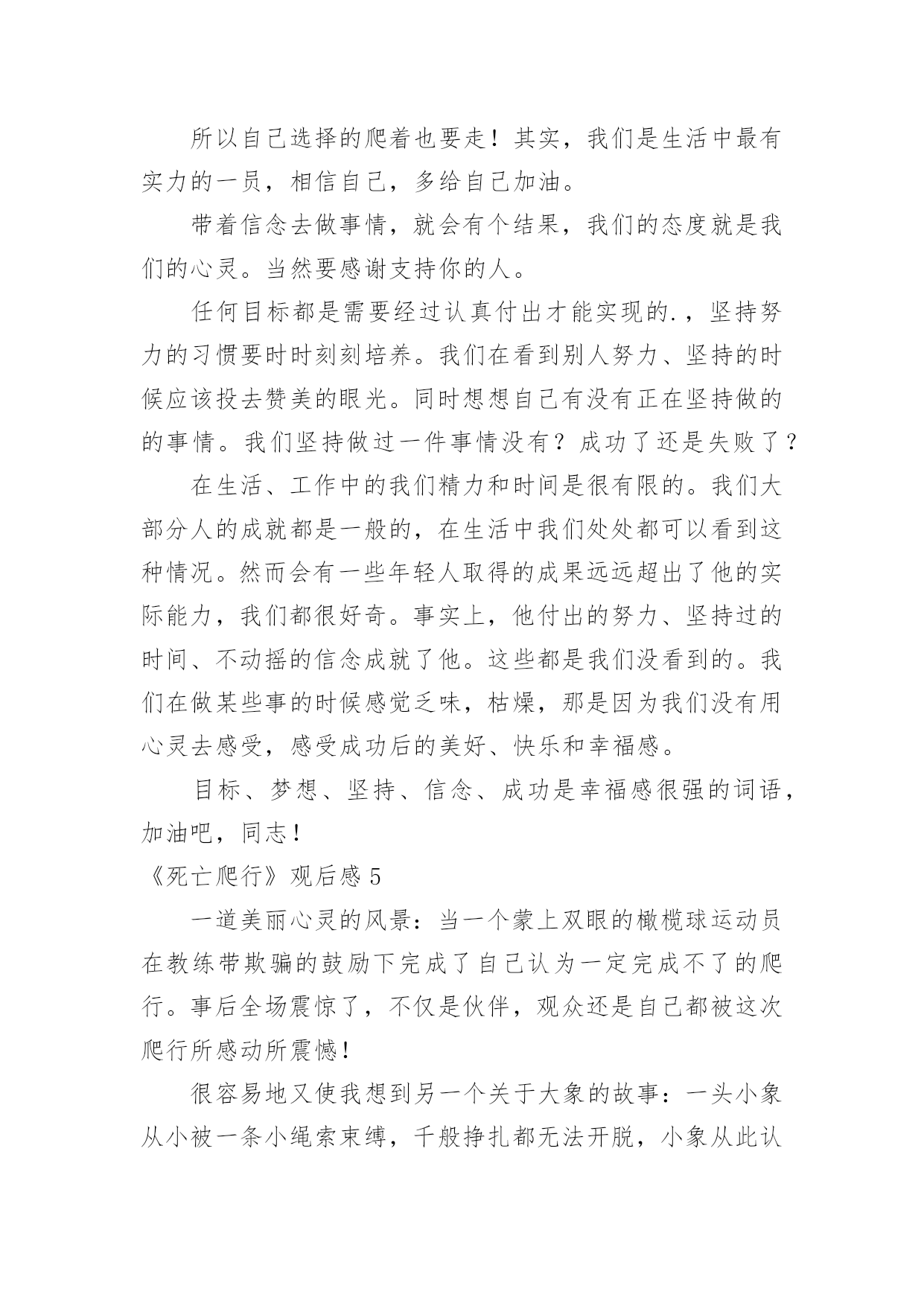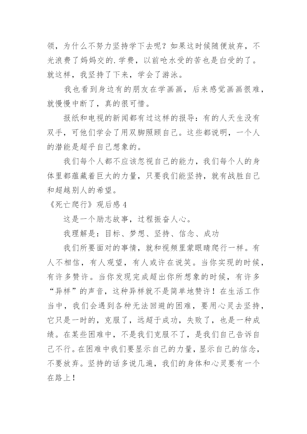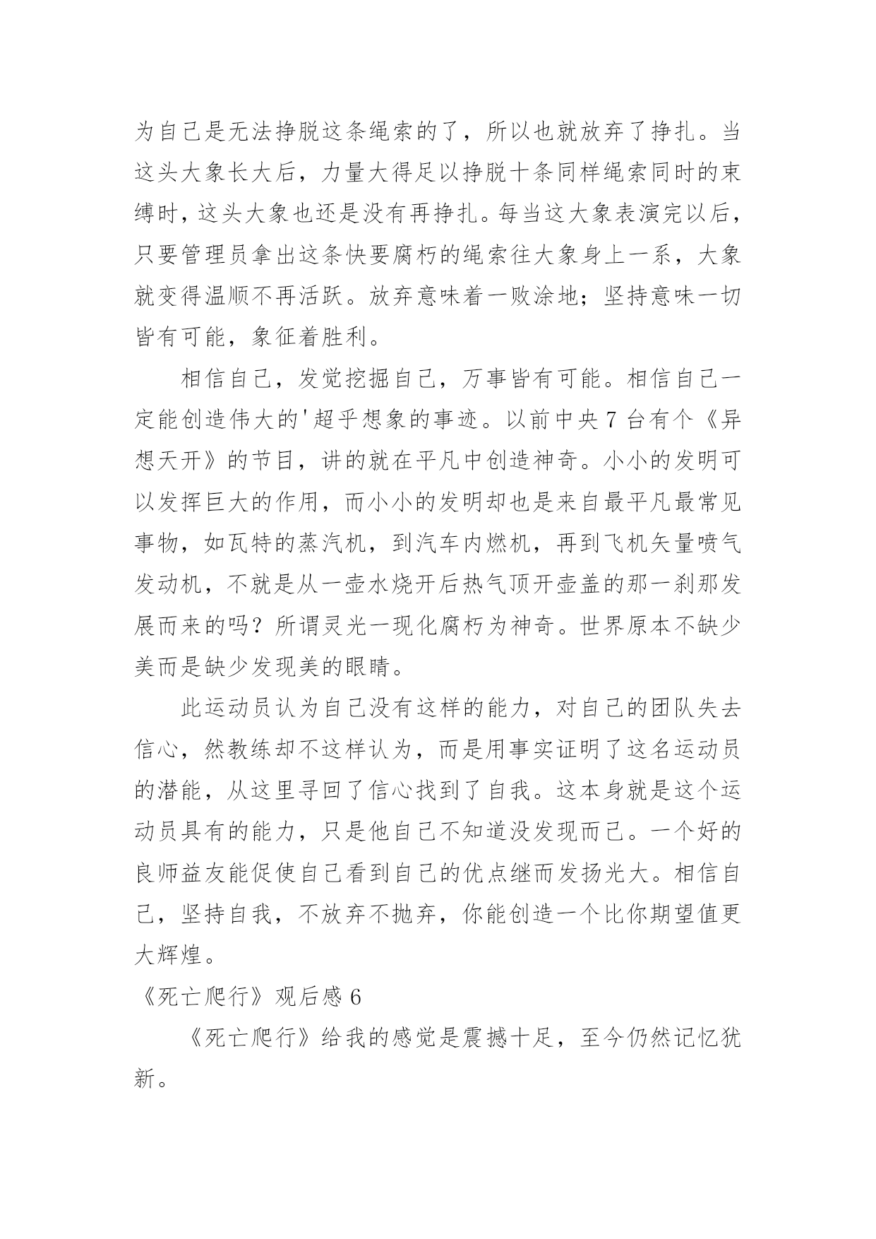 《死亡爬行》观后感《死亡爬行》观后感看完一部作品后,你有什么总结呢?不能光会看哦,写一篇观后感吧。那么你会写观后感吗?下面是小编帮大家整理的《死亡爬行》观后感,欢迎阅读,希望大家能够喜欢。《死亡爬行》观后感1在市教育中心培训期间,培训的老师放了一段视频《死亡爬行》,让我深受触动。视频讲的是一支球队在教练的指挥下做一项“死亡爬行”的体能训练,要求一个人半卧双手着地,膝盖不能着地,背上再压另一个人,沿着球场爬行。所有的队员都认为这是不可能完成的任务,在途中不到30米就全军覆没。这时候,教练叫出了球队中较优秀的队员叫布洛克,让他再做一次“死亡爬行”。这一次教练用一块布把布洛克的眼睛蒙上,希望他能走得更远不要放弃。喊了13次“对了”、15次“加油”、23次“别放弃”、33次“不要停”、48次“继续”,教练告诉布洛克,上帝赐予我们的`智慧和能力,不要浪费!在教练的激励下,布洛克释放出了自己最大的能量,爬行了很远很远,坚持到底不愿放弃的过程真是振奋人心。相信吗?因为激励,因为不放弃,看似不可能完成的事会变成奇迹;因为激励,因为不放弃,平凡人超越自己战胜困难迈入不平凡。于是,我们不得不反思:不管是做为家长还是老师,当孩子在学习上遇到困难时,我们是否能象那位教练一样,站在孩子的旁边,不断地激励他,给予他们战胜困难的信念。不得不说,这是一位高明的教练,当队员们存在普遍的消极情绪的时候,(教练没有枯燥的说教,只是在队员耳旁响起加油鼓励的声音,激励队员自己实实在在的体验,挑战自我,发挥自身最大的潜能,让他们在体验中自我升华!我认为,孩子的潜能也会是无穷的,我们要不停地挖掘,我们要不断地激励,培养孩子的主体意识,发挥孩子的主观能动性,再加上不懈地坚持,孩子一定会有所提高,也许还会突破自我,走向成功的彼岸。《死亡爬行》观后感2《死亡爬行》这个短片讲的是一支橄榄球队即将参加比赛,因为对手非常强大,大家都失去了信心。当主力队员也想放弃时,教练让他背着一个人,蒙住眼睛在足球场上爬50码。每当他想要放弃,教练都会要求他使出最大的力气。最后,他竟然坚持在球场上爬了一圈。看完视频,我脑子里涌现出很多问题:为什么还没有开始比赛球员们就说自己的球队赢不了呢?那个主力队员最后是靠什么力量坚持下去、爬完那么长的距离的呢?是的,如果不逼一下自己,就看不到自己的优势。那位主力队员让我心生敬佩,他顶着烈日的暴晒,背着重160磅重的同伴,坚持到了最后一刻。教练更是令人佩服,因为是他让队员看到了自己拥有的实力。在生活实际中,我也有过这样的体会。我在学校篮球场练习抛球的时候,球就像被施了魔法一样,不是进不去,就是抛出了界,半个小时过去了,一个球都没有投进去。我很沮丧,但每当想放弃的'时候,心里又想,加油,你一定能投进去的!于是我又充满了希望,真是功夫不负有心人,最后我终于进了一球。《死亡爬行》这个短片告诉我们,不要轻易低估自己的能力,要一步步地坚持,才能知道自己的实力有多强。滴水可以穿石,我们只有像片中的队员和教练一样拥有坚强的毅力,才能让我们的生活绽放出更多的光彩!《死亡爬行》观后感320步,10步,5步,只有5步了!2步,2步,加油,你一定可以做到的!在教练的不断鼓励下,一个被蒙住眼睛的年轻男孩背着另一个体重160磅的男孩在足球场上足足爬了一圈,这是一部名为《死亡爬行》的短片中,最让我震撼的一个镜头。有时,我们会把自己看得那么渺小,而觉得别人都比自己厉害。因此,我们会常常这样想,我是不可能超过别人的,放弃吧!事实上,我们不应该过分低估自己的能力,在机会面前,一定要逼自己一把,并坚持下去。比如以前妈妈让我去学游泳,开始时我兴趣很浓,可是学着学着,我就不想再学了。因为在游泳的时候鼻子里会呛进不少水,那感觉特别难受。后来我想,既然想学会这项本领,为什么不努力坚持学下去呢?如果这时候随便放弃,不光浪费了妈妈交的.学费,以前呛水受的苦也是白受的了。就这样,我坚持了下来,学会了游泳。我也看到身边有的朋友在学画画,后来感觉画画很难,就慢慢中断了,真的很可惜。报纸和电视的新闻都有过这样的报导:有的人天生没有双手,可他们学会了用双脚照顾自己。这些都说明,一个人的潜能是超乎自己想象的。我们每个人都不应该忽视自己的能力,我们每个人的身体里都蕴藏着巨大的力量,只要我们能坚持,就有战胜自己和超越别人的希望。《死亡爬行》观后感4这是一个励志故事,过程振奋人心。我理解是:目标、梦想、坚持、信念、成功我们所要面对的事情,就和视频里蒙眼睛爬行一样。有人不相信,有人观望,有人或许在说笑。当你实现的时候,有许多赞许。当你发现完成超出你所想象的时候,有许多“异样”的声音,这种异样就不是简单地赞许!在生活工作当中,我们会遇到各种无法回避的困难,要用心灵去坚持,它只是一时的,克服了,远超于成功,失败了,也是一种成绩。在