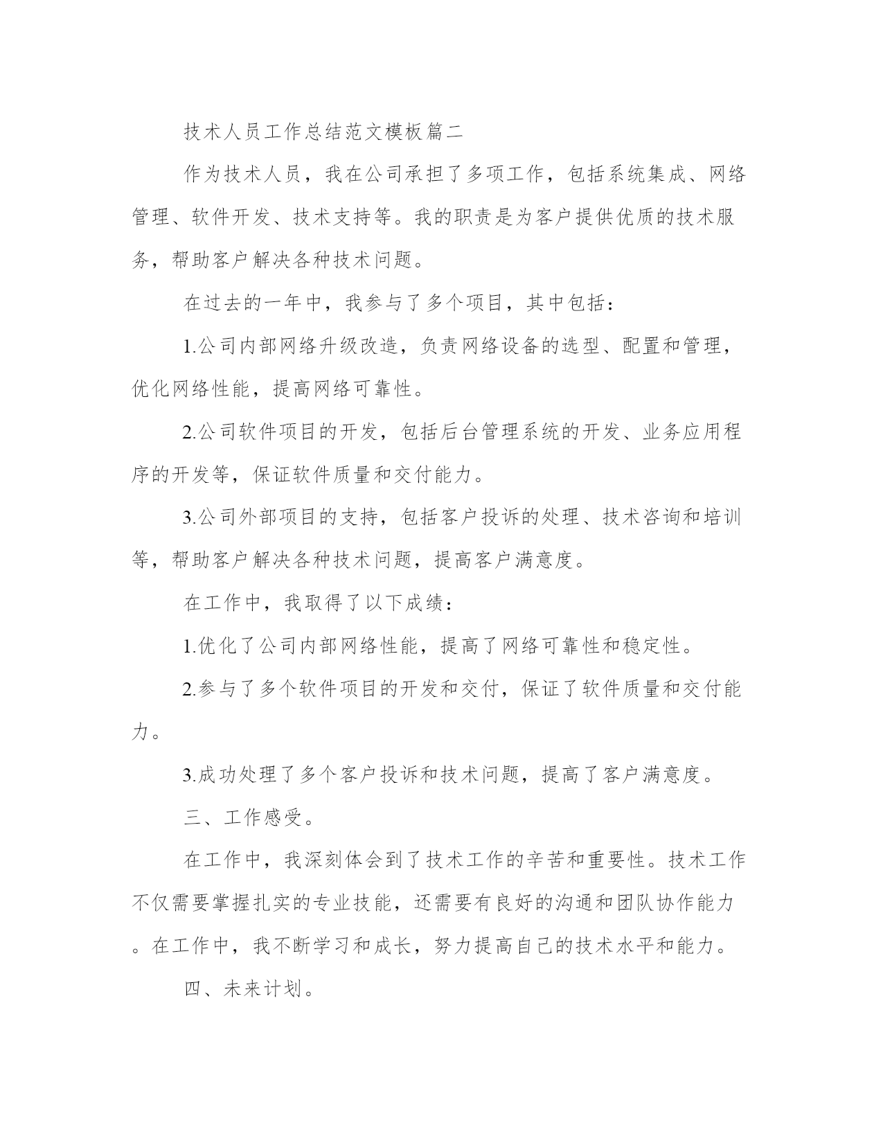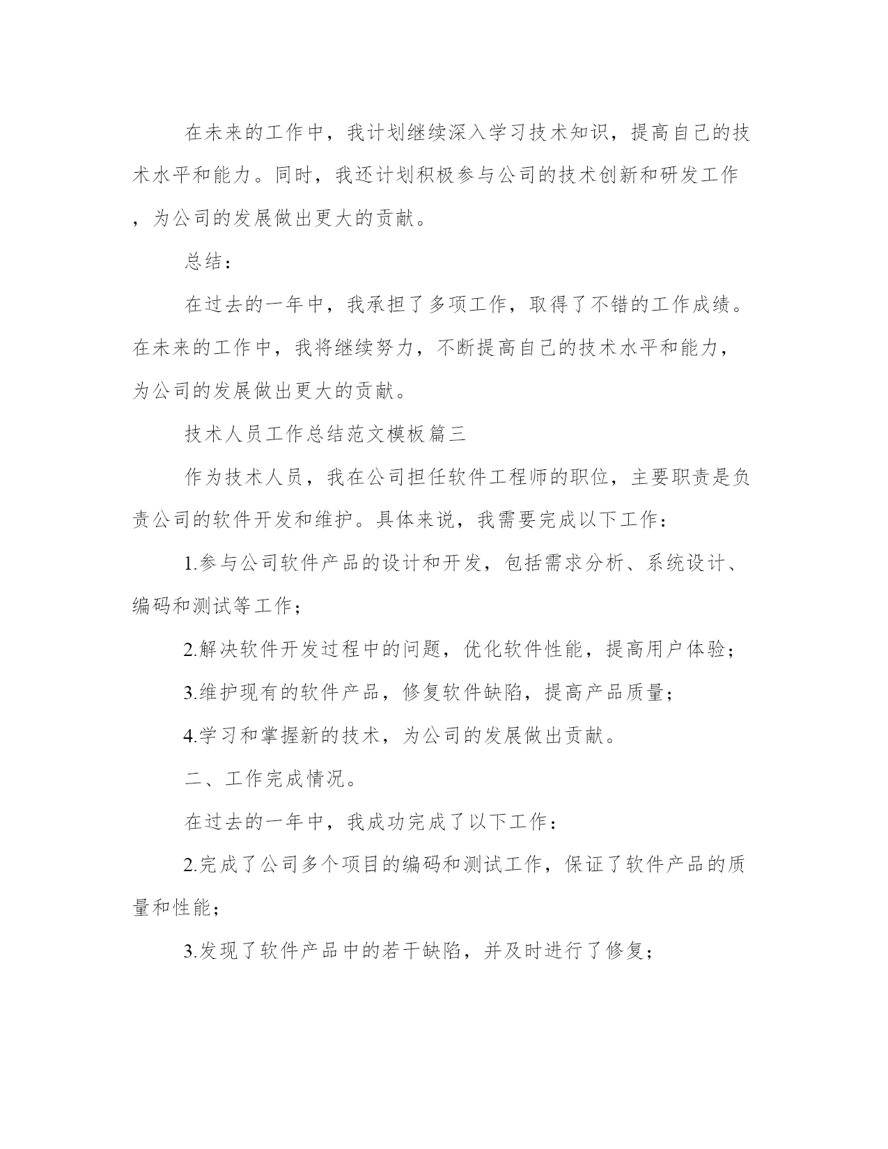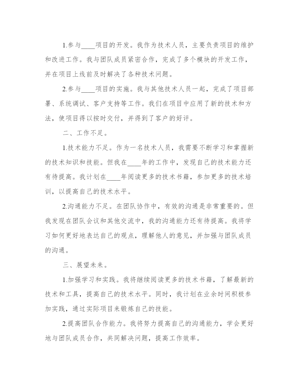 最新技术人员工作总结范文模板大全(模板16篇)总结是一种思考的过程,可以帮助我们更深入地理解和应用所学知识。总结的内容可以从多个角度进行思考,比如自我评价、效果评估、问题分析等。这些总结范文包含了不同领域、不同层次和不同风格的总结,供大家参考和借鉴。技术人员工作总结范文模板篇一我叫-x,是河南火电一公司电气施工处的一名普通职工。自从参加工作以来,我一直在各个方面严格要求自己,认真工作,勤勤恳恳,踏踏实实,从身边的小事做起。为了进一步的提高自己的技能水平,做一个有用的人才,我还利用业余时间积极努力学习文化知识,20xx年获得郑州电力高等专科学校电气自动化专业的大专文凭,同年考上长沙电力大学同专业的本科在读。20xx年4月份,我服从电气施工处领导的安排,来到姚孟项目部电气工地,从事#6机组接地线的敷设工作。由于接地线的工作需要赶在土建单位回填前进行敷设,那就要求我们施工人员随时注意土建单位的'施工进度。因此我每天来到工地上的第一件事就是到施工现场,看看是否达到可以施工的条件,及时向班组的师傅和有关领导汇报,做到积极主动,从而避免延误施工进度。目前,电气工地人员少任务重,为了不影响整个工程的施工进度,只要有需要爬高上低的地方,年轻力壮的我二话不说,扎好安全带,领头开始工作。一干就是半天,累得腰酸腿疼,但我没有丝毫的怨言,任劳任怨。有一回,下午3点钟得到土建单位的通知,主厂房0米层第二天要回填,而接地线的工作还有大量的工作未完成,我作为临时负责人,感到任务相当艰巨。接到通知后,我和班组上的其他4个施工人员开始工作,大家一起把将近70根60x7的扁铁运到施工现场。眼看着天色渐暗,而焊接任务繁重,我随即拿起焊把焊帽开始工作,虽然时间紧迫,但必须要求施工工艺和质量,一直到晚上23点50分,终于保质保量地完成了400多米的工作量,得到了监理单位的好评,为项目部和工地获得了荣誉。随着土建单位施工进度的加快,电气工地的任务日益繁重。在工地领导的安排下,我开始厂用电盘柜基础的安装工作。工地负责人多次召开会议,强调质量第一,一次做好,争创精品工程,积极响应甲方的两达一创,我深刻的领会领导的意图,从自我做起,深入到每一项工作中,克服人员少任务重的困难,每一道工序都做到精益求精,只有这样,才能干出精品。通过我们的共同努力,电气盘柜基础的安装工作得到了项目部质检科的认可和监理单位的充分肯定。作为河南火电一公司电气施工处的一名年轻人,我深刻的体会到自己还有很多不足的地方需要改进。在以后日益激烈的竞争环境下,百年大计质量是第一,成功源于细节,姚孟工程争创鲁班奖,以后施工要以更高的标准严格要求自己,无论干什么工作都要兢兢业业,精益求精,保证各项工作一次做好,符合质量规范要求,从我做起,保持干一行,爱一行,精一行,为电气施工处和公司争光!技术人员工作总结范文模板篇二作为技术人员,我在公司承担了多项工作,包括系统集成、网络管理、软件开发、技术支持等。我的职责是为客户提供优质的技术服务,帮助客户解决各种技术问题。在过去的一年中,我参与了多个项目,其中包括:1.公司内部网络升级改造,负责网络设备的选型、配置和管理,优化网络性能,提高网络可靠性。2.公司软件项目的开发,包括后台管理系统的开发、业务应用程序的开发等,保证软件质量和交付能力。3.公司外部项目的支持,包括客户投诉的处理、技术咨询和培训等,帮助客户解决各种技术问题,提高客户满意度。在工作中,我取得了以下成绩:1.优化了公司内部网络性能,提高了网络可靠性和稳定性。2.参与了多个软件项目的开发和交付,保证了软件质量和交付能力。3.成功处理了多个客户投诉和技术问题,提高了客户满意度。三、工作感受。在工作中,我深刻体会到了技术工作的辛苦和重要性。技术工作不仅需要掌握扎实的专业技能,还需要有良好的沟通和团队协作能力。在工作中,我不断学习和成长,努力提高自己的技术水平和能力。四、未来计划。在未来的工作中,我计划继续深入学习技术知识,提高自己的技术水平和能力。同时,我还计划积极参与公司的技术创新和研发工作,为公司的发展做出更大的贡献。总结:在过去的一年中,我承担了多项工作,取得了不错的工作成绩。在未来的工作中,我将继续努力,不断提高自己的技术水平和能力,为公司的发展做出更大的贡献。技术人员工作总结范文模板篇三作为技术人员,我在公司担任软件工程师的职位,主要职责是负责公司的软件开发和维护。具体来说,我需要完成以下工作:1.参与公司软件产品的设计和开发,包括需求分析、系统设计、编码和测试等工作;2.解决软件开发过程中的问题,优化软件性能,提高用户体验;3.维护现有的软件产品,修复软件缺陷,提高产品质量;4.学习和掌握新的技术,为公司的发展做出贡献。二、工作完成情况。在过去的
