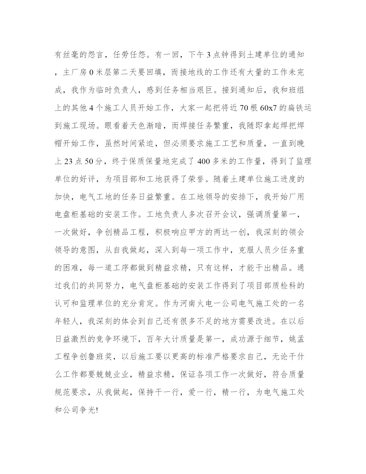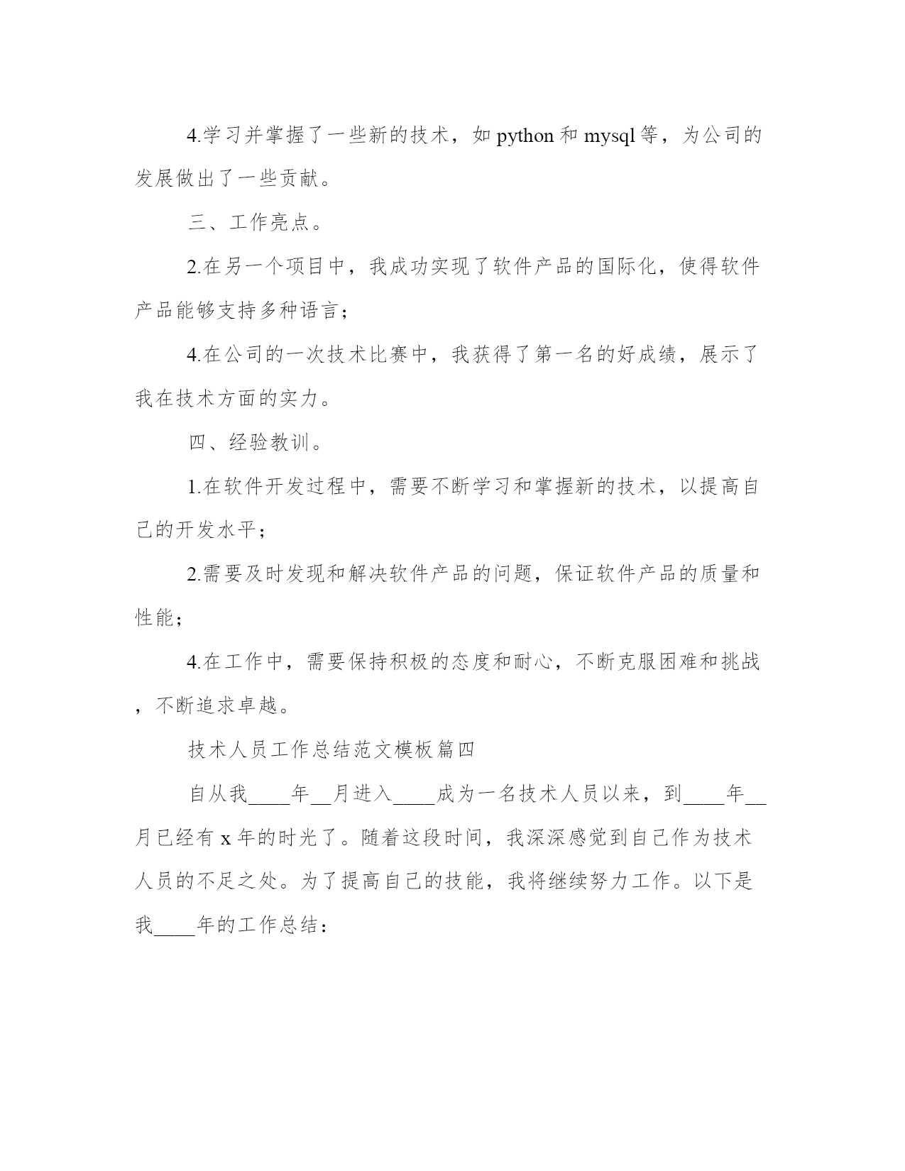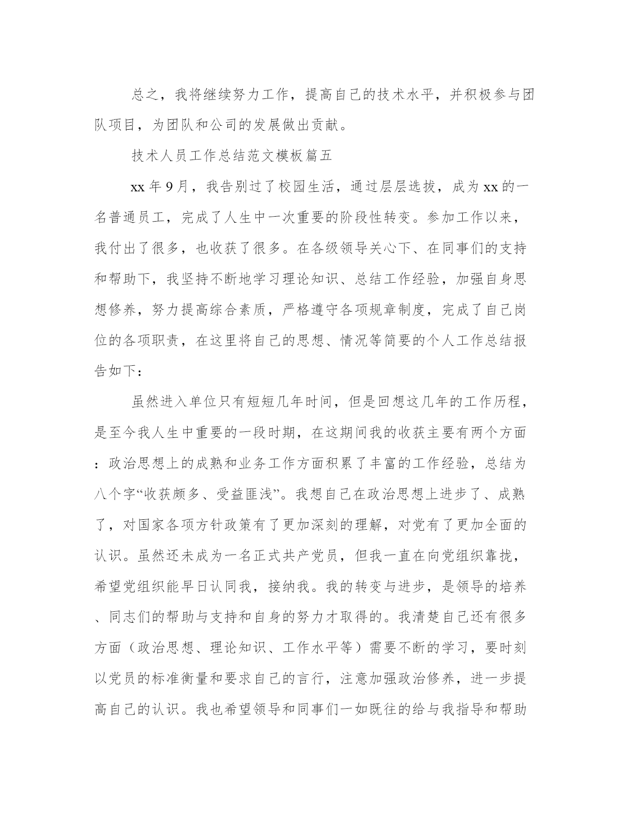 最新技术人员工作总结范文模板大全(模板16篇)总结是一种思考的过程,可以帮助我们更深入地理解和应用所学知识。总结的内容可以从多个角度进行思考,比如自我评价、效果评估、问题分析等。这些总结范文包含了不同领域、不同层次和不同风格的总结,供大家参考和借鉴。技术人员工作总结范文模板篇一我叫-x,是河南火电一公司电气施工处的一名普通职工。自从参加工作以来,我一直在各个方面严格要求自己,认真工作,勤勤恳恳,踏踏实实,从身边的小事做起。为了进一步的提高自己的技能水平,做一个有用的人才,我还利用业余时间积极努力学习文化知识,20xx年获得郑州电力高等专科学校电气自动化专业的大专文凭,同年考上长沙电力大学同专业的本科在读。20xx年4月份,我服从电气施工处领导的安排,来到姚孟项目部电气工地,从事#6机组接地线的敷设工作。由于接地线的工作需要赶在土建单位回填前进行敷设,那就要求我们施工人员随时注意土建单位的'施工进度。因此我每天来到工地上的第一件事就是到施工现场,看看是否达到可以施工的条件,及时向班组的师傅和有关领导汇报,做到积极主动,从而避免延误施工进度。目前,电气工地人员少任务重,为了不影响整个工程的施工进度,只要有需要爬高上低的地方,年轻力壮的我二话不说,扎好安全带,领头开始工作。一干就是半天,累得腰酸腿疼,但我没有丝毫的怨言,任劳任怨。有一回,下午3点钟得到土建单位的通知,主厂房0米层第二天要回填,而接地线的工作还有大量的工作未完成,我作为临时负责人,感到任务相当艰巨。接到通知后,我和班组上的其他4个施工人员开始工作,大家一起把将近70根60x7的扁铁运到施工现场。眼看着天色渐暗,而焊接任务繁重,我随即拿起焊把焊帽开始工作,虽然时间紧迫,但必须要求施工工艺和质量,一直到晚上23点50分,终于保质保量地完成了400多米的工作量,得到了监理单位的好评,为项目部和工地获得了荣誉。随着土建单位施工进度的加快,电气工地的任务日益繁重。在工地领导的安排下,我开始厂用电盘柜基础的安装工作。工地负责人多次召开会议,强调质量第一,一次做好,争创精品工程,积极响应甲方的两达一创,我深刻的领会领导的意图,从自我做起,深入到每一项工作中,克服人员少任务重的困难,每一道工序都做到精益求精,只有这样,才能干出精品。通过我们的共同努力,电气盘柜基础的安装工作得到了项目部质检科的认可和监理单位的充分肯定。作为河南火电一公司电气施工处的一名年轻人,我深刻的体会到自己还有很多不足的地方需要改进。在以后日益激烈的竞争环境下,百年大计质量是第一,成功源于细节,姚孟工程争创鲁班奖,以后施工要以更高的标准严格要求自己,无论干什么工作都要兢兢业业,精益求精,保证各项工作一次做好,符合质量规范要求,从我做起,保持干一行,爱一行,精一行,为电气施工处和公司争光!技术人员工作总结范文模板篇二作为技术人员,我在公司承担了多项工作,包括系统集成、网络管理、软件开发、技术支持等。我的职责是为客户提供优质的技术服务,帮助客户解决各种技术问题。在过去的一年中,我参与了多个项目,其中包括:1.公司内部网络升级改造,负责网络设备的选型、配置和管理,优化网络性能,提高网络可靠性。2.公司软件项目的开发,包括后台管理系统的开发、业务应用程序的开发等,保证软件质量和交付能力。3.公司外部项目的支持,包括客户投诉的处理、技术咨询和培训等,帮助客户解决各种技术问题,提高客户满意度。在工作中,我取得了以下成绩:1.优化了公司内部网络性能,提高了网络可靠性和稳定性。2.参与了多个软件项目的开发和交付,保证了软件质量和交付能力。3.成功处理了多个客户投诉和技术问题,提高了客户满意度。三、工作感受。在工作中,我深刻体会到了技术工作的辛苦和重要性。技术工作不仅需要掌握扎实的专业技能,还需要有良好的沟通和团队协作能力。在工作中,我不断学习和成长,努力提高自己的技术水平和能力。四、未来计划。在未来的工作中,我计划继续深入学习技术知识,提高自己的技术水平和能力。同时,我还计划积极参与公司的技术创新和研发工作,为公司的发展做出更大的贡献。总结:在过去的一年中,我承担了多项工作,取得了不错的工作成绩。在未来的工作中,我将继续努力,不断提高自己的技术水平和能力,为公司的发展做出更大的贡献。技术人员工作总结范文模板篇三作为技术人员,我在公司担任软件工程师的职位,主要职责是负责公司的软件开发和维护。具体来说,我需要完成以下工作:1.参与公司软件产品的设计和开发,包括需求分析、系统设计、编码和测试等工作;2.解决软件开发过程中的问题,优化软件性能,提高用户体验;3.维护现有的软件产品,修复软件缺陷,提高产品质量;4.学习和掌握新的技术,为公司的发展做出贡献。二、工作完成情况。在过去的