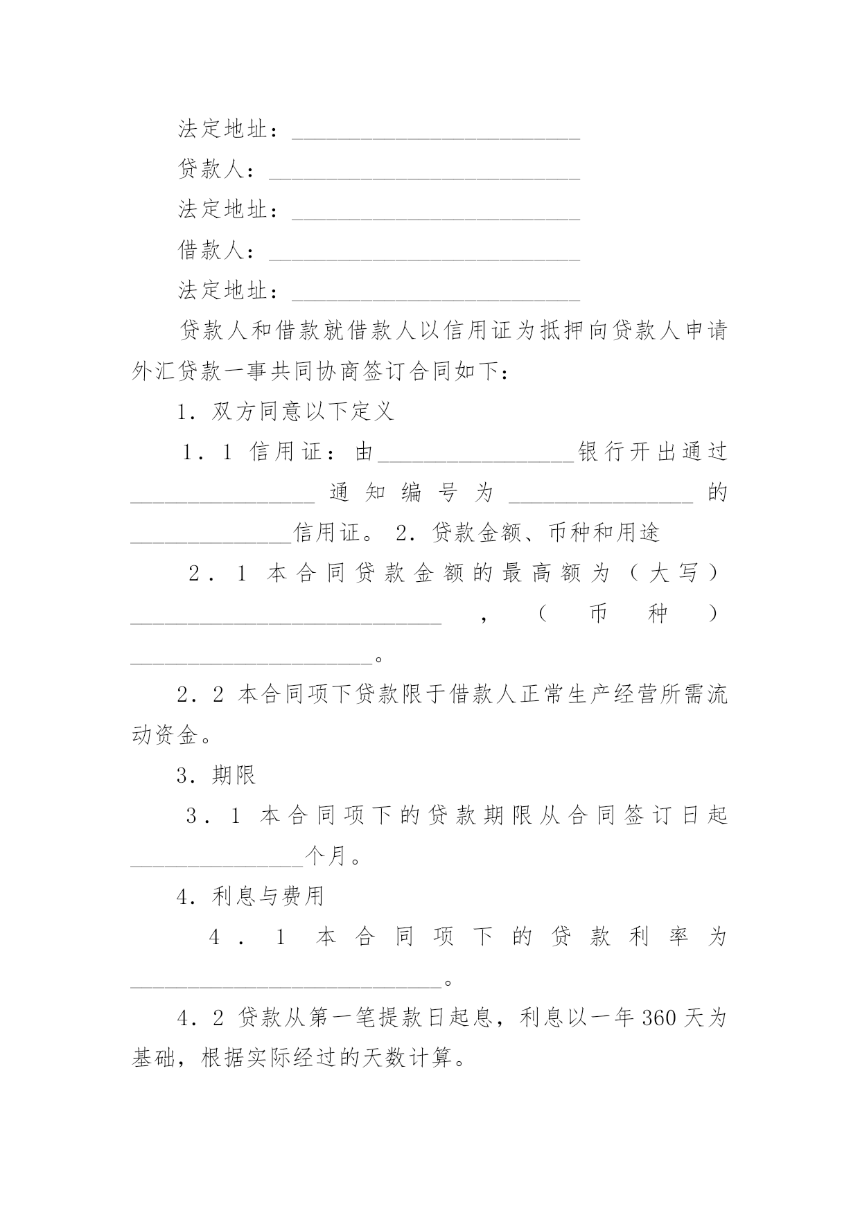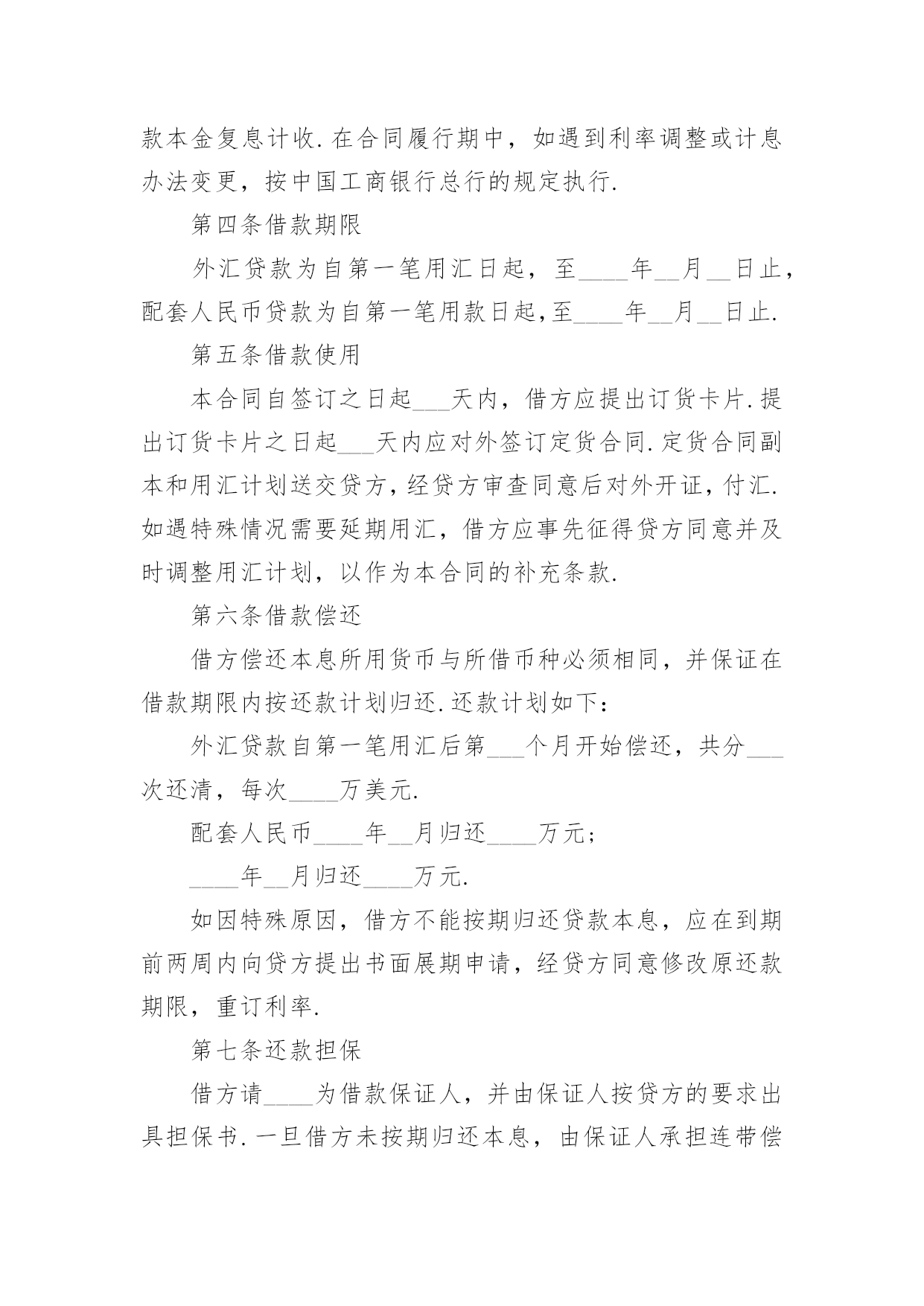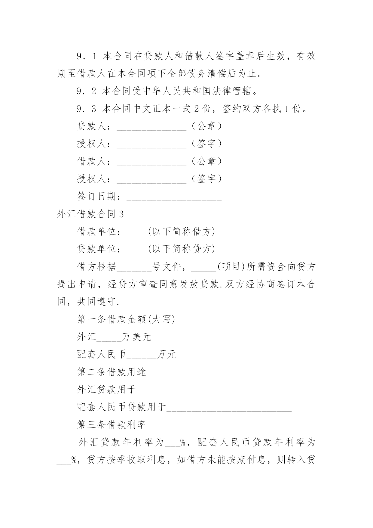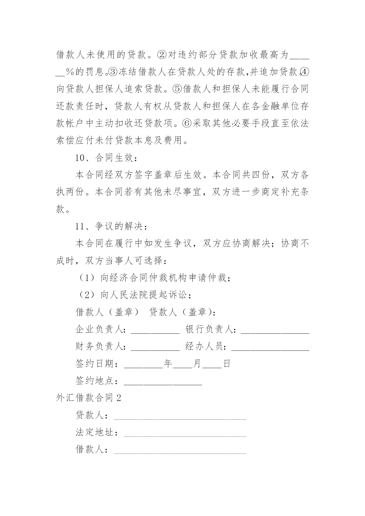 外汇借款合同【荐】外汇借款合同现今很多公民的维权意识在不断增强,合同起到的作用越来越大,正常情况下,签订合同必须经过规定的方式。那么一份详细的合同要怎么写呢?以下是小编精心整理的外汇借款合同,欢迎大家分享。外汇借款合同1合同编号:______借款人:_______贷款人:_______借款人因出口生产需要,向贷款人申请流动资金外汇贷款,经贷款人审查同意发放。双方为保证贷款的顺利实施,并维护各自的经济权益,特签订本合同如下:1、贷款金额:_____万美元,包括应付利息____万美元。2、贷款期限:____年,自第一笔用汇之日起至还清全部贷款本息日止。3、贷款利率及计收方法:(1)按贷款人总行制定的流动资金外汇贷款利率执行,贷款期内利率固定为借款人第一笔用汇之日总行公布的流动资金贷款利率水平。(2)按贷款人自营统筹资金贷款利率执行,贷款利息每___计收一次,结息日为_____。(复息或从存款帐户中扣收要写明)4、贷款用途:本贷款本金部分限于支付____费用,必须专款专用,未经贷款人同意,不得挪作他用。应付利息部分限于偿付本贷款到期利息,不得作其他支付。5、贷款使用:本合同签订之日起三个月内,借款人应提出订货卡片。提出订货卡片之日起五个月内应对外签订贸易合同。贸易合同副本需交贷款人,以便对外开证、付汇。如遇特殊情况需延期订货的,应事先经贷款人同意。借款人未按上述要求提出订货卡片和签订贸易合同的,贷款人有权撤销贷款。6、用款计划:根据支付进度,本项贷款提款计划为:__月____万美元;__月____万美元;__月____万美元。贷款人允许借款人按实际情况调整用款计划。提款期到期,未提用贷款,如借贷双方无其他约定,借款人不得再继续支用贷款。7、贷款偿还:借款人以新增出口创汇和人民币销售收入或其他资金归还贷款,借款人保证在本合同规定的贷款期限内按下列计划偿还贷款:__月____万美元;__月____万美元。如贷款项目提前实际经济效益,借款人应提前偿还贷款。如月度还款计划不能实现,借款人应事先提出调整还款计划,并经贷款人同意,否则贷款人将按贷款违约处理;如借款人不能按期还款,最迟在贷款到期前十五天应向贷款人提出书面展期申请,届时贷款人可按有关规定作出处理意见。逾期或贷款人不同意展期的贷款,自过期之日起,加收____的罚息。为有利于还款,借款人应在贷款人处开立还款准备金帐户,将用于还款的人民币资金先予存入,待外汇额度落实后再结汇偿还贷款。8、还款担保:本合同项下的贷款本息由_____作为借款人的担保人,并由担保人向贷款人出具担保函,作为本合同不可分割的组成部分。一旦借款人不能按期偿还贷款本息,经贷款人发出书面通知,由担保单位承担还本付息责任。本贷款项下有关进出口结算业务,应通过中国银行进出口业务部叙做。9、违约和违约处理。(1)下列情况均属借款人违约:①借款人未能按合同计划用款和还本付息。②未经贷款人同意改变贷款用途或挪作他用。③未经贷款人同意借款人私自转卖用贷款购置的物品。④借款人违反本合同其他条款事项。(2)根据违约情况,贷款人有权采取下列措施:①注销借款人未使用的贷款。②对违约部分贷款加收最高为___%的罚息。③冻结借款人在贷款人处的存款,并追加贷款。④向贷款人担保人追索贷款。⑤借款人和担保人未能履行合同还款责任时,贷款人有权从贷款人和担保人在各金融单位存款帐户中主动扣收还贷款项。⑥采取其他必要手段直至依法索偿应付未付贷款本息及费用。10、合同生效:本合同经双方签字盖章后生效。本合同共四份,双方各执两份。本合同若有其他未尽事宜,双方进一步商定补充条款。11、争议的解决:本合同在履行中如发生争议,双方应协商解决;协商不成时,双方当事人可选择:(1)向经济合同仲裁机构申请仲裁;(2)向人民法院提起诉讼;借款人(盖章)贷款人(盖章):企业负责人:_____银行负责人:_______财务负责人:_____经办人员:________签约日期:____年__月__日签约地点:________外汇借款合同2贷款人:___________________________法定地址:_________________________借款人:___________________________法定地址:_________________________贷款人:___________________________法定地址:_________________________借款人:___________________________法定地址:_________________________贷款人和借款就借款人以信用证为抵押向贷款人申请外汇贷款一事共同协商签订合同如下:1.双方同意以下定义1.1信用证:由_________________银行开出通过_