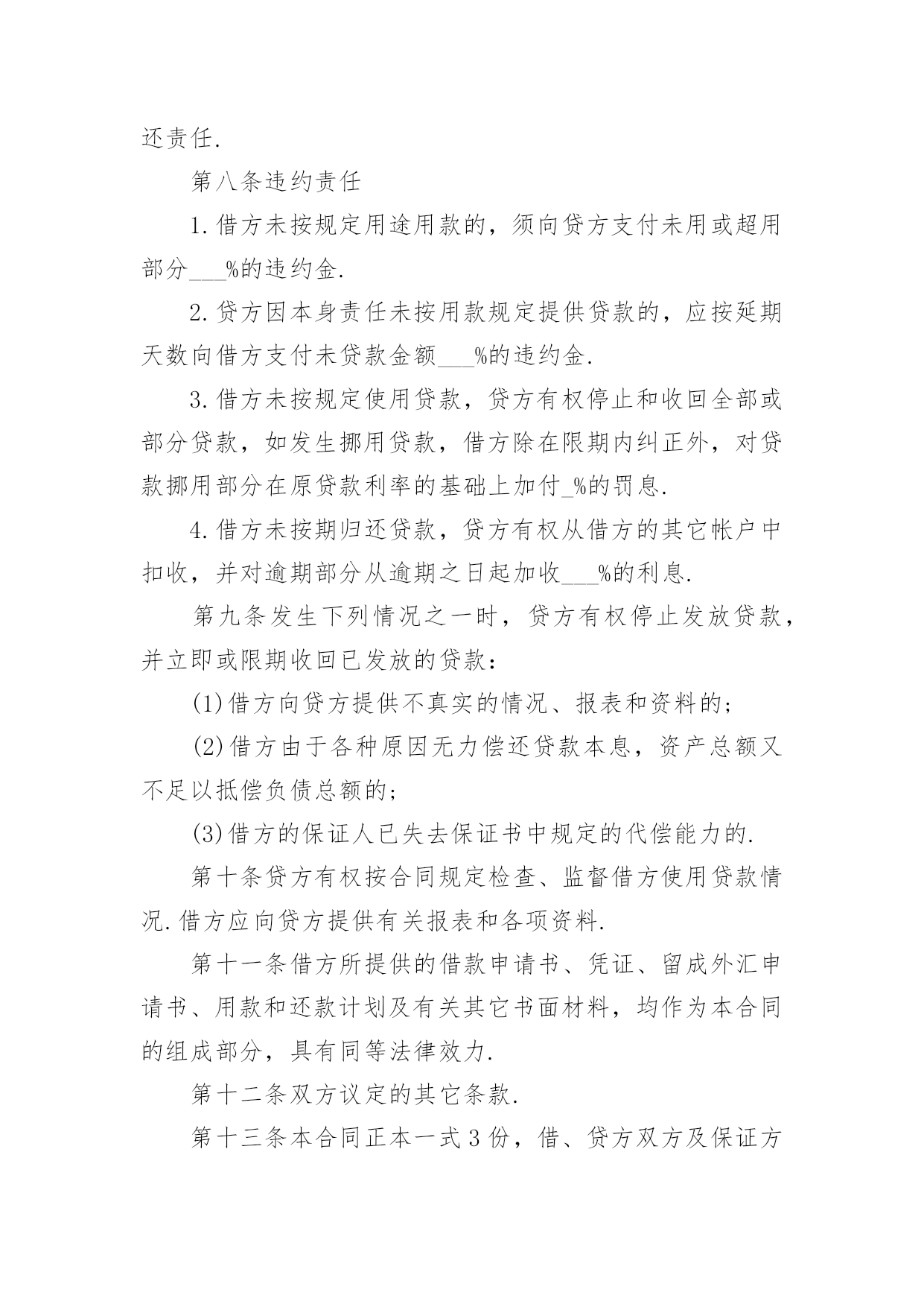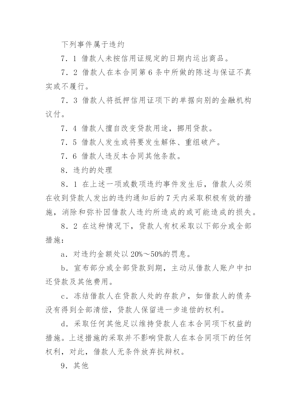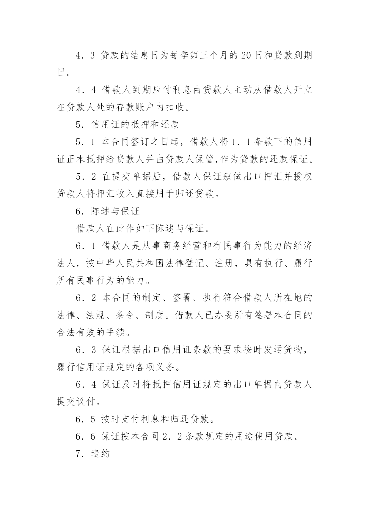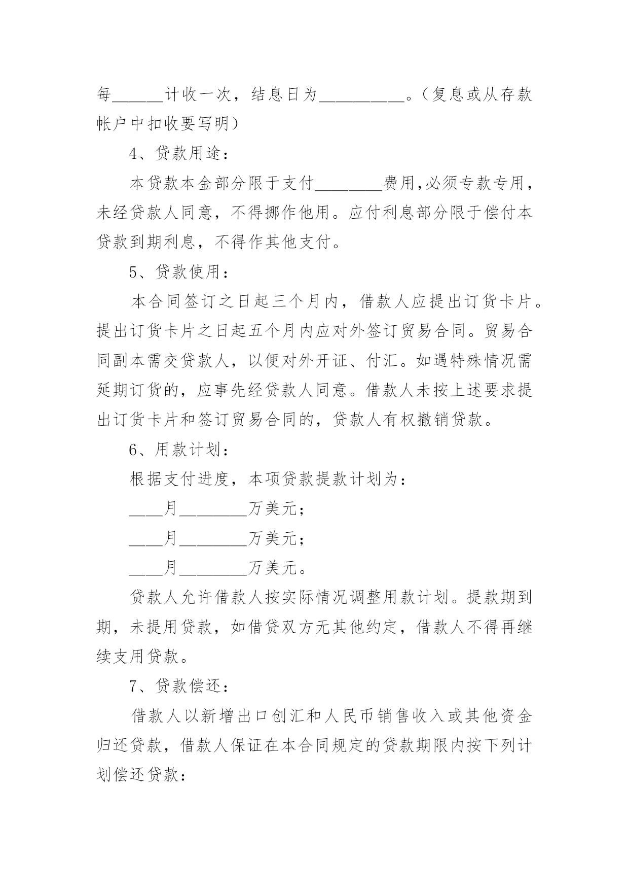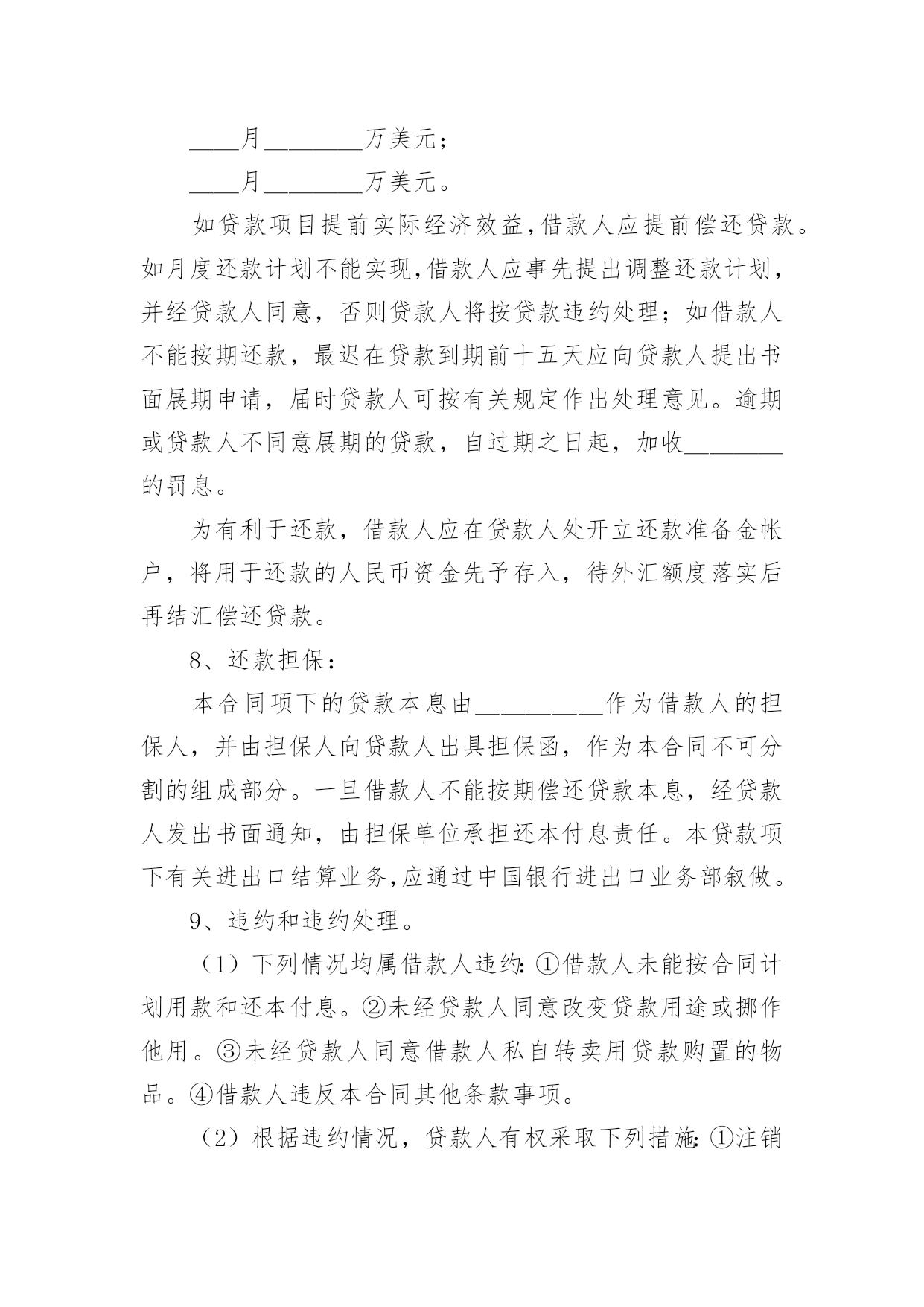 外汇借款合同【荐】外汇借款合同现今很多公民的维权意识在不断增强,合同起到的作用越来越大,正常情况下,签订合同必须经过规定的方式。那么一份详细的合同要怎么写呢?以下是小编精心整理的外汇借款合同,欢迎大家分享。外汇借款合同1合同编号:______借款人:_______贷款人:_______借款人因出口生产需要,向贷款人申请流动资金外汇贷款,经贷款人审查同意发放。双方为保证贷款的顺利实施,并维护各自的经济权益,特签订本合同如下:1、贷款金额:_____万美元,包括应付利息____万美元。2、贷款期限:____年,自第一笔用汇之日起至还清全部贷款本息日止。3、贷款利率及计收方法:(1)按贷款人总行制定的流动资金外汇贷款利率执行,贷款期内利率固定为借款人第一笔用汇之日总行公布的流动资金贷款利率水平。(2)按贷款人自营统筹资金贷款利率执行,贷款利息每___计收一次,结息日为_____。(复息或从存款帐户中扣收要写明)4、贷款用途:本贷款本金部分限于支付____费用,必须专款专用,未经贷款人同意,不得挪作他用。应付利息部分限于偿付本贷款到期利息,不得作其他支付。5、贷款使用:本合同签订之日起三个月内,借款人应提出订货卡片。提出订货卡片之日起五个月内应对外签订贸易合同。贸易合同副本需交贷款人,以便对外开证、付汇。如遇特殊情况需延期订货的,应事先经贷款人同意。借款人未按上述要求提出订货卡片和签订贸易合同的,贷款人有权撤销贷款。6、用款计划:根据支付进度,本项贷款提款计划为:__月____万美元;__月____万美元;__月____万美元。贷款人允许借款人按实际情况调整用款计划。提款期到期,未提用贷款,如借贷双方无其他约定,借款人不得再继续支用贷款。7、贷款偿还:借款人以新增出口创汇和人民币销售收入或其他资金归还贷款,借款人保证在本合同规定的贷款期限内按下列计划偿还贷款:__月____万美元;__月____万美元。如贷款项目提前实际经济效益,借款人应提前偿还贷款。如月度还款计划不能实现,借款人应事先提出调整还款计划,并经贷款人同意,否则贷款人将按贷款违约处理;如借款人不能按期还款,最迟在贷款到期前十五天应向贷款人提出书面展期申请,届时贷款人可按有关规定作出处理意见。逾期或贷款人不同意展期的贷款,自过期之日起,加收____的罚息。为有利于还款,借款人应在贷款人处开立还款准备金帐户,将用于还款的人民币资金先予存入,待外汇额度落实后再结汇偿还贷款。8、还款担保:本合同项下的贷款本息由_____作为借款人的担保人,并由担保人向贷款人出具担保函,作为本合同不可分割的组成部分。一旦借款人不能按期偿还贷款本息,经贷款人发出书面通知,由担保单位承担还本付息责任。本贷款项下有关进出口结算业务,应通过中国银行进出口业务部叙做。9、违约和违约处理。(1)下列情况均属借款人违约:①借款人未能按合同计划用款和还本付息。②未经贷款人同意改变贷款用途或挪作他用。③未经贷款人同意借款人私自转卖用贷款购置的物品。④借款人违反本合同其他条款事项。(2)根据违约情况,贷款人有权采取下列措施:①注销借款人未使用的贷款。②对违约部分贷款加收最高为___%的罚息。③冻结借款人在贷款人处的存款,并追加贷款。④向贷款人担保人追索贷款。⑤借款人和担保人未能履行合同还款责任时,贷款人有权从贷款人和担保人在各金融单位存款帐户中主动扣收还贷款项。⑥采取其他必要手段直至依法索偿应付未付贷款本息及费用。10、合同生效:本合同经双方签字盖章后生效。本合同共四份,双方各执两份。本合同若有其他未尽事宜,双方进一步商定补充条款。11、争议的解决:本合同在履行中如发生争议,双方应协商解决;协商不成时,双方当事人可选择:(1)向经济合同仲裁机构申请仲裁;(2)向人民法院提起诉讼;借款人(盖章)贷款人(盖章):企业负责人:_____银行负责人:_______财务负责人:_____经办人员:________签约日期:____年__月__日签约地点:________外汇借款合同2贷款人:___________________________法定地址:_________________________借款人:___________________________法定地址:_________________________贷款人:___________________________法定地址:_________________________借款人:___________________________法定地址:_________________________贷款人和借款就借款人以信用证为抵押向贷款人申请外汇贷款一事共同协商签订合同如下:1.双方同意以下定义1.1信用证:由_________________银行开出通过_