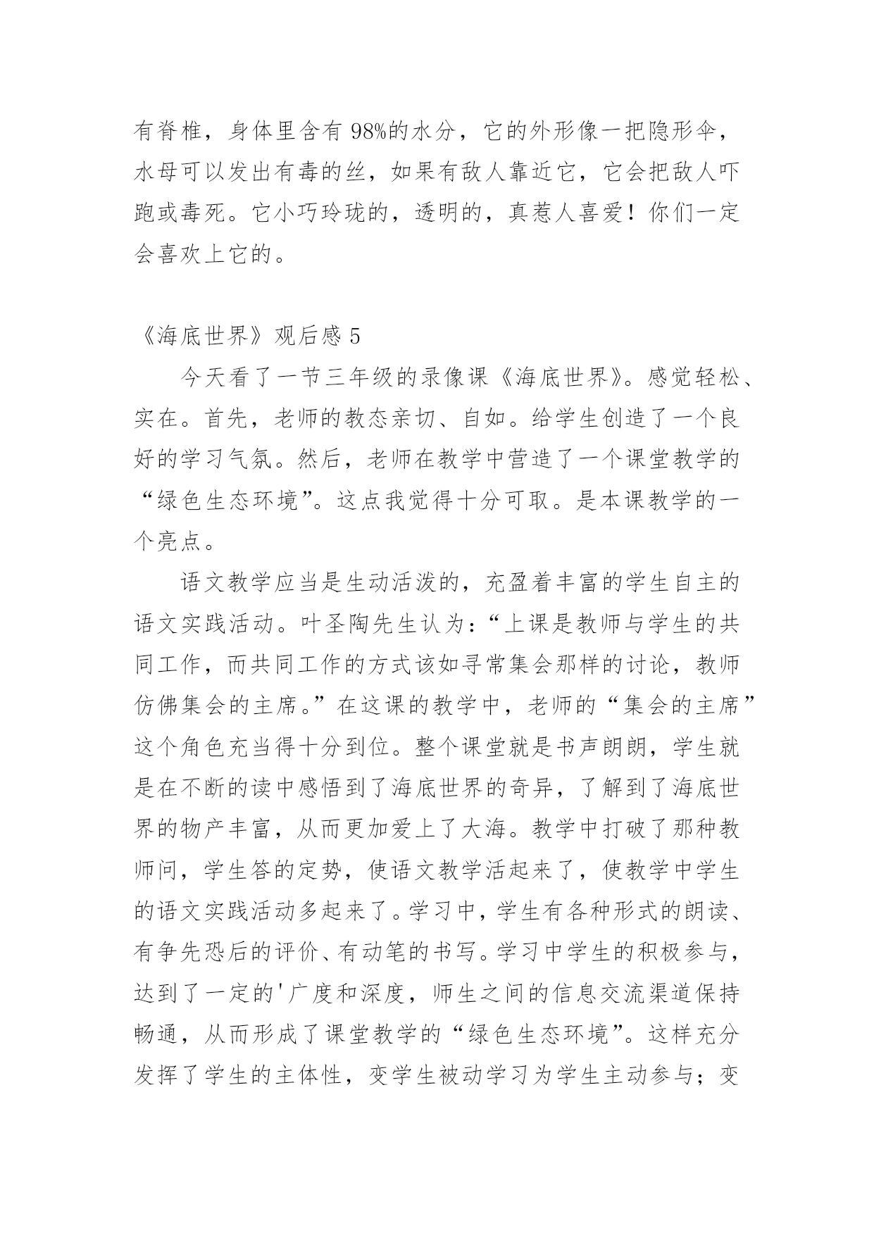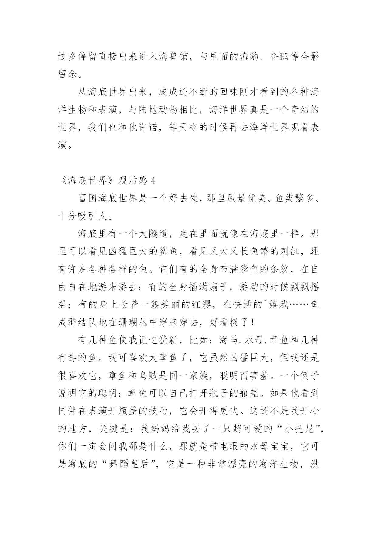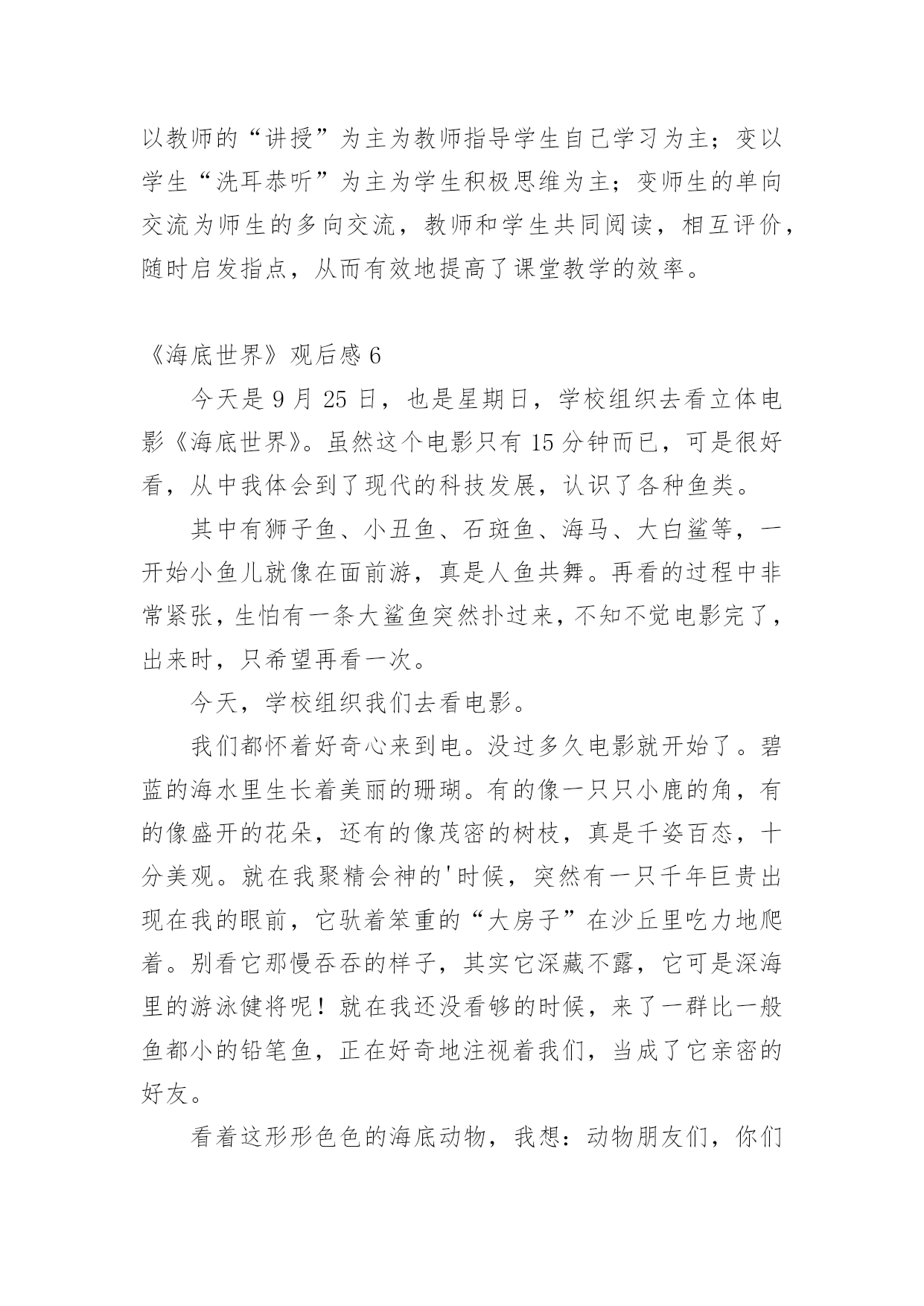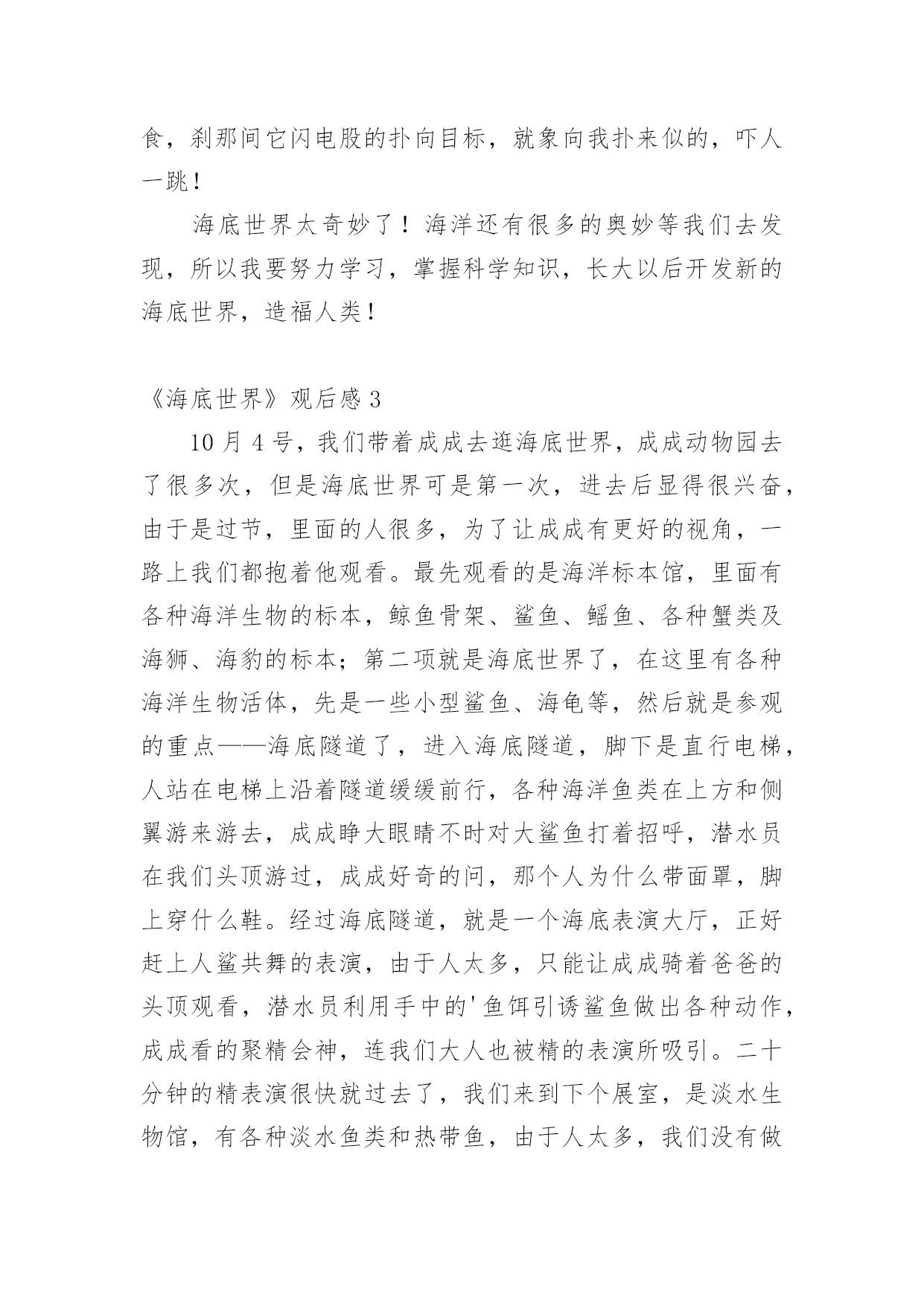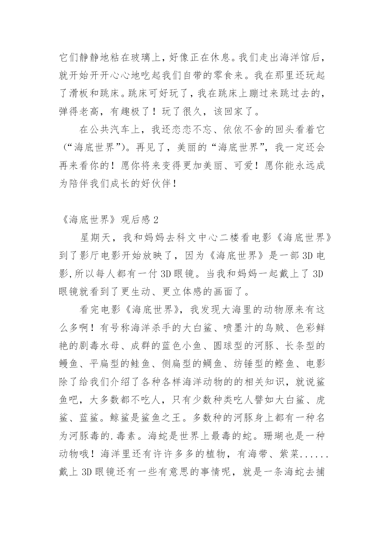 《海底世界》观后感当看完一部影视作品后,一定有不少感悟吧,为此就要认真思考观后感如何写了。千万不能认为观后感随便应付就可以,以下是小编精心整理的《海底世界》观后感,希望能够帮助到大家。《海底世界》观后感120xx年11月18日,我们去参观了海底世界。一进大门,我就看见几只海豚在“水中”快活地游来游去,好不逍遥自在。在海豚前方,我还看到了一条美人鱼,中间还放着一个球,球的旁边有几条海豚正围着它喷水,球被冲洗得纯净无瑕。之后,我们又走进了海洋馆。里面的小鱼都是五颜六色的,大都长约2厘米。那小鲨鱼,牙齿大概有几百颗,且无比地尖锐吓人。电鳗,象蛇一样,身体长长的`,且浑身带电。如果有生物想要攻击它,则会被它身体所带的强大电流击倒。另外,我们还看到了背上顶着厚厚的硬壳、身体笨重的大海龟在“海”里缓慢的游来游去。这时,潜水员背着氧气罐,手拿装着鱼食的袋子潜到“海底”准备给鱼儿们喂食。快来看呀,鱼儿全部都被吸引到那儿去吃食了。我们站在“玻璃屏障”外还看见了长约150米、宽约35米的大白鲨朝我们凶猛地扑过来,我们虽然隔着“玻璃屏障”在外观看,但也差点被它那架势吓得屁滚尿流。另外,我还看到了七只五角海星,它们静静地粘在玻璃上,好像正在休息。我们走出海洋馆后,就开始开开心心地吃起我们自带的零食来。我在那里还玩起了滑板和跳床。跳床可好玩了,我在跳床上蹦过来跳过去的,弹得老高,有趣极了!玩了很久,该回家了。在公共汽车上,我还恋恋不忘、依依不舍的回头看着它(“海底世界”)。再见了,美丽的“海底世界”,我一定还会再来看你的!愿你将来变得更加美丽、可爱!愿你能永远成为陪伴我们成长的好伙伴!《海底世界》观后感2星期天,我和妈妈去科文中心二楼看电影《海底世界》到了影厅电影开始放映了,因为《海底世界》是一部3D电影,所以每人都有一付3D眼镜。当我和妈妈一起戴上了3D眼镜就看到了更生动、更立体感的画面了。看完电影《海底世界》,我发现大海里的动物原来有这么多啊!有号称海洋杀手的大白鲨、喷墨汁的鸟贼、色彩鲜艳的剧毒水母、成群的蓝色小鱼、圆球型的河豚、长条型的鳗鱼、平扁型的鲑鱼、侧扁型的鲷鱼、纺锤型的鲣鱼、电影除了给我们介绍了各种各样海洋动物的的相关知识,就说鲨鱼吧,大多数都不吃人,只有少数种类吃人譬如大白鲨、虎鲨、蓝鲨。鲸鲨是鲨鱼之王。多数种的河豚身上都有一种名为河豚毒的.毒素。海蛇是世界上最毒的蛇。珊瑚也是一种动物哦!海洋里还有许许多多的植物,有海带、紫菜......戴上3D眼镜还有一些有意思的事情呢,就是一条海蛇去捕食,刹那间它闪电股的扑向目标,就象向我扑来似的,吓人一跳!海底世界太奇妙了!海洋还有很多的奥妙等我们去发现,所以我要努力学习,掌握科学知识,长大以后开发新的海底世界,造福人类!《海底世界》观后感310月4号,我们带着成成去逛海底世界,成成动物园去了很多次,但是海底世界可是第一次,进去后显得很兴奋,由于是过节,里面的人很多,为了让成成有更好的视角,一路上我们都抱着他观看。最先观看的是海洋标本馆,里面有各种海洋生物的标本,鲸鱼骨架、鲨鱼、鳐鱼、各种蟹类及海狮、海豹的标本;第二项就是海底世界了,在这里有各种海洋生物活体,先是一些小型鲨鱼、海龟等,然后就是参观的重点——海底隧道了,进入海底隧道,脚下是直行电梯,人站在电梯上沿着隧道缓缓前行,各种海洋鱼类在上方和侧翼游来游去,成成睁大眼睛不时对大鲨鱼打着招呼,潜水员在我们头顶游过,成成好奇的问,那个人为什么带面罩,脚上穿什么鞋。经过海底隧道,就是一个海底表演大厅,正好赶上人鲨共舞的表演,由于人太多,只能让成成骑着爸爸的头顶观看,潜水员利用手中的'鱼饵引诱鲨鱼做出各种动作,成成看的聚精会神,连我们大人也被精的表演所吸引。二十分钟的精表演很快就过去了,我们来到下个展室,是淡水生物馆,有各种淡水鱼类和热带鱼,由于人太多,我们没有做过多停留直接出来进入海兽馆,与里面的海豹、企鹅等合影留念。从海底世界出来,成成还不断的回味刚才看到的各种海洋生物和表演,与陆地动物相比,海洋世界真是一个奇幻的世界,我们也和他许诺,等天冷的时候再去海洋世界观看表演。《海底世界》观后感4富国海底世界是一个好去处,那里风景优美。鱼类繁多。十分吸引人。海底里有一个大隧道,走在里面就像在海底里一样。那里可以看见凶猛巨大的鲨鱼,看见又大又长鱼鳍的刺缸,还有许多各种各样的鱼。它们有的全身布满彩色的条纹,在自由自在地游来游去;有的全身插满扇子,游动的时候飘飘摇摇;有的身上长着一簇美丽的红缨,在快活的`嬉戏……鱼成群结队地在珊瑚丛中穿来穿去,好看极了!有几种鱼使我记忆犹新,比如:海马.水母.章鱼和几种有毒的鱼。我可喜欢大章鱼了,它虽然凶猛巨大,但我还是很喜欢它,章鱼和乌贼是同一家族,聪明而害羞。一个例子说明它的聪明:章鱼可以自己打开瓶子的瓶盖。如果他看到同