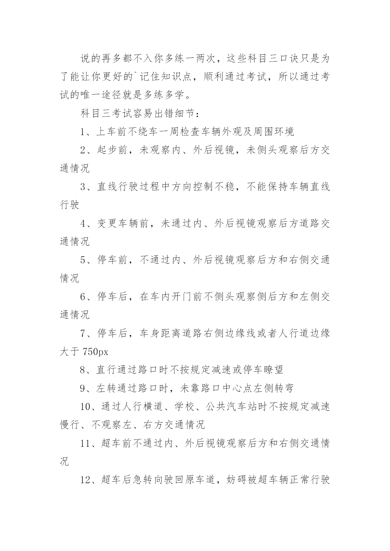 科目三的考试口诀秘籍科目三的考试口诀秘籍科目三考试口诀秘籍:驾车座椅要调好,操作舒畅又轻松;稳搓油门、轻快刹车、稳抬离合;离合抬起需讲究,脚臂上抬快又稳;快抬触点要稳住,接合平稳才松开;原地调头挂1档,离合松压调快慢;双手平把方向盘,左手稍稍放上点;双手轻扶方向盘、左压右按改方向;向左转向右手主,左手只作辅助用;向右转向左手推,右手辅助把忙帮;左右拇指朝向前,恰似左右两前轮;以人为中心,左边60左前轮,右边80右轮心;视线最近地横线、距离车头约2米;驾座距离车头约2米、右脸感觉是车中;车辆外宽1米7,加上倒车镜2米2;拐弯视点稍上移,避免后轮过线沟;路宽路直视线远,路窄方向提前调;离合档位手脚配,脚重手轻次序清;转速高于800转,刹车不需踩离合;转速低于800转,踩下离合不熄火说的再多都不入你多练一两次,这些科目三口诀只是为了能让你更好的`记住知识点,顺利通过考试,所以通过考试的唯一途径就是多练多学。科目三考试容易出错细节:1、上车前不绕车一周检查车辆外观及周围环境2、起步前,未观察内、外后视镜,未侧头观察后方交通情况3、直线行驶过程中方向控制不稳,不能保持车辆直线行驶4、变更车辆前,未通过内、外后视镜观察后方道路交通情况5、停车前,不通过内、外后视镜观察后方和右侧交通情况6、停车后,在车内开门前不侧头观察侧后方和左侧交通情况7、停车后,车身距离道路右侧边缘线或者人行道边缘大于750px8、直行通过路口时不按规定减速或停车瞭望9、左转通过路口时,未靠路口中心点左侧转弯10、通过人行横道、学校、公共汽车站时不按规定减速慢行、不观察左、右方交通情况11、超车前不通过内、外后视镜观察后方和右侧交通情况12、超车后急转向驶回原车道,妨碍被超车辆正常行驶13、掉头前未发出掉头信号14、夜间行驶不能正确开启灯光15、夜间通过急弯、坡路、拱桥、人行横道或者没有交通信号灯控制的路口时,不交替使用远近光灯示意16、夜间在有路灯、照明良好的道路上行驶时,使用远光灯对于科目三考试技巧口诀,大家除了要熟读之外还要充分运用到实际操作中去,这样子才能让大家更好的掌握考试技巧。