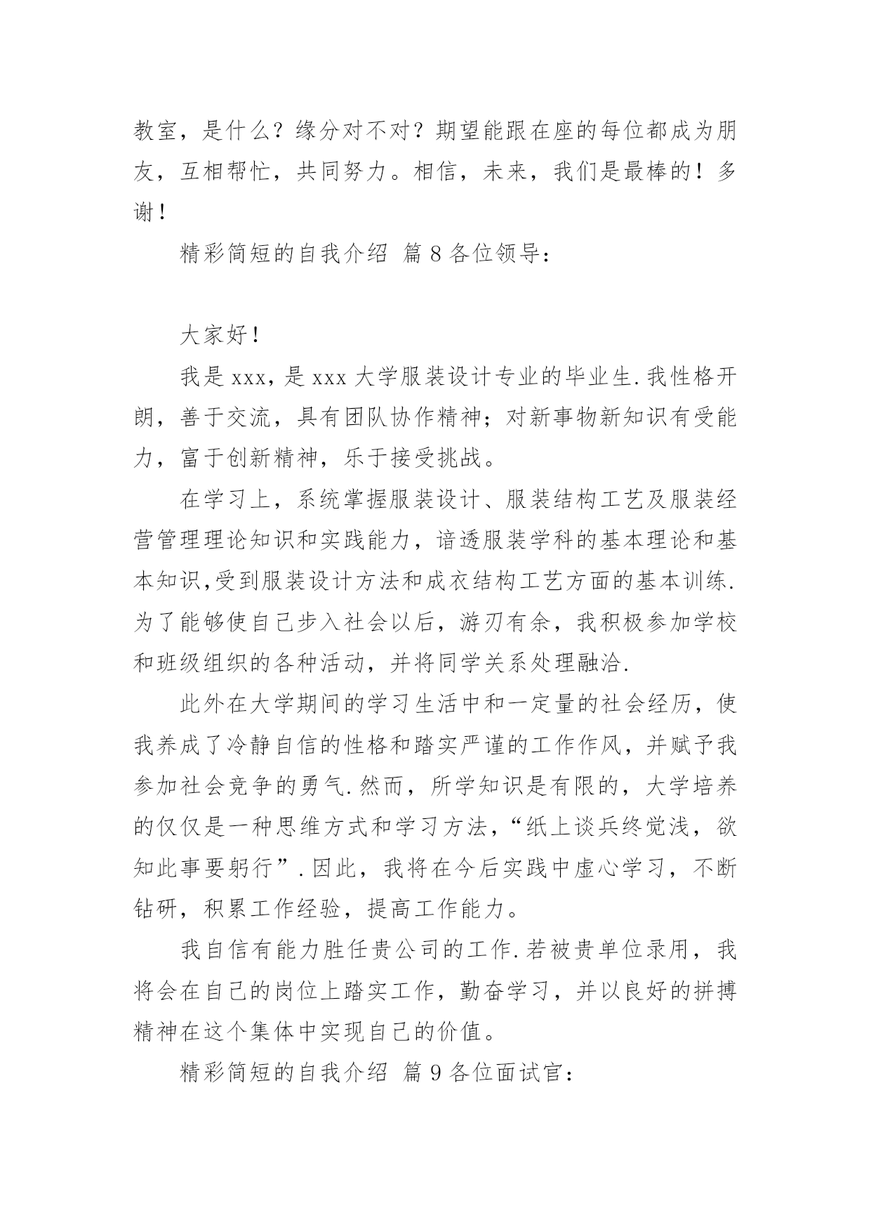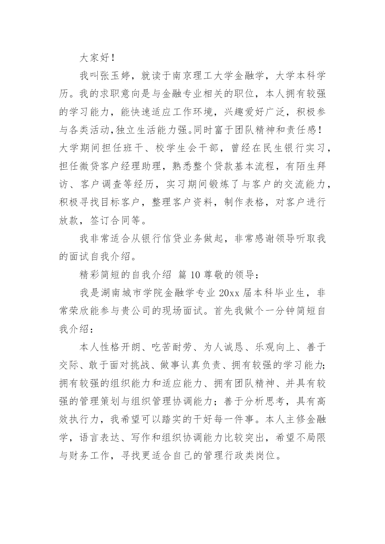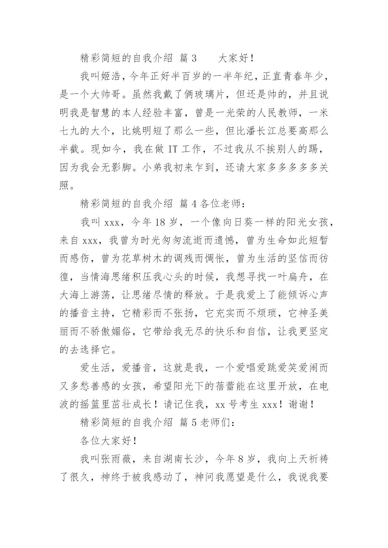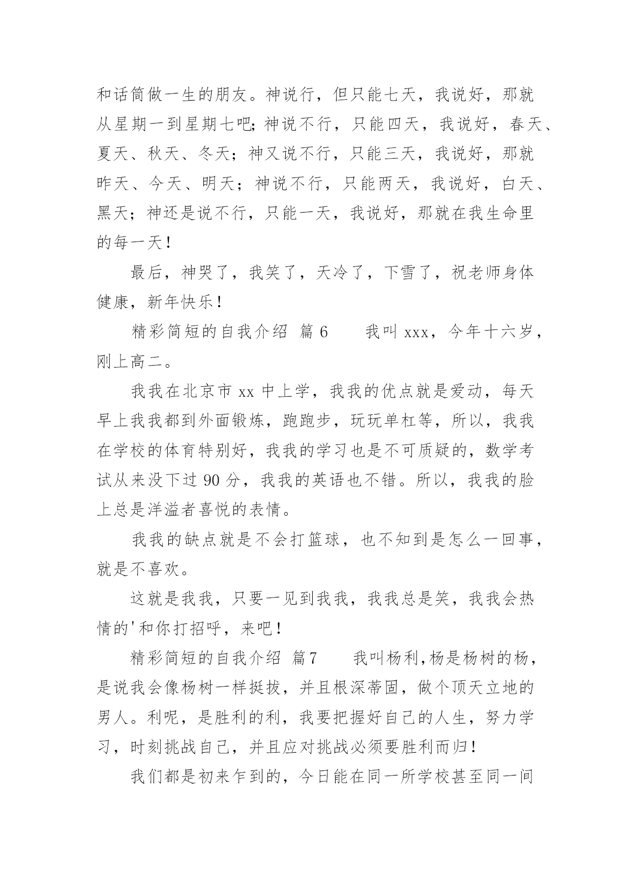 精彩简短的自我介绍精彩简短的自我介绍(精选10篇)当来到一个陌生环境中,通常需要用到自我介绍,自我介绍是一种认识自我的手段。如何编写一段个性的自我介绍?下面是小编整理的精彩简短的自我介绍,仅供参考,希望能够帮助到大家。精彩简短的自我介绍篇1大家好,我叫xx,是xx部门xx职位。是刚来的新伙伴。我比较乐观,开朗,希望在以后的工作中能多多指教(职位高就不要说的“多多指教”)合作愉快。谢谢大家。精彩简短的自我介绍篇2大家好,我叫张玮,在来到公司之前已经在社会工作了两年的时间。两年不长,但是也让我脱离了刚从校门的青涩与迷茫,使我对社会工作有了一定的了解与适应,同时也在原来的工作中逐渐丧失着年轻应拥有的热情与积极。原本还想从事老本行的我,决定换一个工作去学习,因为我觉得作为年轻人要肯挑战自己,敢于从事不同的行业。于是我来到了黄山高尔夫国际商务推广有限公司,为成为一名客服专员而来。虽然我对这个行业还比较陌生,但是我坚信天道酬勤,勤能补拙,只要在以后的工作中勤奋认真、不懈努力,我一定会适应并掌握此项工作,成为一名合格的客服专员,同黄山高尔夫球会一道发展,一起成长。精彩简短的自我介绍篇3大家好!我叫姬浩,今年正好半百岁的一半年纪,正直青春年少,是一个大帅哥。虽然我戴了俩玻璃片,但还是帅的,并且说明我是智慧的本人经验丰富,曾是一光荣的人民教师,一米七九的大个,比姚明短了那么一些,但比潘长江总要高那么半截。现如今,我在做IT工作,不过我从不挨别人的踢,因为我会无影脚。小弟我初来乍到,还请大家多多多多多关照。精彩简短的自我介绍篇4各位老师:我叫xxx,今年18岁,一个像向日葵一样的阳光女孩,来自xxx,我曾为时光匆匆流逝而遗憾,曾为生命如此短暂而感伤,曾为花草树木的调残而惆怅,曾为生活的坚信而彷徨,当情海思绪积压我心头的时候,我想寻找一叶扁舟,在大海上游荡,让思绪尽情的释放。于是我爱上了能倾诉心声的播音主持,它精彩而不张扬,它充实而不烦琐,它神圣美丽而不骄傲媚俗,它带给我无尽的快乐和自信,让我更坚定的去选择它。爱生活,爱播音,这就是我,一个爱唱爱跳爱笑爱闹而又多愁善感的女孩,希望阳光下的蓓蕾能在这里开放,在电波的摇篮里茁壮成长!请记住我,xx号考生xxx!谢谢!精彩简短的自我介绍篇5老师们:各位大家好!我叫张雨薇,来自湖南长沙,今年8岁,我向上天祈祷了很久,神终于被我感动了,神问我愿望是什么,我说我要和话筒做一生的朋友。神说行,但只能七天,我说好,那就从星期一到星期七吧;神说不行,只能四天,我说好,春天、夏天、秋天、冬天;神又说不行,只能三天,我说好,那就昨天、今天、明天;神说不行,只能两天,我说好,白天、黑天;神还是说不行,只能一天,我说好,那就在我生命里的每一天!最后,神哭了,我笑了,天冷了,下雪了,祝老师身体健康,新年快乐!精彩简短的自我介绍篇6我叫xxx,今年十六岁,刚上高二。我我在北京市xx中上学,我我的优点就是爱动,每天早上我我都到外面锻炼,跑跑步,玩玩单杠等,所以,我我在学校的体育特别好,我我的学习也是不可质疑的,数学考试从来没下过90分,我我的英语也不错。所以,我我的脸上总是洋溢者喜悦的表情。我我的缺点就是不会打篮球,也不知到是怎么一回事,就是不喜欢。这就是我我,只要一见到我我,我我总是笑,我我会热情的'和你打招呼,来吧!精彩简短的自我介绍篇7我叫杨利,杨是杨树的杨,是说我会像杨树一样挺拔,并且根深蒂固,做个顶天立地的男人。利呢,是胜利的利,我要把握好自己的人生,努力学习,时刻挑战自己,并且应对挑战必须要胜利而归!我们都是初来乍到的,今日能在同一所学校甚至同一间教室,是什么?缘分对不对?期望能跟在座的每位都成为朋友,互相帮忙,共同努力。相信,未来,我们是最棒的!多谢!精彩简短的自我介绍篇8各位领导:大家好!我是xxx,是xxx大学服装设计专业的毕业生.我性格开朗,善于交流,具有团队协作精神;对新事物新知识有受能力,富于创新精神,乐于接受挑战。在学习上,系统掌握服装设计、服装结构工艺及服装经营管理理论知识和实践能力,谙透服装学科的基本理论和基本知识,受到服装设计方法和成衣结构工艺方面的基本训练.为了能够使自己步入社会以后,游刃有余,我积极参加学校和班级组织的各种活动,并将同学关系处理融洽.此外在大学期间的学习生活中和一定量的社会经历,使我养成了冷静自信的性格和踏实严谨的工作作风,并赋予我参加社会竞争的勇气.然而,所学知识是有限的,大学培养的仅仅是一种思维方式和学习方法,“纸上谈兵终觉浅,欲知此事要躬行”.因此,我将在今后实践中虚心学习,不断钻研,积累工作经验,提高工作能力。我自信有能力胜任贵公司的工作.若被贵单位录用,我将会在自己的岗位上踏实工作,勤奋学习,并以良好的拼搏精神在这个集体中实现自己的价值。精彩简短的自我介绍篇9各位面
