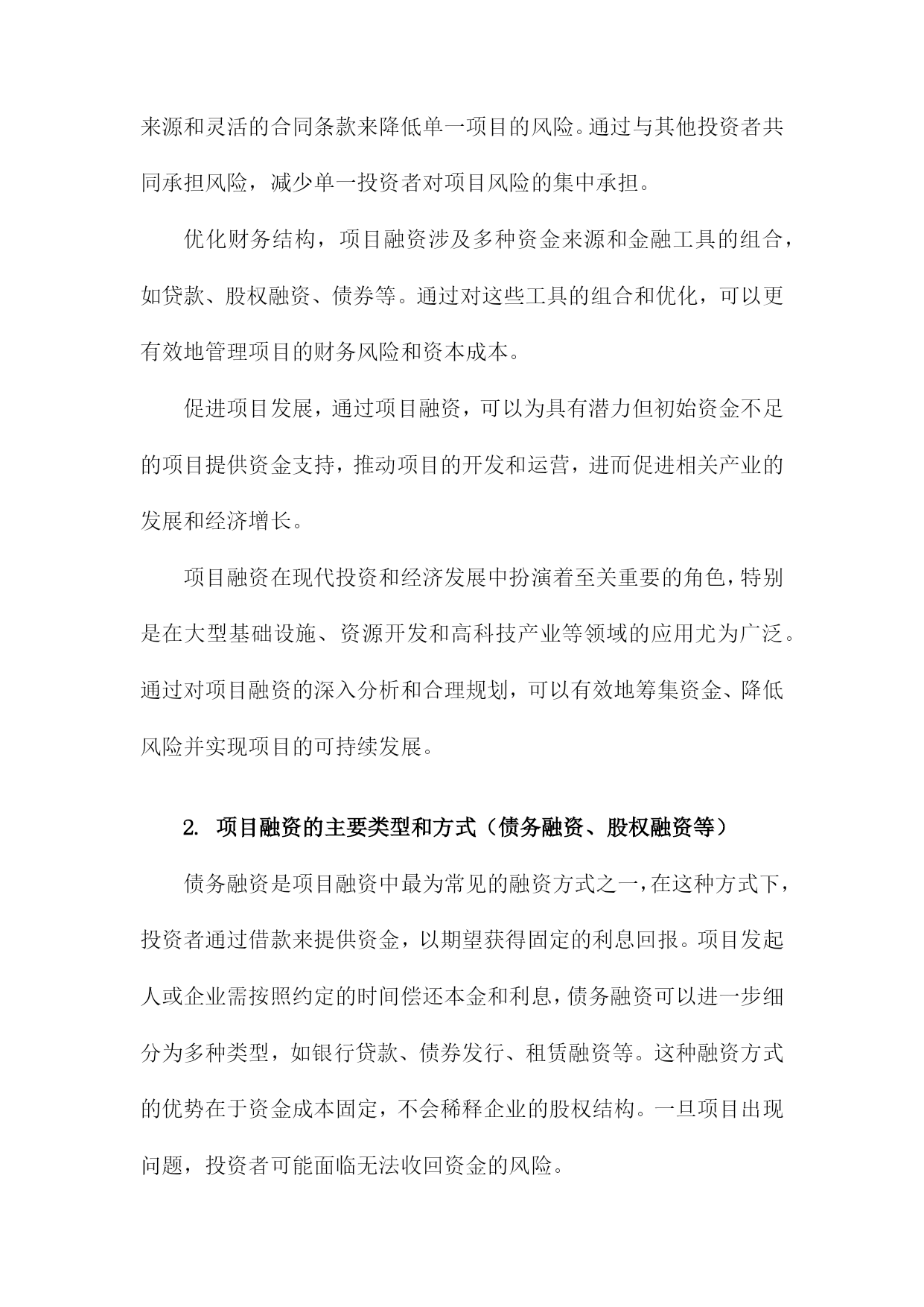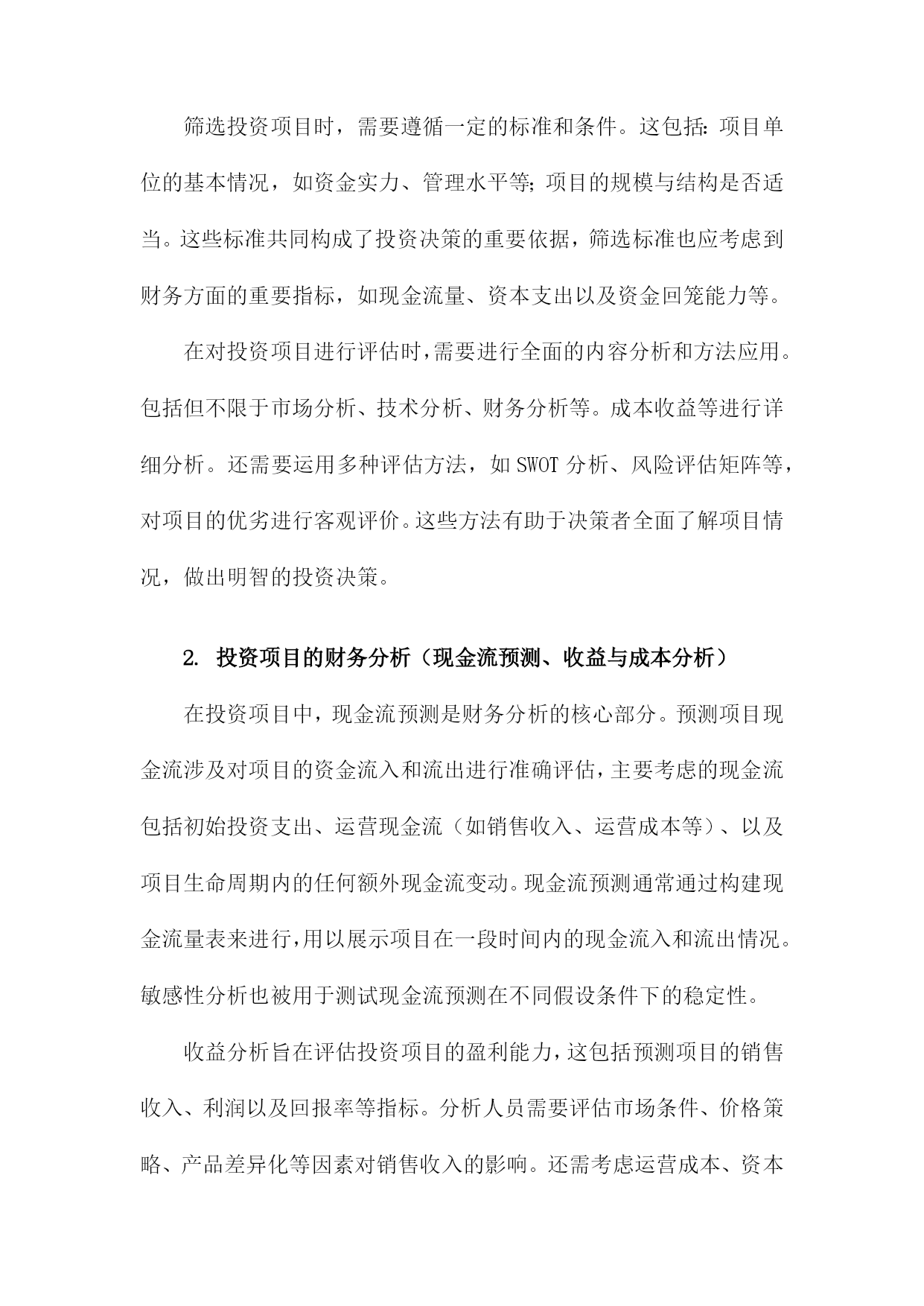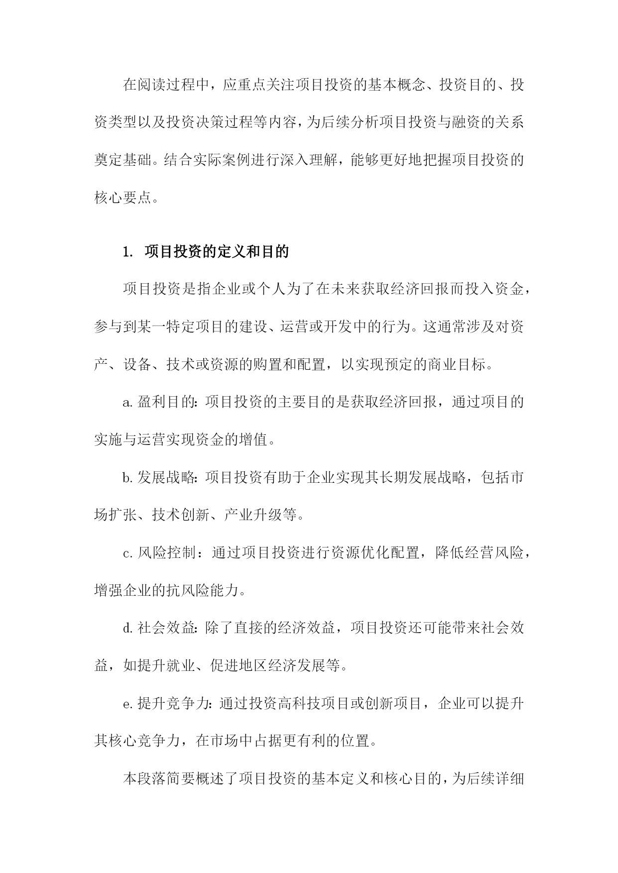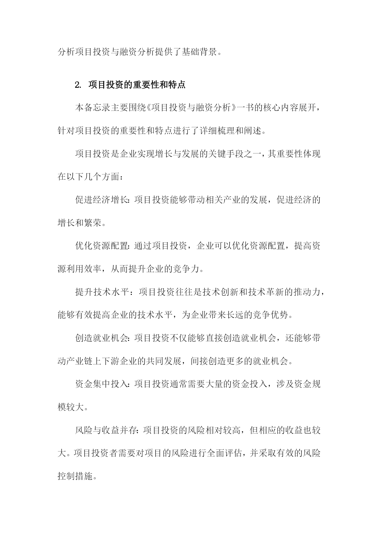 《项目投资与融资分析》阅读备忘录一、项目投资概述在阅读《项目投资与融资分析》对于项目投资的整体理解是首要了解的内容。简而言之,是指企业或个人为了在未来获得经济效益而投入资金进行特定项目的行为。此处的项目可以是实体建设项目,如房地产、制造业工厂等,也可以是无形资产的投入,如技术研发项目、软件开发项目等。项目投资是企业扩大规模、增强竞争力的重要手段之一。项目投资的目的和重要性:项目投资是企业实现长期发展战略的重要手段,通过投资可以实现企业规模的扩大、市场份额的提升以及技术水平的提升等。项目投资类型:根据投资项目的性质,可分为实体投资项目与无形资产投资项目。实体投资项目主要涉及基础设施建设、房地产等;无形资产投资项目则包括技术研发、品牌塑造等。投资决策过程:涉及项目的筛选、评估、决策等多个环节,这一过程需要对项目的市场前景、盈利能力、风险状况等进行全面分析。项目投资与企业战略:项目投资需与企业长期发展战略相结合,确保投资方向与企业的战略目标相一致。在阅读过程中,应重点关注项目投资的基本概念、投资目的、投资类型以及投资决策过程等内容,为后续分析项目投资与融资的关系奠定基础。结合实际案例进行深入理解,能够更好地把握项目投资的核心要点。1.项目投资的定义和目的项目投资是指企业或个人为了在未来获取经济回报而投入资金,参与到某一特定项目的建设、运营或开发中的行为。这通常涉及对资产、设备、技术或资源的购置和配置,以实现预定的商业目标。a.盈利目的:项目投资的主要目的是获取经济回报,通过项目的实施与运营实现资金的增值。b.发展战略:项目投资有助于企业实现其长期发展战略,包括市场扩张、技术创新、产业升级等。c.风险控制:通过项目投资进行资源优化配置,降低经营风险,增强企业的抗风险能力。d.社会效益:除了直接的经济效益,项目投资还可能带来社会效益,如提升就业、促进地区经济发展等。e.提升竞争力:通过投资高科技项目或创新项目,企业可以提升其核心竞争力,在市场中占据更有利的位置。本段落简要概述了项目投资的基本定义和核心目的,为后续详细分析项目投资与融资分析提供了基础背景。2.项目投资的重要性和特点本备忘录主要围绕《项目投资与融资分析》一书的核心内容展开,针对项目投资的重要性和特点进行了详细梳理和阐述。项目投资是企业实现增长与发展的关键手段之一,其重要性体现在以下几个方面:促进经济增长:项目投资能够带动相关产业的发展,促进经济的增长和繁荣。优化资源配置:通过项目投资,企业可以优化资源配置,提高资源利用效率,从而提升企业的竞争力。提升技术水平:项目投资往往是技术创新和技术革新的推动力,能够有效提高企业的技术水平,为企业带来长远的竞争优势。创造就业机会:项目投资不仅能够直接创造就业机会,还能够带动产业链上下游企业的共同发展,间接创造更多的就业机会。资金集中投入:项目投资通常需要大量的资金投入,涉及资金规模较大。风险与收益并存:项目投资的风险相对较高,但相应的收益也较大。项目投资者需要对项目的风险进行全面评估,并采取有效的风险控制措施。长期性投资:项目投资往往具有长期性,投资者需要充分考虑项目的生命周期和投资回报周期。多元化投资主体:项目投资涉及多个投资主体,包括政府、企业、金融机构等,需要协调各方利益,确保项目的顺利进行。投资决策的复杂性:项目投资涉及的因素众多,投资决策需要考虑市场环境、政策因素、技术条件等多方面因素,决策过程较为复杂。二、项目融资基本概念与分类项目融资是一种为特定项目而开展的金融活动,主要依赖于项目本身的资产、未来的收益和现金流来安排融资,并以项目产生的收入作为偿还贷款的来源。它强调的是以项目的可行性及未来收益作为筹资的主要基础,对投资者而言,是评估项目经济效益和风险的重要手段。与传统的公司融资相比,项目融资更侧重于项目本身的细节分析和风险评估。直接投资融资:投资者直接对项目进行投资,获得项目的部分或全部所有权。间接投资融资:投资者通过购买债券或股票对项目进行投资,不直接参与项目管理,而是通过收益权获取回报。内部融资:利用项目自身的现金流或预留收益来支持项目的发展。这种方式风险相对较小,但可能受限于项目自身的资金规模。外部融资:通过外部投资者或金融机构筹集资金。这包括债券发行、银行贷款、股权融资等,资金来源广泛,但可能需要承担额外的利息负担和还款压力。政府资助或补贴融资:政府为支持特定行业或项目发展提供的资金支持。这种融资通常与一定的政策目标相关联,并可能包含特定的条件或要求。不同行业的项目融资具有不同的特点和要求,如基础设施项目融资、能源项目融资、交通运输项目融资等。每个行业都有其特定的市场结构、技术要求和风险评估标准。在进行项目融资时,需要根据项目的具体行业背景进行分