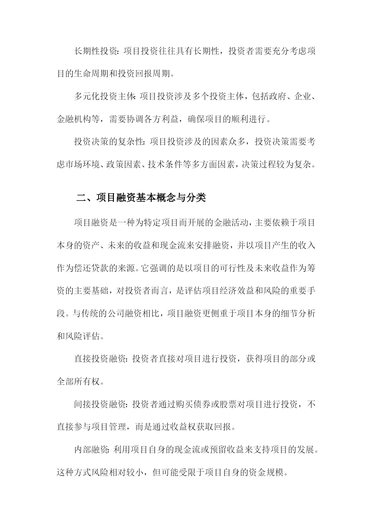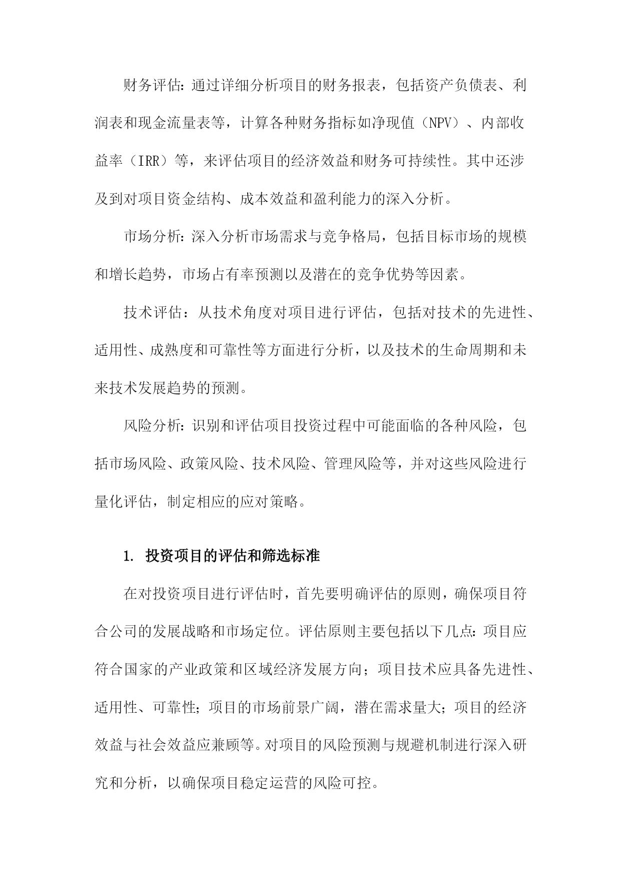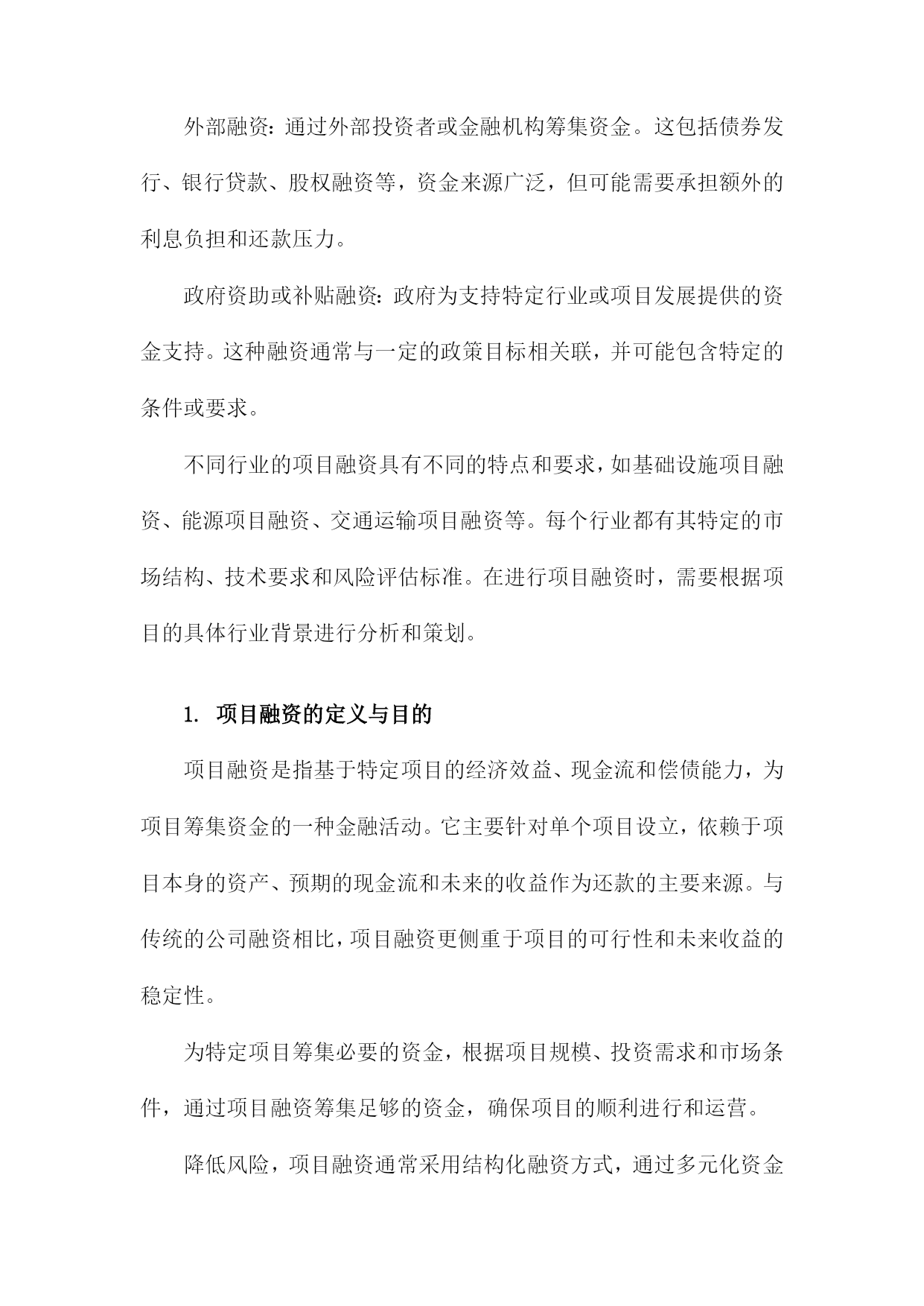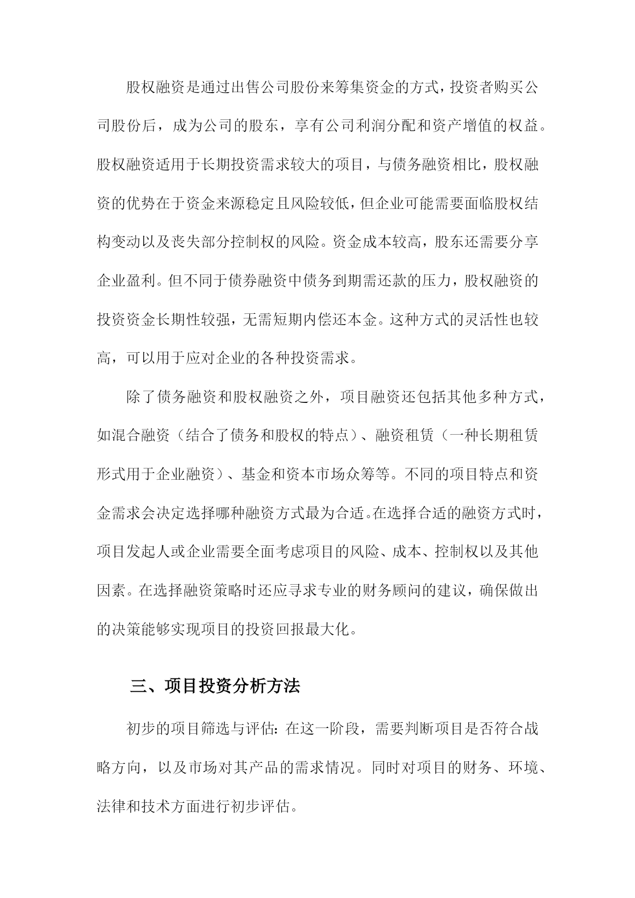 《项目投资与融资分析》阅读备忘录一、项目投资概述在阅读《项目投资与融资分析》对于项目投资的整体理解是首要了解的内容。简而言之,是指企业或个人为了在未来获得经济效益而投入资金进行特定项目的行为。此处的项目可以是实体建设项目,如房地产、制造业工厂等,也可以是无形资产的投入,如技术研发项目、软件开发项目等。项目投资是企业扩大规模、增强竞争力的重要手段之一。项目投资的目的和重要性:项目投资是企业实现长期发展战略的重要手段,通过投资可以实现企业规模的扩大、市场份额的提升以及技术水平的提升等。项目投资类型:根据投资项目的性质,可分为实体投资项目与无形资产投资项目。实体投资项目主要涉及基础设施建设、房地产等;无形资产投资项目则包括技术研发、品牌塑造等。投资决策过程:涉及项目的筛选、评估、决策等多个环节,这一过程需要对项目的市场前景、盈利能力、风险状况等进行全面分析。项目投资与企业战略:项目投资需与企业长期发展战略相结合,确保投资方向与企业的战略目标相一致。在阅读过程中,应重点关注项目投资的基本概念、投资目的、投资类型以及投资决策过程等内容,为后续分析项目投资与融资的关系奠定基础。结合实际案例进行深入理解,能够更好地把握项目投资的核心要点。1.项目投资的定义和目的项目投资是指企业或个人为了在未来获取经济回报而投入资金,参与到某一特定项目的建设、运营或开发中的行为。这通常涉及对资产、设备、技术或资源的购置和配置,以实现预定的商业目标。a.盈利目的:项目投资的主要目的是获取经济回报,通过项目的实施与运营实现资金的增值。b.发展战略:项目投资有助于企业实现其长期发展战略,包括市场扩张、技术创新、产业升级等。c.风险控制:通过项目投资进行资源优化配置,降低经营风险,增强企业的抗风险能力。d.社会效益:除了直接的经济效益,项目投资还可能带来社会效益,如提升就业、促进地区经济发展等。e.提升竞争力:通过投资高科技项目或创新项目,企业可以提升其核心竞争力,在市场中占据更有利的位置。本段落简要概述了项目投资的基本定义和核心目的,为后续详细分析项目投资与融资分析提供了基础背景。2.项目投资的重要性和特点本备忘录主要围绕《项目投资与融资分析》一书的核心内容展开,针对项目投资的重要性和特点进行了详细梳理和阐述。项目投资是企业实现增长与发展的关键手段之一,其重要性体现在以下几个方面:促进经济增长:项目投资能够带动相关产业的发展,促进经济的增长和繁荣。优化资源配置:通过项目投资,企业可以优化资源配置,提高资源利用效率,从而提升企业的竞争力。提升技术水平:项目投资往往是技术创新和技术革新的推动力,能够有效提高企业的技术水平,为企业带来长远的竞争优势。创造就业机会:项目投资不仅能够直接创造就业机会,还能够带动产业链上下游企业的共同发展,间接创造更多的就业机会。资金集中投入:项目投资通常需要大量的资金投入,涉及资金规模较大。风险与收益并存:项目投资的风险相对较高,但相应的收益也较大。项目投资者需要对项目的风险进行全面评估,并采取有效的风险控制措施。长期性投资:项目投资往往具有长期性,投资者需要充分考虑项目的生命周期和投资回报周期。多元化投资主体:项目投资涉及多个投资主体,包括政府、企业、金融机构等,需要协调各方利益,确保项目的顺利进行。投资决策的复杂性:项目投资涉及的因素众多,投资决策需要考虑市场环境、政策因素、技术条件等多方面因素,决策过程较为复杂。二、项目融资基本概念与分类项目融资是一种为特定项目而开展的金融活动,主要依赖于项目本身的资产、未来的收益和现金流来安排融资,并以项目产生的收入作为偿还贷款的来源。它强调的是以项目的可行性及未来收益作为筹资的主要基础,对投资者而言,是评估项目经济效益和风险的重要手段。与传统的公司融资相比,项目融资更侧重于项目本身的细节分析和风险评估。直接投资融资:投资者直接对项目进行投资,获得项目的部分或全部所有权。间接投资融资:投资者通过购买债券或股票对项目进行投资,不直接参与项目管理,而是通过收益权获取回报。内部融资:利用项目自身的现金流或预留收益来支持项目的发展。这种方式风险相对较小,但可能受限于项目自身的资金规模。外部融资:通过外部投资者或金融机构筹集资金。这包括债券发行、银行贷款、股权融资等,资金来源广泛,但可能需要承担额外的利息负担和还款压力。政府资助或补贴融资:政府为支持特定行业或项目发展提供的资金支持。这种融资通常与一定的政策目标相关联,并可能包含特定的条件或要求。不同行业的项目融资具有不同的特点和要求,如基础设施项目融资、能源项目融资、交通运输项目融资等。每个行业都有其特定的市场结构、技术要求和风险评估标准。在进行项目融资时,需要根据项目的具体行业背景进行分