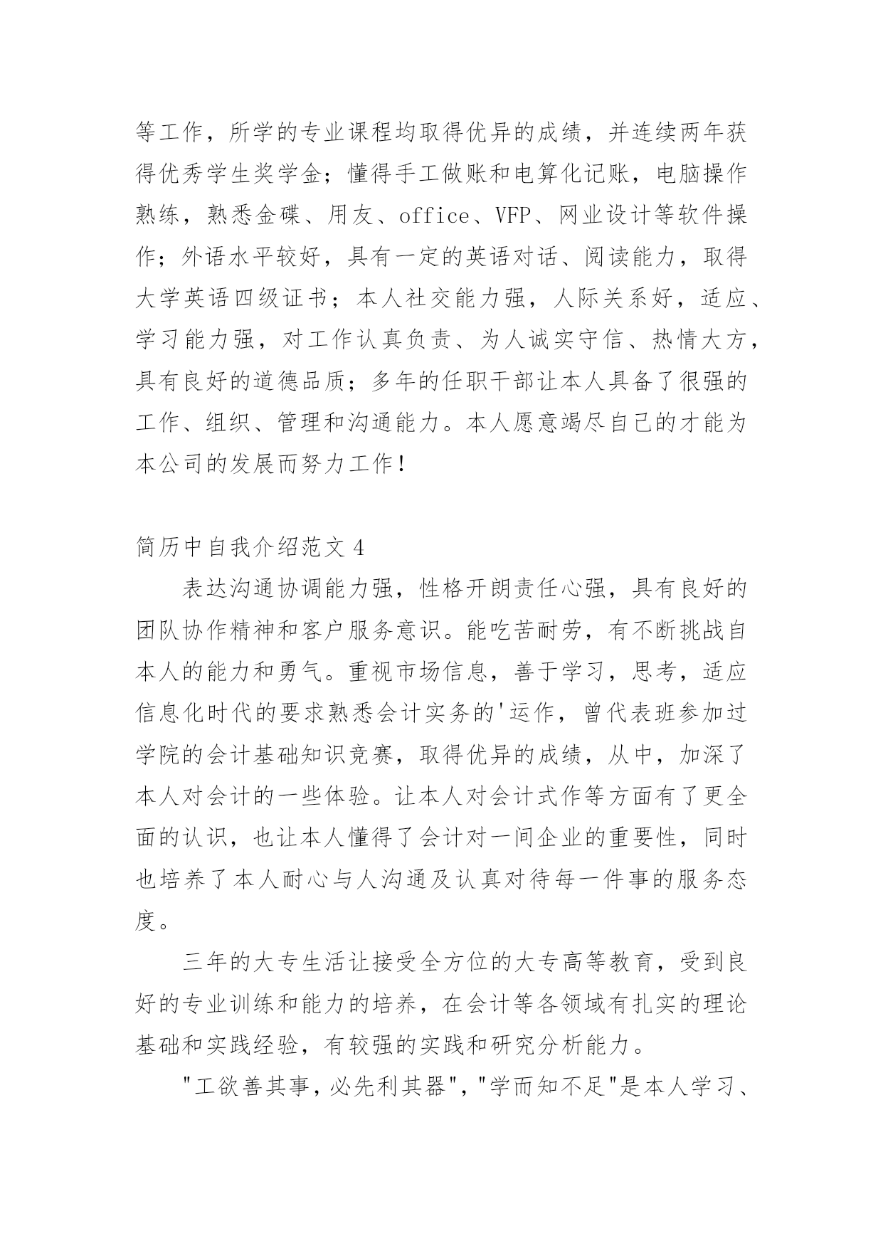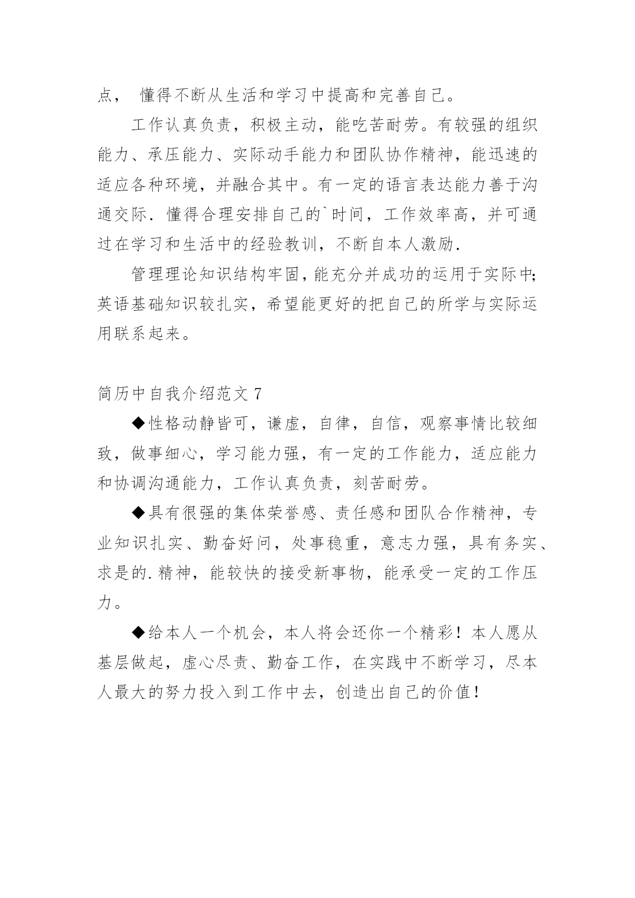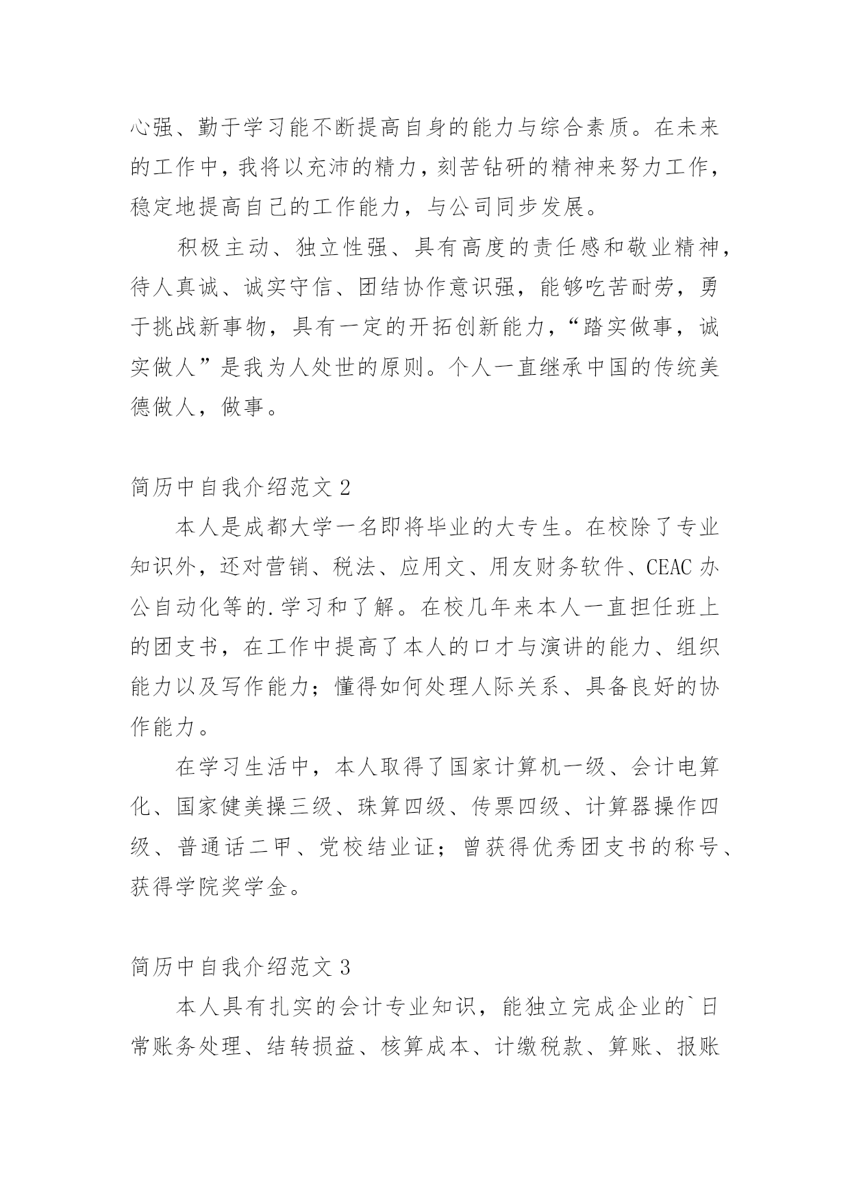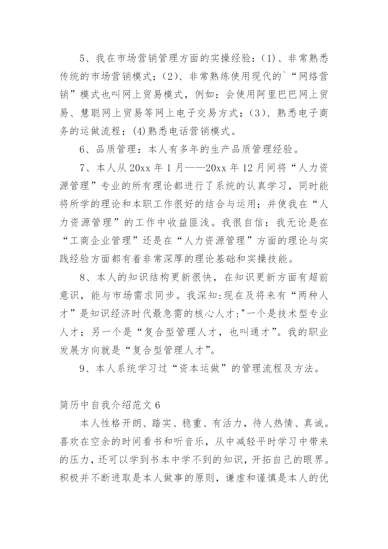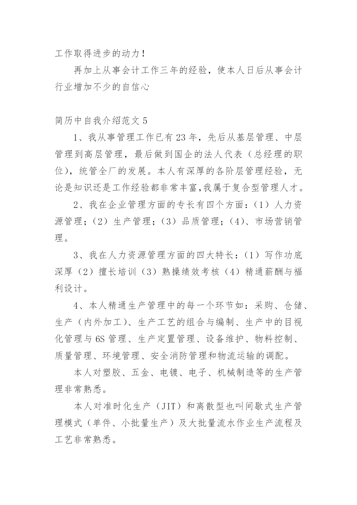 简历中自我介绍简历中自我介绍范文7篇简历中自我介绍范文1本人性格开朗、稳重、有活力,待人热情、真诚。工作认真负责,积极主动,能吃苦耐劳;喜欢思考,虚心与人交流,以取长补短。有较强的组织能力、实际动手能力和团体协作精神,能迅速的适应各种环境,并融合其中。在实习期间善于把检验结果与病人具体病情结合分析;社会责任感强,踏实肯干,主动争取锻炼机会。我不断地完善自己,提高自身素质。我在学好专业课与公共课的基础上,还阅读了大量的课外书籍,不断地增加新知识,陶冶情操、开拓视野。不仅如此,我还积极参加社会实践活动,和各种文体活动,培养了我一定的组织与社交能力。本人热爱篮球、羽毛球、跑步、下棋、唱歌。我是一个认真工作,认真钻研,勇于创新的人。能熟练运用电脑,掌握一定的office办公软件,与老师与同学保持着紧密的关系,乐于帮助同学解决学习与生活上的'麻烦,善于总结归纳,善于沟通,有良好的敬业作风和团队合作精神。已熟悉与掌握本专业的相关知识,在大学4年间学会刻苦耐劳,努力钻研,学以致用,这就是我们所追寻的宝藏。对待工作认真负责,善于沟通、协调有较强的组织能力与团队精神;活泼开朗、乐观上进、有爱心并善于施教并行;上进心强、勤于学习能不断提高自身的能力与综合素质。在未来的工作中,我将以充沛的精力,刻苦钻研的精神来努力工作,稳定地提高自己的工作能力,与公司同步发展。积极主动、独立性强、具有高度的责任感和敬业精神,待人真诚、诚实守信、团结协作意识强,能够吃苦耐劳,勇于挑战新事物,具有一定的开拓创新能力,“踏实做事,诚实做人”是我为人处世的原则。个人一直继承中国的传统美德做人,做事。简历中自我介绍范文2本人是成都大学一名即将毕业的大专生。在校除了专业知识外,还对营销、税法、应用文、用友财务软件、CEAC办公自动化等的.学习和了解。在校几年来本人一直担任班上的团支书,在工作中提高了本人的口才与演讲的能力、组织能力以及写作能力;懂得如何处理人际关系、具备良好的协作能力。在学习生活中,本人取得了国家计算机一级、会计电算化、国家健美操三级、珠算四级、传票四级、计算器操作四级、普通话二甲、党校结业证;曾获得优秀团支书的称号、获得学院奖学金。简历中自我介绍范文3本人具有扎实的会计专业知识,能独立完成企业的`日常账务处理、结转损益、核算成本、计缴税款、算账、报账等工作,所学的专业课程均取得优异的成绩,并连续两年获得优秀学生奖学金;懂得手工做账和电算化记账,电脑操作熟练,熟悉金碟、用友、office、VFP、网业设计等软件操作;外语水平较好,具有一定的英语对话、阅读能力,取得大学英语四级证书;本人社交能力强,人际关系好,适应、学习能力强,对工作认真负责、为人诚实守信、热情大方,具有良好的道德品质;多年的任职干部让本人具备了很强的工作、组织、管理和沟通能力。本人愿意竭尽自己的才能为本公司的发展而努力工作!简历中自我介绍范文4表达沟通协调能力强,性格开朗责任心强,具有良好的团队协作精神和客户服务意识。能吃苦耐劳,有不断挑战自本人的能力和勇气。重视市场信息,善于学习,思考,适应信息化时代的要求熟悉会计实务的'运作,曾代表班参加过学院的会计基础知识竞赛,取得优异的成绩,从中,加深了本人对会计的一些体验。让本人对会计式作等方面有了更全面的认识,也让本人懂得了会计对一间企业的重要性,同时也培养了本人耐心与人沟通及认真对待每一件事的服务态度。三年的大专生活让接受全方位的大专高等教育,受到良好的专业训练和能力的培养,在会计等各领域有扎实的理论基础和实践经验,有较强的实践和研究分析能力。"工欲善其事,必先利其器","学而知不足"是本人学习、工作取得进步的动力!再加上从事会计工作三年的经验,使本人日后从事会计行业增加不少的自信心简历中自我介绍范文51、我从事管理工作已有23年,先后从基层管理、中层管理到高层管理,最后做到国企的法人代表(总经理的职位),统管全厂的发展。本人有深厚的各阶层管理经验,无论是知识还是工作经验都非常丰富,我属于复合型管理人才。2、我在企业管理方面的专长有四个方面:(1)人力资源管理;(2)生产管理;(3)品质管理;(4)、市场营销管理。3、我在人力资源管理方面的四大特长:(1)写作功底深厚(2)擅长培训(3)熟操绩效考核(4)精通薪酬与福利设计。4、本人精通生产管理中的每一个环节如:采购、仓储、生产(内外加工)、生产工艺的组合与编制、生产中的目视化管理与6S管理、生产定置管理、设备维护、物料控制、质量管理、环境管理、安全消防管理和物流运输的调配。本人对塑胶、五金、电镀、电子、机械制造等的生产管理非常熟悉。本人对准时化生产(JIT)和离散型也叫间歇式生产管理模式(单件、小批量生产)及大批量流水作业生产流程及工艺非常熟悉。5、我在市场营销管理方面的实操经验:(1)、非