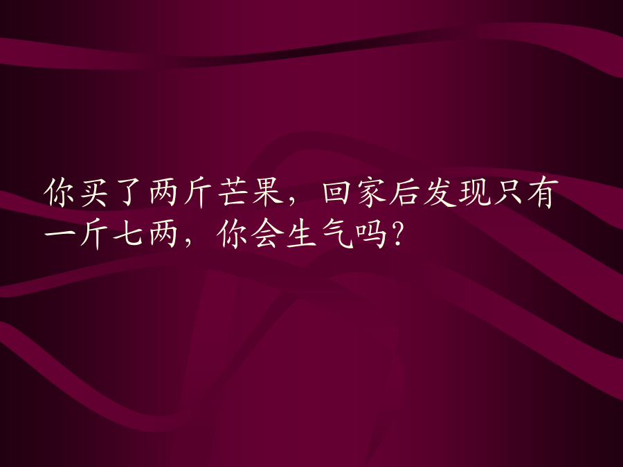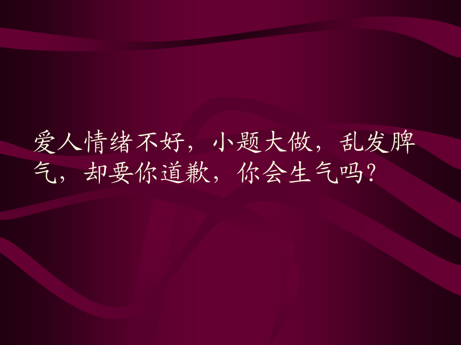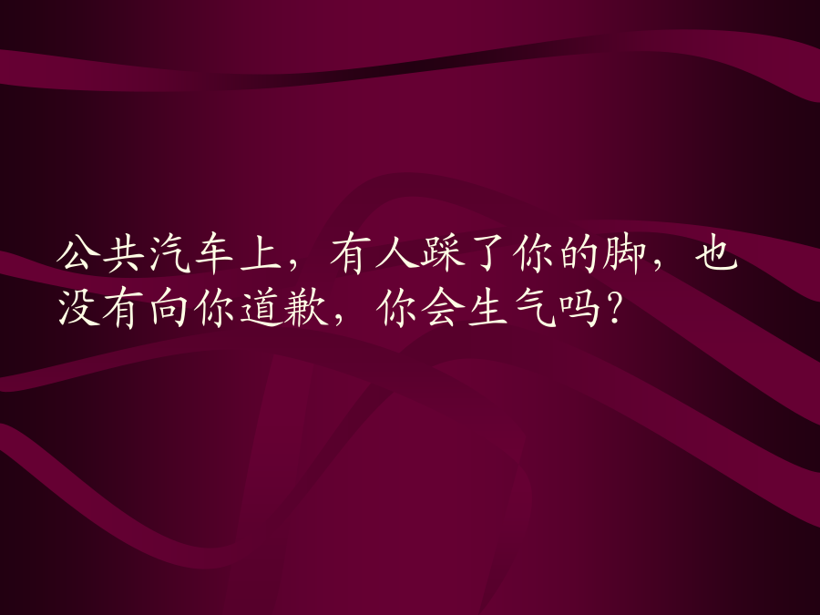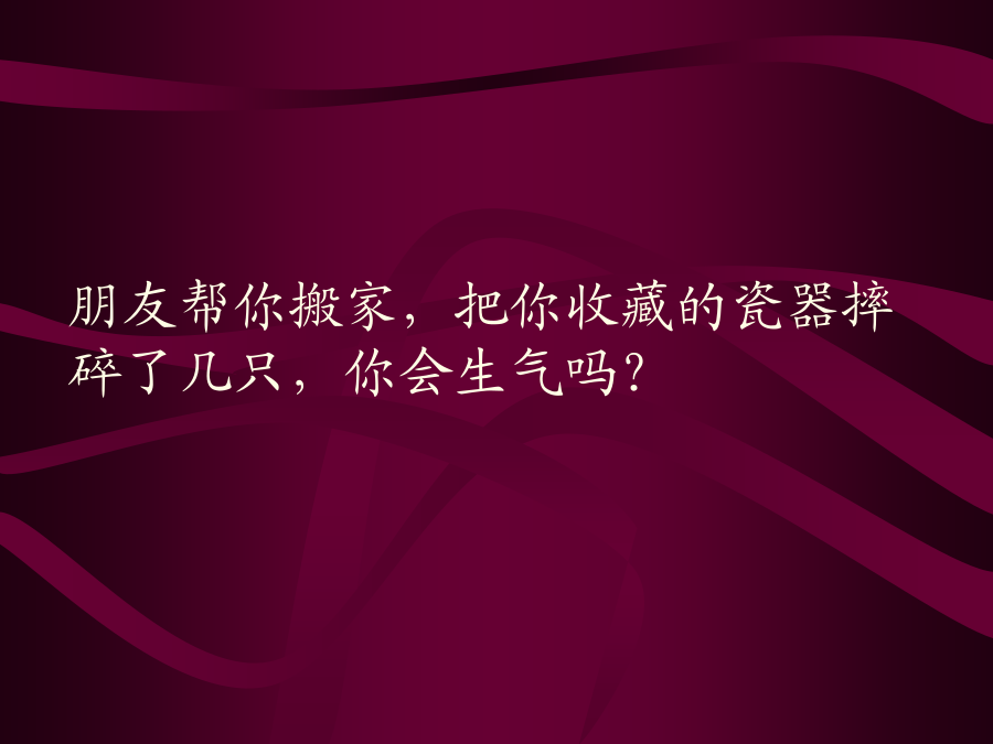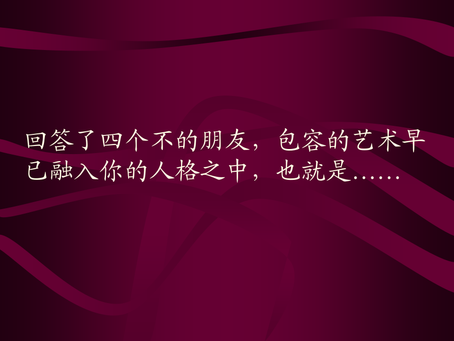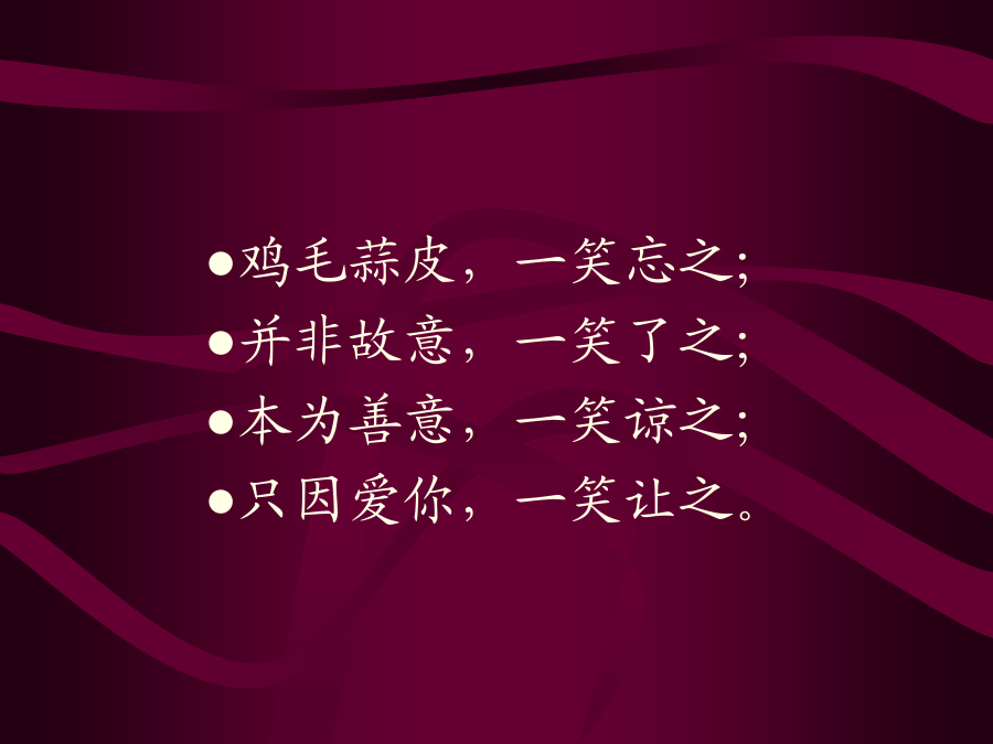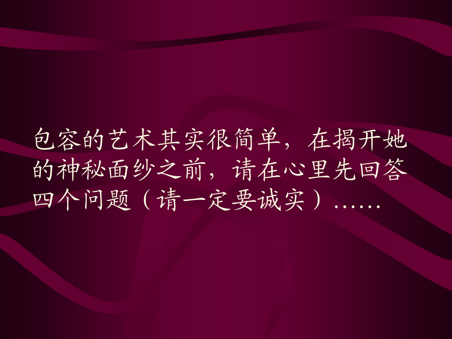 包容的艺术包容的艺术其实很简单,在揭开她的神秘面纱之前,请在心里先回答四个问题(请一定要诚实)……你买了两斤芒果,回家后发现只有一斤七两,你会生气吗?公共汽车上,有人踩了你的脚,也没有向你道歉,你会生气吗?朋友帮你搬家,把你收藏的瓷器摔碎了几只,你会生气吗?爱人情绪不好,小题大做,乱发脾气,却要你道歉,你会生气吗?回答了四个不的朋友,包容的艺术早已融入你的人格之中,也就是……●鸡毛蒜皮,一笑忘之;●并非故意,一笑了之;●本为善意,一笑谅之;●只因爱你,一笑让之。