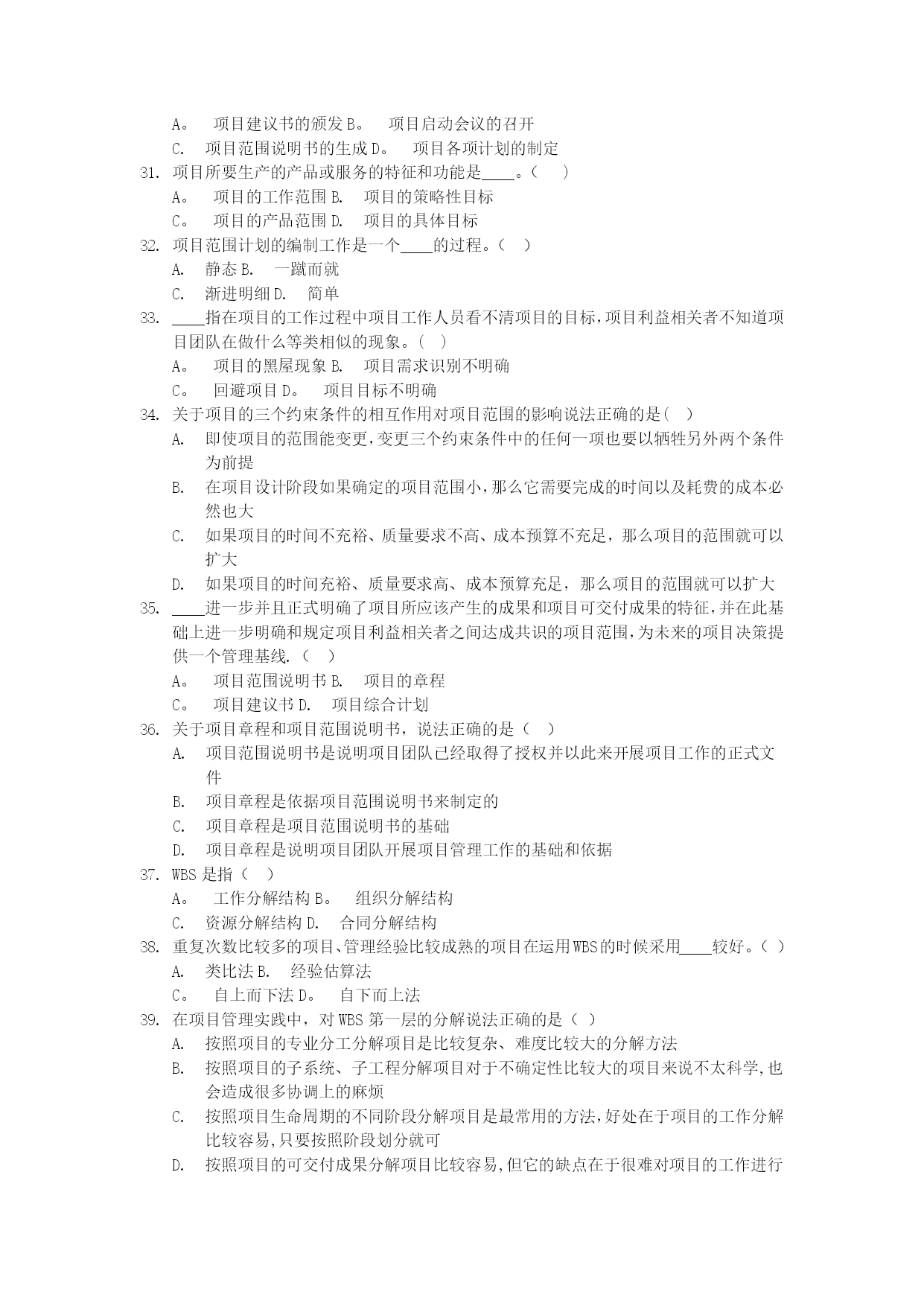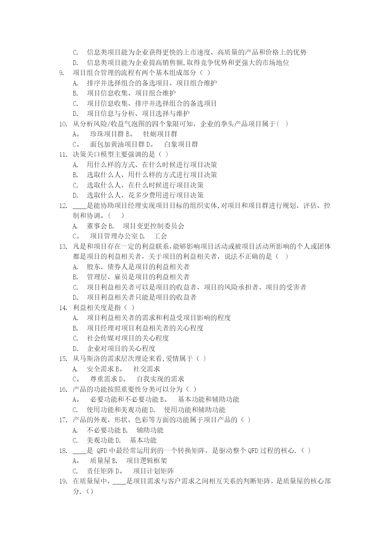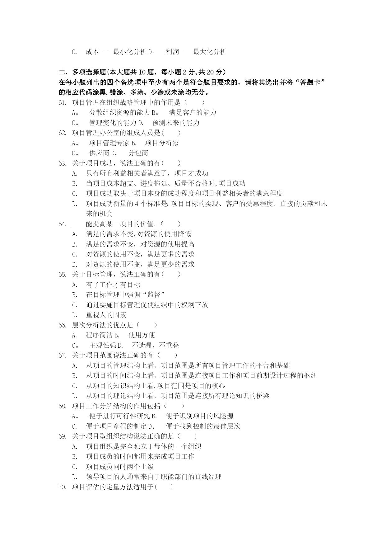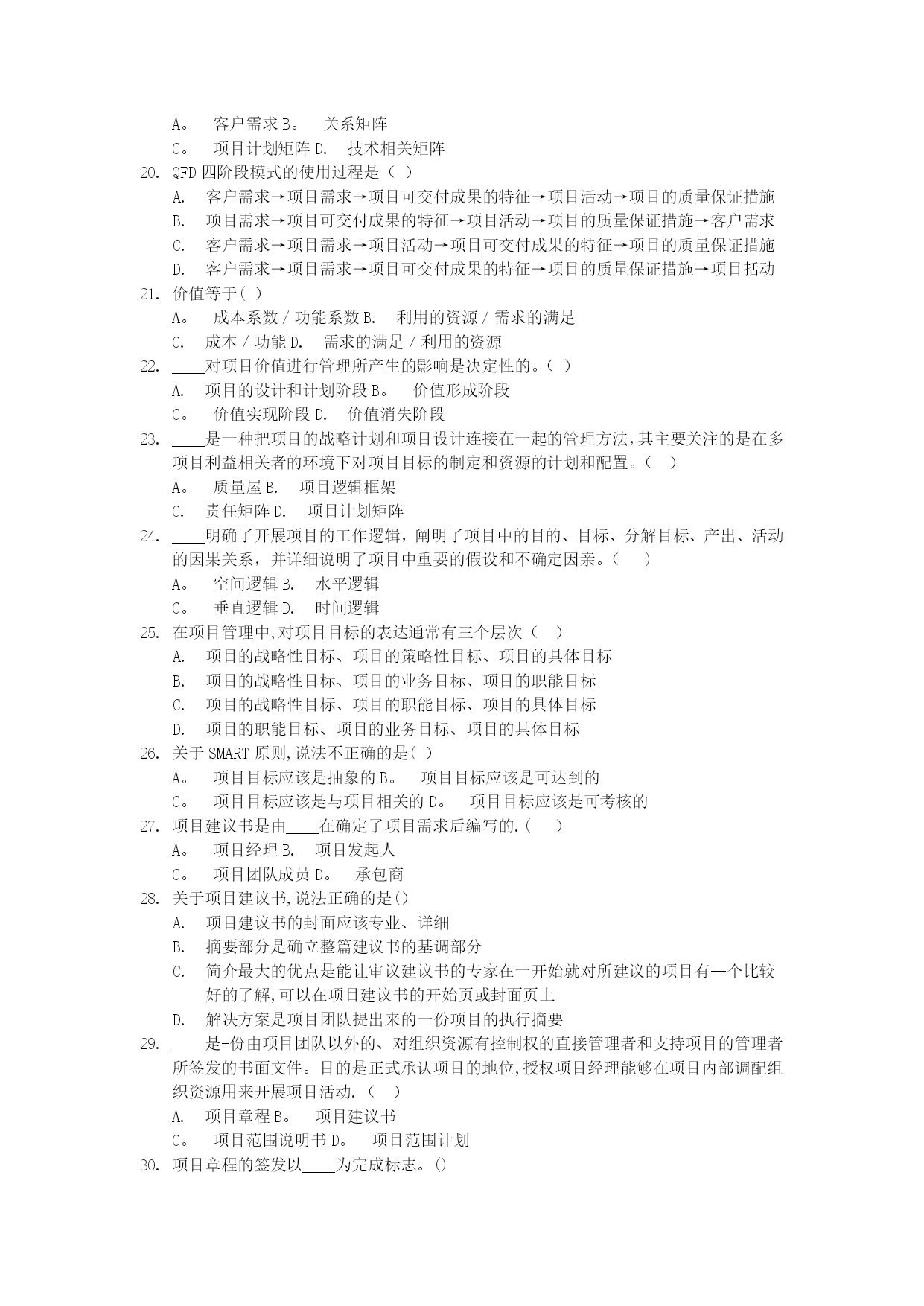 项目设计与范围管理真题[1]实用文档(实用文档,可以直接使用,可编辑优秀版资料,欢迎下载)2021年10月高等教育自学考试北京市命题考试项目范围管理试卷(课程代码:05060)本试卷分为两部分,,满分100分:考试时间150分钟.1、第一部分为选择题,应考者必须在“答题卡”上的“选择题答题区”内按要求填涂,答在试卷上无效。2、第二部分为非选择题,应考者必须在“答题卡"上的“非选择题答题区”内按照试题题号顺序直接答题,答在试卷上无效。第一部分选择题(共80分)一、单项选择题(本大题共60小题,每小题1分,共60分)在每小题列出的四个备选项中只有一个是符合题目要求的,请将其选出并将“答题卡"的相应代码涂黑。错涂、多涂或未涂均无分。关于知识经济背景下社会发展环境的特征,说法不正确的是()经济全球化不能彻底改变组织活动的范围知识经济时代是创新型劳动为主导的经济在商业社会中,对科学技术的应用正以一种前所未有的速度发展从事创新型劳动的人员和劳动时间越来越多根据美国项目管理协会(PMI)的定义,项目是为了生产一种独特的产品、服务或结果而进行的____努力。()A。重复性B。永久性C.一次性D.以上说法都正确在西方,战略一词是指()A.军队的艺术和科学B.计划C。经营方法D。战斗和战争战略管理是____管理.()A。一次性的、静态的B.重复性的、动态的C.一次性的、动态的D.重复性的、静态的战略管理过程包括____三个环节。()战略分析、战略制定与战略实施战略分析、战略选择与战略评估战略制定、战略评估与战略实施战略制定、战略实施与战略控制有效地管理一组项目和项目群及相关的工作,以满足组织战略目标的动态决策过程是()A.项目需求分析B.可行性研究C.项目构思D。项目组合项目组合管理采取的是____的管理方式。()A。自上而下B。自下而上C.类比法D。以上几种均可在IT企业中,关于信息类项目说法正确的是()信息类项目是企业业务灵活应变和整合资源的基础信息类项目构成了企业的基本流程和业务信息类项目能为企业获得更快的上市速度、高质量的产品和价格上的优势信息类项目能为企业提高销售额,取得竞争优势和更强大的市场地位项目组合管理的流程有两个基本组成部分()排序并选择组合的备选项目、项目组合维护项目信息收集、项目组合维护项目信息收集、排序并选择组合的备选项目项目信息与分析、项目选择与维护从分析风险/收益气泡图的四个象限可知,企业的拳头产品项目属于()A。珍珠项目群B。牡蛎项目群C。面包加黄油项目群D。白象项目群决策关口模型主要强调的是()用什么样的方式、在什么时候进行项目决策选取什么人、用什么样的方式进行项目决策选取什么人、在什么时候进行项目决策选取什么人、花多少费用进行项目决策____是能协助项目经理实现项目目标的组织实体,对项目和项目群进行规划、评估、控制和协调。()A.董事会B.项目变更控制委员会C。项目管理办公室D.工会凡是和项目存在一定的利益联系,能够影响项目活动或被项目活动所影响的个人或团体都是项目的利益相关者,关于项目的利益相关者,说法不正确的是()股东、债券人是项目的利益相关者管理层、雇员是项目的利益相关者项目利益相关者可以是项目的收益者、项目的风险承担者、项目的受害者项目利益相关者只能是项目的收益者利益相关度是指()项目利益相关者的需求和利益受项目影响的程度项目经理对项目利益相关者的关心程度社会传媒对项目的关心程度企业对项目的关心程度从马斯洛的需求层次理论来看,爱情属于()A.安全需求B。社交需求C。尊重需求D。自我实现的需求产品的功能按照重要性分类可以分为()A。必要功能和不必要功能B。基本功能和辅助功能C.使用功能和美观功能D.使用功能和辅助功能产品的外观、形状、色彩等方面的功能属于项目产品的()A.不必要功能B.辅助功能C.美观功能D.基本功能____是QFD中最经常运用到的一个转换矩阵,是驱动整个QFD过程的核心.()A。质量屋B.项目逻辑框架C.责任矩阵D。项目计划矩阵在质量屋中,____是项目需求与客户需求之间相互关系的判断矩阵,是质量屋的核心部分.()A。客户需求B。关系矩阵C。项目计划矩阵D.技术相关矩阵QFD四阶段模式的使用过程是()客户需求→项目需求→项目可交付成果的特征→项目活动→项目的质量保证措施项目需求→项目可交付成果的特征→项目活动→项目的质量保证措施→客户需求客户需求→项目需求→项目活动→项目可交付成果的特征→项目的质量保证措施客户需求→项目需求→项目可交付成果的特征→项目的质量保证措施→项目括动价值等于()A。成本系数/功能系数B.利