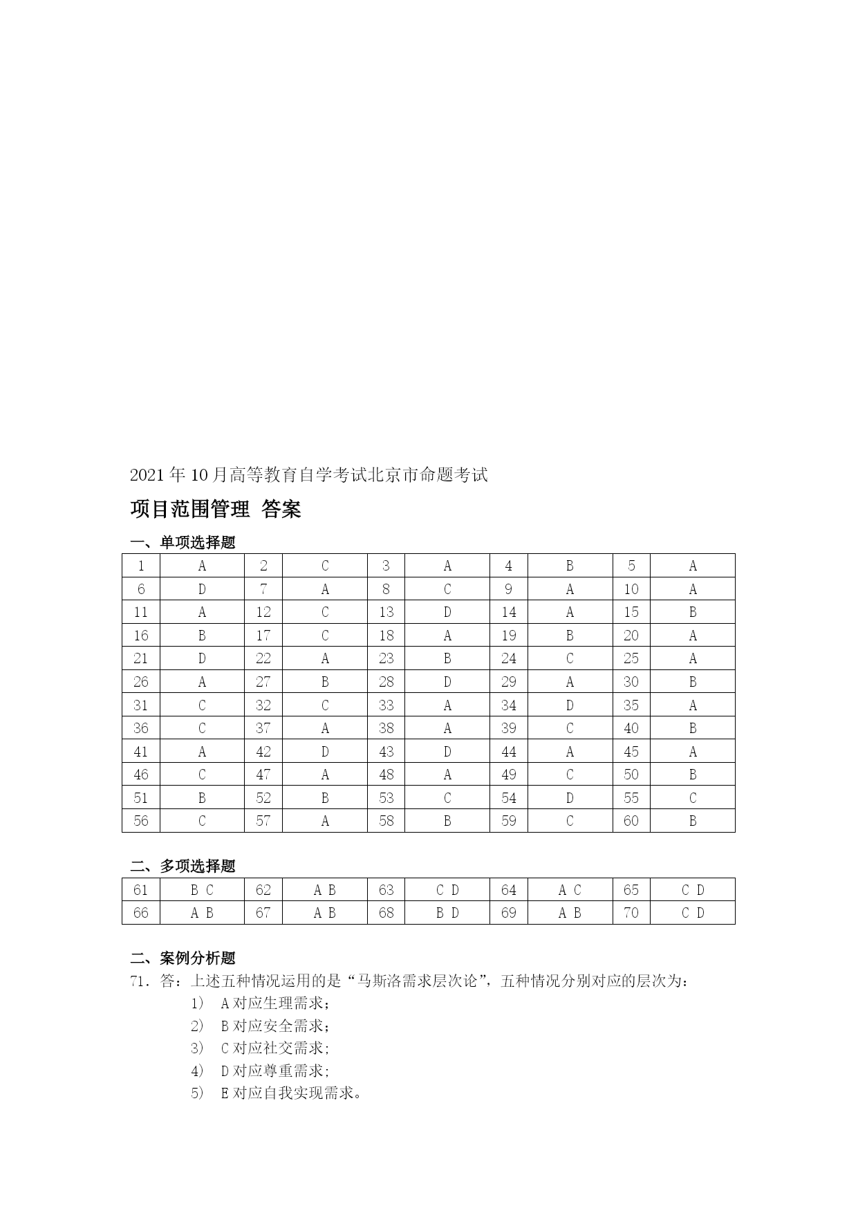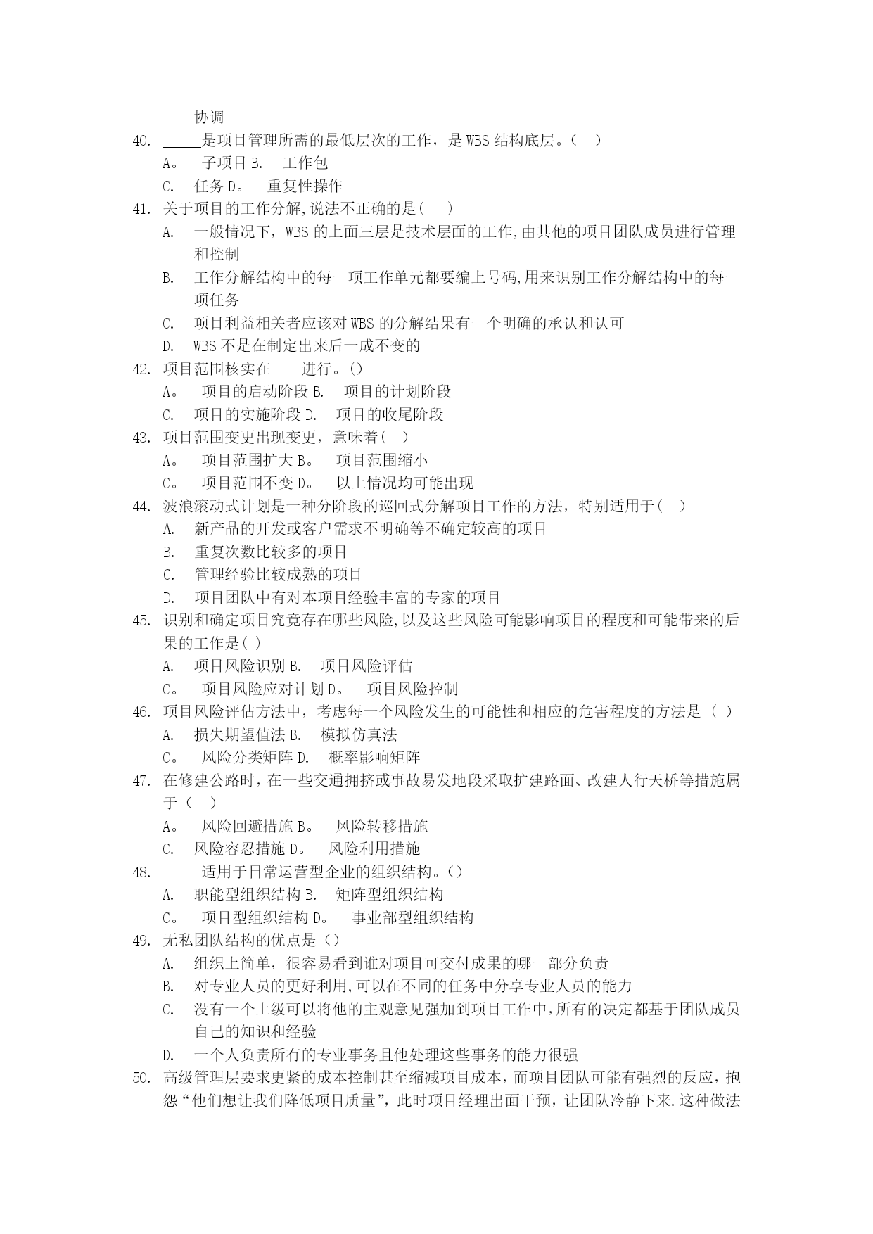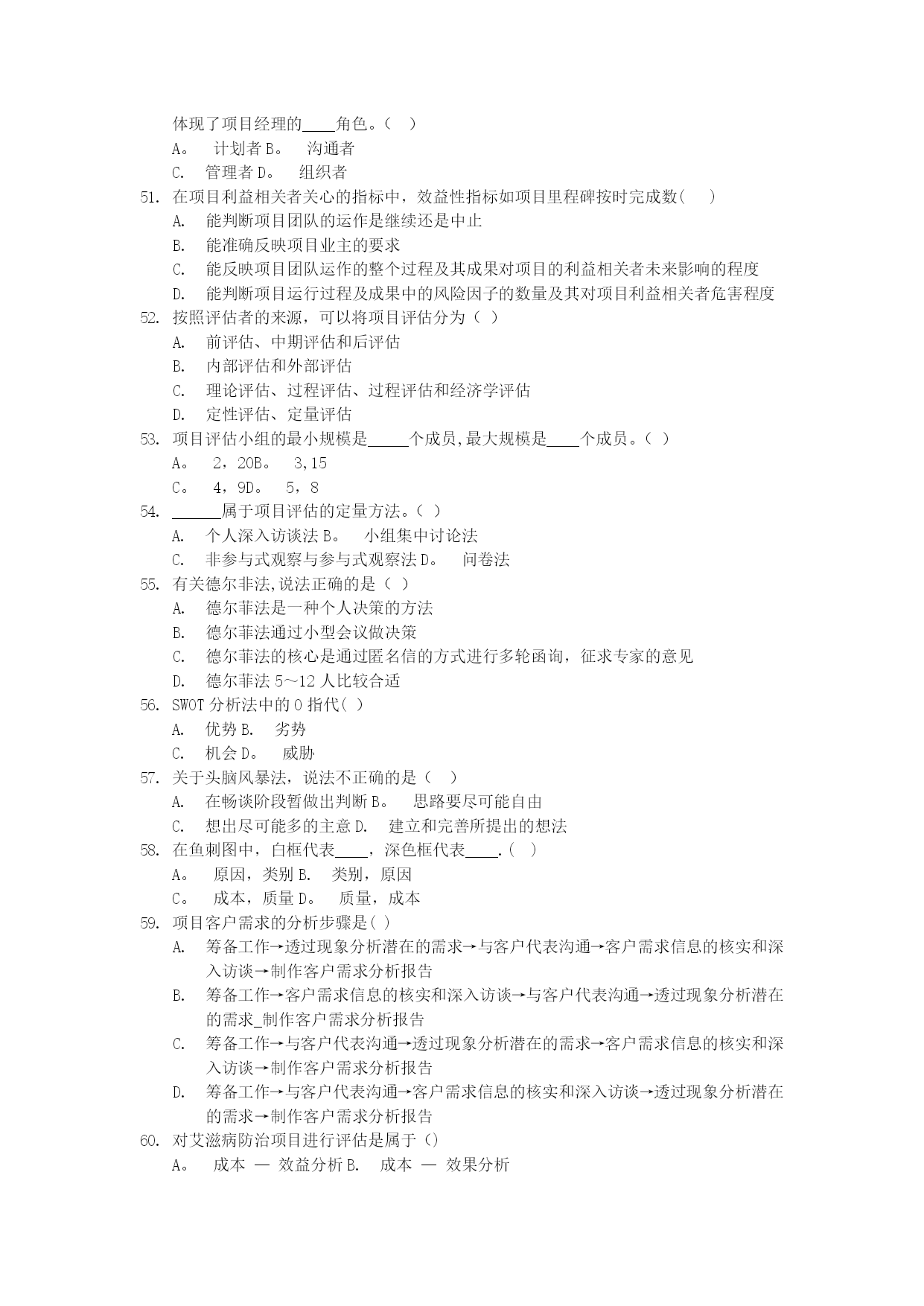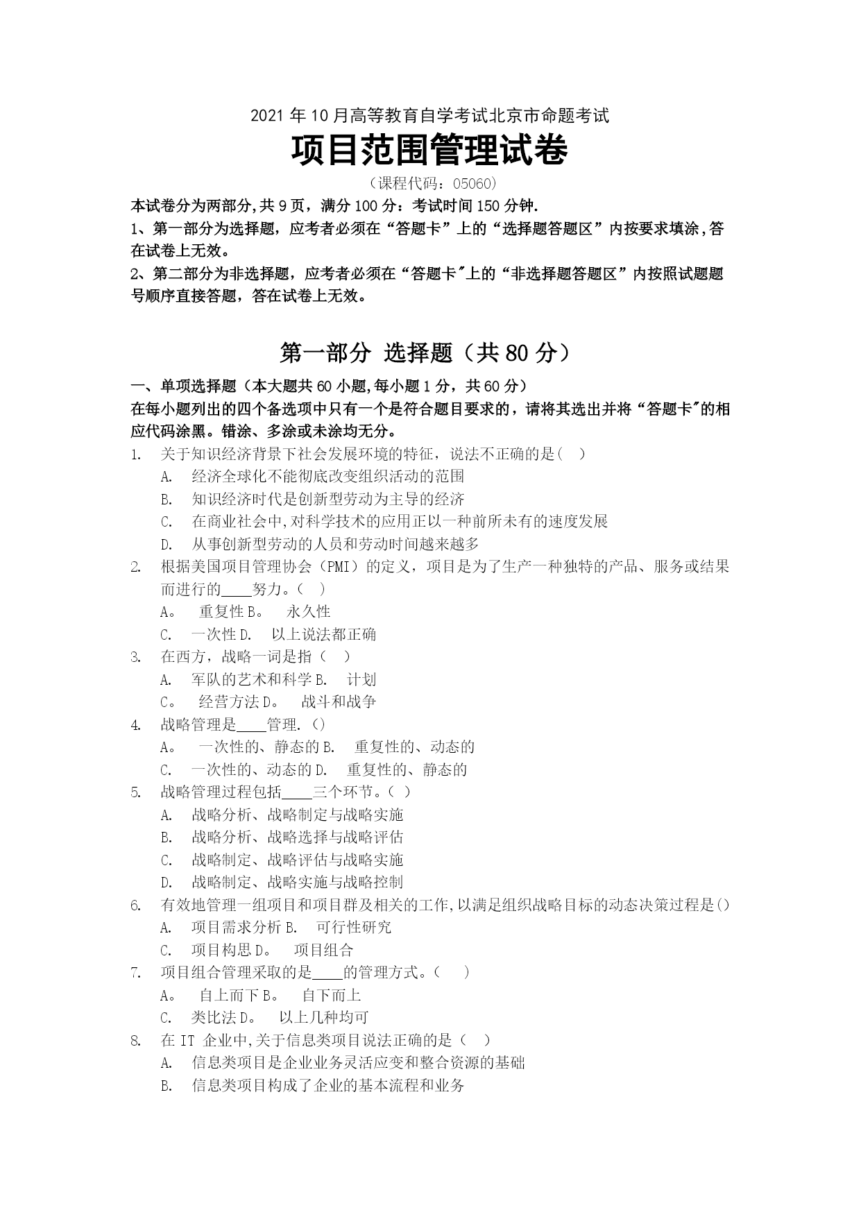 项目设计与范围管理真题[1]实用文档(实用文档,可以直接使用,可编辑优秀版资料,欢迎下载)2021年10月高等教育自学考试北京市命题考试项目范围管理试卷(课程代码:05060)本试卷分为两部分,,满分100分:考试时间150分钟.1、第一部分为选择题,应考者必须在“答题卡”上的“选择题答题区”内按要求填涂,答在试卷上无效。2、第二部分为非选择题,应考者必须在“答题卡"上的“非选择题答题区”内按照试题题号顺序直接答题,答在试卷上无效。第一部分选择题(共80分)一、单项选择题(本大题共60小题,每小题1分,共60分)在每小题列出的四个备选项中只有一个是符合题目要求的,请将其选出并将“答题卡"的相应代码涂黑。错涂、多涂或未涂均无分。关于知识经济背景下社会发展环境的特征,说法不正确的是()经济全球化不能彻底改变组织活动的范围知识经济时代是创新型劳动为主导的经济在商业社会中,对科学技术的应用正以一种前所未有的速度发展从事创新型劳动的人员和劳动时间越来越多根据美国项目管理协会(PMI)的定义,项目是为了生产一种独特的产品、服务或结果而进行的____努力。()A。重复性B。永久性C.一次性D.以上说法都正确在西方,战略一词是指()A.军队的艺术和科学B.计划C。经营方法D。战斗和战争战略管理是____管理.()A。一次性的、静态的B.重复性的、动态的C.一次性的、动态的D.重复性的、静态的战略管理过程包括____三个环节。()战略分析、战略制定与战略实施战略分析、战略选择与战略评估战略制定、战略评估与战略实施战略制定、战略实施与战略控制有效地管理一组项目和项目群及相关的工作,以满足组织战略目标的动态决策过程是()A.项目需求分析B.可行性研究C.项目构思D。项目组合项目组合管理采取的是____的管理方式。()A。自上而下B。自下而上C.类比法D。以上几种均可在IT企业中,关于信息类项目说法正确的是()信息类项目是企业业务灵活应变和整合资源的基础信息类项目构成了企业的基本流程和业务信息类项目能为企业获得更快的上市速度、高质量的产品和价格上的优势信息类项目能为企业提高销售额,取得竞争优势和更强大的市场地位项目组合管理的流程有两个基本组成部分()排序并选择组合的备选项目、项目组合维护项目信息收集、项目组合维护项目信息收集、排序并选择组合的备选项目项目信息与分析、项目选择与维护从分析风险/收益气泡图的四个象限可知,企业的拳头产品项目属于()A。珍珠项目群B。牡蛎项目群C。面包加黄油项目群D。白象项目群决策关口模型主要强调的是()用什么样的方式、在什么时候进行项目决策选取什么人、用什么样的方式进行项目决策选取什么人、在什么时候进行项目决策选取什么人、花多少费用进行项目决策____是能协助项目经理实现项目目标的组织实体,对项目和项目群进行规划、评估、控制和协调。()A.董事会B.项目变更控制委员会C。项目管理办公室D.工会凡是和项目存在一定的利益联系,能够影响项目活动或被项目活动所影响的个人或团体都是项目的利益相关者,关于项目的利益相关者,说法不正确的是()股东、债券人是项目的利益相关者管理层、雇员是项目的利益相关者项目利益相关者可以是项目的收益者、项目的风险承担者、项目的受害者项目利益相关者只能是项目的收益者利益相关度是指()项目利益相关者的需求和利益受项目影响的程度项目经理对项目利益相关者的关心程度社会传媒对项目的关心程度企业对项目的关心程度从马斯洛的需求层次理论来看,爱情属于()A.安全需求B。社交需求C。尊重需求D。自我实现的需求产品的功能按照重要性分类可以分为()A。必要功能和不必要功能B。基本功能和辅助功能C.使用功能和美观功能D.使用功能和辅助功能产品的外观、形状、色彩等方面的功能属于项目产品的()A.不必要功能B.辅助功能C.美观功能D.基本功能____是QFD中最经常运用到的一个转换矩阵,是驱动整个QFD过程的核心.()A。质量屋B.项目逻辑框架C.责任矩阵D。项目计划矩阵在质量屋中,____是项目需求与客户需求之间相互关系的判断矩阵,是质量屋的核心部分.()A。客户需求B。关系矩阵C。项目计划矩阵D.技术相关矩阵QFD四阶段模式的使用过程是()客户需求→项目需求→项目可交付成果的特征→项目活动→项目的质量保证措施项目需求→项目可交付成果的特征→项目活动→项目的质量保证措施→客户需求客户需求→项目需求→项目活动→项目可交付成果的特征→项目的质量保证措施客户需求→项目需求→项目可交付成果的特征→项目的质量保证措施→项目括动价值等于()A。成本系数/功能系数B.利