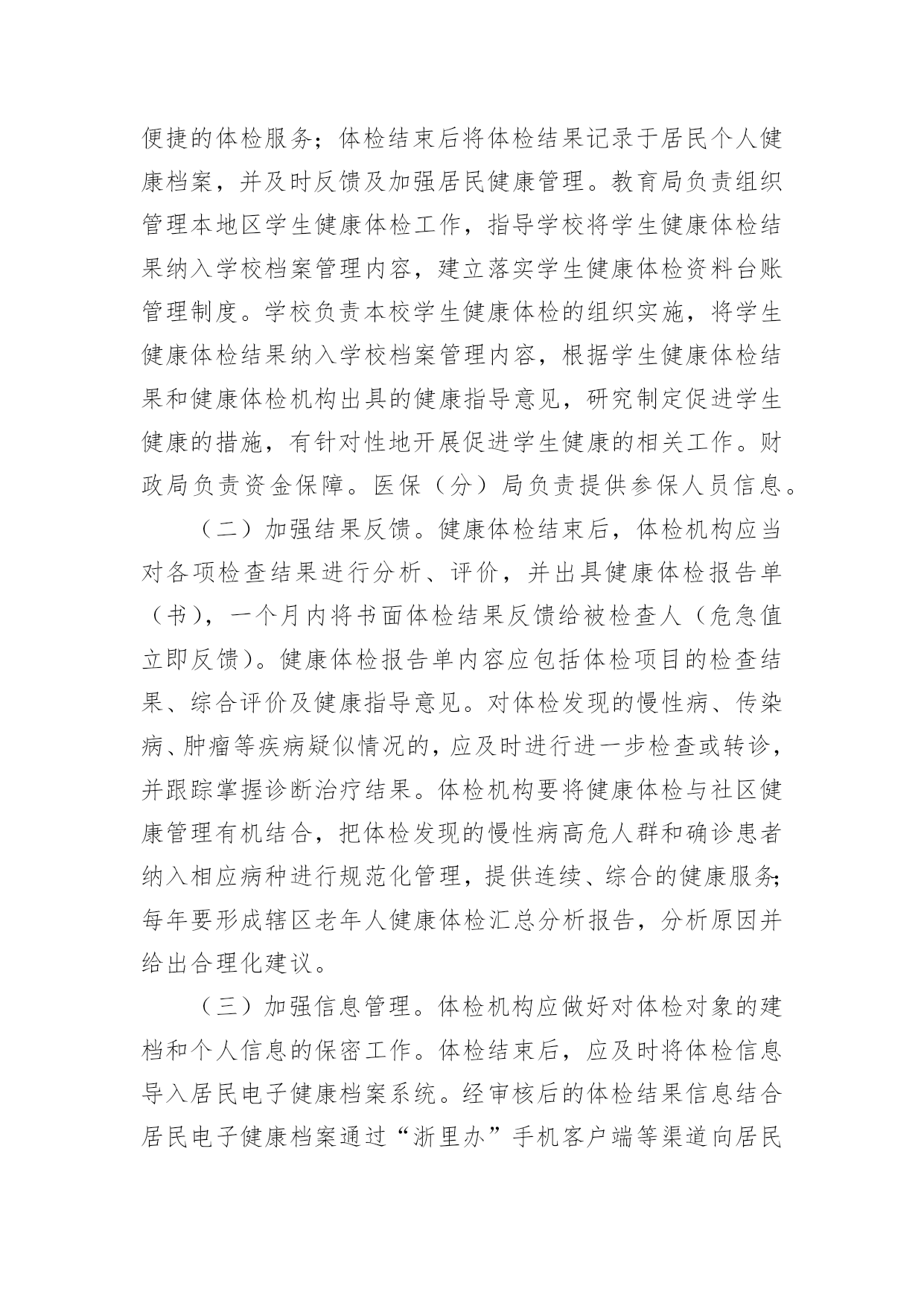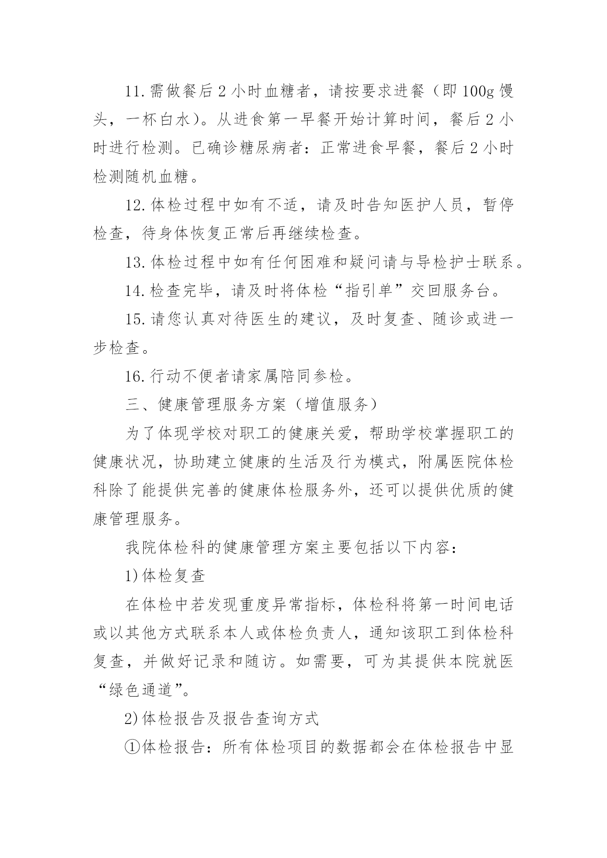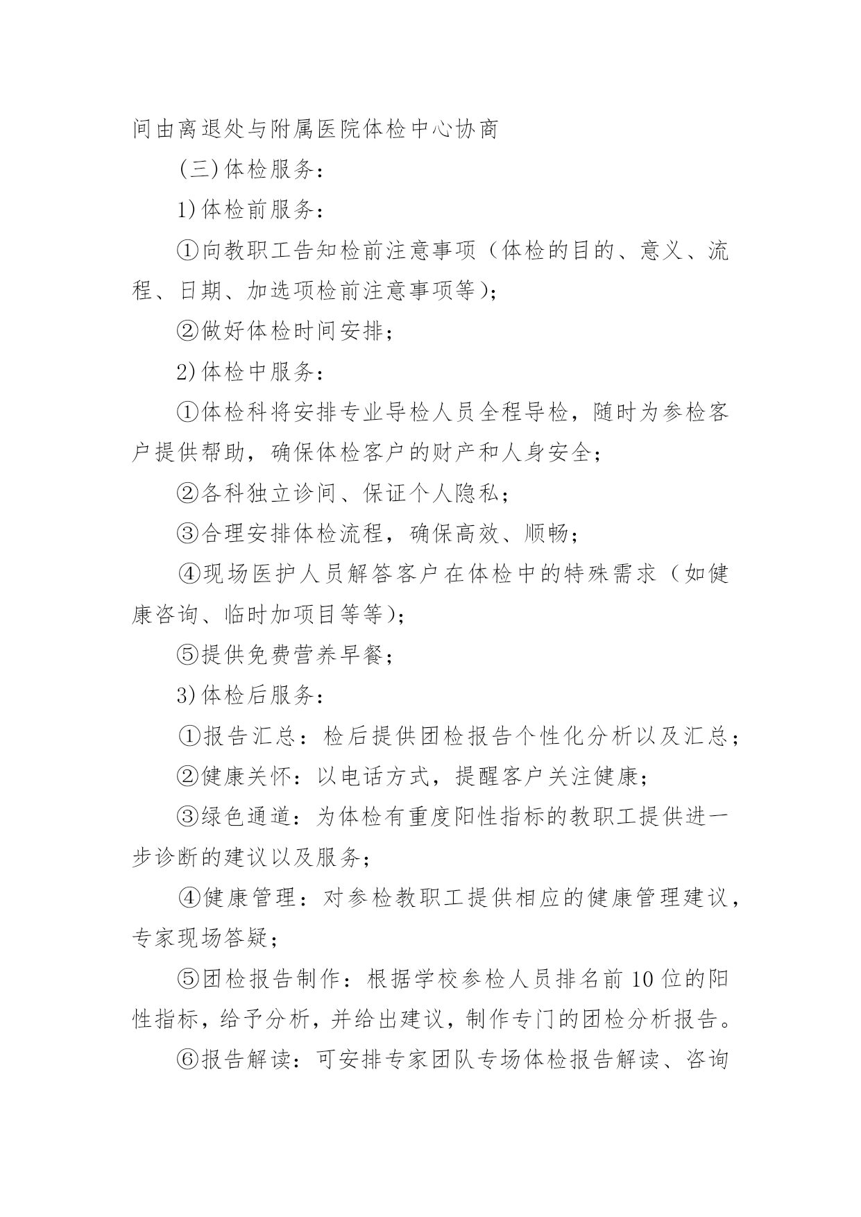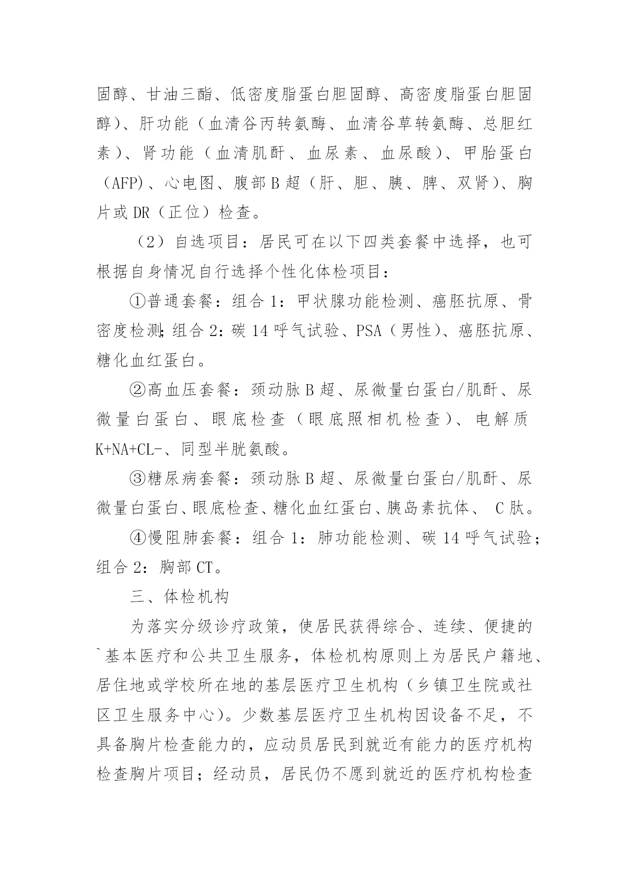 健康体检服务方案健康体检服务方案(实用10篇)为了确保事情或工作能无误进行,我们需要提前开始方案制定工作,一份好的方案一定会注重受众的参与性及互动性。那么应当如何制定方案呢?以下是小编整理的健康体检服务方案,仅供参考,希望能够帮助到大家。健康体检服务方案1为做好金华市区(婺城区、金东区、金华开发区)的中小学生、参保城乡居民和企业退休人员的健康体检工作,加强全人群健康管理,提升居民健康水平,制定本方案。一、适用范围在市区就读的中小学生、参加市区城乡居民基本医疗保险的人员、参加市区城镇职工基本医疗保险的企业退休人员。二、体检频率、项目及财政补助标准(一)中小学生每年体检一次,经费由财政承担,补助标准为35元/人次。体检项目按《国家卫生健康委教育部关于印发中小学生健康体检管理办法(20xx年版)的通知》(国卫医发〔20xx〕29号)执行。(二)参保城乡居民和企业退休人员1.体检频率与经费(1)65周岁及以上的参保城乡居民和企业退休人员,每年体检一次。体检项目包括基本项目和自选项目。基本项目的经费由财政承担,补助标准为90元/人次。自选项目:选择四类套餐的,由财政和居民个人各承担60元;选择个性化项目的,按医疗收费标准的60%收费,由财政和居民个人各承担50%,财政承担部分不高于60元/人次。65周岁以上居民的基本项目体检率应达到当年国家基本公共卫生项目的指标要求。(2)其它参保城乡居民(0-6岁儿童、中小学生除外)和65周岁以下的企业退休人员,每两年体检一次,体检项目为基本项目,经费由财政承担,补助标准为90元/人次,愿检尽检。截至20xx年12月31日已满60周岁且已参加过每年一次健康体检的参保居民和企业退休人员可参照65周岁及以上人群的政策执行。0-6岁儿童健康体检按国家基本公共卫生项目要求执行,体检经费在项目经费中安排。2.体检项目(1)基本项目:①一般检查:体温、呼吸、血压(双侧)、脉搏,身高、体重、腰围、体重指数;②五官检查:视力、巩膜,口唇、齿列,鼻、咽、喉、听力粗测判断;③内科常规检查:心肺听诊,腹部肝、脾触诊;④外科常规检查:皮肤、体表淋巴结、甲状腺、胸腹部、四肢关节、脊柱、运动功能粗测判断;⑤辅助检查:血常规、尿常规、空腹血糖、血脂(总胆固醇、甘油三酯、低密度脂蛋白胆固醇、高密度脂蛋白胆固醇)、肝功能(血清谷丙转氨酶、血清谷草转氨酶、总胆红素)、肾功能(血清肌酐、血尿素、血尿酸)、甲胎蛋白(AFP)、心电图、腹部B超(肝、胆、胰、脾、双肾)、胸片或DR(正位)检查。(2)自选项目:居民可在以下四类套餐中选择,也可根据自身情况自行选择个性化体检项目:①普通套餐:组合1:甲状腺功能检测、癌胚抗原、骨密度检测;组合2:碳14呼气试验、PSA(男性)、癌胚抗原、糖化血红蛋白。②高血压套餐:颈动脉B超、尿微量白蛋白/肌酐、尿微量白蛋白、眼底检查(眼底照相机检查)、电解质K+NA+CL-、同型半胱氨酸。③糖尿病套餐:颈动脉B超、尿微量白蛋白/肌酐、尿微量白蛋白、眼底检查、糖化血红蛋白、胰岛素抗体、C肽。④慢阻肺套餐:组合1:肺功能检测、碳14呼气试验;组合2:胸部CT。三、体检机构为落实分级诊疗政策,使居民获得综合、连续、便捷的`基本医疗和公共卫生服务,体检机构原则上为居民户籍地、居住地或学校所在地的基层医疗卫生机构(乡镇卫生院或社区卫生服务中心)。少数基层医疗卫生机构因设备不足,不具备胸片检查能力的,应动员居民到就近有能力的医疗机构检查胸片项目;经动员,居民仍不愿到就近的医疗机构检查的,以甲状腺B超替换胸片检查项目。中小学生的体检,由基层医疗卫生机构与学校合作,在学校体检。大中专院校学生的体检,由学校组织在就近的医疗机构体检。异地安置(含在金华市内户籍地居住)的企业退休人员,可在现居住地体检,凭有效发票并持社会保障卡到各区卫生健康局行政服务窗口报销。四、经费结算体检及经费结算均按自然年开展。体检经费由市和三个区财政按3:1:1:1的比例筹集。居民在体检时直接减免财政补助部分的费用。体检经费需经考核后拨付。体检数量来源于学校盖章确认和体检机构信息系统中的数据。区卫生健康局于1月30日前牵头完成考核后将《市区健康体检报表》(另发)报市卫生健康委,市卫生健康委审核(视情牵头考核)后将确认的体检数量和拨付金额报市财政局,市财政局于第二季度将上年清算资金及本年预拨资金拨付至区财政局。区财政局应于收到资金后15个工作日内,将上一年的体检经费清算后拨至体检机构。大中专院校的体检经费,先拨至院校所在地的基层医疗卫生机构,由基层医疗卫生机构根据院校的体检数量和质量与院校结算。五、体检有关要求(一)明确职责分工。体检工作以区为单位组织实施。区卫生健康局负责组织、协调辖区体检工作,推进学校卫生与健康教育工作,指导医疗、疾控等机构加强健康体检数