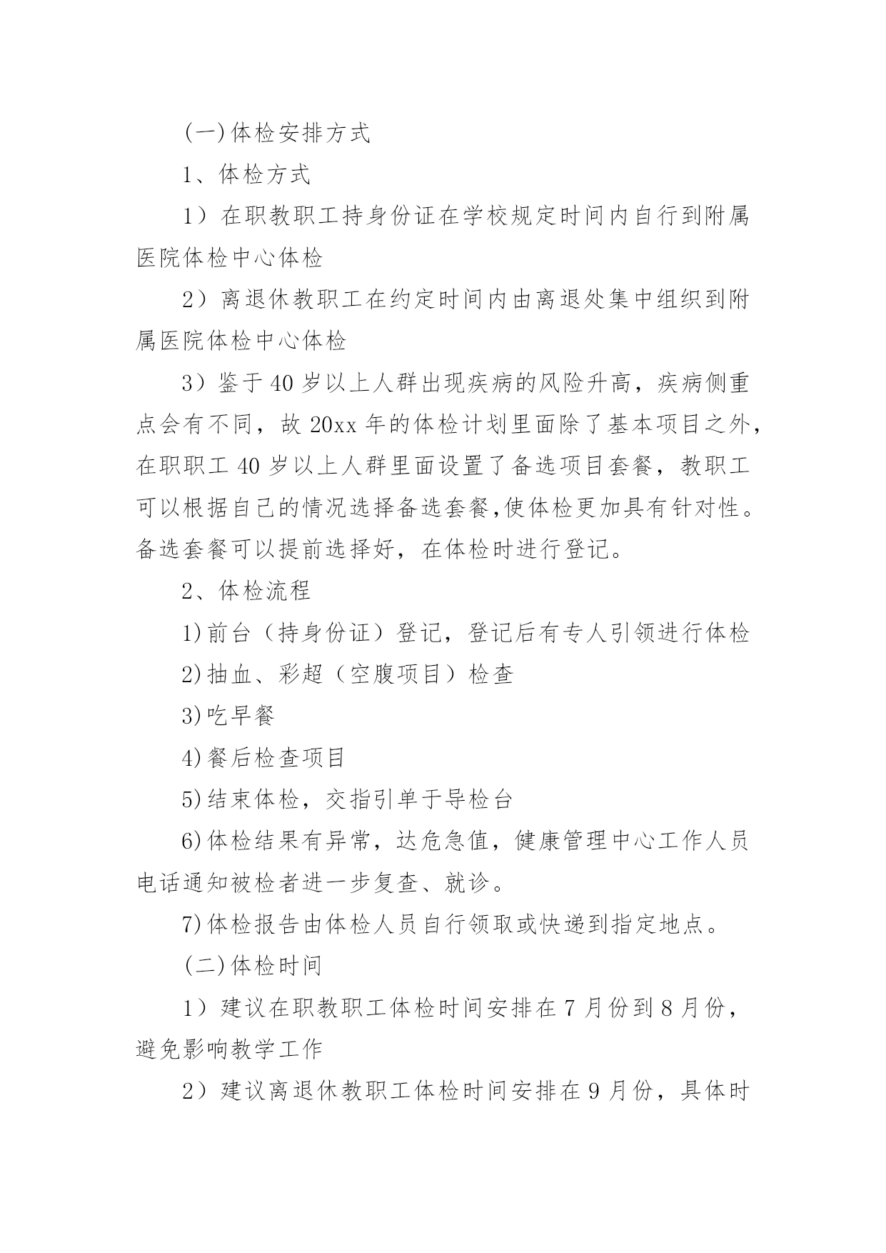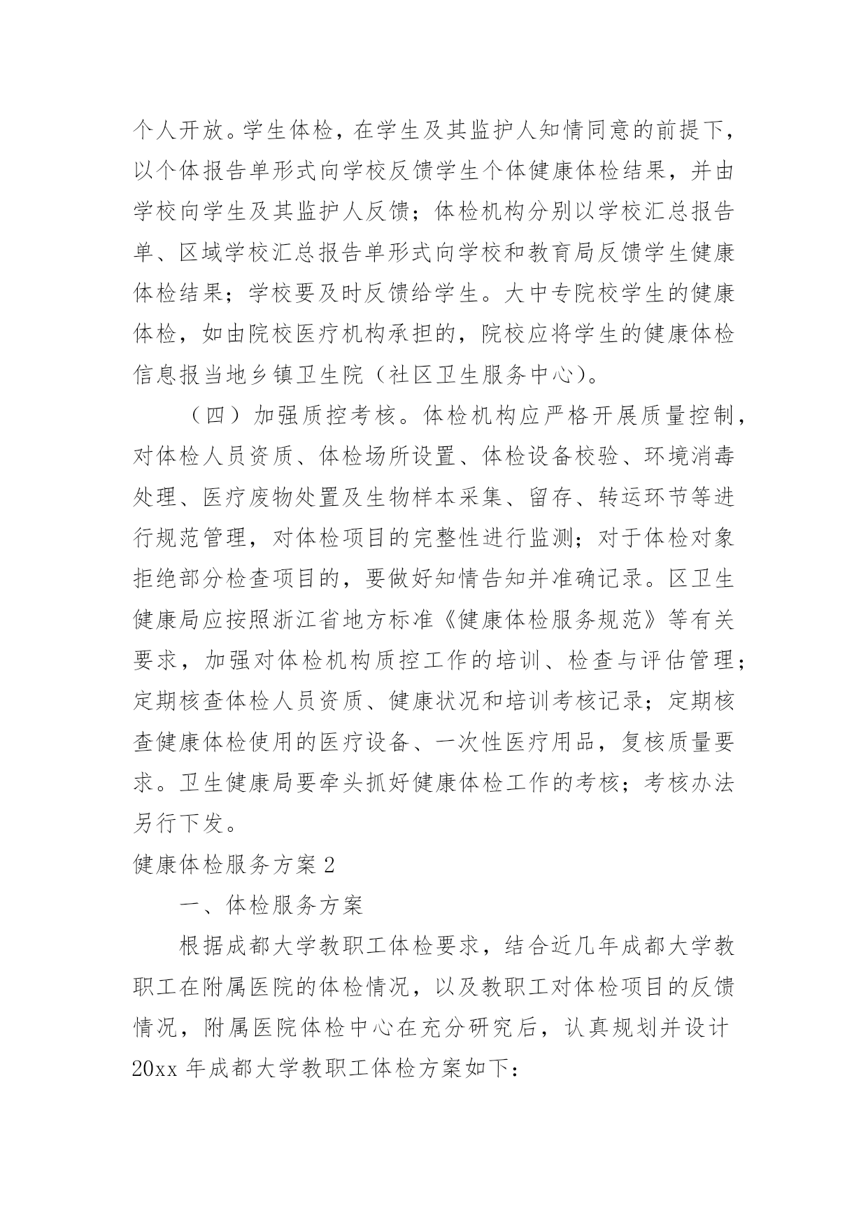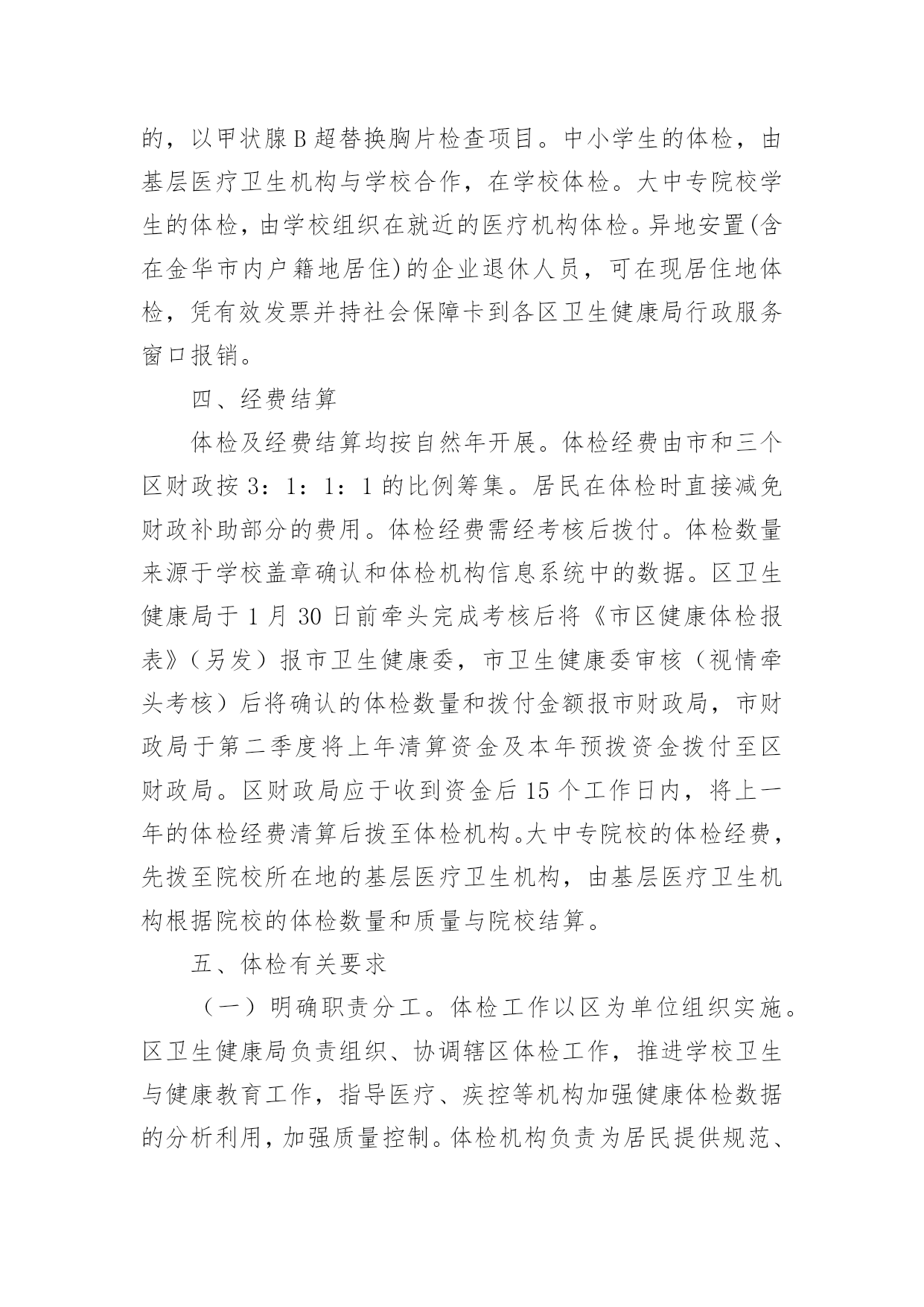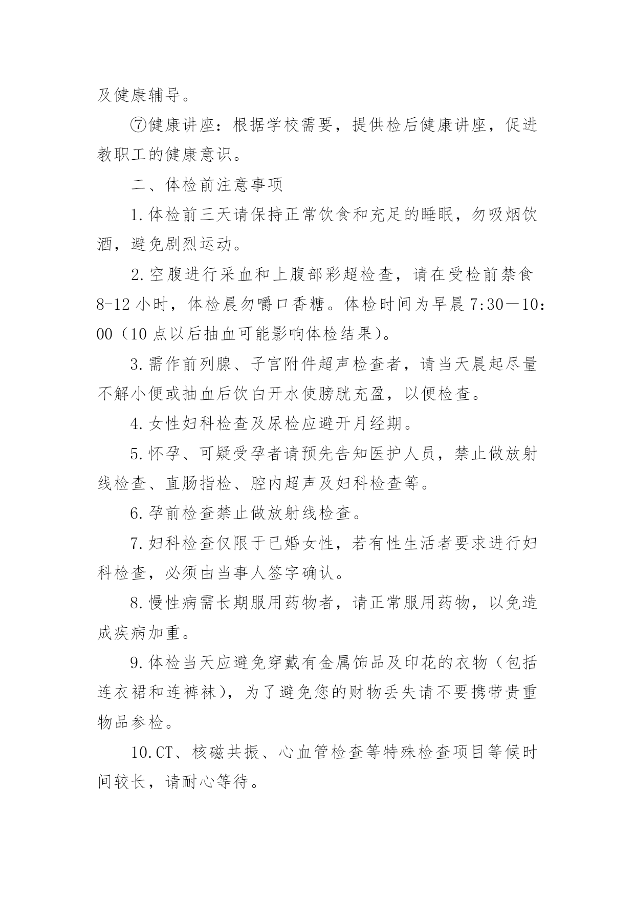 健康体检服务方案健康体检服务方案(实用10篇)为了确保事情或工作能无误进行,我们需要提前开始方案制定工作,一份好的方案一定会注重受众的参与性及互动性。那么应当如何制定方案呢?以下是小编整理的健康体检服务方案,仅供参考,希望能够帮助到大家。健康体检服务方案1为做好金华市区(婺城区、金东区、金华开发区)的中小学生、参保城乡居民和企业退休人员的健康体检工作,加强全人群健康管理,提升居民健康水平,制定本方案。一、适用范围在市区就读的中小学生、参加市区城乡居民基本医疗保险的人员、参加市区城镇职工基本医疗保险的企业退休人员。二、体检频率、项目及财政补助标准(一)中小学生每年体检一次,经费由财政承担,补助标准为35元/人次。体检项目按《国家卫生健康委教育部关于印发中小学生健康体检管理办法(20xx年版)的通知》(国卫医发〔20xx〕29号)执行。(二)参保城乡居民和企业退休人员1.体检频率与经费(1)65周岁及以上的参保城乡居民和企业退休人员,每年体检一次。体检项目包括基本项目和自选项目。基本项目的经费由财政承担,补助标准为90元/人次。自选项目:选择四类套餐的,由财政和居民个人各承担60元;选择个性化项目的,按医疗收费标准的60%收费,由财政和居民个人各承担50%,财政承担部分不高于60元/人次。65周岁以上居民的基本项目体检率应达到当年国家基本公共卫生项目的指标要求。(2)其它参保城乡居民(0-6岁儿童、中小学生除外)和65周岁以下的企业退休人员,每两年体检一次,体检项目为基本项目,经费由财政承担,补助标准为90元/人次,愿检尽检。截至20xx年12月31日已满60周岁且已参加过每年一次健康体检的参保居民和企业退休人员可参照65周岁及以上人群的政策执行。0-6岁儿童健康体检按国家基本公共卫生项目要求执行,体检经费在项目经费中安排。2.体检项目(1)基本项目:①一般检查:体温、呼吸、血压(双侧)、脉搏,身高、体重、腰围、体重指数;②五官检查:视力、巩膜,口唇、齿列,鼻、咽、喉、听力粗测判断;③内科常规检查:心肺听诊,腹部肝、脾触诊;④外科常规检查:皮肤、体表淋巴结、甲状腺、胸腹部、四肢关节、脊柱、运动功能粗测判断;⑤辅助检查:血常规、尿常规、空腹血糖、血脂(总胆固醇、甘油三酯、低密度脂蛋白胆固醇、高密度脂蛋白胆固醇)、肝功能(血清谷丙转氨酶、血清谷草转氨酶、总胆红素)、肾功能(血清肌酐、血尿素、血尿酸)、甲胎蛋白(AFP)、心电图、腹部B超(肝、胆、胰、脾、双肾)、胸片或DR(正位)检查。(2)自选项目:居民可在以下四类套餐中选择,也可根据自身情况自行选择个性化体检项目:①普通套餐:组合1:甲状腺功能检测、癌胚抗原、骨密度检测;组合2:碳14呼气试验、PSA(男性)、癌胚抗原、糖化血红蛋白。②高血压套餐:颈动脉B超、尿微量白蛋白/肌酐、尿微量白蛋白、眼底检查(眼底照相机检查)、电解质K+NA+CL-、同型半胱氨酸。③糖尿病套餐:颈动脉B超、尿微量白蛋白/肌酐、尿微量白蛋白、眼底检查、糖化血红蛋白、胰岛素抗体、C肽。④慢阻肺套餐:组合1:肺功能检测、碳14呼气试验;组合2:胸部CT。三、体检机构为落实分级诊疗政策,使居民获得综合、连续、便捷的`基本医疗和公共卫生服务,体检机构原则上为居民户籍地、居住地或学校所在地的基层医疗卫生机构(乡镇卫生院或社区卫生服务中心)。少数基层医疗卫生机构因设备不足,不具备胸片检查能力的,应动员居民到就近有能力的医疗机构检查胸片项目;经动员,居民仍不愿到就近的医疗机构检查的,以甲状腺B超替换胸片检查项目。中小学生的体检,由基层医疗卫生机构与学校合作,在学校体检。大中专院校学生的体检,由学校组织在就近的医疗机构体检。异地安置(含在金华市内户籍地居住)的企业退休人员,可在现居住地体检,凭有效发票并持社会保障卡到各区卫生健康局行政服务窗口报销。四、经费结算体检及经费结算均按自然年开展。体检经费由市和三个区财政按3:1:1:1的比例筹集。居民在体检时直接减免财政补助部分的费用。体检经费需经考核后拨付。体检数量来源于学校盖章确认和体检机构信息系统中的数据。区卫生健康局于1月30日前牵头完成考核后将《市区健康体检报表》(另发)报市卫生健康委,市卫生健康委审核(视情牵头考核)后将确认的体检数量和拨付金额报市财政局,市财政局于第二季度将上年清算资金及本年预拨资金拨付至区财政局。区财政局应于收到资金后15个工作日内,将上一年的体检经费清算后拨至体检机构。大中专院校的体检经费,先拨至院校所在地的基层医疗卫生机构,由基层医疗卫生机构根据院校的体检数量和质量与院校结算。五、体检有关要求(一)明确职责分工。体检工作以区为单位组织实施。区卫生健康局负责组织、协调辖区体检工作,推进学校卫生与健康教育工作,指导医疗、疾控等机构加强健康体检数