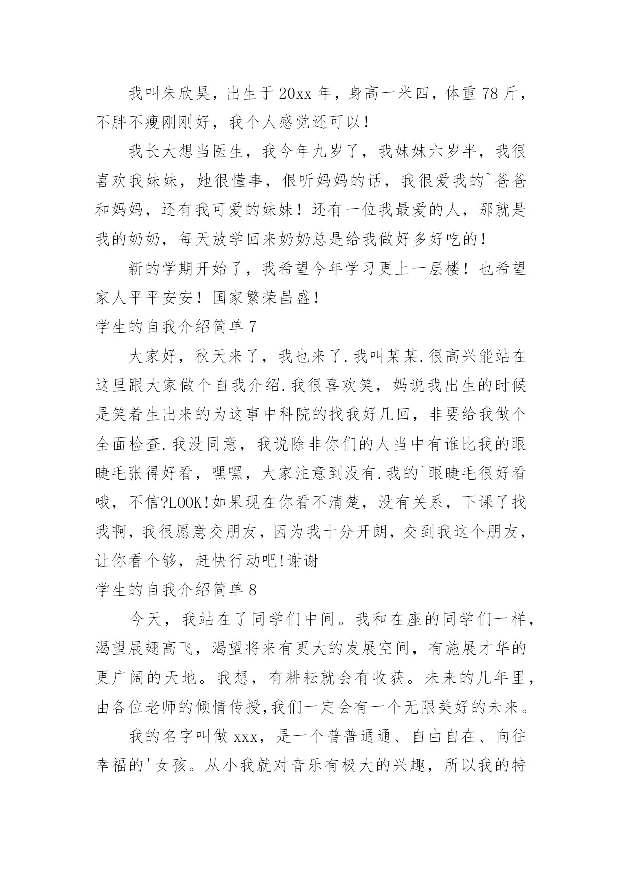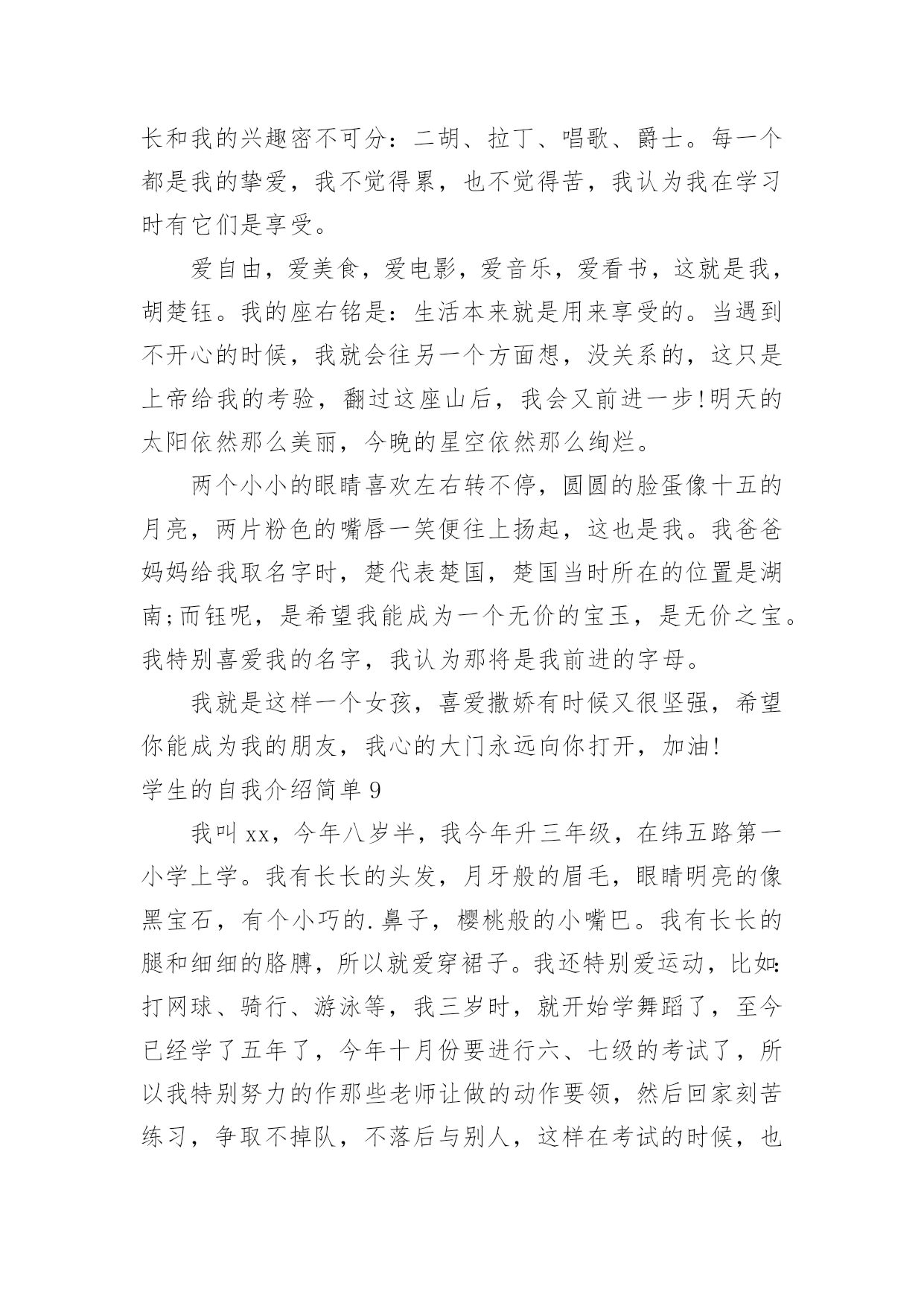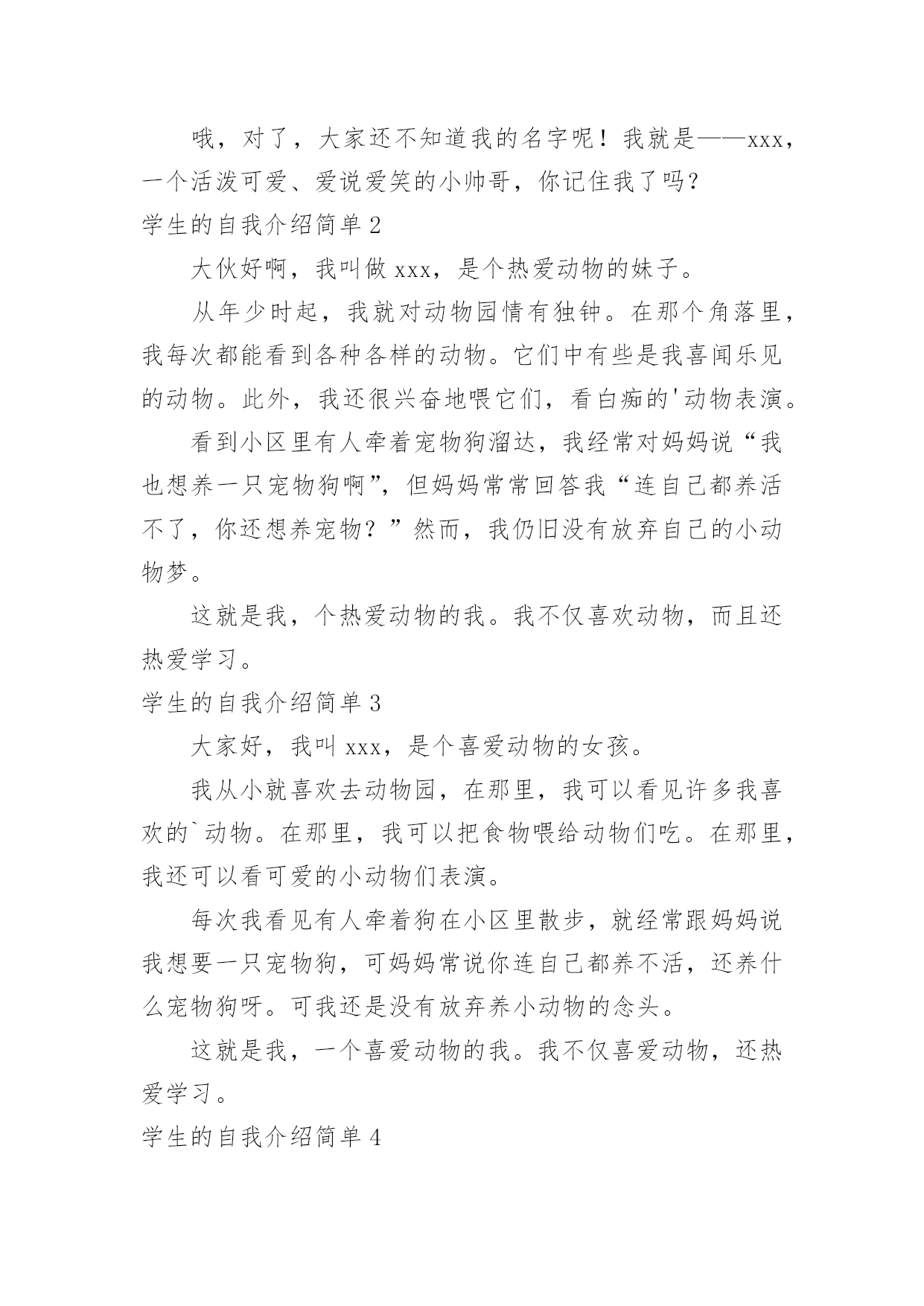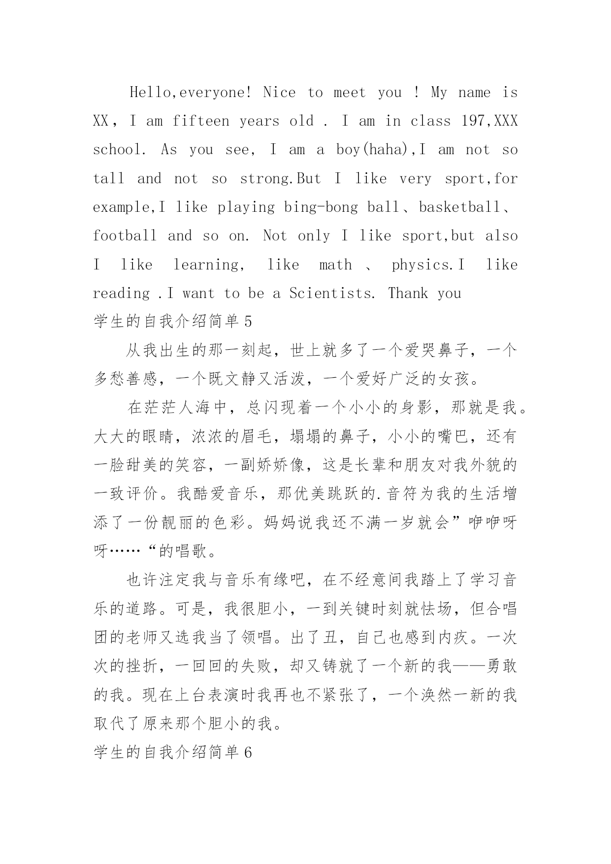 学生的自我介绍简单学生的自我介绍简单当进入一个陌生环境,可能需要我们进行自我介绍,自我介绍是人与人进行沟通的出发点。怎么写自我介绍才能避免踩雷呢?下面是小编为大家收集的学生的自我介绍简单,仅供参考,大家一起来看看吧。学生的自我介绍简单1我今年九岁,是个活泼可爱的三年级小学生。我有一头乌黑乌黑的短发,一张白里透红的脸蛋上面长着两道浓黑的眉毛,还有一双炯炯有神的大眼睛,那高高的鼻梁下面是一张红红的小嘴巴。我感觉自己的外貌还是蛮帅的呦。我是一个开朗的`小男孩,经常会和同学们讲一讲从电视上得来的小故事和一些发生在生活中的笑话,同学们都很乐意听我讲这些,时间久了我也交到了不少的好朋友。我喜欢运动,最感兴趣的体育项目是乒乓球。每个星期六的下午我都会去乒乓球俱乐部,跟随教练打几个小时的乒乓球,出一身大汗,那感觉别提多爽了。我还喜欢看书,每天晚上睡觉之前我都会看一会儿,通过阅读这些书籍我好像到达了另外一个神奇的世界。另外,我还比较喜欢弹钢琴,已经持续学习了四年,目前已通过了钢琴五级的专业考试。虽然练琴的时候会很枯燥,但是每当学会了一个新曲目,我都会感觉无比的骄傲。哦,对了,大家还不知道我的名字呢!我就是——xxx,一个活泼可爱、爱说爱笑的小帅哥,你记住我了吗?学生的自我介绍简单2大伙好啊,我叫做xxx,是个热爱动物的妹子。从年少时起,我就对动物园情有独钟。在那个角落里,我每次都能看到各种各样的动物。它们中有些是我喜闻乐见的动物。此外,我还很兴奋地喂它们,看白痴的'动物表演。看到小区里有人牵着宠物狗溜达,我经常对妈妈说“我也想养一只宠物狗啊”,但妈妈常常回答我“连自己都养活不了,你还想养宠物?”然而,我仍旧没有放弃自己的小动物梦。这就是我,个热爱动物的我。我不仅喜欢动物,而且还热爱学习。学生的自我介绍简单3大家好,我叫xxx,是个喜爱动物的女孩。我从小就喜欢去动物园,在那里,我可以看见许多我喜欢的`动物。在那里,我可以把食物喂给动物们吃。在那里,我还可以看可爱的小动物们表演。每次我看见有人牵着狗在小区里散步,就经常跟妈妈说我想要一只宠物狗,可妈妈常说你连自己都养不活,还养什么宠物狗呀。可我还是没有放弃养小动物的念头。这就是我,一个喜爱动物的我。我不仅喜爱动物,还热爱学习。学生的自我介绍简单4Hello,everyone!Nicetomeetyou!MynameisXX,Iamfifteenyearsold.Iaminclass197,XXXschool.Asyousee,Iamaboy(haha),Iamnotsotallandnotsostrong.ButIlikeverysport,forexample,Ilikeplayingbing-bongball、basketball、footballandsoon.NotonlyIlikesport,butalsoIlikelearning,likemath、physics.Ilikereading.IwanttobeaScientists.Thankyou学生的自我介绍简单5从我出生的那一刻起,世上就多了一个爱哭鼻子,一个多愁善感,一个既文静又活泼,一个爱好广泛的女孩。在茫茫人海中,总闪现着一个小小的身影,那就是我。大大的眼睛,浓浓的眉毛,塌塌的鼻子,小小的嘴巴,还有一脸甜美的笑容,一副娇娇像,这是长辈和朋友对我外貌的一致评价。我酷爱音乐,那优美跳跃的.音符为我的生活增添了一份靓丽的色彩。妈妈说我还不满一岁就会”咿咿呀呀……“的唱歌。也许注定我与音乐有缘吧,在不经意间我踏上了学习音乐的道路。可是,我很胆小,一到关键时刻就怯场,但合唱团的老师又选我当了领唱。出了丑,自己也感到内疚。一次次的挫折,一回回的失败,却又铸就了一个新的我——勇敢的我。现在上台表演时我再也不紧张了,一个涣然一新的我取代了原来那个胆小的我。学生的自我介绍简单6我叫朱欣昊,出生于20xx年,身高一米四,体重78斤,不胖不瘦刚刚好,我个人感觉还可以!我长大想当医生,我今年九岁了,我妹妹六岁半,我很喜欢我妹妹,她很懂事,佷听妈妈的话,我很爱我的`爸爸和妈妈,还有我可爱的妹妹!还有一位我最爱的人,那就是我的奶奶,每天放学回来奶奶总是给我做好多好吃的!新的学期开始了,我希望今年学习更上一层楼!也希望家人平平安安!国家繁荣昌盛!学生的自我介绍简单7大家好,秋天来了,我也来了.我叫某某.很高兴能站在这里跟大家做个自我介绍.我很喜欢笑,妈说我出生的时候是笑着生出来的为这事中科院的找我好几回,非要给我做个全面检查.我没同意,我说除非你们的人当中有谁比我的眼睫毛张得好看,嘿嘿,大家注意到没有.我的`眼睫毛很好看哦,不信?LOOK!如果现在你看不清楚,没有关系,下课了找我啊,我很愿意交朋友,因为我十分开朗,交到我这个朋友,让你看个够,赶快行动吧