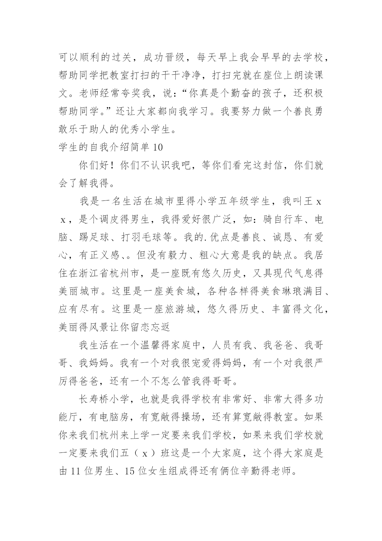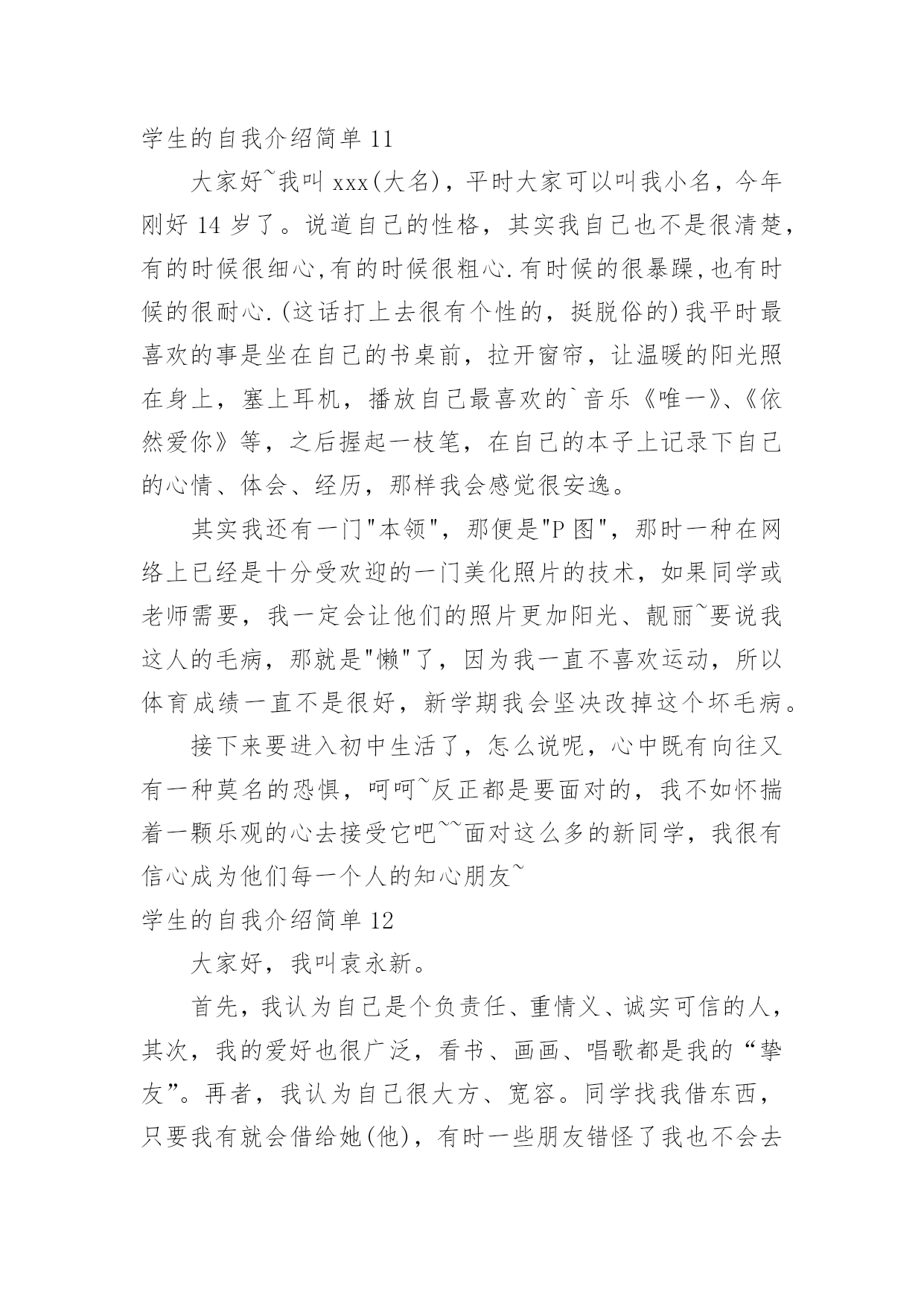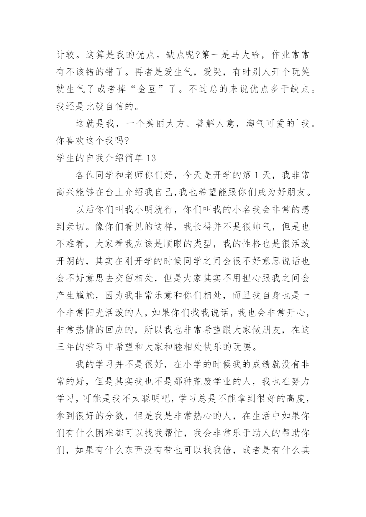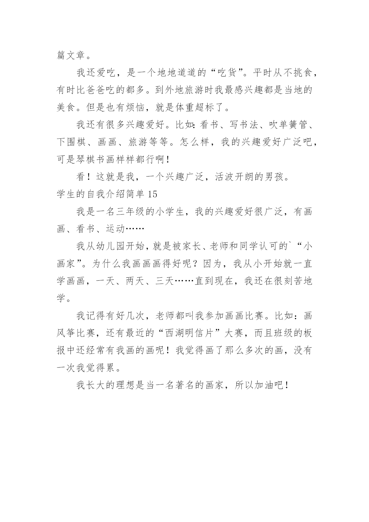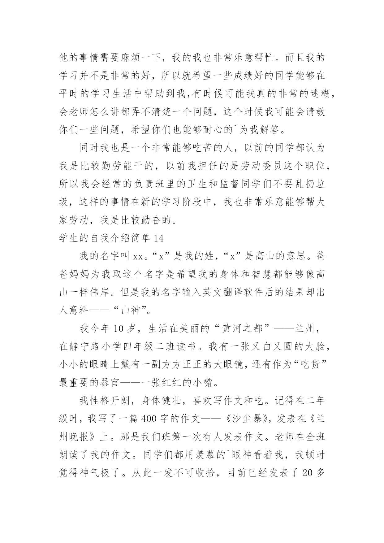 学生的自我介绍简单学生的自我介绍简单当进入一个陌生环境,可能需要我们进行自我介绍,自我介绍是人与人进行沟通的出发点。怎么写自我介绍才能避免踩雷呢?下面是小编为大家收集的学生的自我介绍简单,仅供参考,大家一起来看看吧。学生的自我介绍简单1我今年九岁,是个活泼可爱的三年级小学生。我有一头乌黑乌黑的短发,一张白里透红的脸蛋上面长着两道浓黑的眉毛,还有一双炯炯有神的大眼睛,那高高的鼻梁下面是一张红红的小嘴巴。我感觉自己的外貌还是蛮帅的呦。我是一个开朗的`小男孩,经常会和同学们讲一讲从电视上得来的小故事和一些发生在生活中的笑话,同学们都很乐意听我讲这些,时间久了我也交到了不少的好朋友。我喜欢运动,最感兴趣的体育项目是乒乓球。每个星期六的下午我都会去乒乓球俱乐部,跟随教练打几个小时的乒乓球,出一身大汗,那感觉别提多爽了。我还喜欢看书,每天晚上睡觉之前我都会看一会儿,通过阅读这些书籍我好像到达了另外一个神奇的世界。另外,我还比较喜欢弹钢琴,已经持续学习了四年,目前已通过了钢琴五级的专业考试。虽然练琴的时候会很枯燥,但是每当学会了一个新曲目,我都会感觉无比的骄傲。哦,对了,大家还不知道我的名字呢!我就是——xxx,一个活泼可爱、爱说爱笑的小帅哥,你记住我了吗?学生的自我介绍简单2大伙好啊,我叫做xxx,是个热爱动物的妹子。从年少时起,我就对动物园情有独钟。在那个角落里,我每次都能看到各种各样的动物。它们中有些是我喜闻乐见的动物。此外,我还很兴奋地喂它们,看白痴的'动物表演。看到小区里有人牵着宠物狗溜达,我经常对妈妈说“我也想养一只宠物狗啊”,但妈妈常常回答我“连自己都养活不了,你还想养宠物?”然而,我仍旧没有放弃自己的小动物梦。这就是我,个热爱动物的我。我不仅喜欢动物,而且还热爱学习。学生的自我介绍简单3大家好,我叫xxx,是个喜爱动物的女孩。我从小就喜欢去动物园,在那里,我可以看见许多我喜欢的`动物。在那里,我可以把食物喂给动物们吃。在那里,我还可以看可爱的小动物们表演。每次我看见有人牵着狗在小区里散步,就经常跟妈妈说我想要一只宠物狗,可妈妈常说你连自己都养不活,还养什么宠物狗呀。可我还是没有放弃养小动物的念头。这就是我,一个喜爱动物的我。我不仅喜爱动物,还热爱学习。学生的自我介绍简单4Hello,everyone!Nicetomeetyou!MynameisXX,Iamfifteenyearsold.Iaminclass197,XXXschool.Asyousee,Iamaboy(haha),Iamnotsotallandnotsostrong.ButIlikeverysport,forexample,Ilikeplayingbing-bongball、basketball、footballandsoon.NotonlyIlikesport,butalsoIlikelearning,likemath、physics.Ilikereading.IwanttobeaScientists.Thankyou学生的自我介绍简单5从我出生的那一刻起,世上就多了一个爱哭鼻子,一个多愁善感,一个既文静又活泼,一个爱好广泛的女孩。在茫茫人海中,总闪现着一个小小的身影,那就是我。大大的眼睛,浓浓的眉毛,塌塌的鼻子,小小的嘴巴,还有一脸甜美的笑容,一副娇娇像,这是长辈和朋友对我外貌的一致评价。我酷爱音乐,那优美跳跃的.音符为我的生活增添了一份靓丽的色彩。妈妈说我还不满一岁就会”咿咿呀呀……“的唱歌。也许注定我与音乐有缘吧,在不经意间我踏上了学习音乐的道路。可是,我很胆小,一到关键时刻就怯场,但合唱团的老师又选我当了领唱。出了丑,自己也感到内疚。一次次的挫折,一回回的失败,却又铸就了一个新的我——勇敢的我。现在上台表演时我再也不紧张了,一个涣然一新的我取代了原来那个胆小的我。学生的自我介绍简单6我叫朱欣昊,出生于20xx年,身高一米四,体重78斤,不胖不瘦刚刚好,我个人感觉还可以!我长大想当医生,我今年九岁了,我妹妹六岁半,我很喜欢我妹妹,她很懂事,佷听妈妈的话,我很爱我的`爸爸和妈妈,还有我可爱的妹妹!还有一位我最爱的人,那就是我的奶奶,每天放学回来奶奶总是给我做好多好吃的!新的学期开始了,我希望今年学习更上一层楼!也希望家人平平安安!国家繁荣昌盛!学生的自我介绍简单7大家好,秋天来了,我也来了.我叫某某.很高兴能站在这里跟大家做个自我介绍.我很喜欢笑,妈说我出生的时候是笑着生出来的为这事中科院的找我好几回,非要给我做个全面检查.我没同意,我说除非你们的人当中有谁比我的眼睫毛张得好看,嘿嘿,大家注意到没有.我的`眼睫毛很好看哦,不信?LOOK!如果现在你看不清楚,没有关系,下课了找我啊,我很愿意交朋友,因为我十分开朗,交到我这个朋友,让你看个够,赶快行动吧