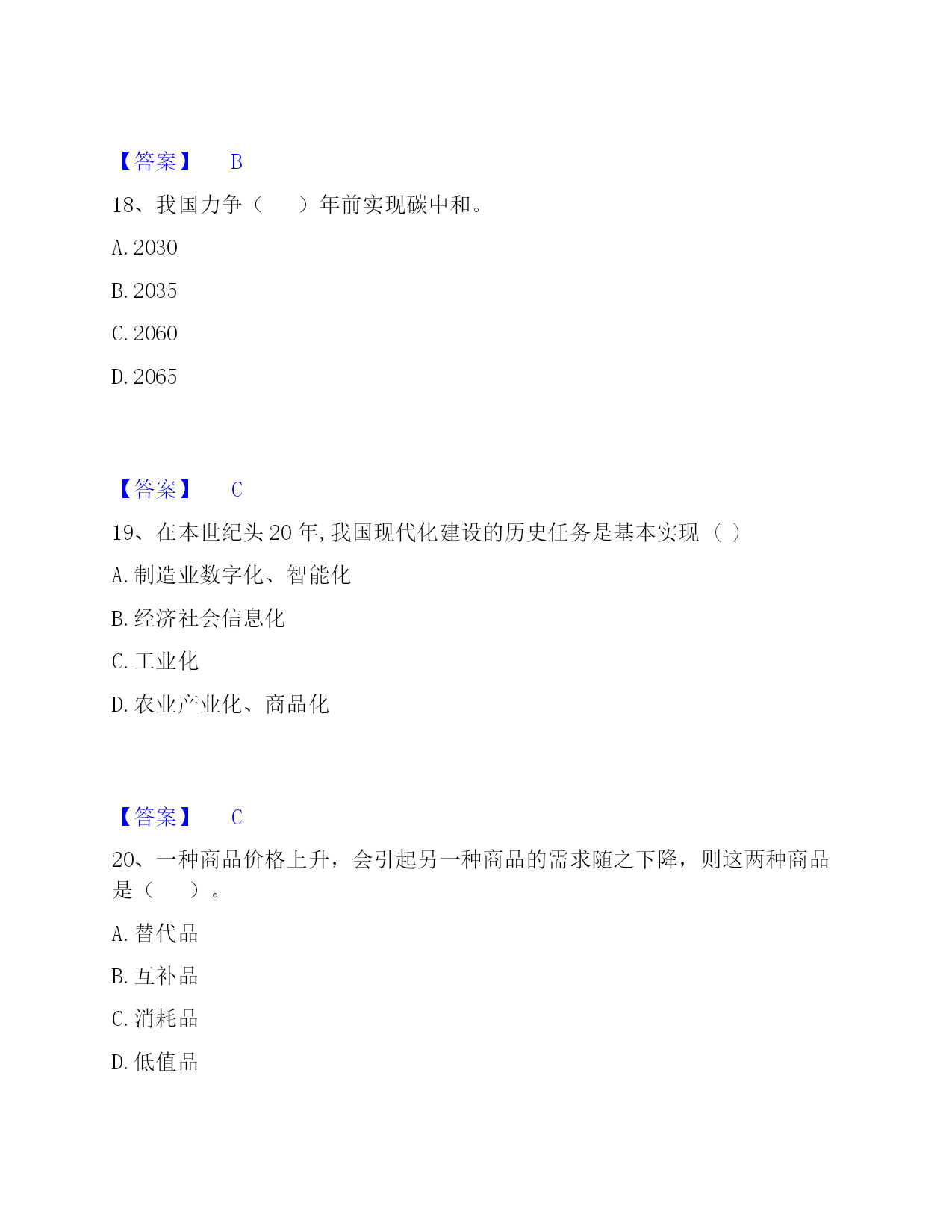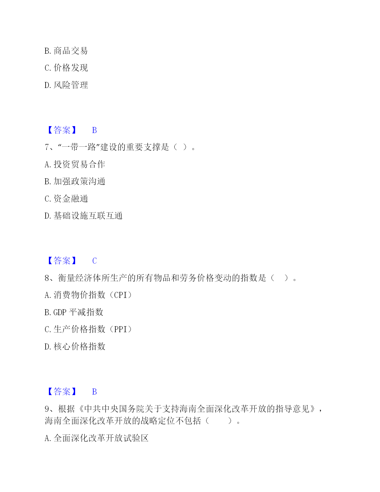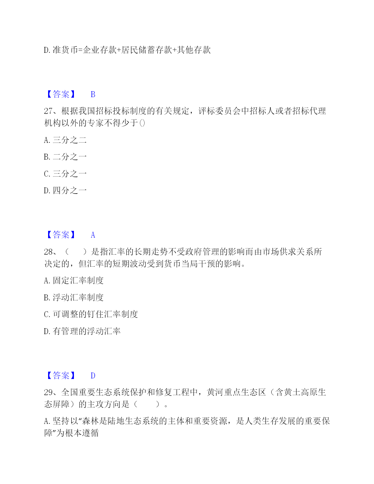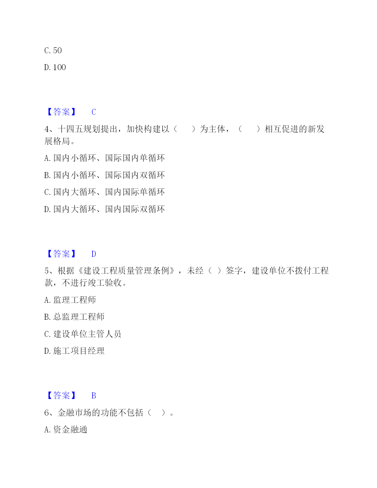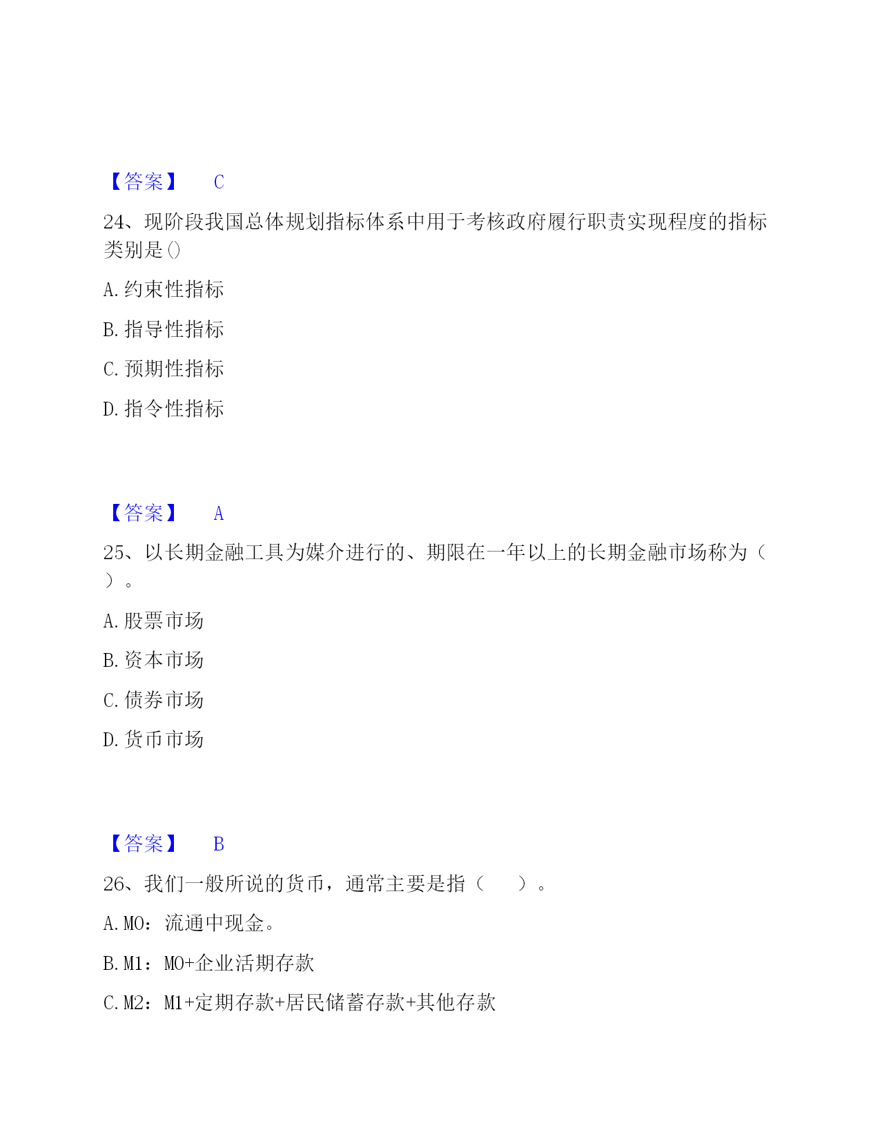 2023年咨询工程师之宏观经济政策与发展规划每日一练试卷A卷含答案单选题(共50题)1、下列各项关于大力发展直接融资的说法正确的是()。A.依托国家拓宽投资项目融资渠道B.支持有虚拟经济活动支撑的资产证券化C.优化金融资源配置,更好地服务投资兴业D.开展政府机构以适当方式依法持有企业股权试点【答案】C2、影响总供给的基本决定因素是()。A.货币政策B.生产成本C.财政政策D.潜在产出【答案】D3、采购经理指数(PMI)是监测经济运行的先行指标。反映经济运行荣枯分水线的PMI值是()。A.10B.30C.50D.100【答案】C4、十四五规划提出,加快构建以()为主体,()相互促进的新发展格局。A.国内小循环、国际国内单循环B.国内小循环、国际国内双循环C.国内大循环、国内国际单循环D.国内大循环、国内国际双循环【答案】D5、根据《建设工程质量管理条例》,未经()签字,建设单位不拨付工程款,不进行竣工验收。A.监理工程师B.总监理工程师C.建设单位主管人员D.施工项目经理【答案】B6、金融市场的功能不包括()。A.资金融通B.商品交易C.价格发现D.风险管理【答案】B7、“一带一路”建设的重要支撑是()。A.投资贸易合作B.加强政策沟通C.资金融通D.基础设施互联互通【答案】C8、衡量经济体所生产的所有物品和劳务价格变动的指数是()。A.消费物价指数(CPI)B.GDP平减指数C.生产价格指数(PPI)D.核心价格指数【答案】B9、根据《中共中央国务院关于支持海南全面深化改革开放的指导意见》,海南全面深化改革开放的战略定位不包括()。A.全面深化改革开放试验区B.国家生态文明试验区C.国际旅游消费中心D.宜居宜业宜游的优质生活圈【答案】D10、我国“十一五”规划纲要中的量化指标分为()两类。A.指导性和指令性B.预期性和约束性C.预期性和指导性D.导向性和强制性【答案】B11、根据《“十二五”节能减排综合性工作方案》,关于加强工业节能减排的说法,正确的是()A.重点推进电力、煤炭、钢铁、有色金属等行业节能减排B.单机总容量20万千瓦及以上燃煤机组全部加装脱硝设施C.以滇池为重点,开展重点金属污染治理与修复试点示范D.对城市污水排放实行主要污染物排放总量控制【答案】A12、《国家高新技术产业开发区“十三五”发展规划》目标,到“十三五”末,国家高新区数量将达到()家左右。A.552B.240C.310D.604【答案】B13、不属于消费税纳税环节的是()。A.生产B.进口C.出口D.零售【答案】C14、太多的货币追逐有限的货物引起的一般物价水平的持续上涨属于()。A.结构性通货膨胀B.成本推动型通货膨胀C.需求拉动型通货膨胀D.需求拉动与成本推动相互作用型通货膨胀【答案】C15、在国民经济的三大需求中,()是最具决定性的变量,它的增减对国民经济状况关系甚大。A.消费需求B.固定资产投资C.政府需求D.净出口【答案】B16、(2021年真题)在工程咨询中,产业政策是项目评估、规划咨询、投资策划、政策研究等工作的()。A.主要工具B.重要目标C.重要依据D.重要手段【答案】C17、市县和乡镇国土空间规划是本级政府对上级国土空间规划要求的细化落实,是对本行政区域开发保护作出的具体安排,侧重()。A.全面性B.实施性C.协调性D.战略性【答案】B18、我国力争()年前实现碳中和。A.2030B.2035C.2060D.2065【答案】C19、在本世纪头20年,我国现代化建设的历史任务是基本实现()A.制造业数字化、智能化B.经济社会信息化C.工业化D.农业产业化、商品化【答案】C20、一种商品价格上升,会引起另一种商品的需求随之下降,则这两种商品是()。A.替代品B.互补品C.消耗品D.低值品【答案】B21、新型基础设施是以新发展理念为引领,以技术创新为驱动,以()为基础,面向高质量发展需要,提供数字转型、智能升级、融合创新等服务的基础设施体系。A.信息网络B.智能制造C.数字创新D.技术升级【答案】A22、在汇率制度的安排上,目前世界上多数国家实行的是()A.固定汇率制度B.金本位制度C.自由浮动汇率制度D.有管理的浮动汇率制度【答案】D23、目前,我国机场项目的最低资本金比例是()。A.35%B.30%C.25%D.20%【答案】C24、现阶段我国总体规划指标体系中用于考