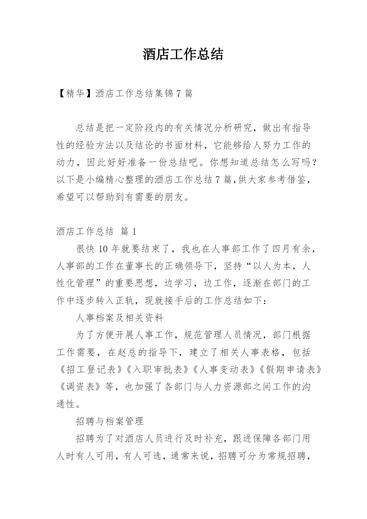 酒店工作总结【精华】酒店工作总结集锦7篇总结是把一定阶段内的有关情况分析研究,做出有指导性的经验方法以及结论的书面材料,它能够给人努力工作的动力,因此好好准备一份总结吧。你想知道总结怎么写吗?以下是小编精心整理的酒店工作总结7篇,供大家参考借鉴,希望可以帮助到有需要的朋友。酒店工作总结篇1很快10年就要结束了,我也在人事部工作了四月有余,人事部的工作在董事长的正确领导下,坚持“以人为本,人性化管理”的重要思想,边学习,边工作,逐渐在部门的工作中逐步转入正轨,现就接手后的工作总结如下:人事档案及相关资料为了