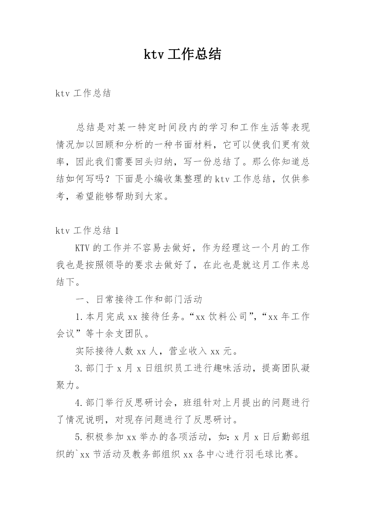 ktv工作总结ktv工作总结总结是对某一特定时间段内的学习和工作生活等表现情况加以回顾和分析的一种书面材料,它可以使我们更有效率,因此我们需要回头归纳,写一份总结了。那么你知道总结如何写吗?下面是小编收集整理的ktv工作总结,仅供参考,希望能够帮助到大家。ktv工作总结1KTV的工作并不容易去做好,作为经理这一个月的工作我也是按照领导的要求去做好了,在此也是就这月工作来总结下。一、日常接待工作和部门活动1.本月完成xx接待任务。“xx饮料公司”,“xx年工作会议”等十余支团队。实际接待人数xx人,营业收入