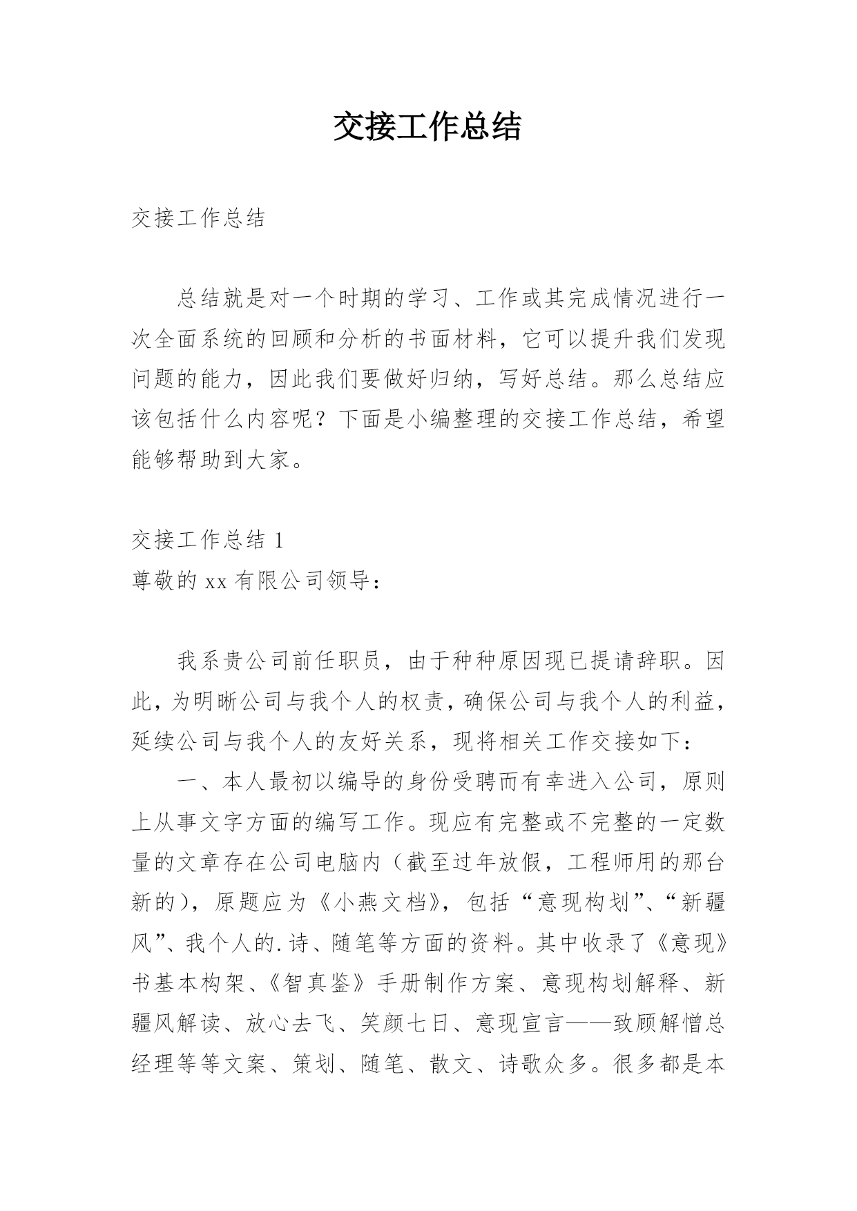 交接工作总结交接工作总结总结就是对一个时期的学习、工作或其完成情况进行一次全面系统的回顾和分析的书面材料,它可以提升我们发现问题的能力,因此我们要做好归纳,写好总结。那么总结应该包括什么内容呢?下面是小编整理的交接工作总结,希望能够帮助到大家。交接工作总结1尊敬的xx有限公司领导:我系贵公司前任职员,由于种种原因现已提请辞职。因此,为明晰公司与我个人的权责,确保公司与我个人的利益,延续公司与我个人的友好关系,现将相关工作交接如下:一、本人最初以编导的身份受聘而有幸进入公司,原则上从事文字方面的编写工作。现