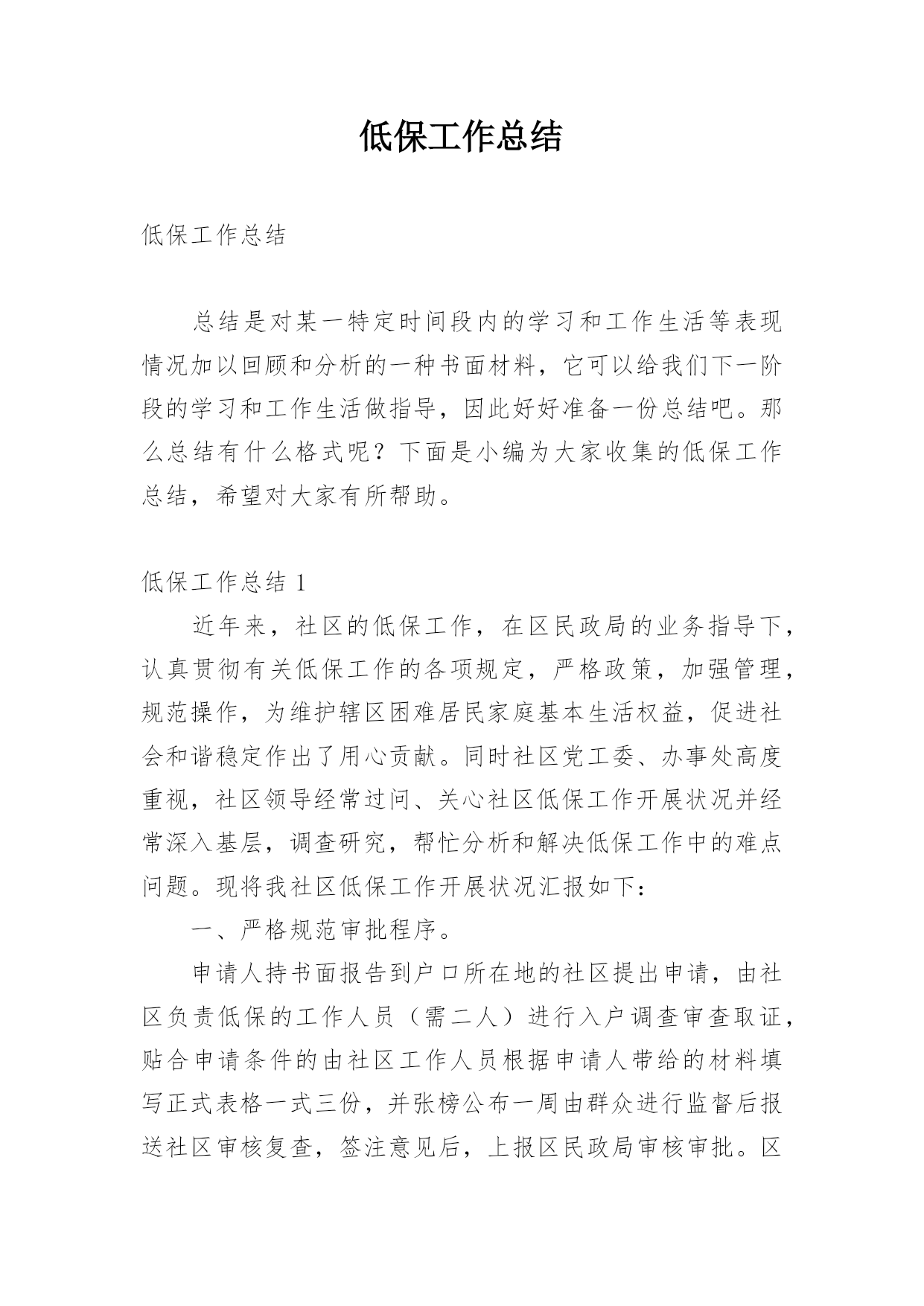 低保工作总结低保工作总结总结是对某一特定时间段内的学习和工作生活等表现情况加以回顾和分析的一种书面材料,它可以给我们下一阶段的学习和工作生活做指导,因此好好准备一份总结吧。那么总结有什么格式呢?下面是小编为大家收集的低保工作总结,希望对大家有所帮助。低保工作总结1近年来,社区的低保工作,在区民政局的业务指导下,认真贯彻有关低保工作的各项规定,严格政策,加强管理,规范操作,为维护辖区困难居民家庭基本生活权益,促进社会和谐稳定作出了用心贡献。同时社区党工委、办事处高度重视,社区领导经常过问、关心社区低保工作开