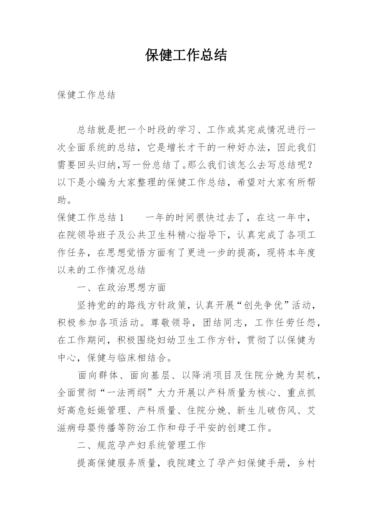 保健工作总结保健工作总结总结就是把一个时段的学习、工作或其完成情况进行一次全面系统的总结,它是增长才干的一种好办法,因此我们需要回头归纳,写一份总结了。那么我们该怎么去写总结呢?以下是小编为大家整理的保健工作总结,希望对大家有所帮助。保健工作总结1一年的时间很快过去了,在这一年中,在院领导班子及公共卫生科精心指导下,认真完成了各项工作任务,在思想觉悟方面有了更进一步的提高,现将本年度以来的工作情况总结一、在政治思想方面坚持党的的路线方针政策,认真开展“创先争优”活动,积极参加各项活动。尊敬领导,团结同志,