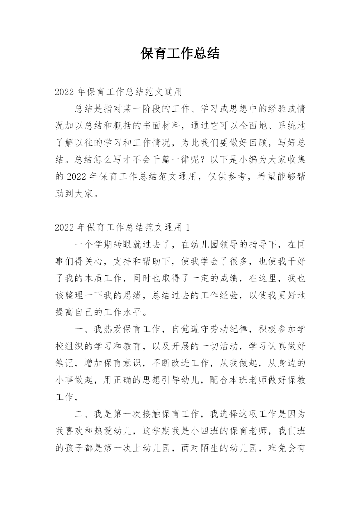 保育工作总结2022年保育工作总结范文通用总结是指对某一阶段的工作、学习或思想中的经验或情况加以总结和概括的书面材料,通过它可以全面地、系统地了解以往的学习和工作情况,为此我们要做好回顾,写好总结。总结怎么写才不会千篇一律呢?以下是小编为大家收集的2022年保育工作总结范文通用,仅供参考,希望能够帮助到大家。2022年保育工作总结范文通用1一个学期转眼就过去了,在幼儿园领导的指导下,在同事们得关心,支持和帮助下,使我学会了很多,也使我干好了我的本质工作,同时也取得了一定的成绩,在这里,我也该整理一下我的思