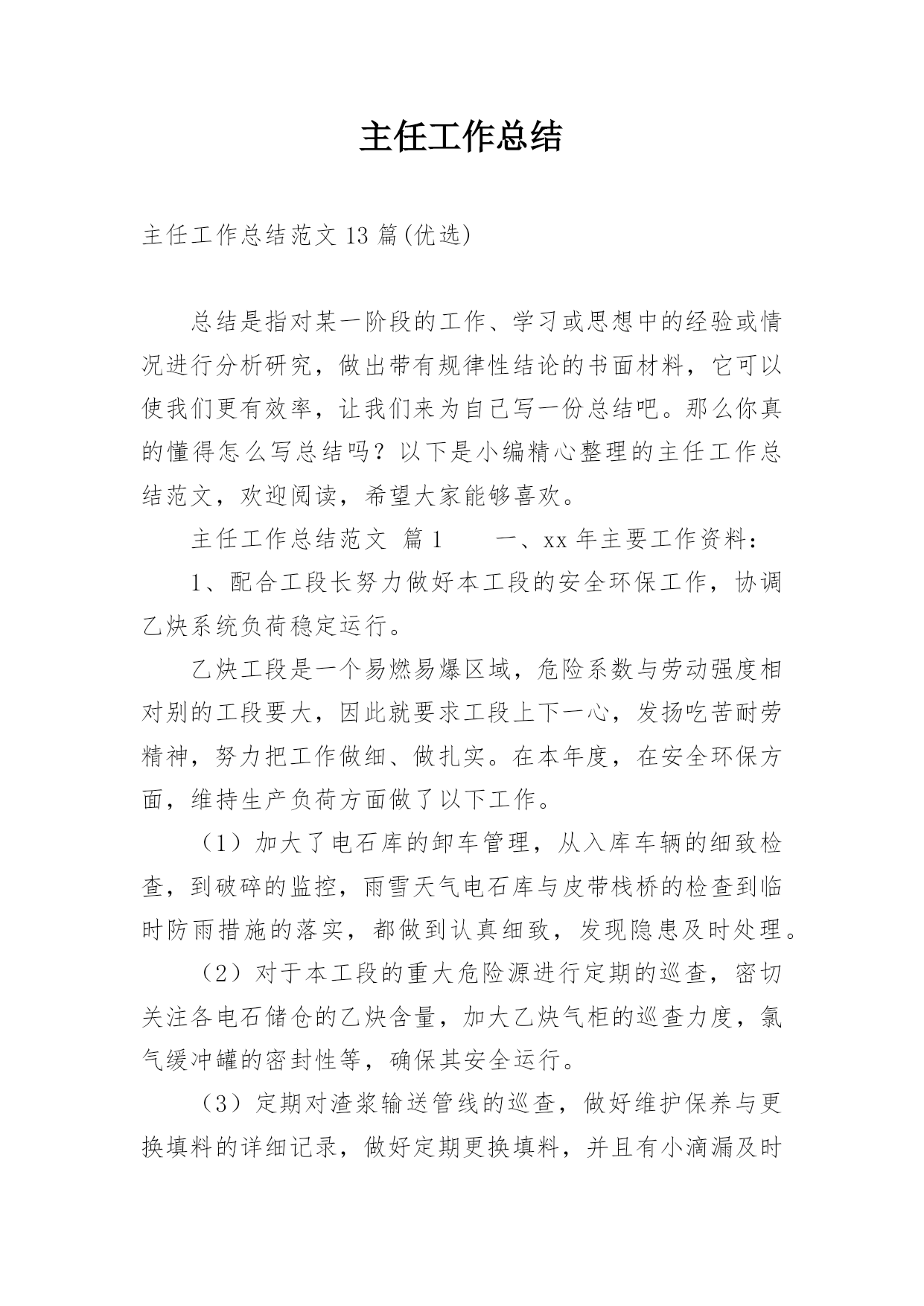 主任工作总结主任工作总结范文13篇(优选)总结是指对某一阶段的工作、学习或思想中的经验或情况进行分析研究,做出带有规律性结论的书面材料,它可以使我们更有效率,让我们来为自己写一份总结吧。那么你真的懂得怎么写总结吗?以下是小编精心整理的主任工作总结范文,欢迎阅读,希望大家能够喜欢。主任工作总结范文篇1一、xx年主要工作资料:1、配合工段长努力做好本工段的安全环保工作,协调乙炔系统负荷稳定运行。乙炔工段是一个易燃易爆区域,危险系数与劳动强度相对别的工段要大,因此就要求工段上下一心,发扬吃苦耐劳精神,努力把工作