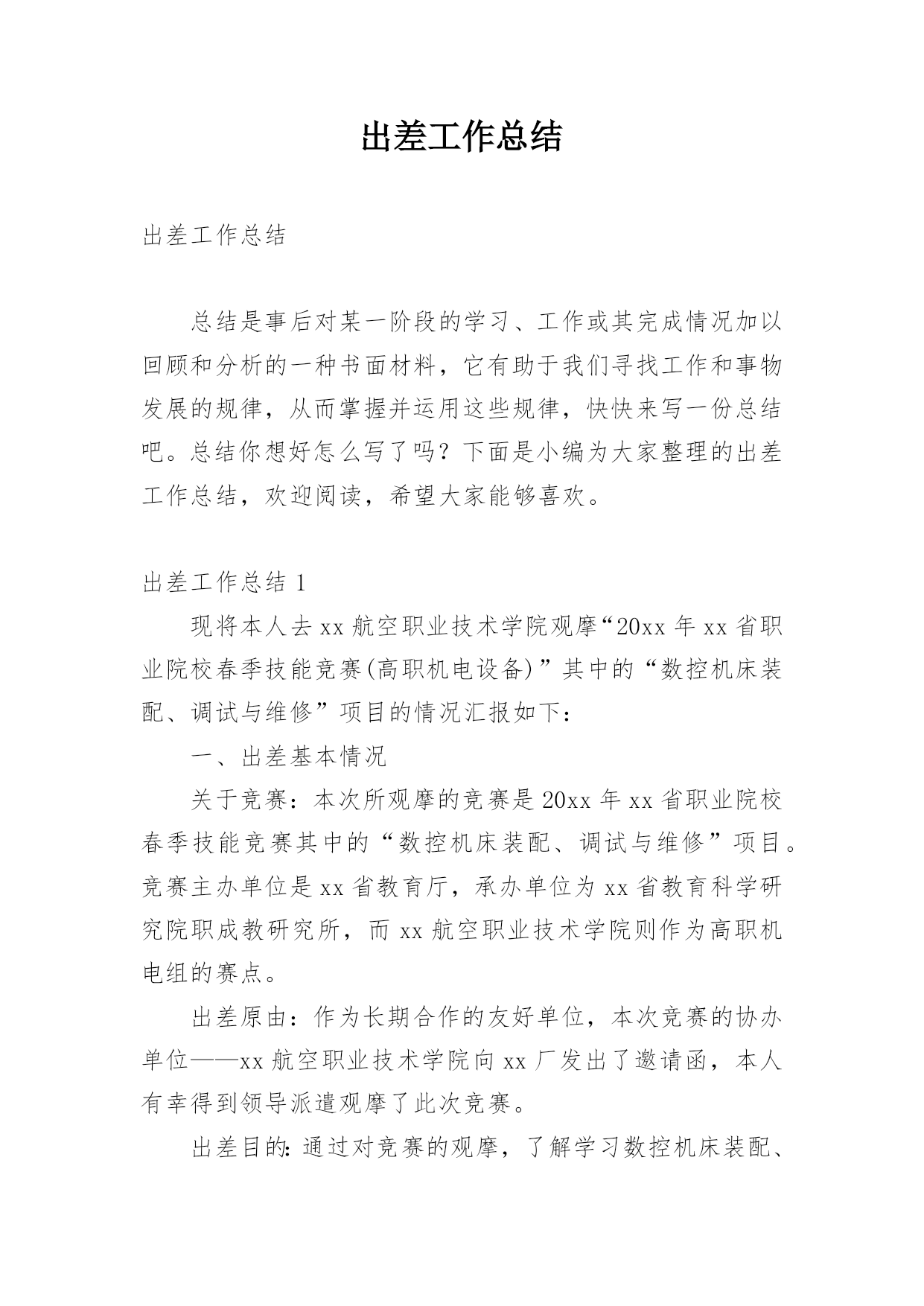 出差工作总结出差工作总结总结是事后对某一阶段的学习、工作或其完成情况加以回顾和分析的一种书面材料,它有助于我们寻找工作和事物发展的规律,从而掌握并运用这些规律,快快来写一份总结吧。总结你想好怎么写了吗?下面是小编为大家整理的出差工作总结,欢迎阅读,希望大家能够喜欢。出差工作总结1现将本人去xx航空职业技术学院观摩“20xx年xx省职业院校春季技能竞赛(高职机电设备)”其中的“数控机床装配、调试与维修”项目的情况汇报如下:一、出差基本情况关于竞赛:本次所观摩的竞赛是20xx年xx省职业院校春季技能竞赛其中的