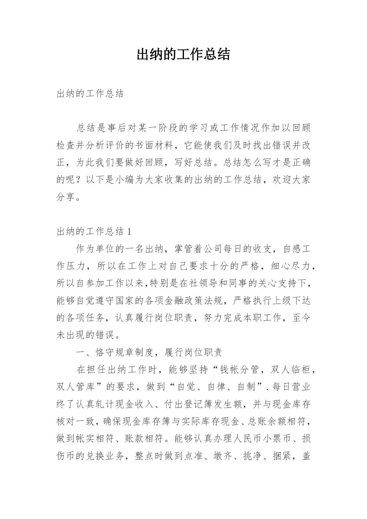 出纳的工作总结出纳的工作总结总结是事后对某一阶段的学习或工作情况作加以回顾检查并分析评价的书面材料,它能使我们及时找出错误并改正,为此我们要做好回顾,写好总结。总结怎么写才是正确的呢?以下是小编为大家收集的出纳的工作总结,欢迎大家分享。出纳的工作总结1作为单位的一名出纳,掌管着公司每日的收支,自感工作压力,所以在工作上对自己要求十分的严格,细心尽力,所以自参加工作以来,特别是在社领导和同事的关心支持下,能够自觉遵守国家的各项金融政策法规,严格执行上级下达的各项任务,认真履行岗位职责,努力完成本职工作,至今