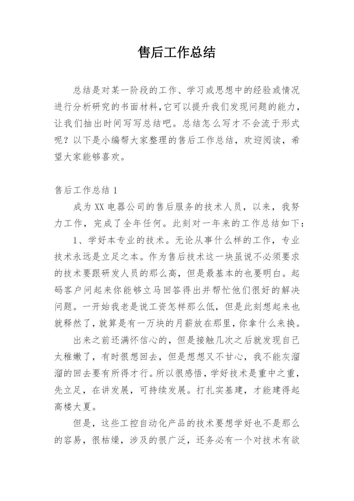 售后工作总结总结是对某一阶段的工作、学习或思想中的经验或情况进行分析研究的书面材料,它可以提升我们发现问题的能力,让我们抽出时间写写总结吧。总结怎么写才不会流于形式呢?以下是小编帮大家整理的售后工作总结,欢迎阅读,希望大家能够喜欢。售后工作总结1成为XX电器公司的售后服务的技术人员,以来,我努力工作,完成了全年任何。此刻对一年来的工作总结如下:1、学好本专业的技术。无论从事什么样的工作,专业技术永远是立足之本。作为售后技术这一块虽说不必须要求的技术要跟研发人员的那么高,但是最基本的也要明白。起码客户问起来