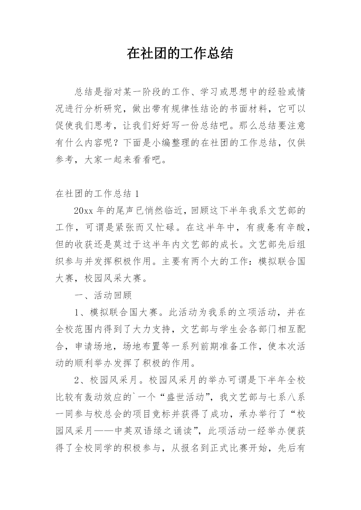 在社团的工作总结总结是指对某一阶段的工作、学习或思想中的经验或情况进行分析研究,做出带有规律性结论的书面材料,它可以促使我们思考,让我们好好写一份总结吧。那么总结要注意有什么内容呢?下面是小编整理的在社团的工作总结,仅供参考,大家一起来看看吧。在社团的工作总结120xx年的尾声已悄然临近,回顾这下半年我系文艺部的工作,可谓是紧张而又忙碌。在这半年中,有疲惫有辛酸,但的收获还是莫过于这半年内文艺部的成长。文艺部先后组织参与并发挥积极作用。主要有两个大的工作:模拟联合国大赛,校园风采大赛。一、活动回顾1、模拟