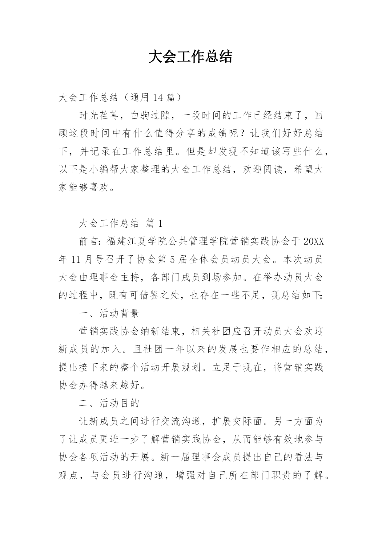 大会工作总结大会工作总结(通用14篇)时光荏苒,白驹过隙,一段时间的工作已经结束了,回顾这段时间中有什么值得分享的成绩呢?让我们好好总结下,并记录在工作总结里。但是却发现不知道该写些什么,以下是小编帮大家整理的大会工作总结,欢迎阅读,希望大家能够喜欢。大会工作总结篇1前言:福建江夏学院公共管理学院营销实践协会于20XX年11月号召开了协会第5届全体会员动员大会。本次动员大会由理事会主持,各部门成员到场参加。在举办动员大会的过程中,既有可借鉴之处,也存在一些不足,现总结如下:一、活动背景营销实践协会纳新结束