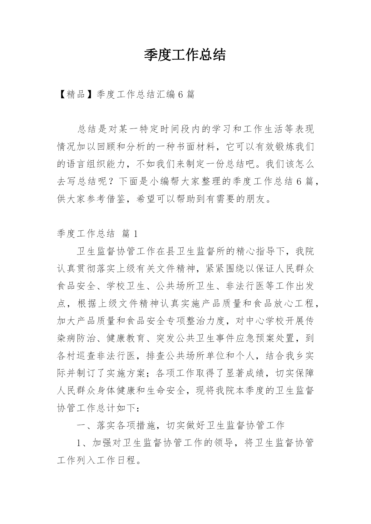 季度工作总结【精品】季度工作总结汇编6篇总结是对某一特定时间段内的学习和工作生活等表现情况加以回顾和分析的一种书面材料,它可以有效锻炼我们的语言组织能力,不如我们来制定一份总结吧。我们该怎么去写总结呢?下面是小编帮大家整理的季度工作总结6篇,供大家参考借鉴,希望可以帮助到有需要的朋友。季度工作总结篇1卫生监督协管工作在县卫生监督所的精心指导下,我院认真贯彻落实上级有关文件精神,紧紧围绕以保证人民群众食品安全、学校卫生、公共场所卫生、非法行医等工作出发点,根据上级文件精神认真实施产品质量和食品放心工程,加大