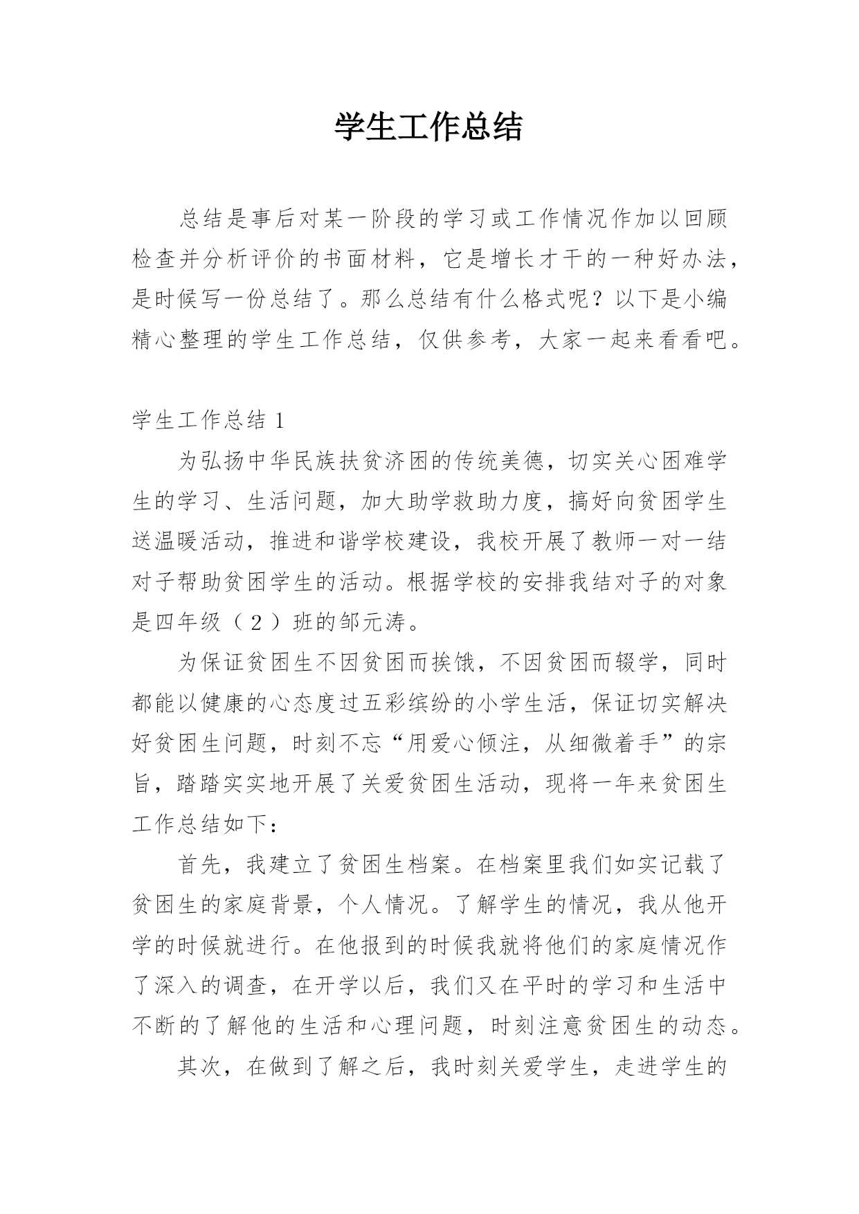 学生工作总结总结是事后对某一阶段的学习或工作情况作加以回顾检查并分析评价的书面材料,它是增长才干的一种好办法,是时候写一份总结了。那么总结有什么格式呢?以下是小编精心整理的学生工作总结,仅供参考,大家一起来看看吧。学生工作总结1为弘扬中华民族扶贫济困的传统美德,切实关心困难学生的学习、生活问题,加大助学救助力度,搞好向贫困学生送温暖活动,推进和谐学校建设,我校开展了教师一对一结对子帮助贫困学生的活动。根据学校的安排我结对子的对象是四年级(2)班的邹元涛。为保证贫困生不因贫困而挨饿,不因贫困而辍学,同时都能